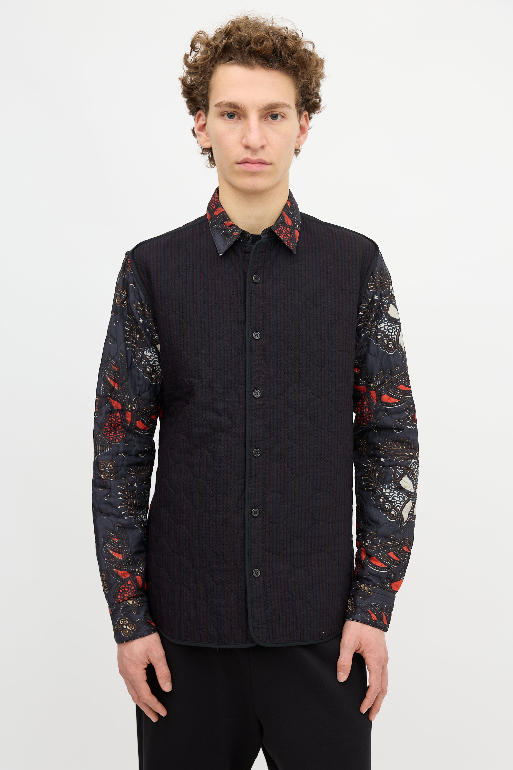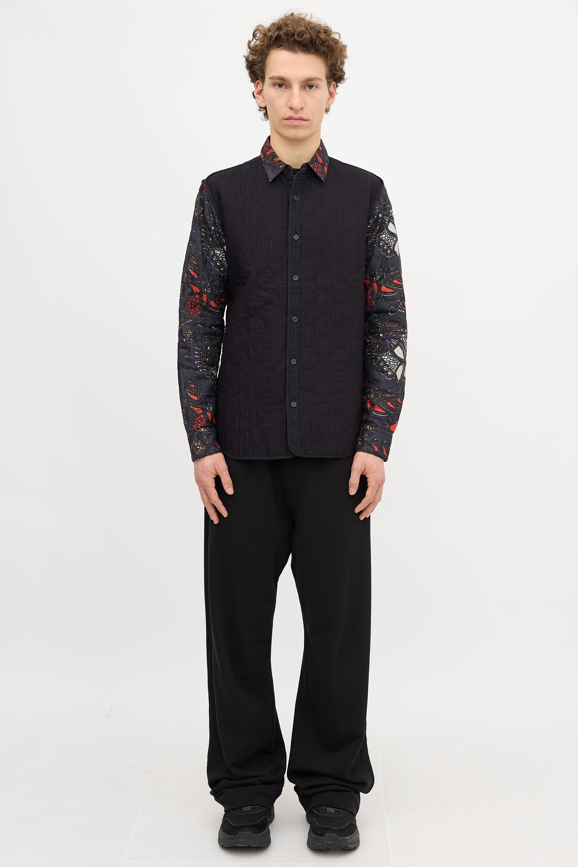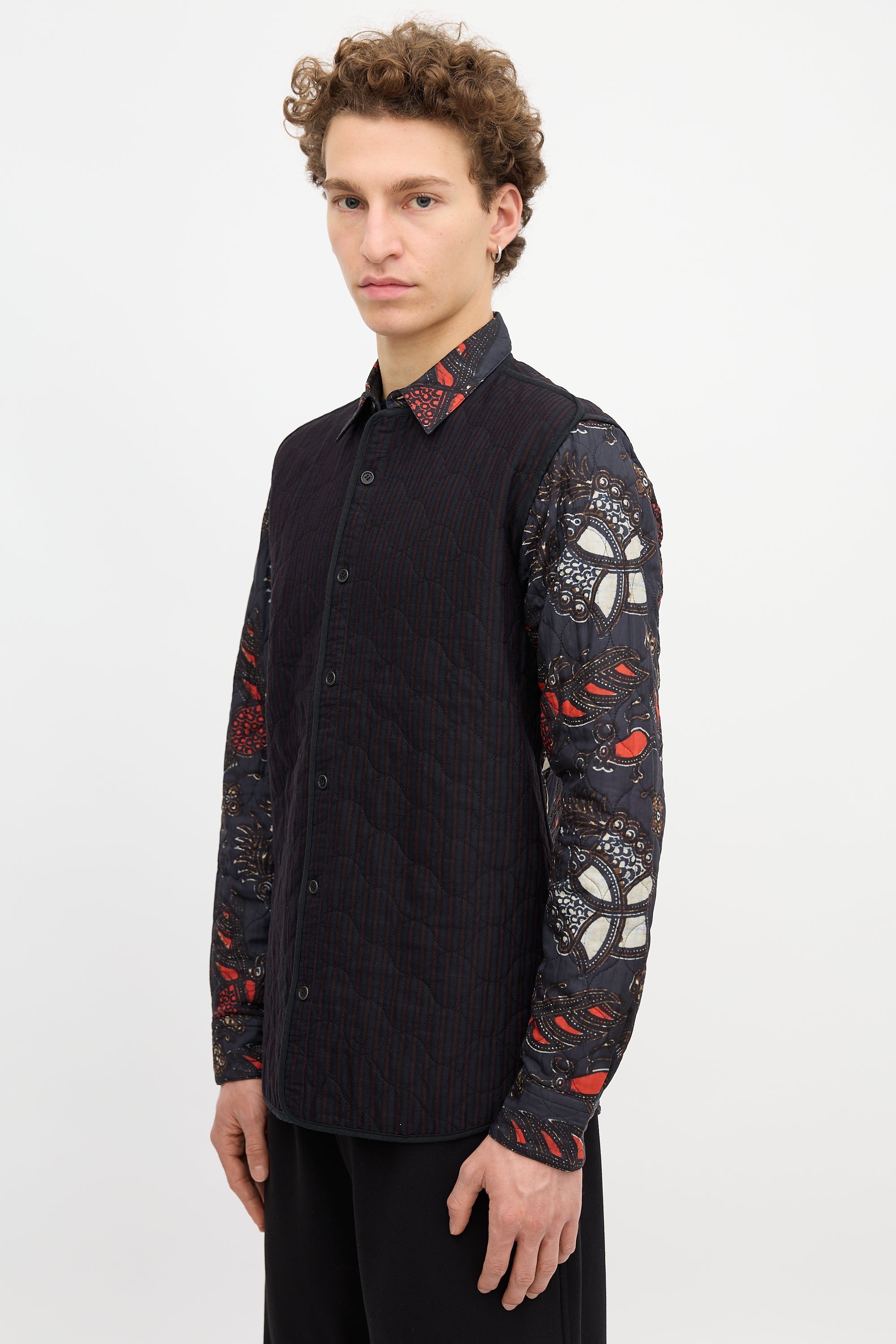 Pre-owned Dries Van Noten navy, red, and brown quilted over shirt jacket featuring straight collar, button up front, striped bodice, floral printed collar and sleeves, and buttoned cuffs.