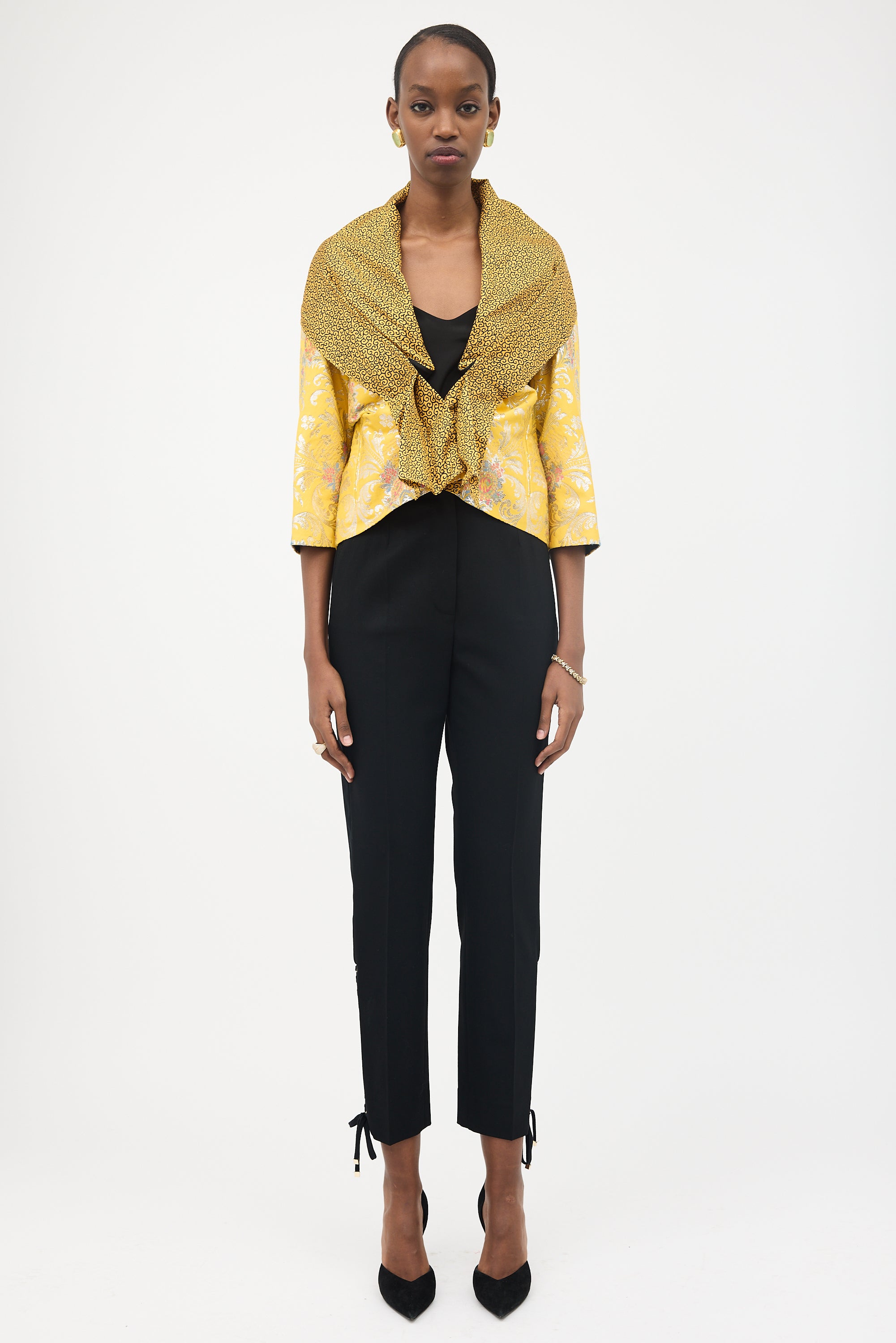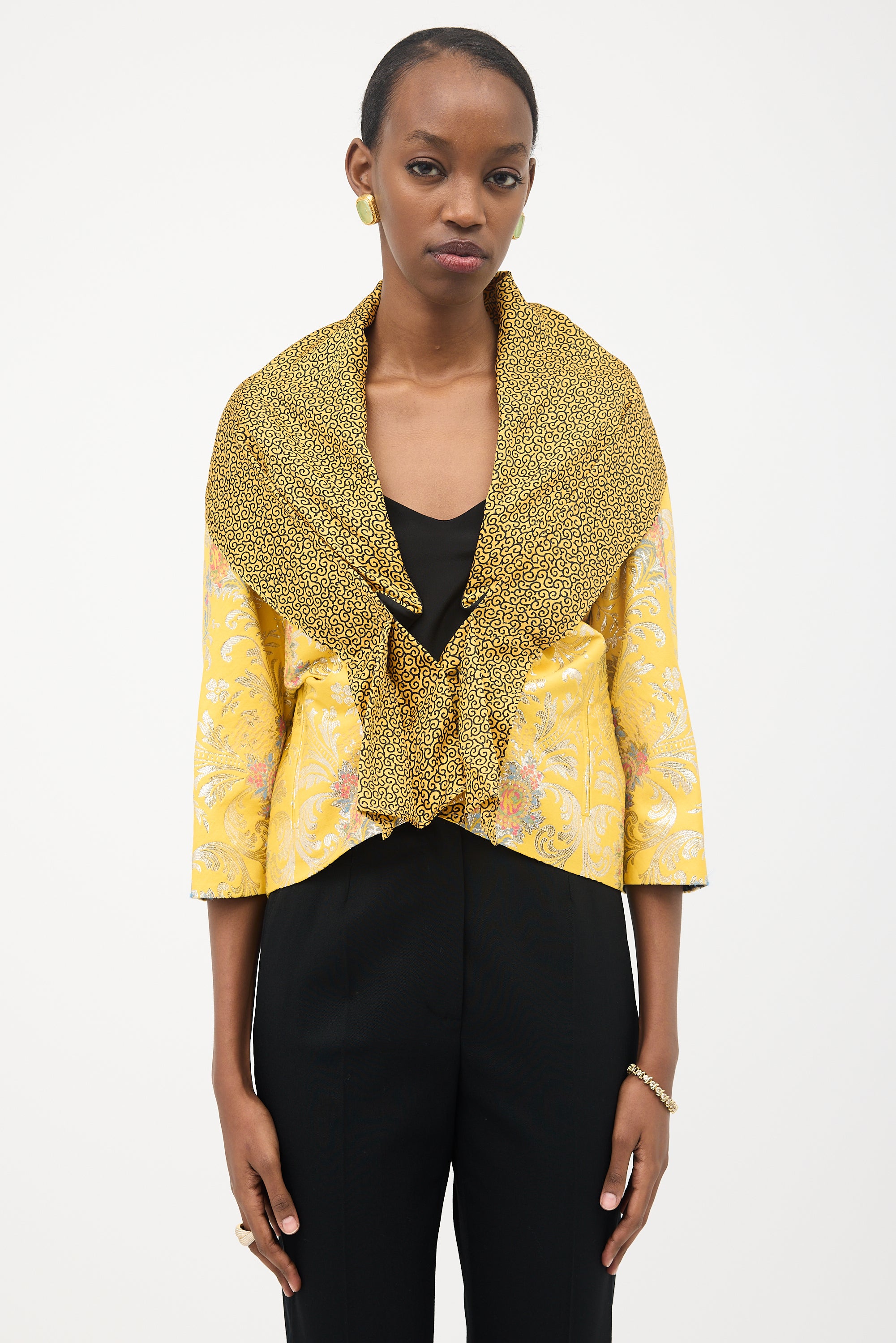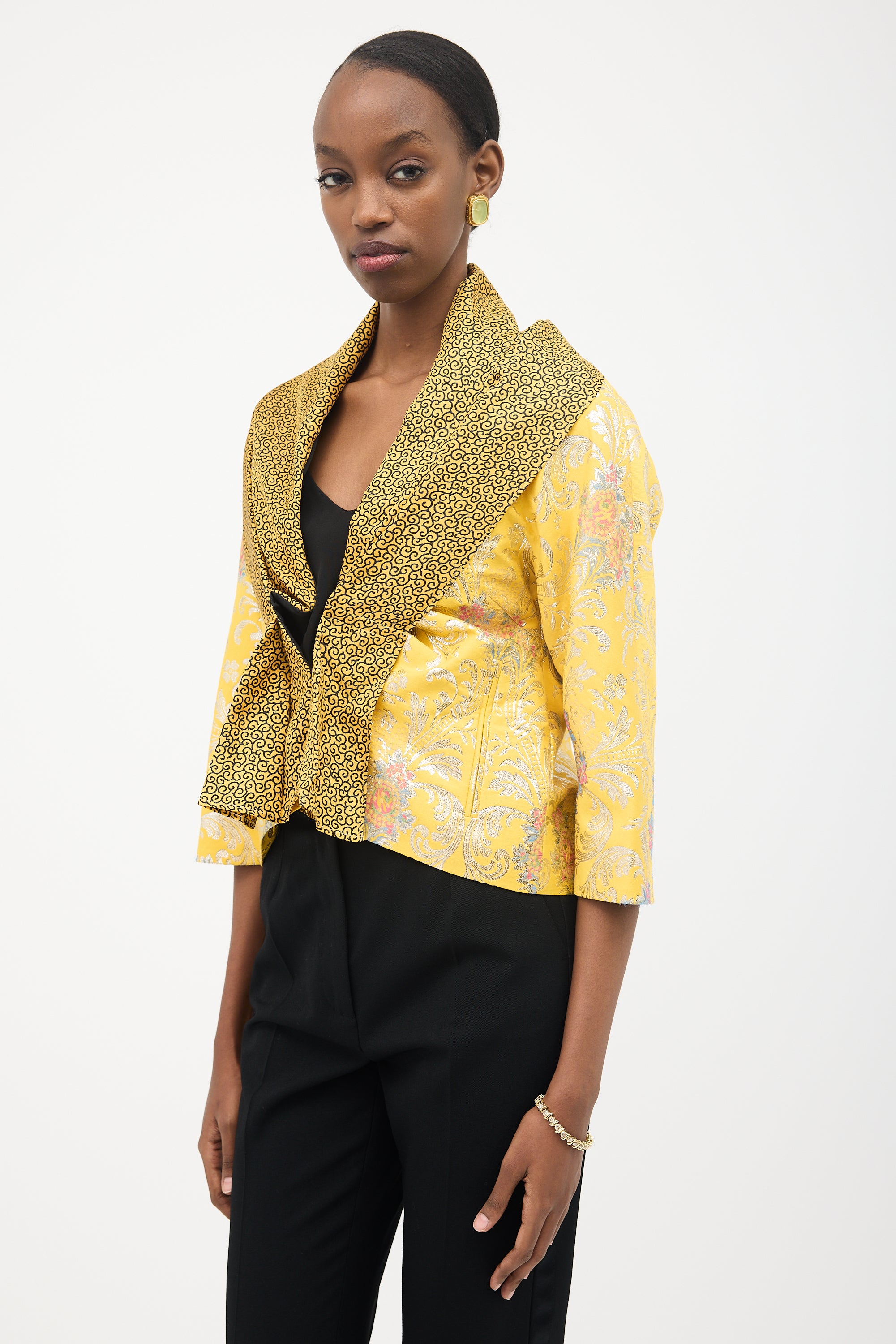Pre-owned Etro yellow jacket featuring a multicolour and metallic floral jacquard, layered shawl collar with black filigree print, button front, double welt pockets, and three quarter length sleeves. Lined.