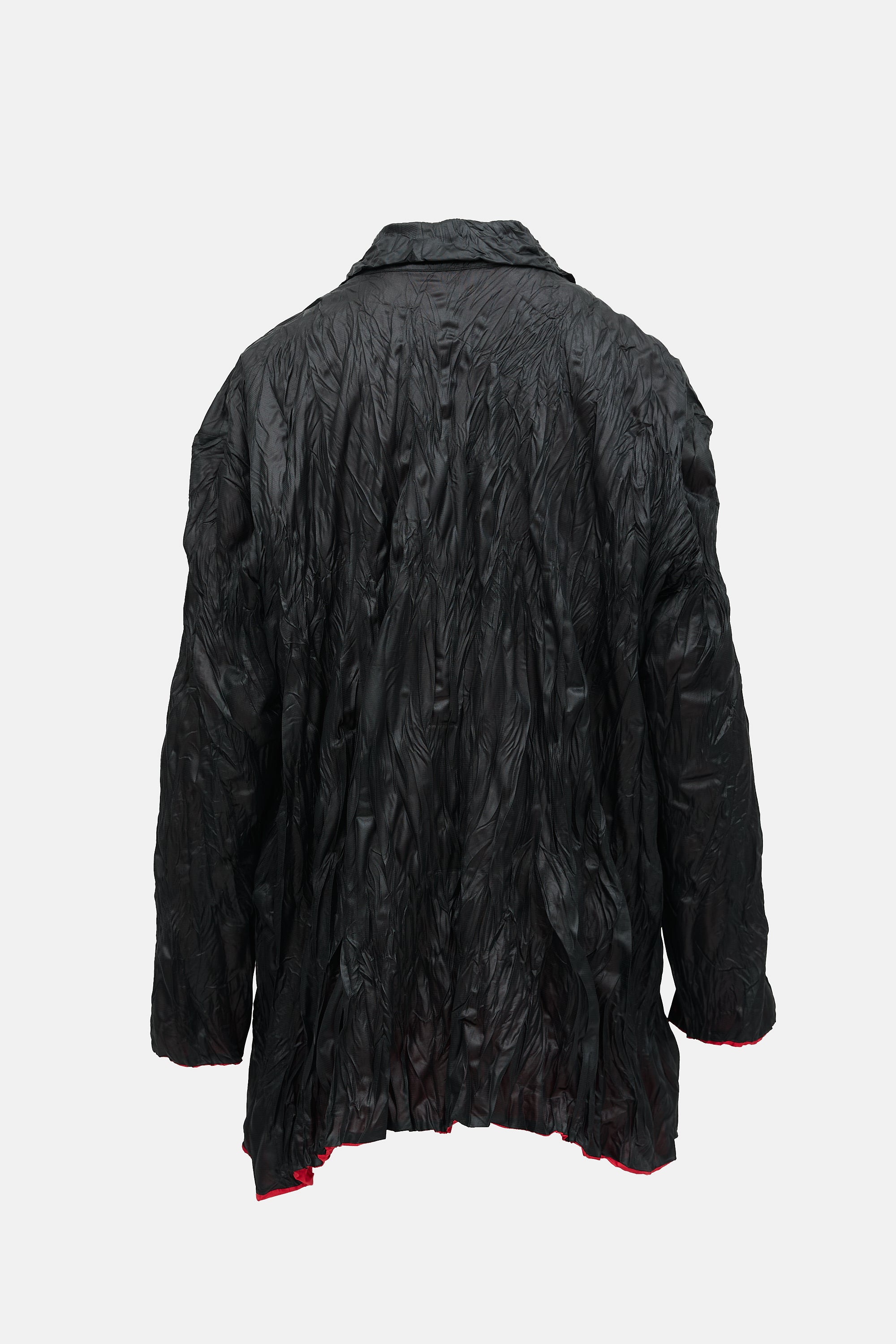 Pre-owned Issey Miyake black crinkled blazer featuring a notched lapel, button front, patch pockets, and red lining. c. 1990s.