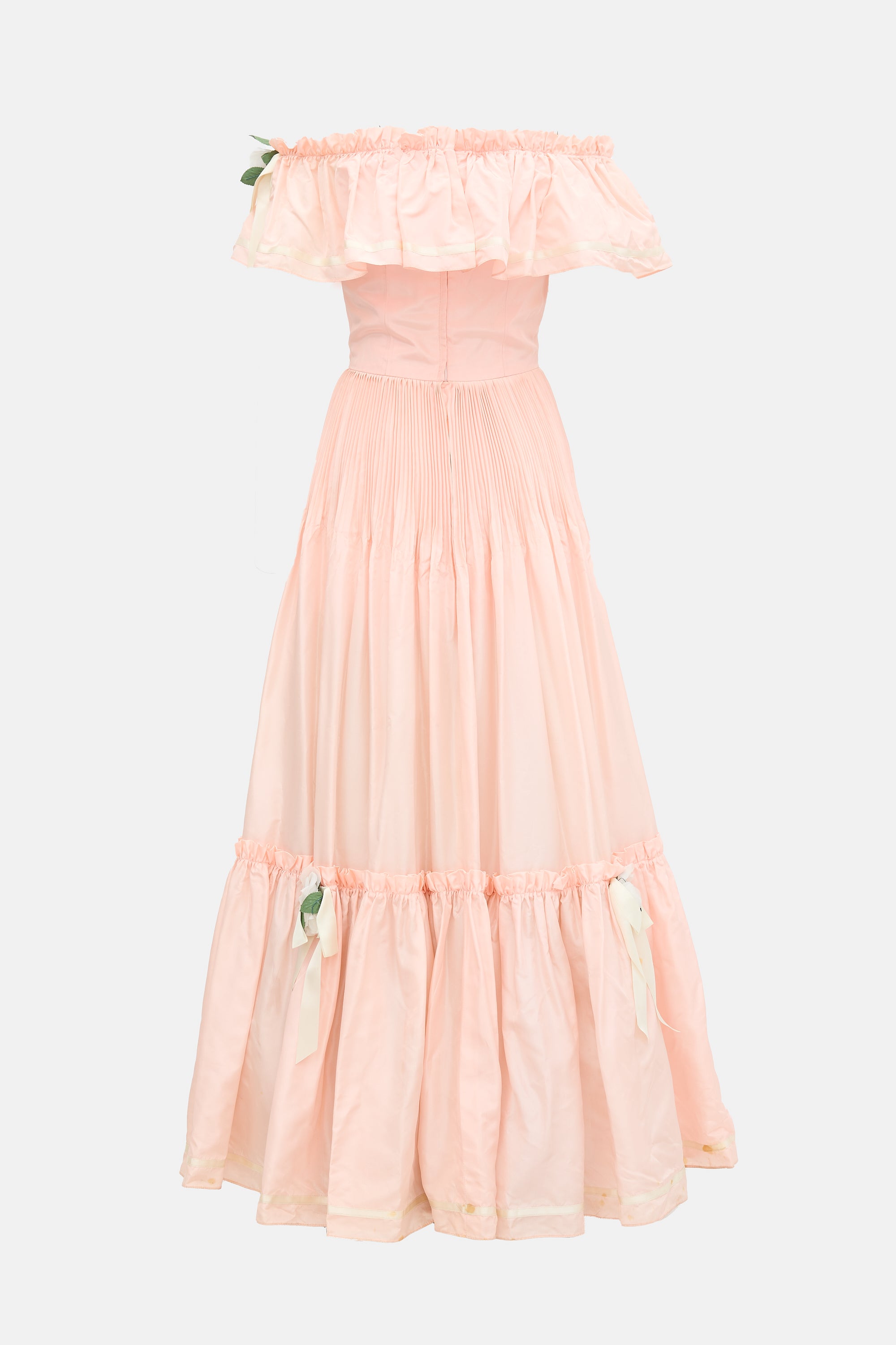 Pre-owned Nina Ricci vintage pink maxi dress featuring off shoulder styling, ruffled trim, accordion pleats at waist, concealed back zip with snap button fastening, tie sash, tiered skirt, tulle underlayer, and flower appliques throughout. c. 1980 - 1990s.