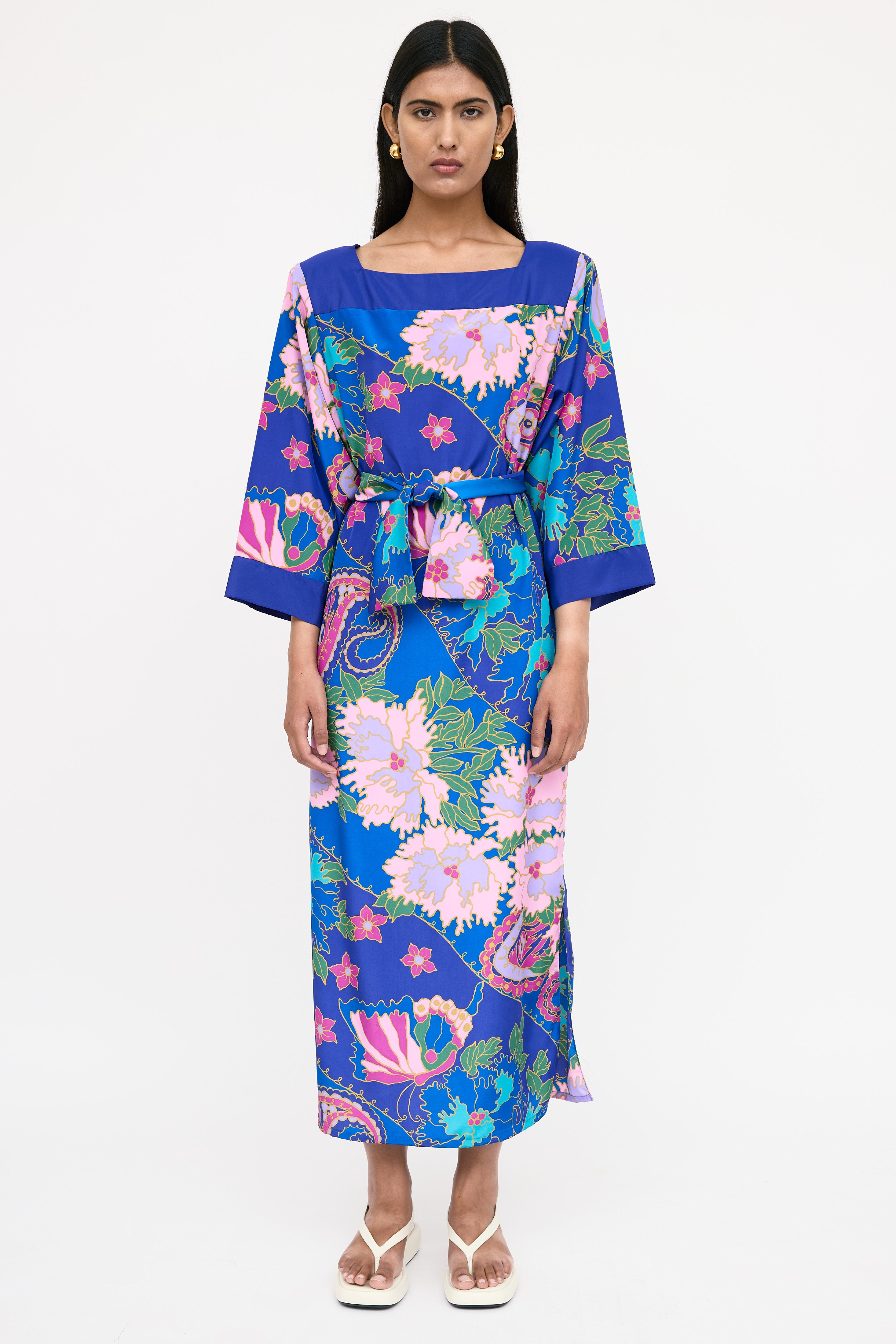 Pre-owned Oscar de la Renta 1968 purple and multicolor long sleeve dress featuring floral print, square neckline, shoulder pads, slit pockets at side, tie belt, and slit at hemline.