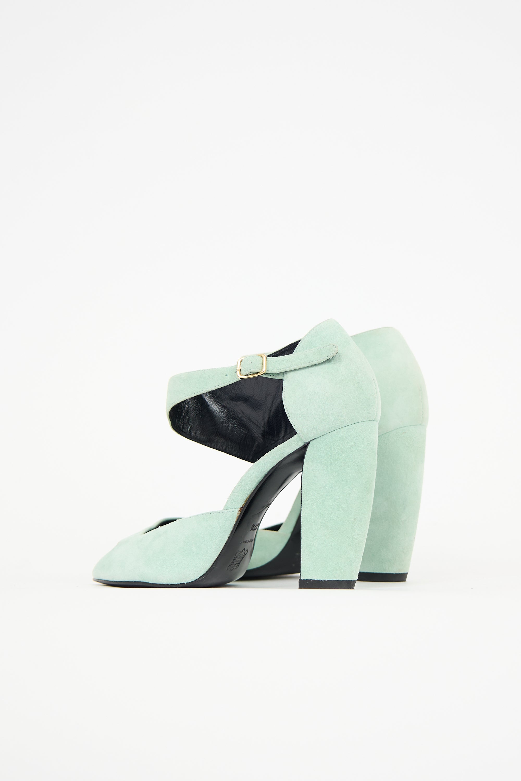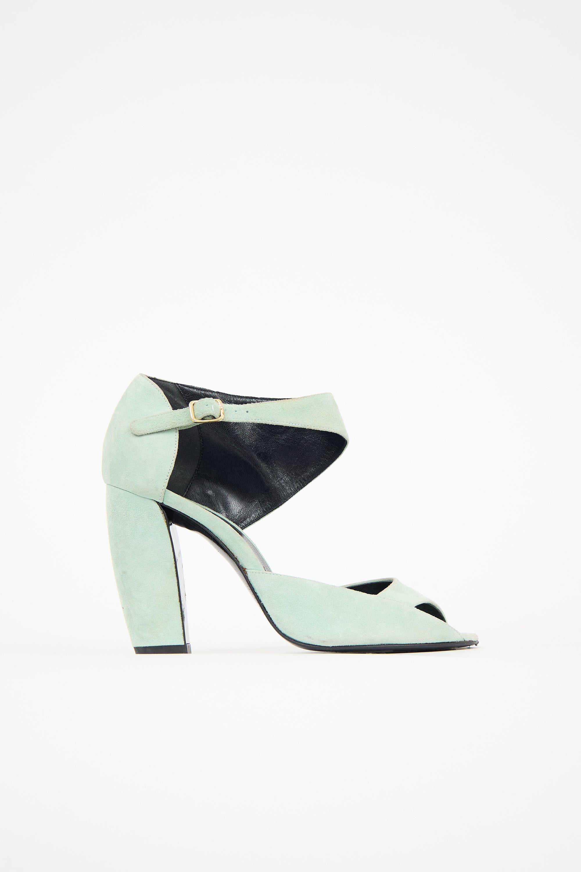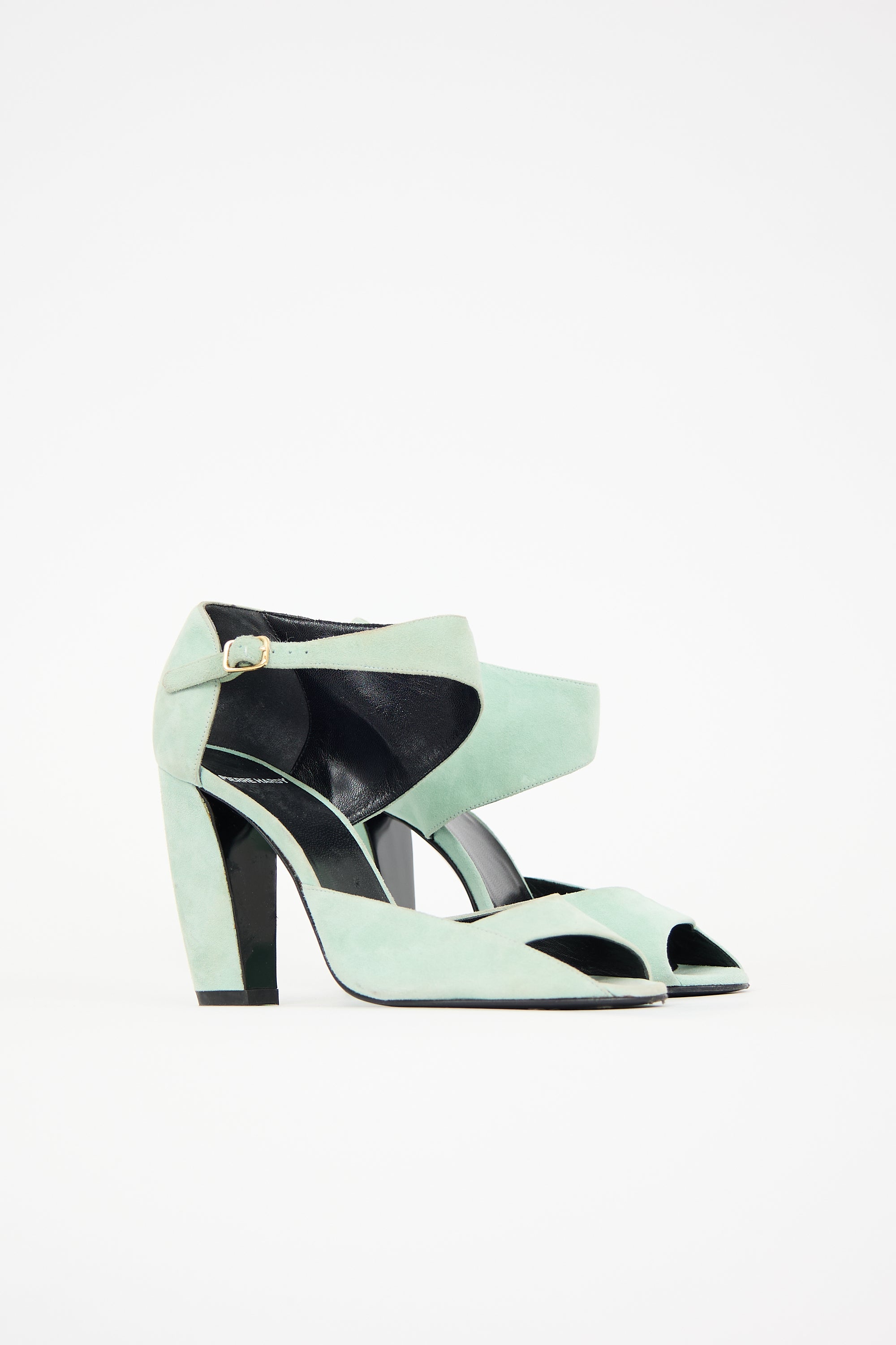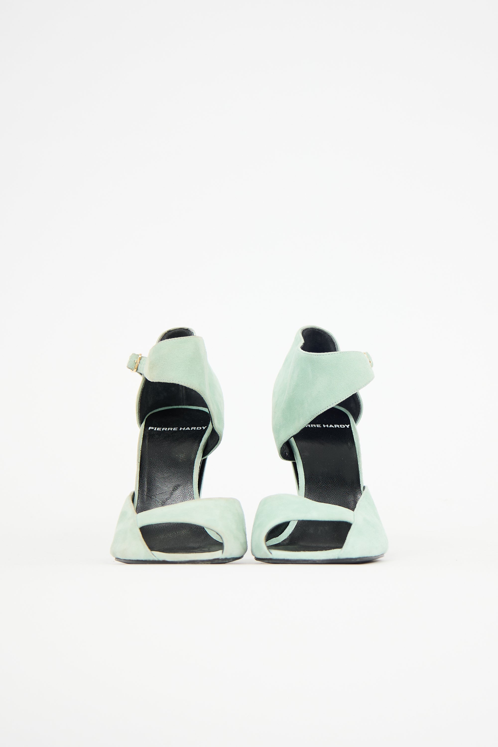 Pre-owned Pierre Hardy green suede sandals featuring almond peep toe, cut out upper, adjustable ankle strap, and covered block heel.