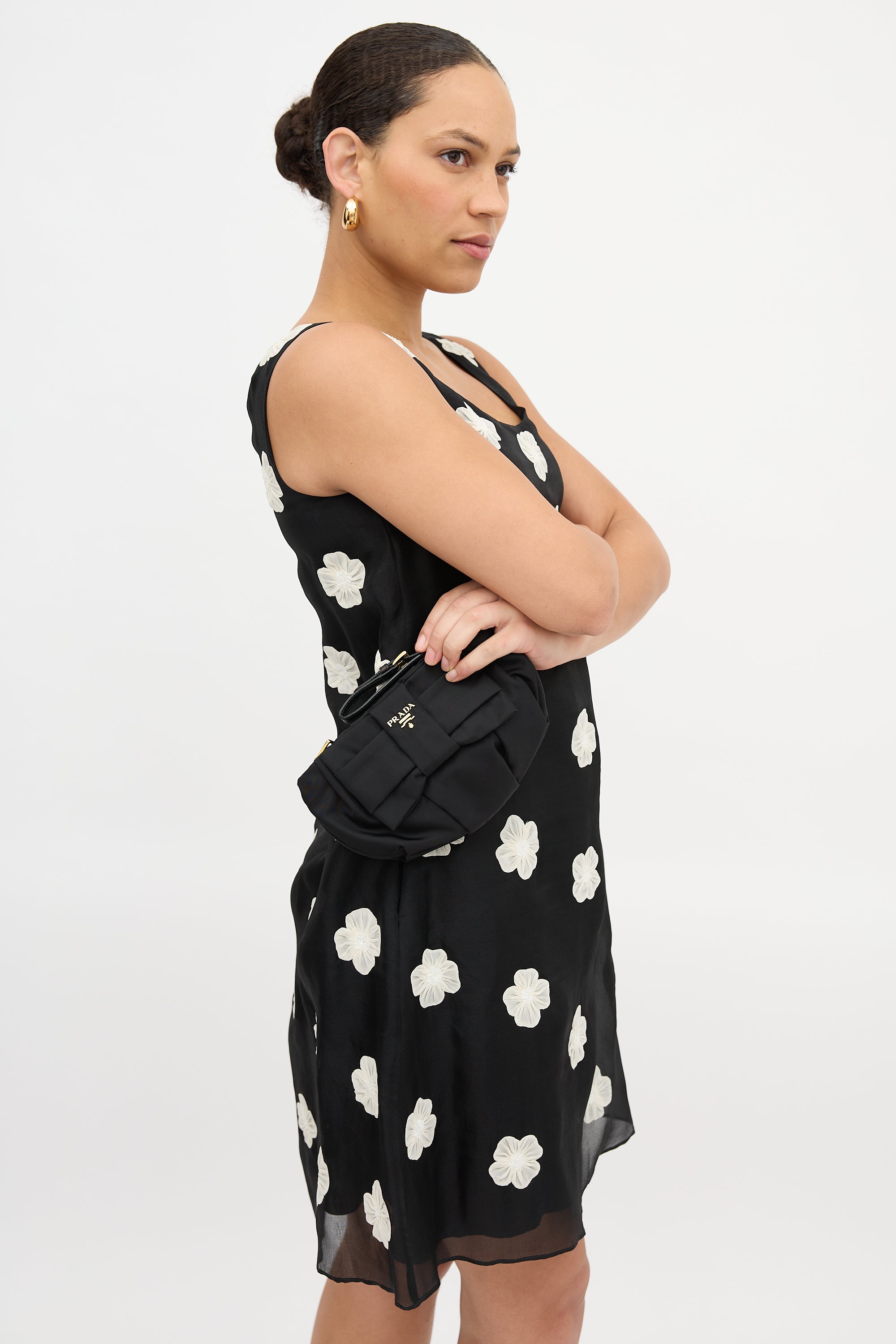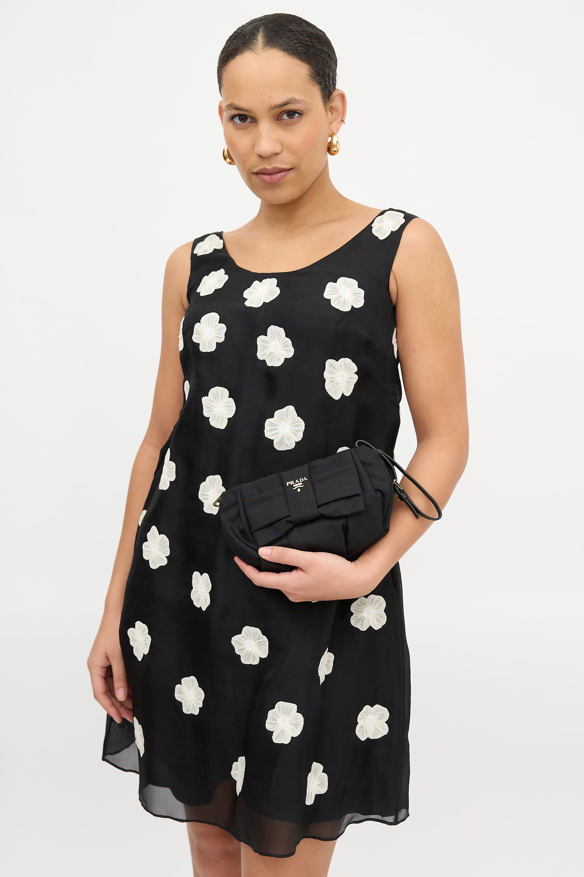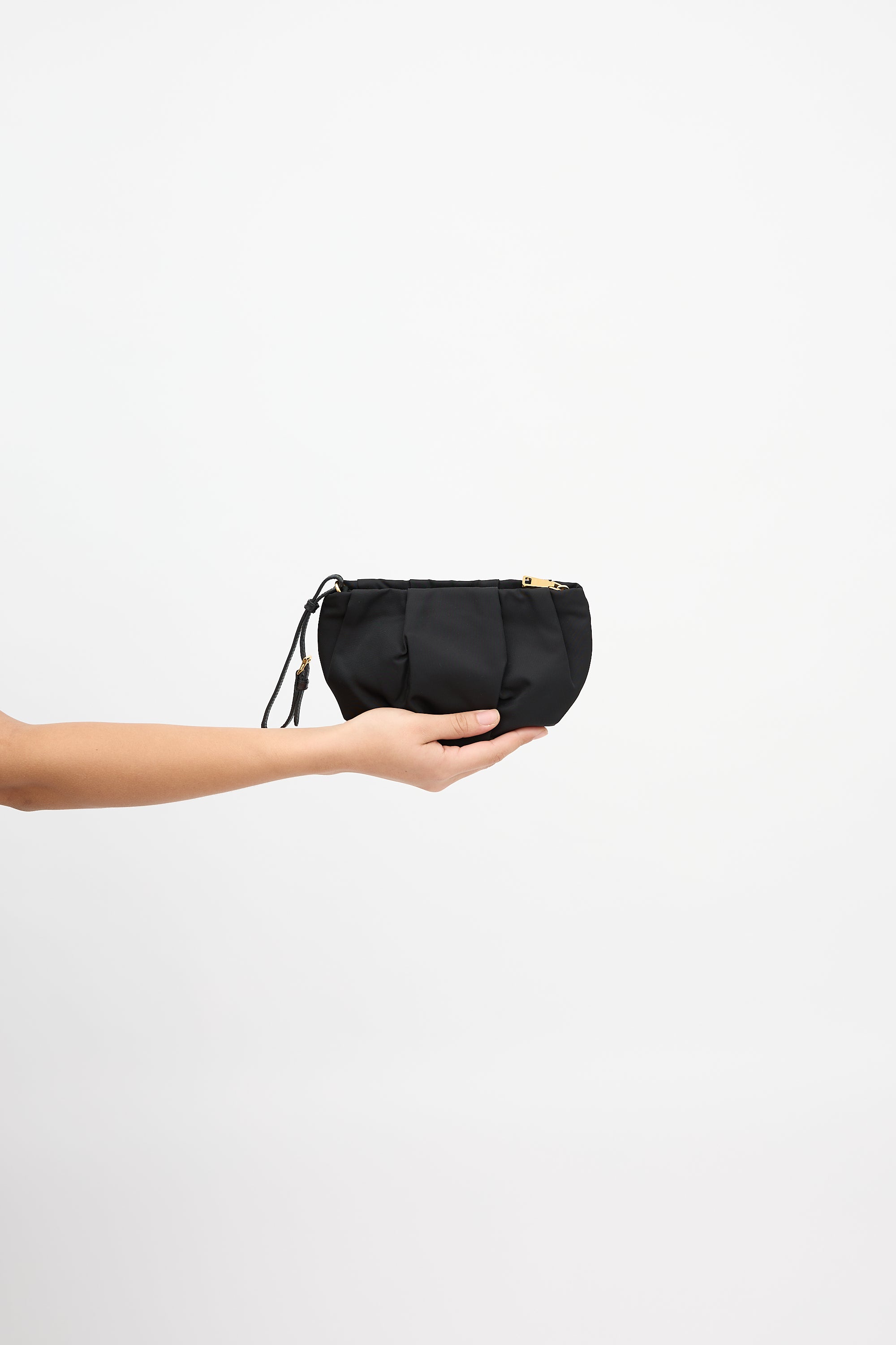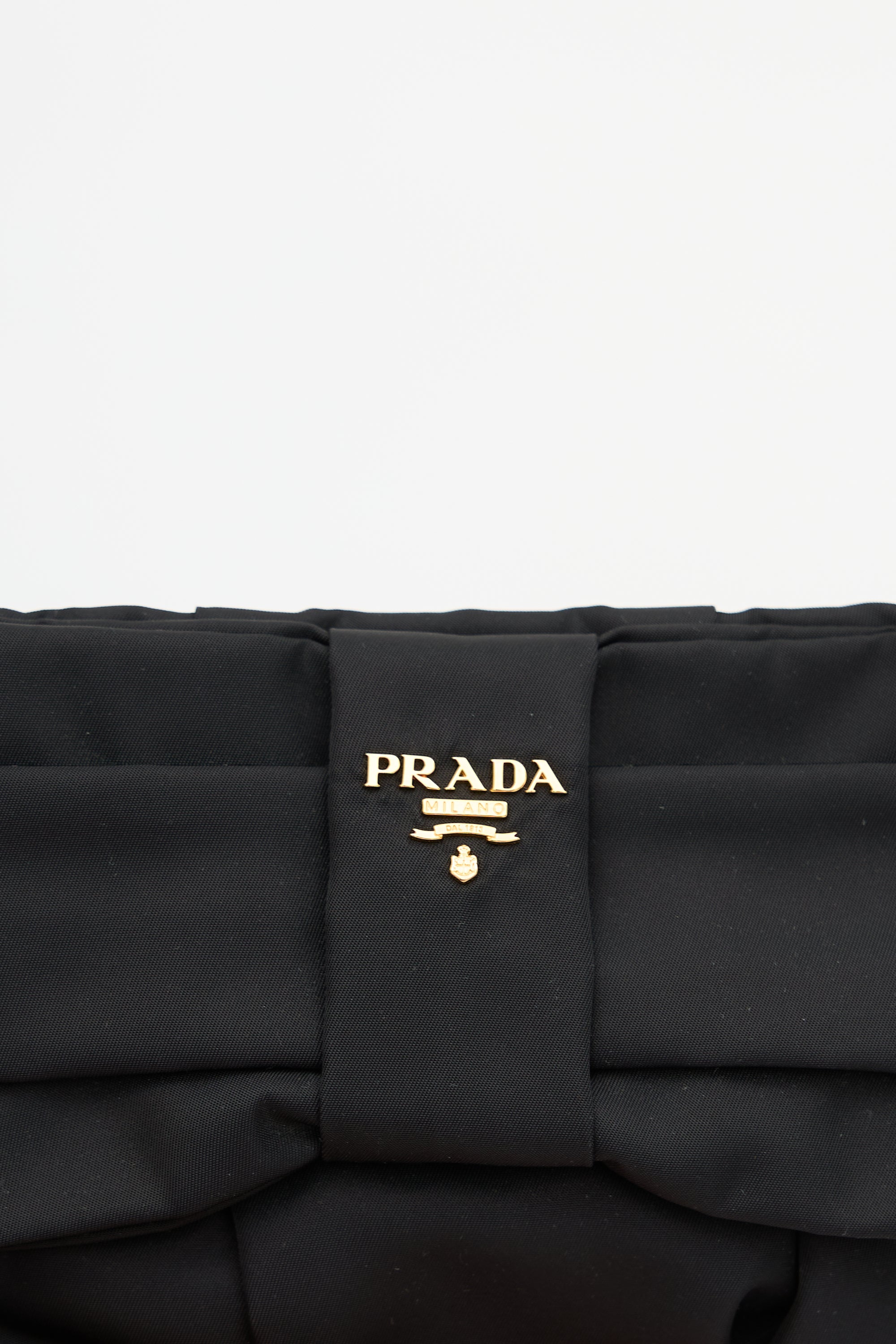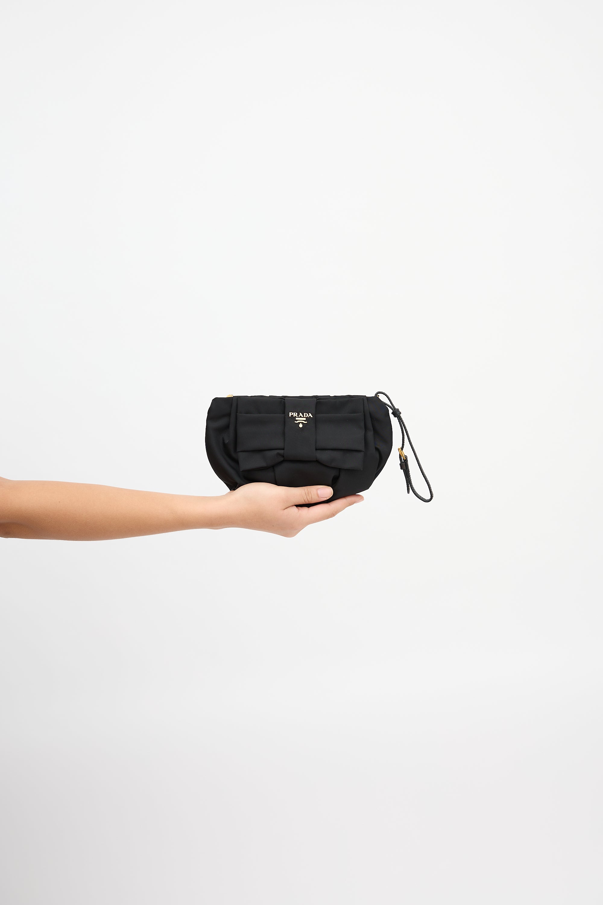 Pre-owned Prada black nylon wristlet bag featuring bow design, gold tone hardware, logo embellishment at front, adjustable Saffiano leather wrist strap, top zip closure, and one lined main compartment. Comes with original dust bag. Authenticated by a third party - Certificate available upon request.