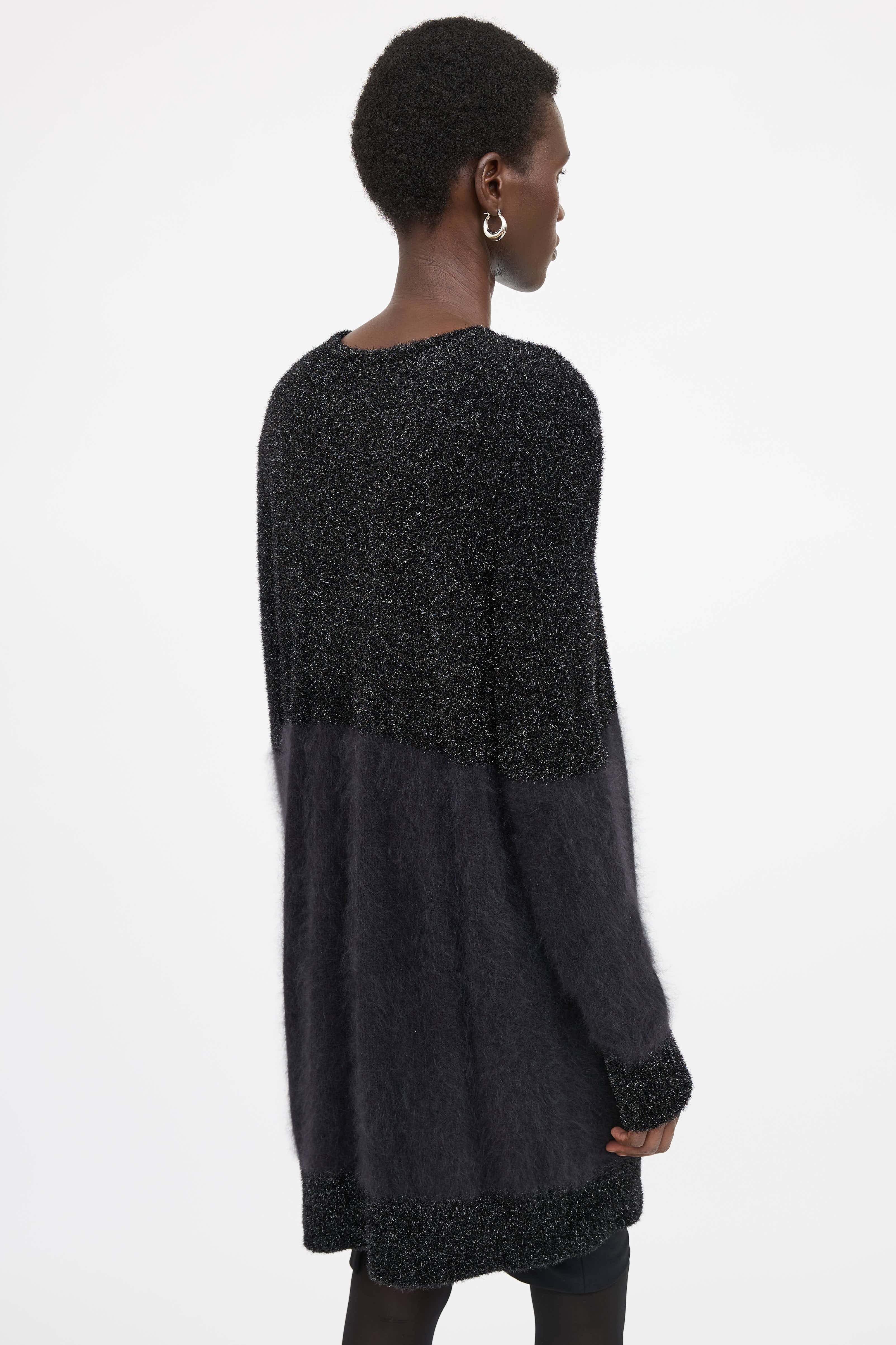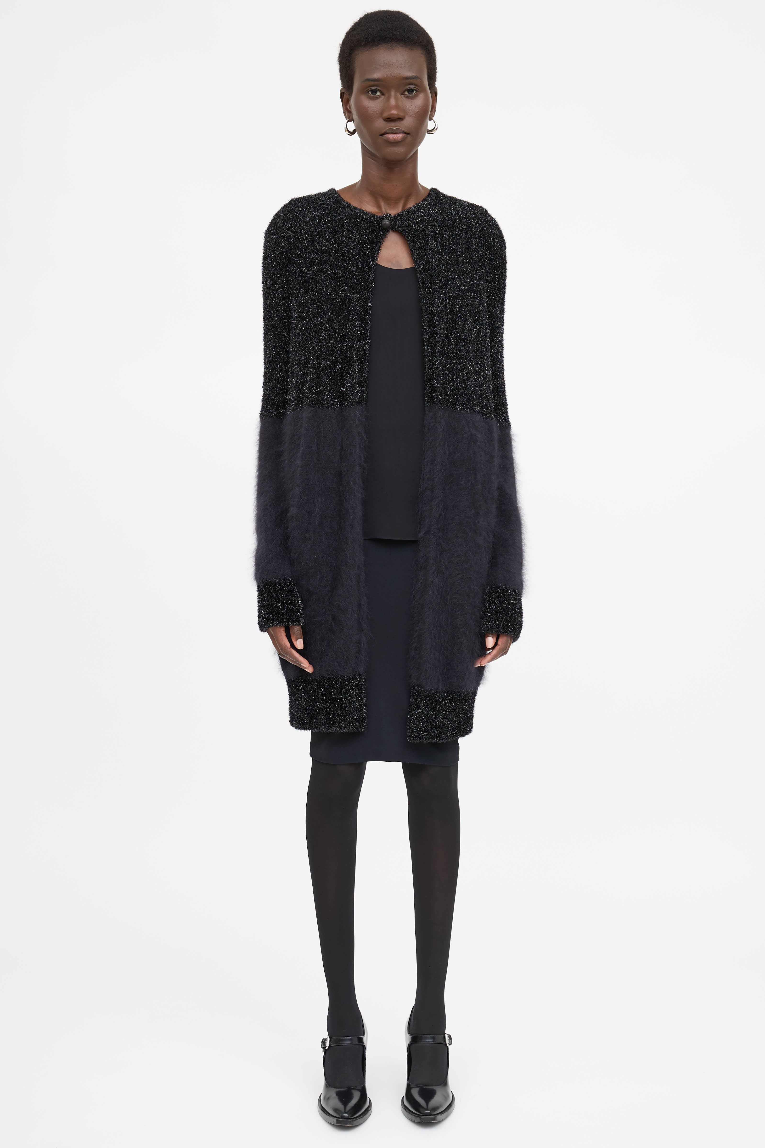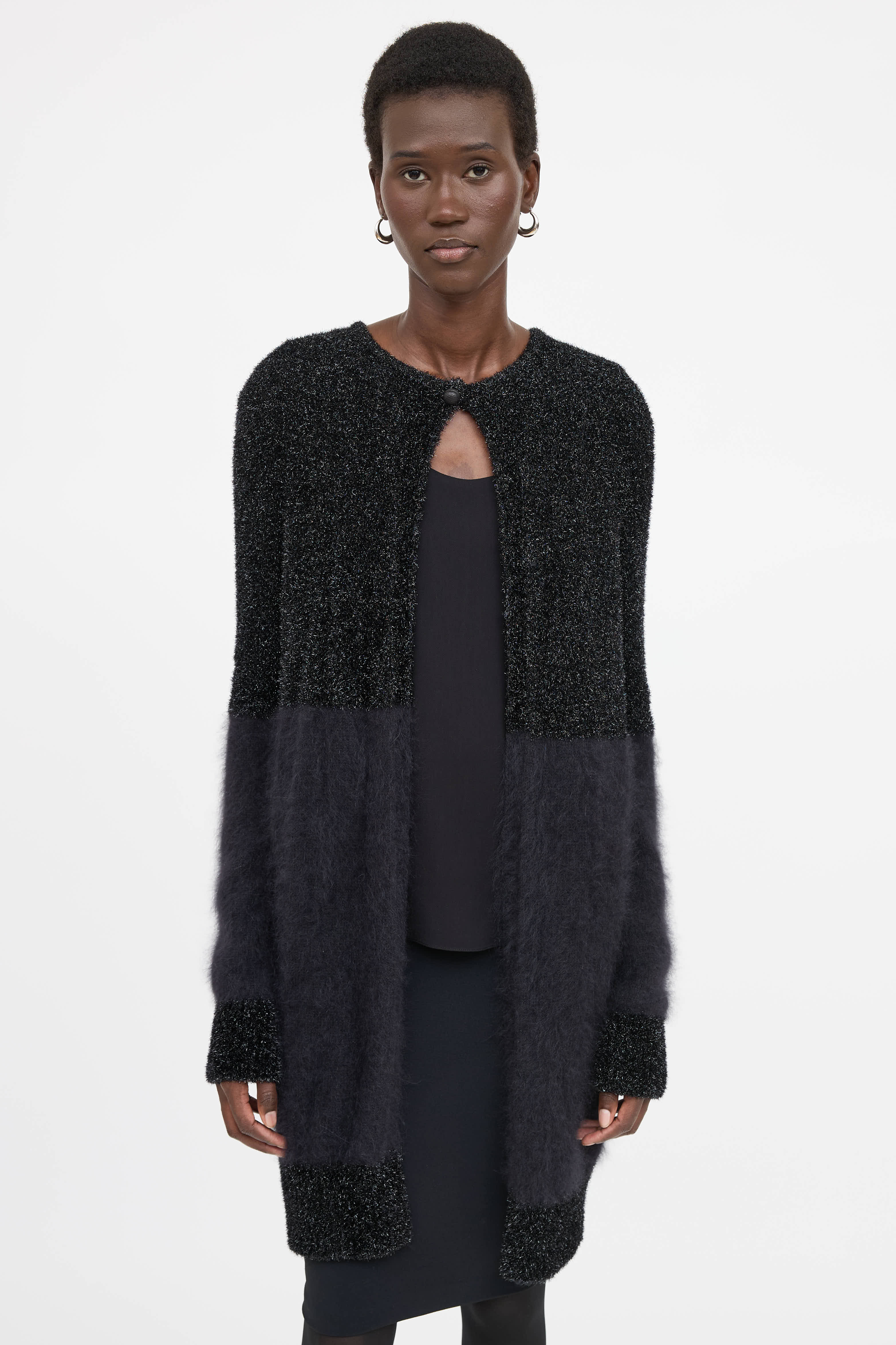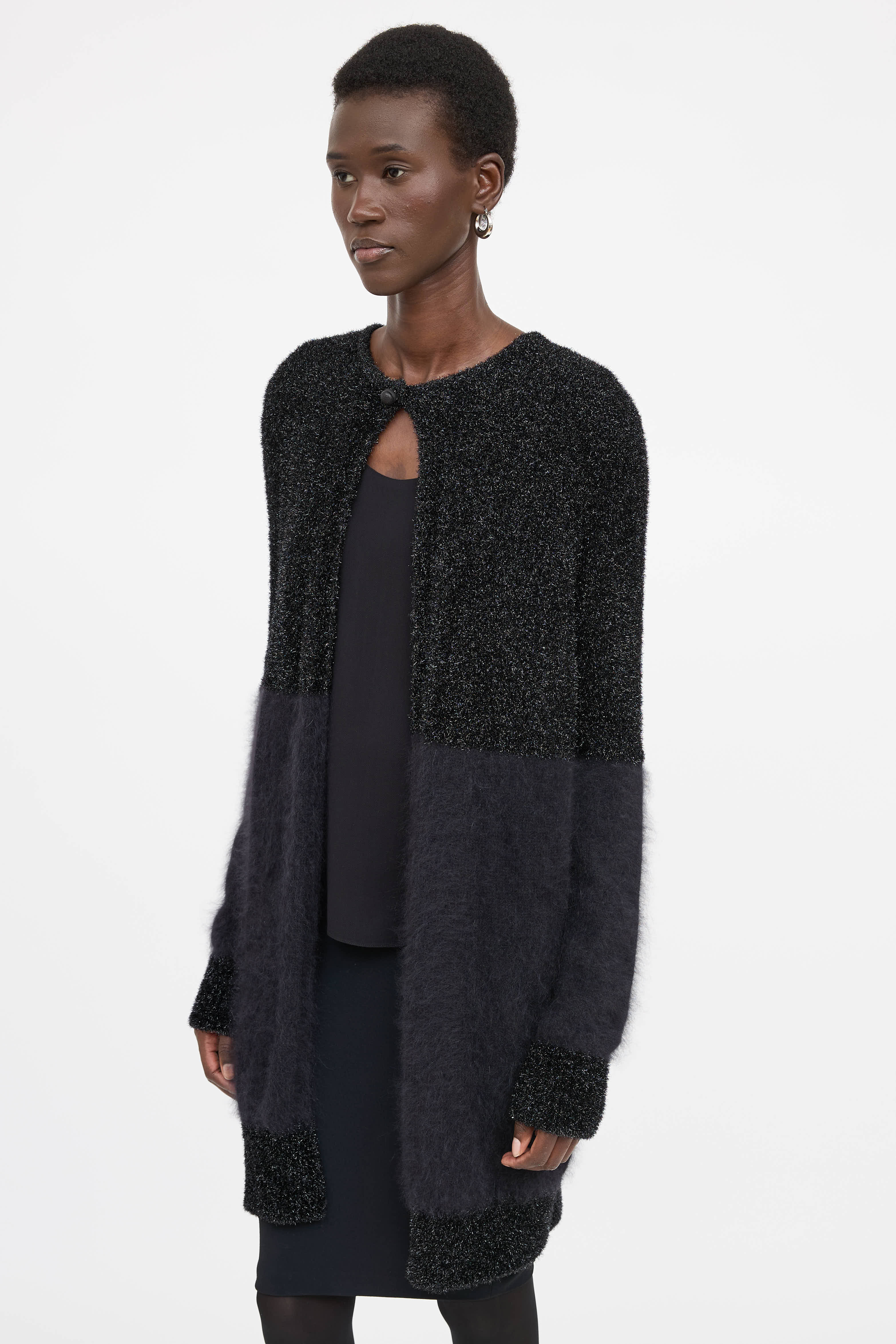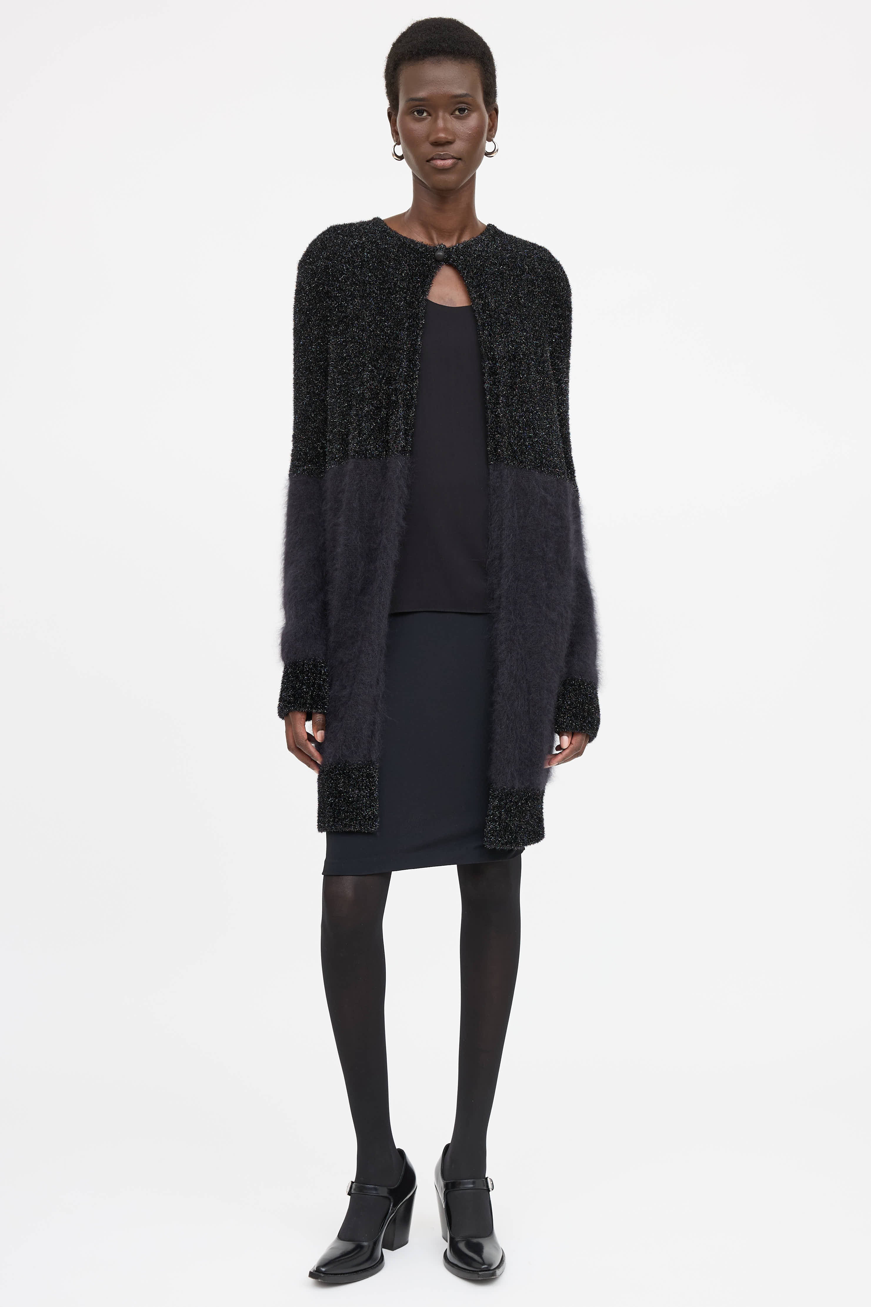 Pre-owned The Row black angora blend cardigan featuring round neckline, single button closure at collar and shimmer knit panels.