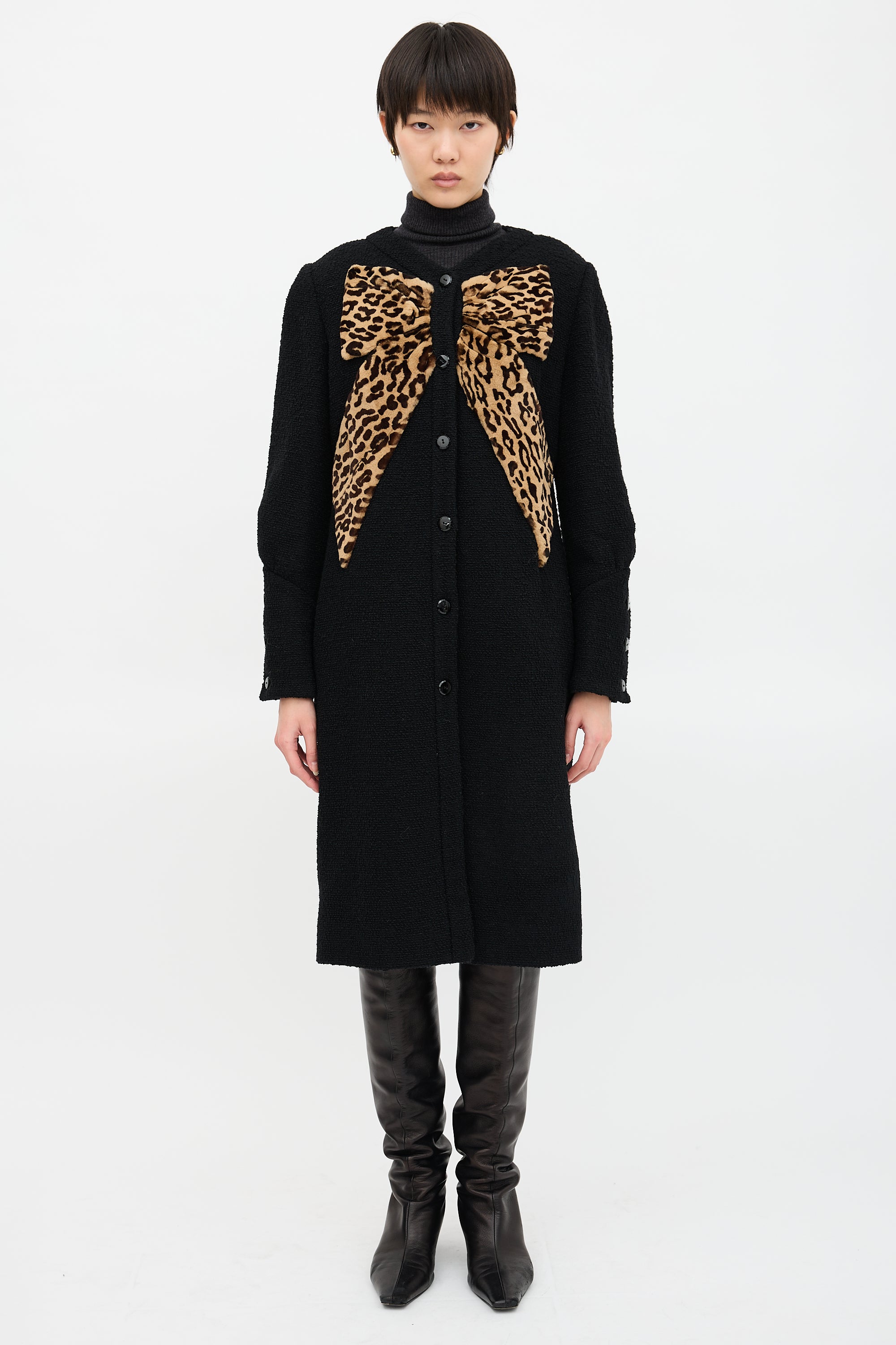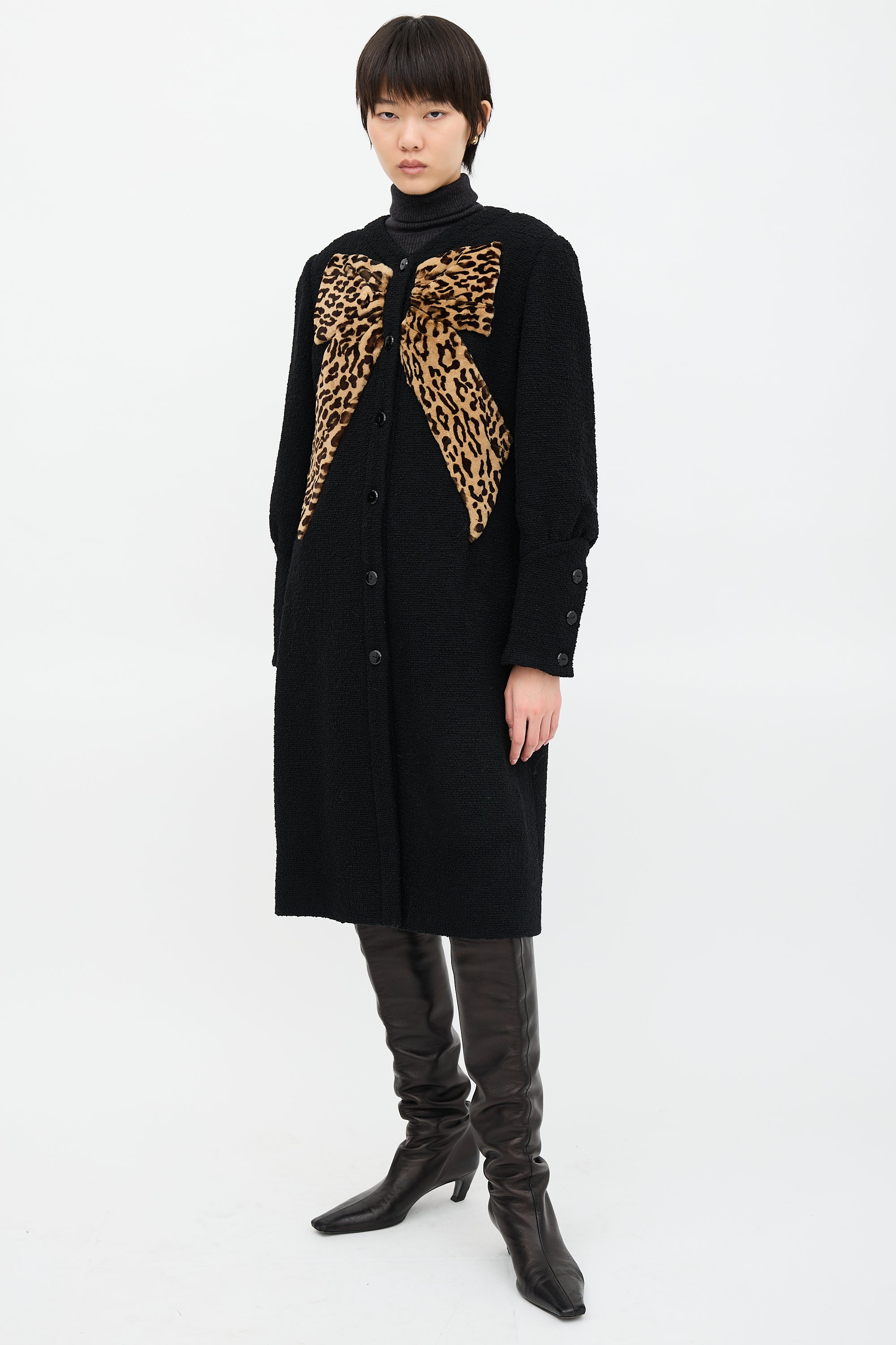 Pre-owned Valentino black boucle wool coat featuring round neckline, button up front, brown bow design with leopard pattern, and buttoned cuffs. Lined.