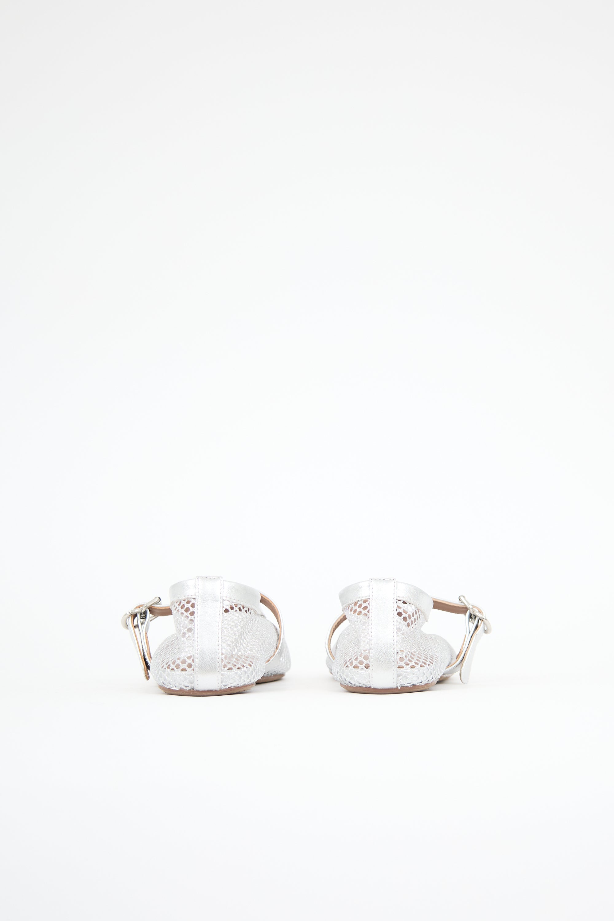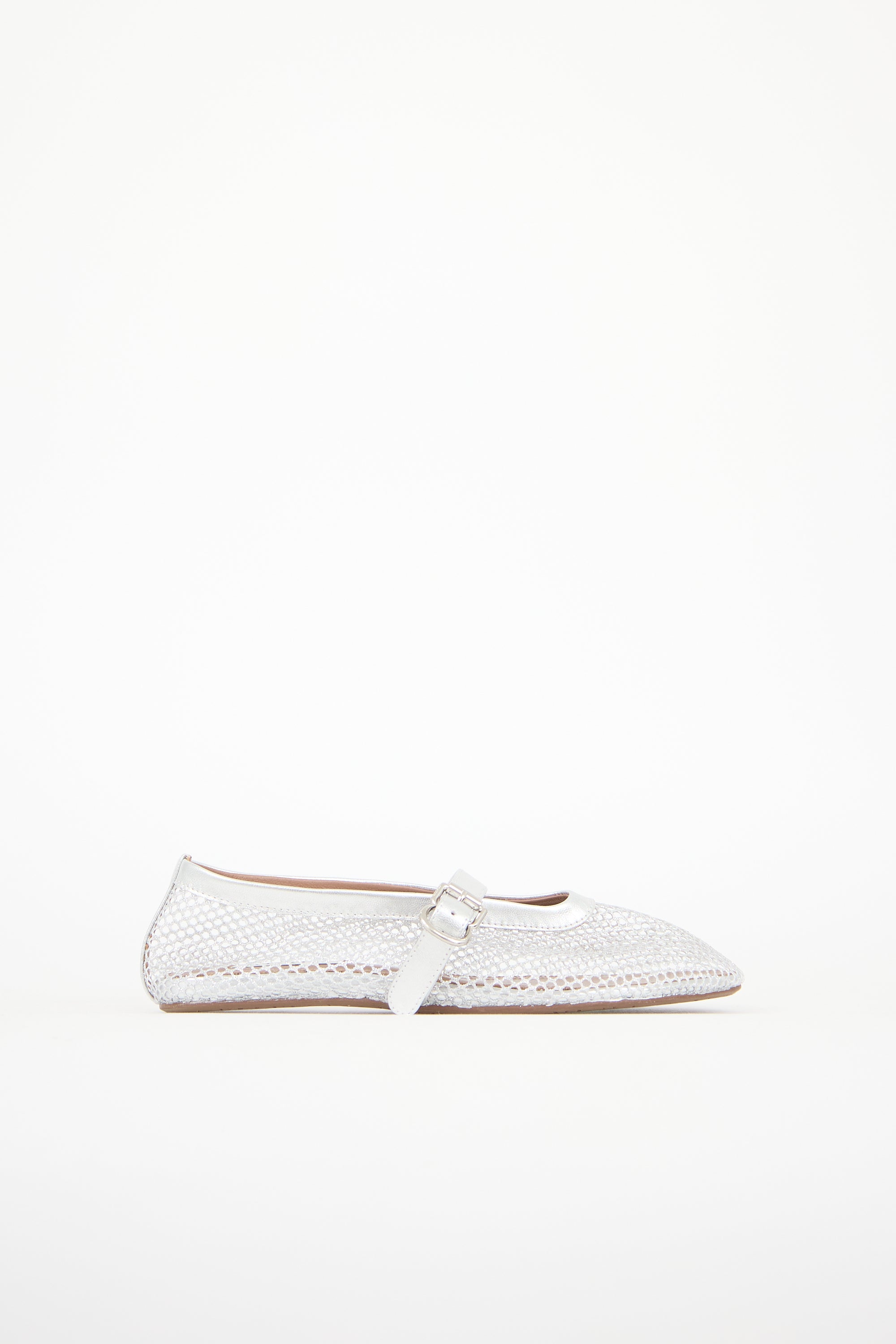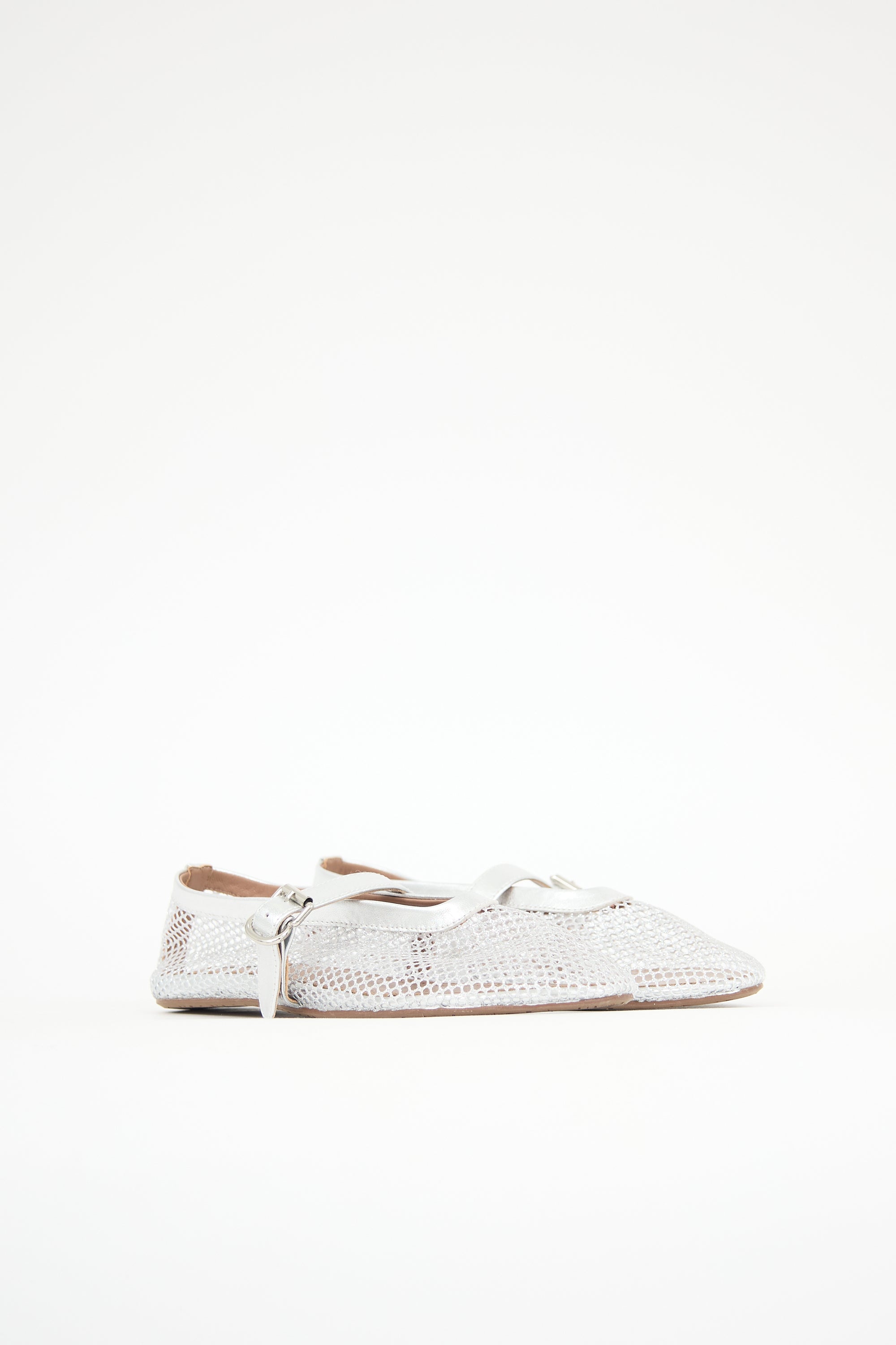 Pre-owned Alaïa silver sparkly fishnet ballet flats featuring a rounded toe, metallic leather collar and strap across vamp with buckle fastening, leather insole, and rubber outsole.
