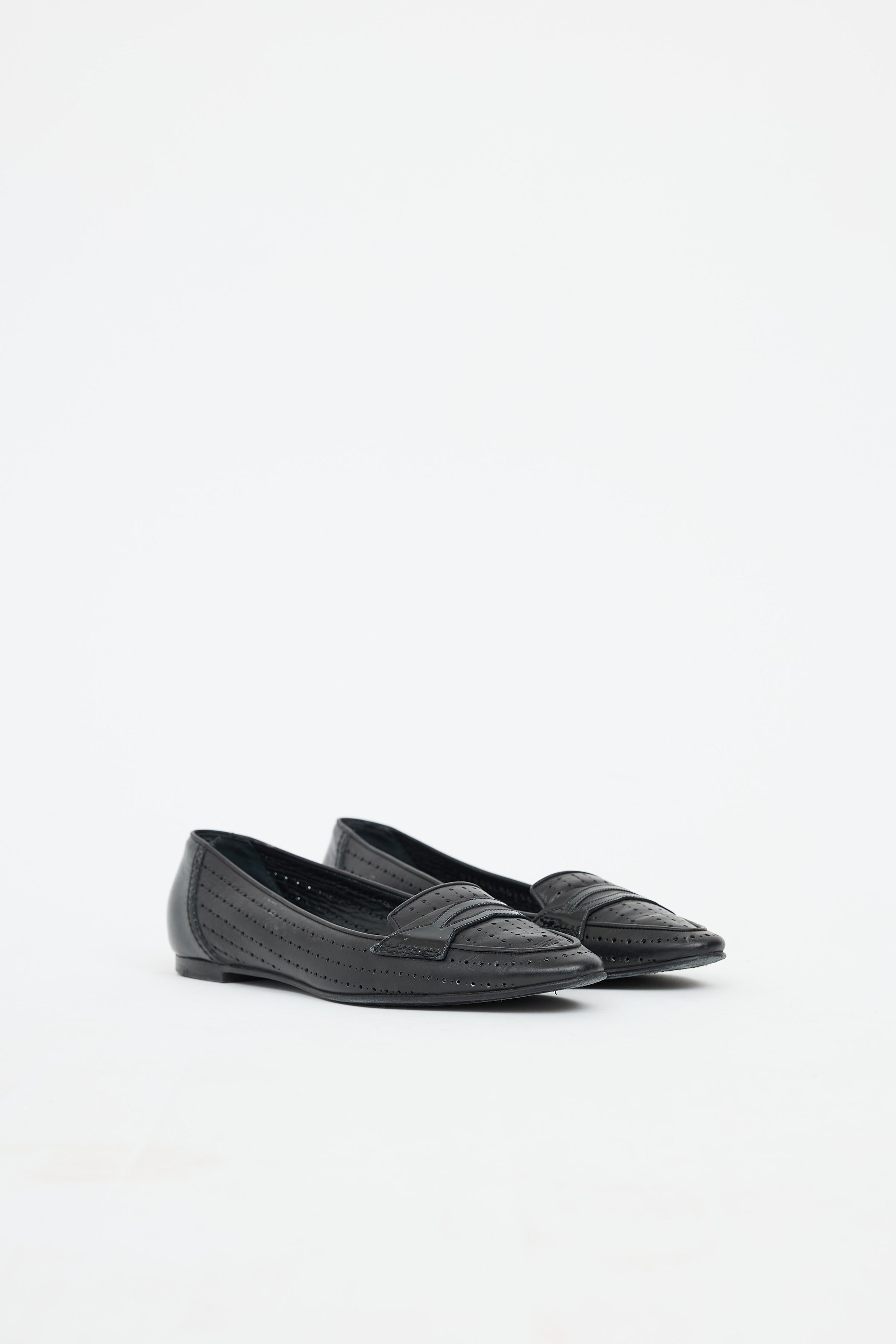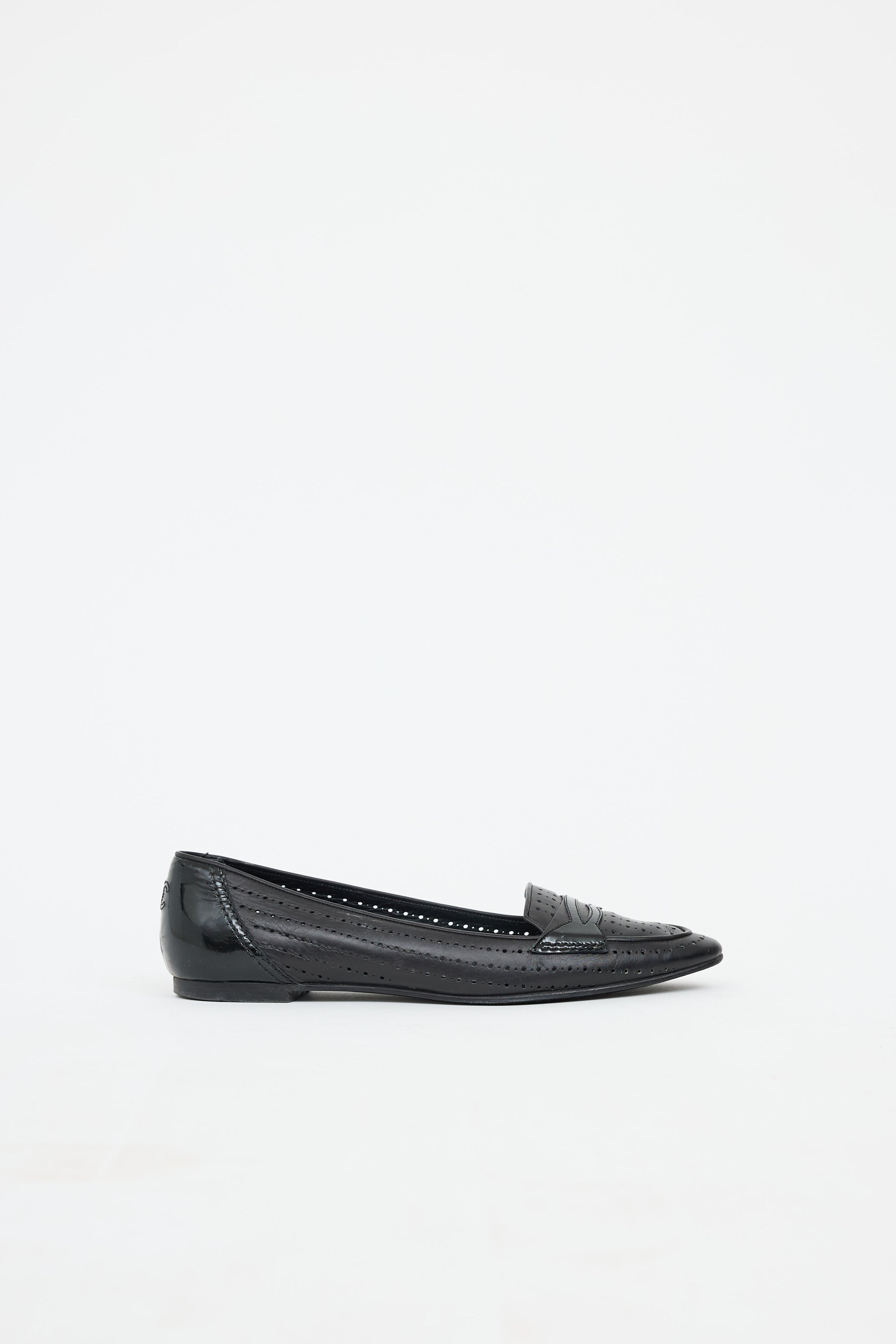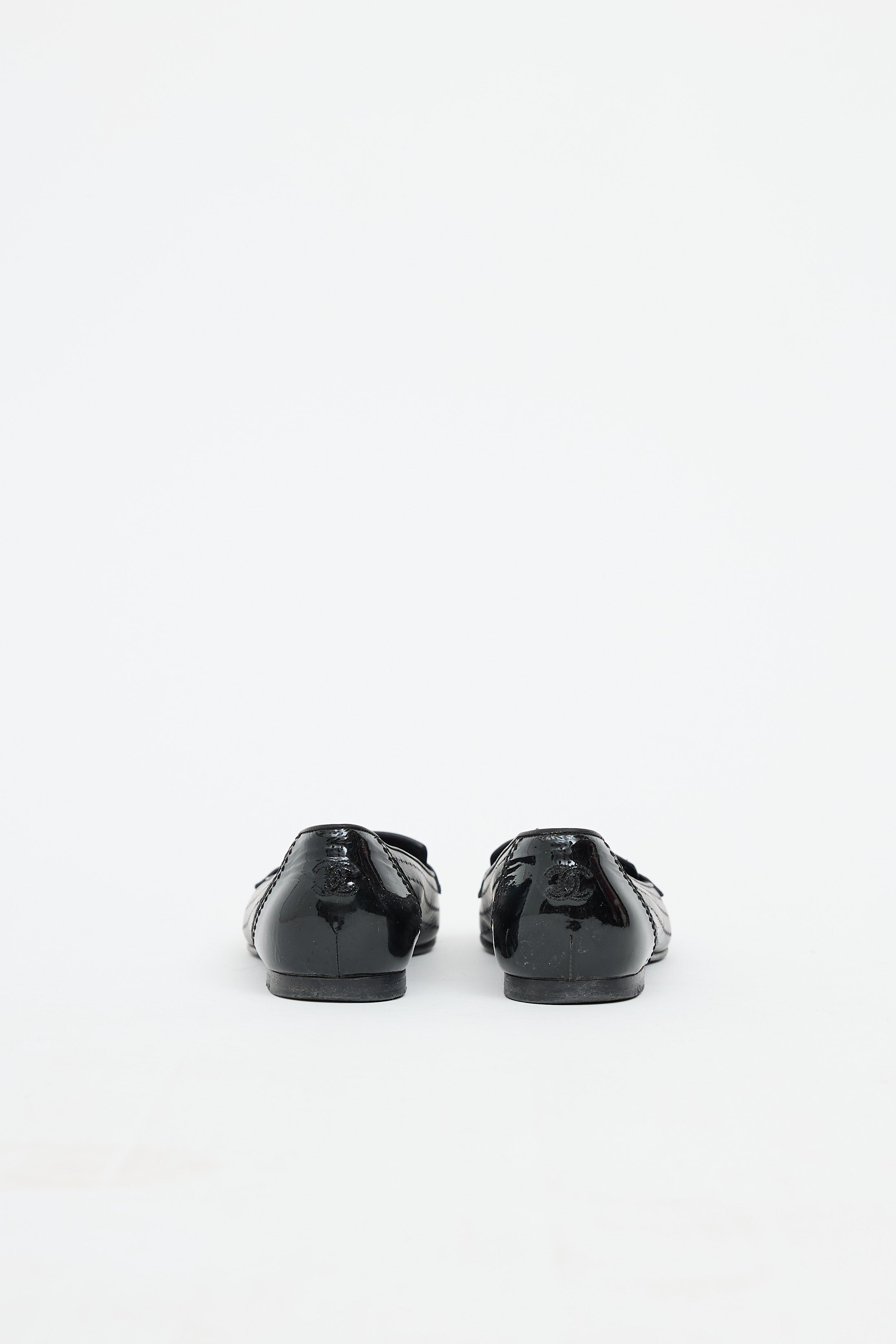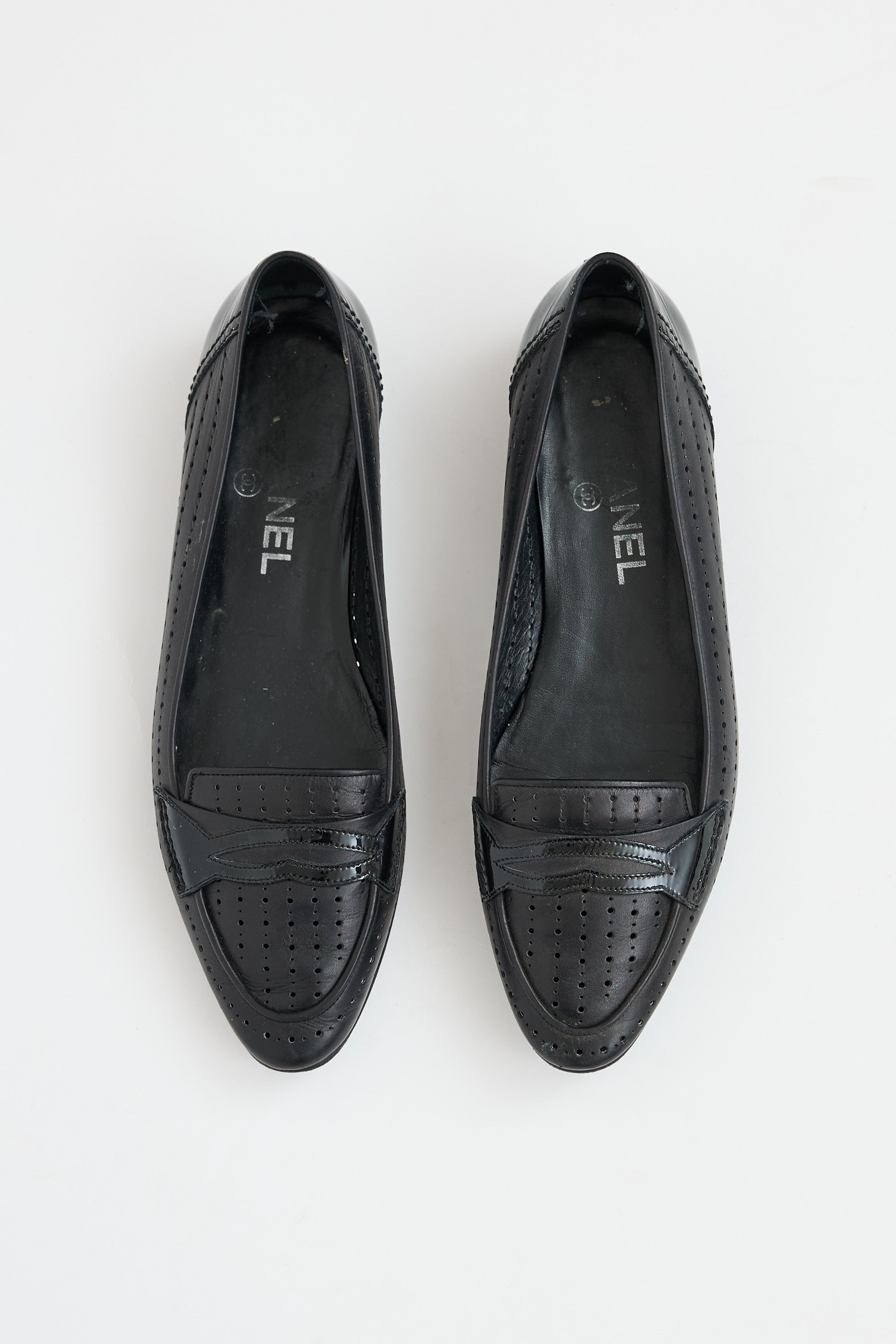 Pre-owned Chanel black perforated loafers featuring almond toe, patent trim at heel and vamp, embroidered CC circle logo at back and stacked heel.