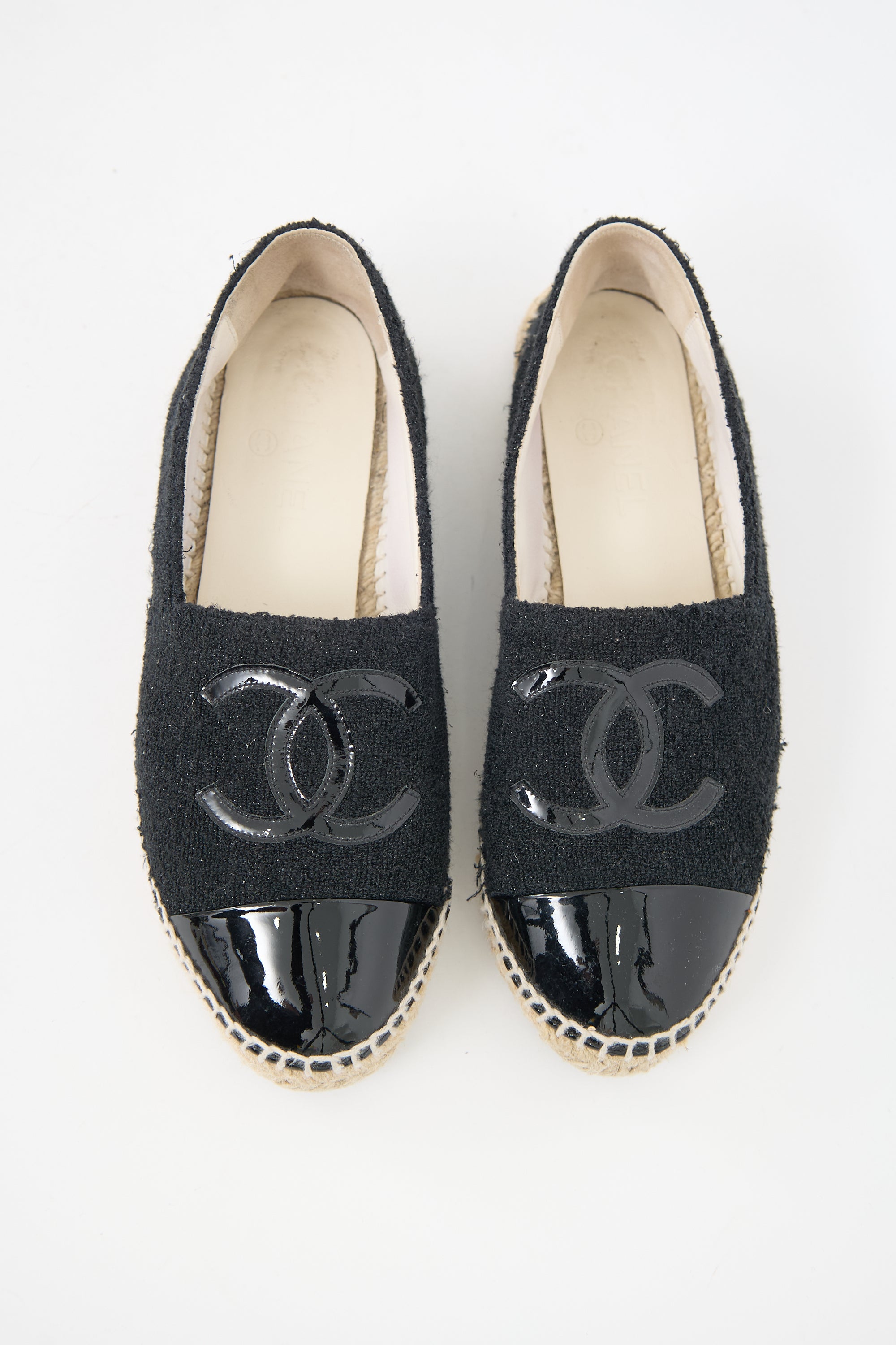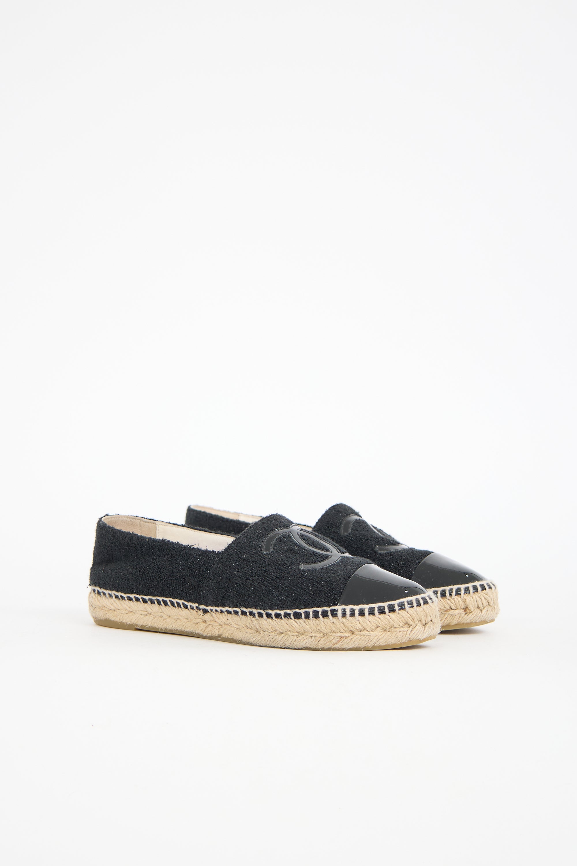 Pre-owned Chanel black espadrilles featuring rounded toe, sparkle terry upper, patent leather toe cap and interlocking CC patch, braided midsole, and rubber outsole. Comes with original dust bags.
