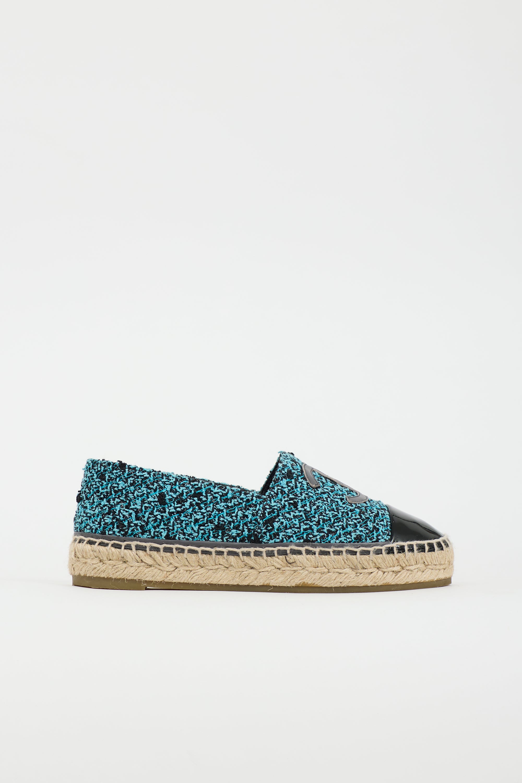 Pre-owned Chanel blue and black espadrille flat featuring patent leather rounded toe, CC logo at front, tweed upper, and jute midsole. Includes original dust bag and box.