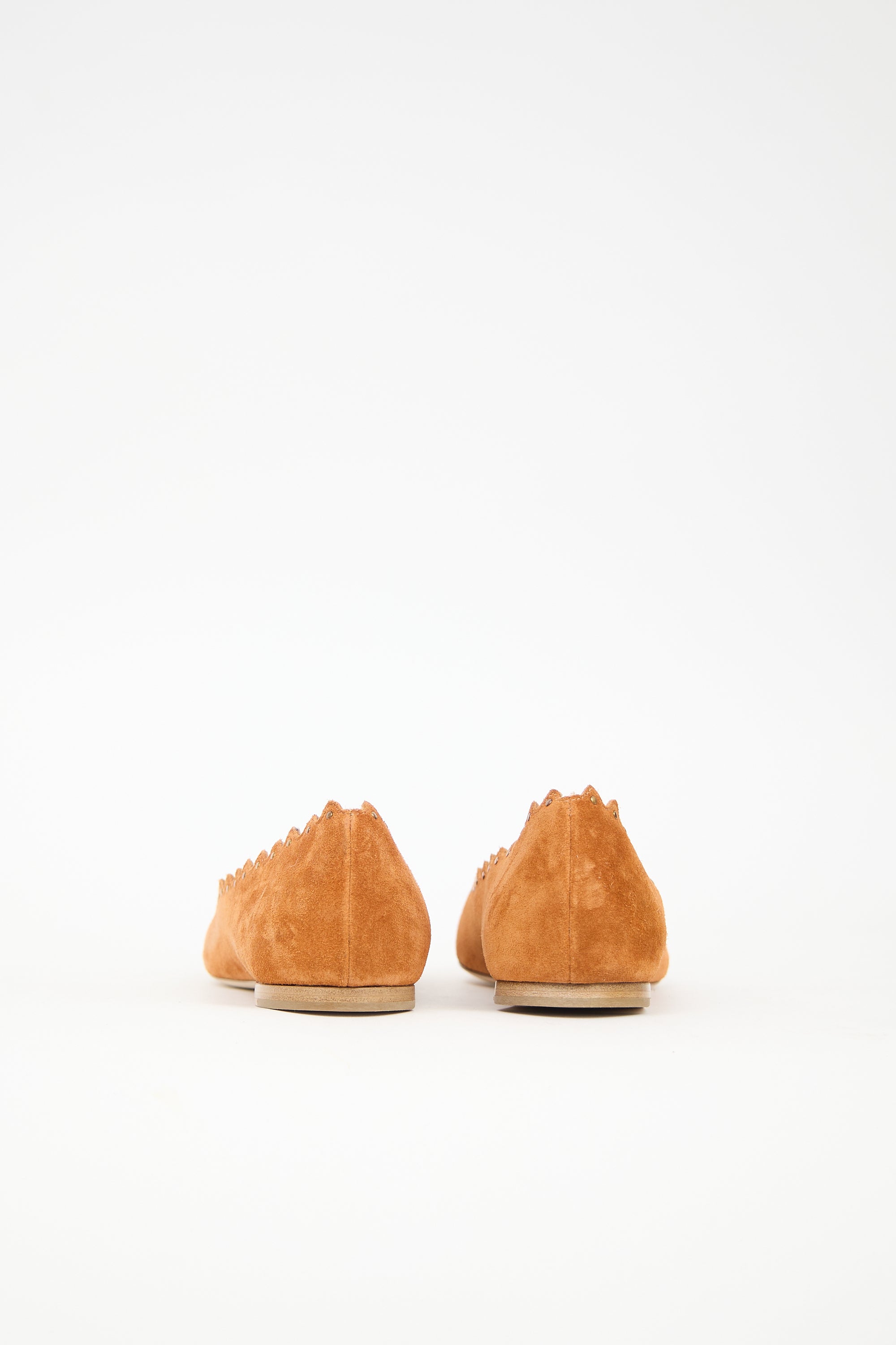 Pre-owned Chloé brown leather Lauren flats featuring rounded toe, scalloped topline with stud embellishments, and leather insole and outsole.