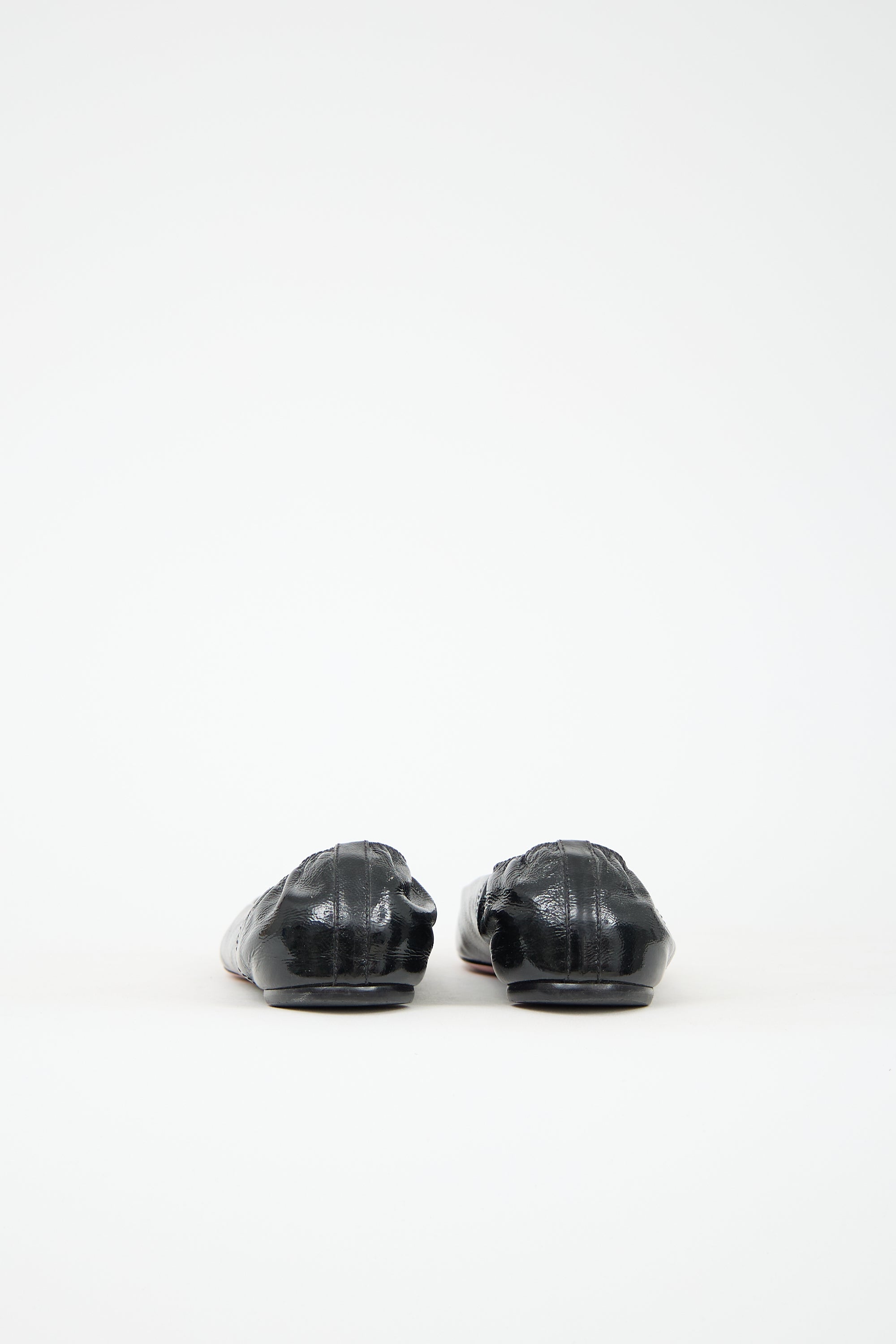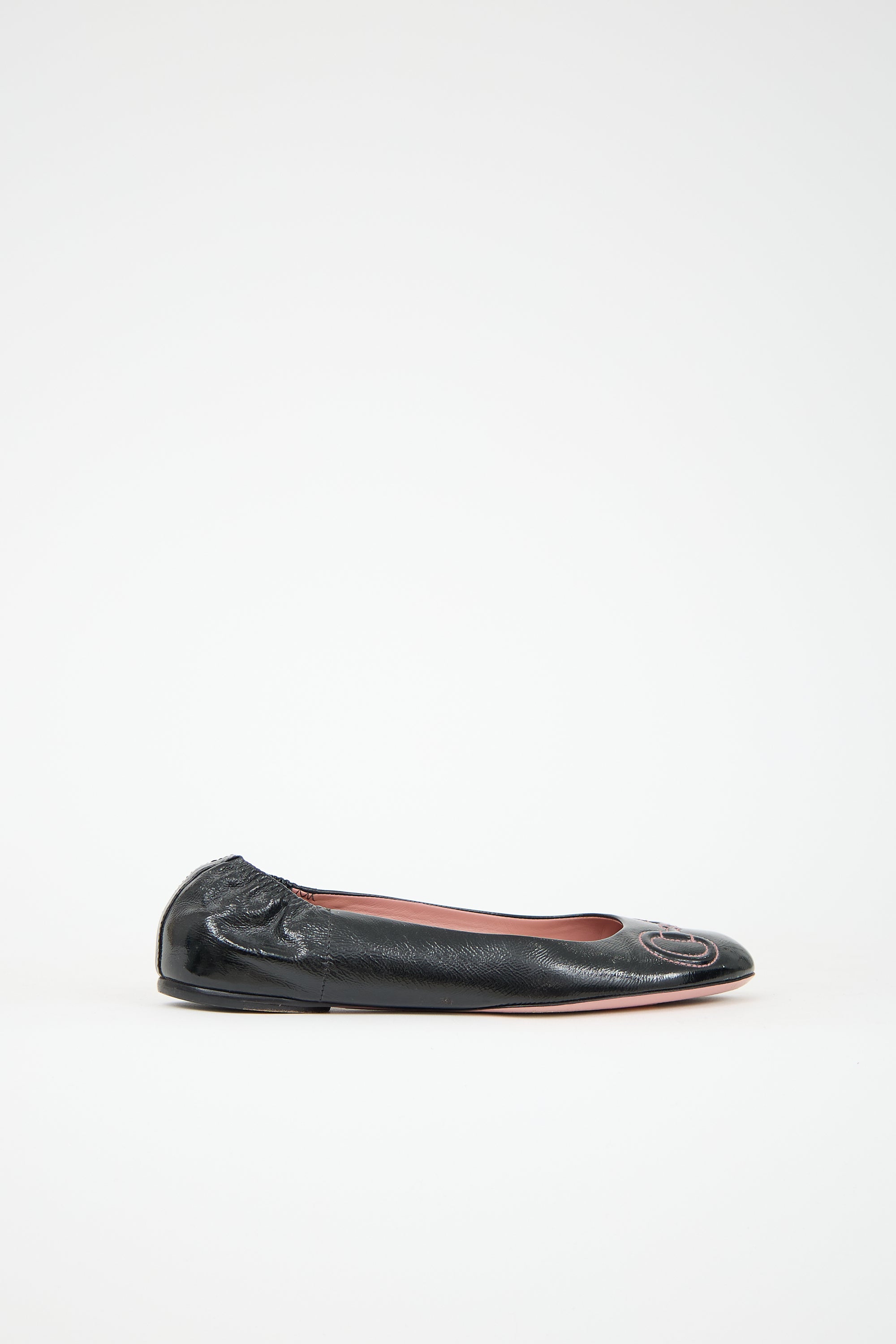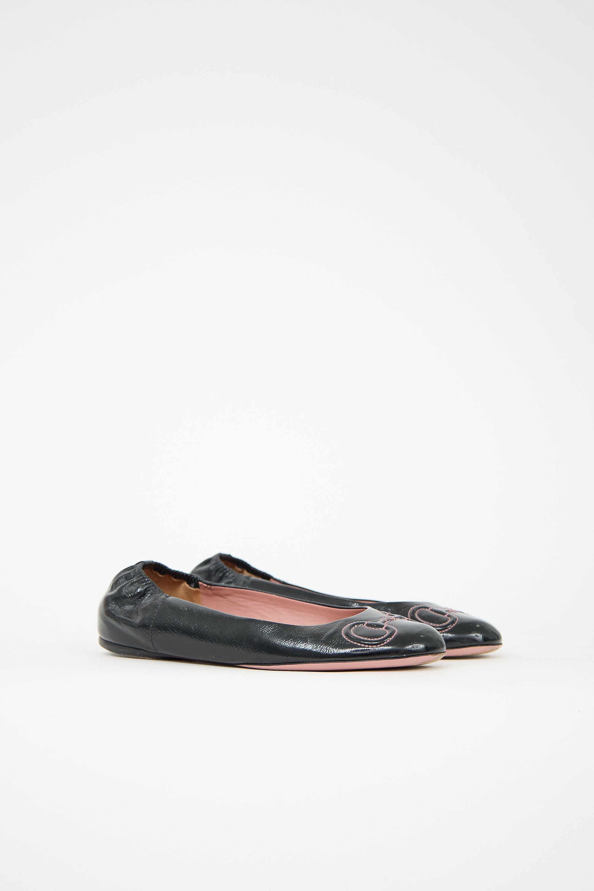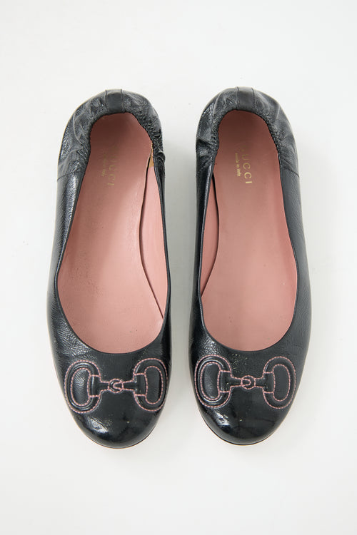 Pre-owned Gucci black patent leather ballet flats featuring a rounded toe, pink embroidered horsebit at vamp, slip on entry, and elasticized counter.