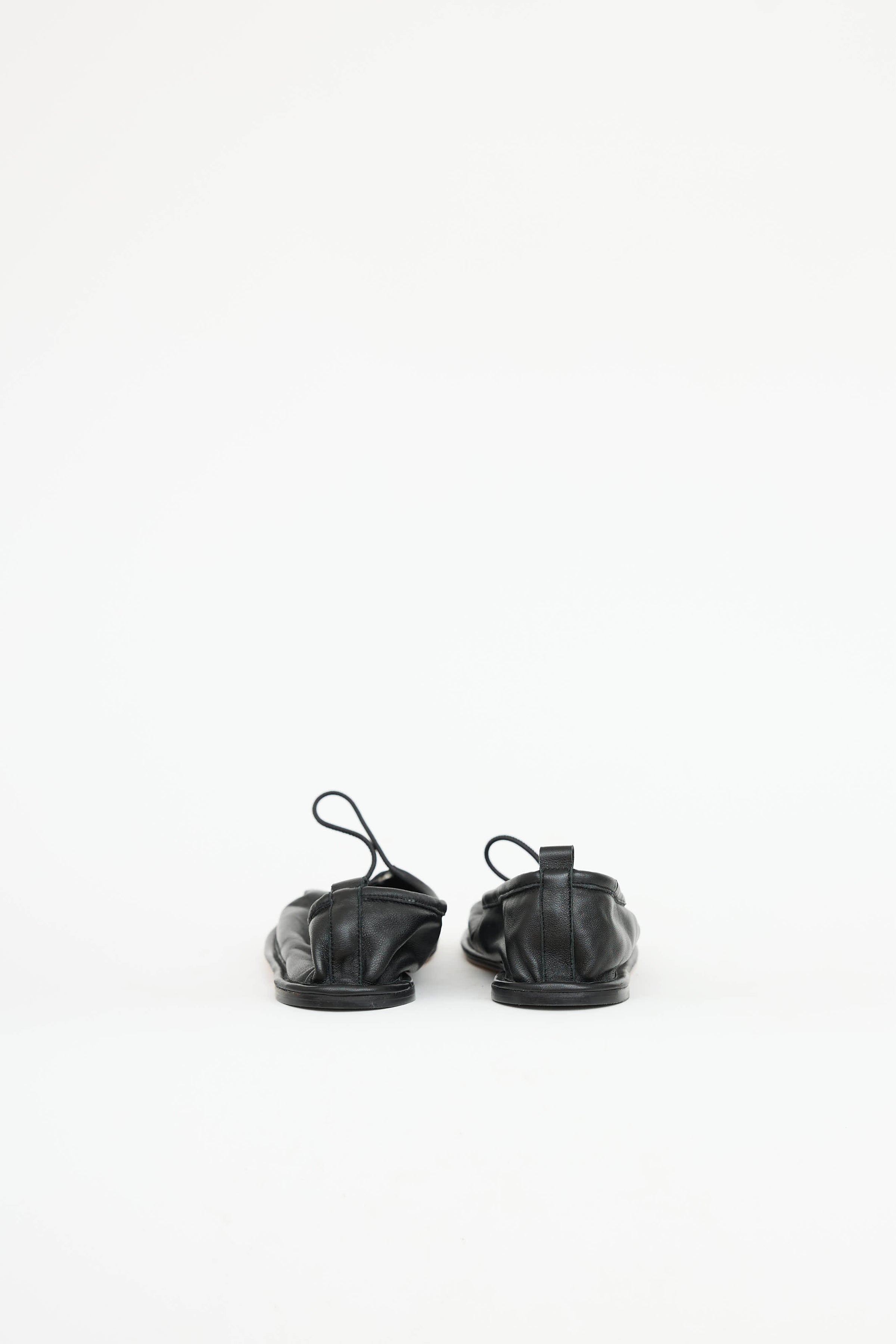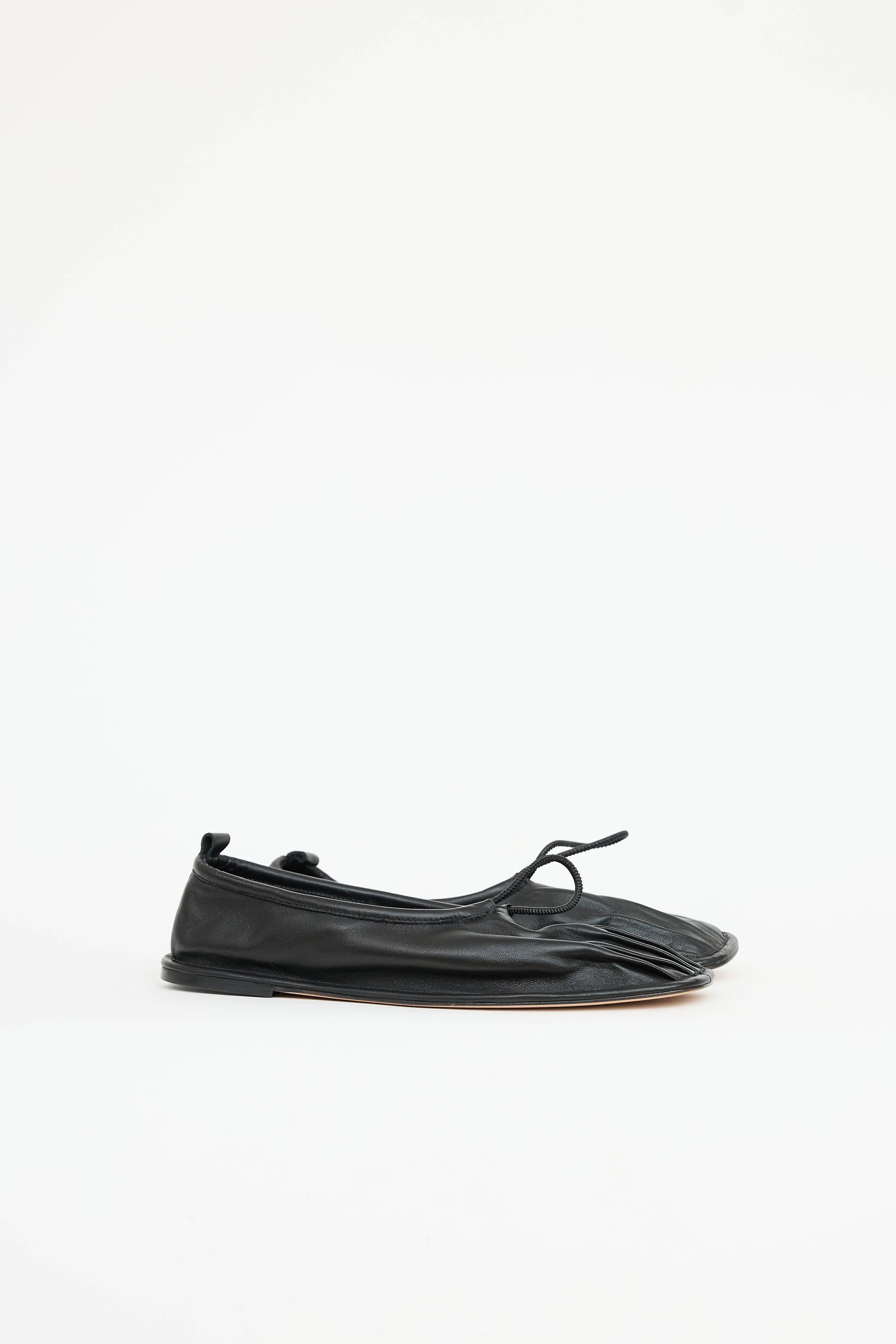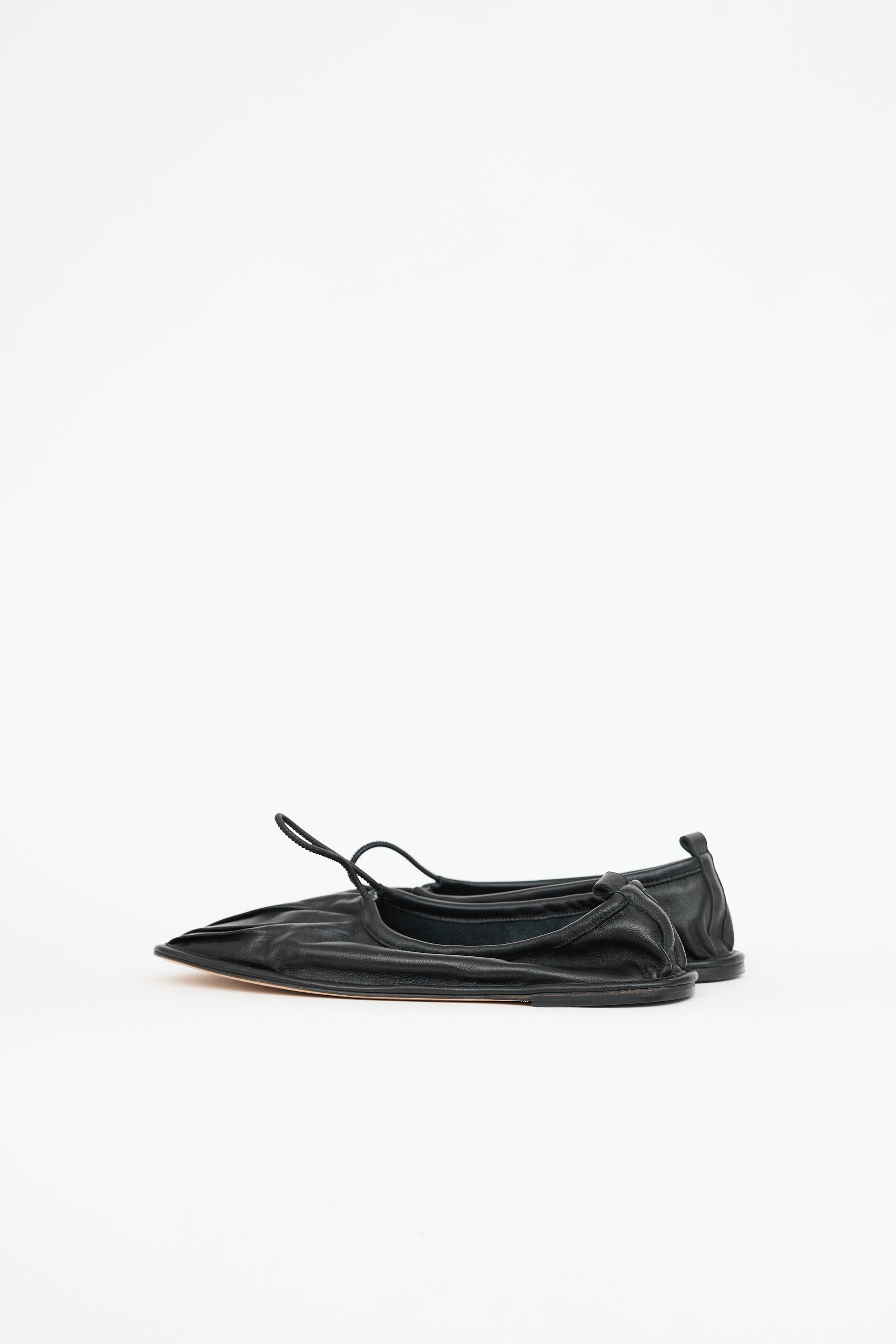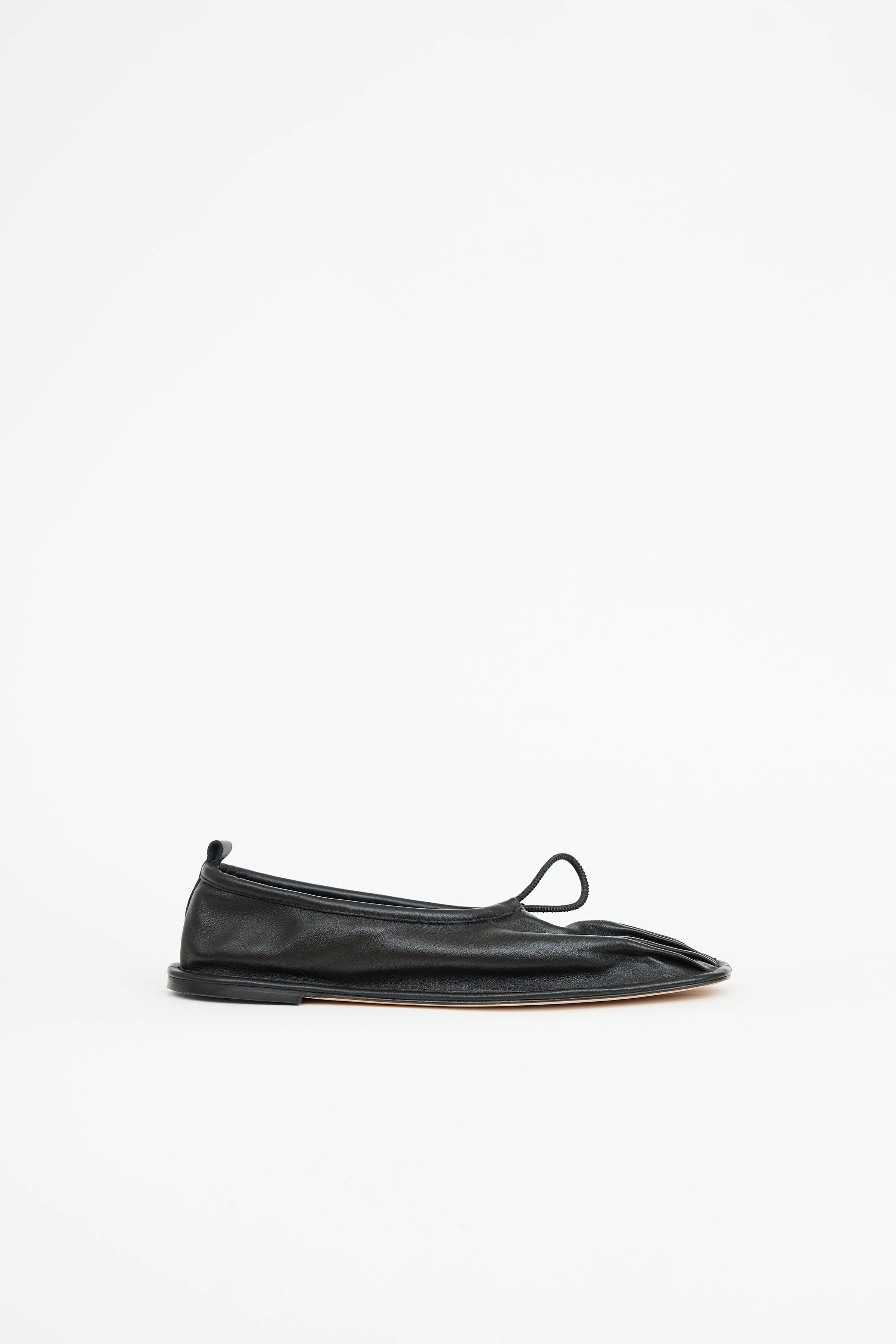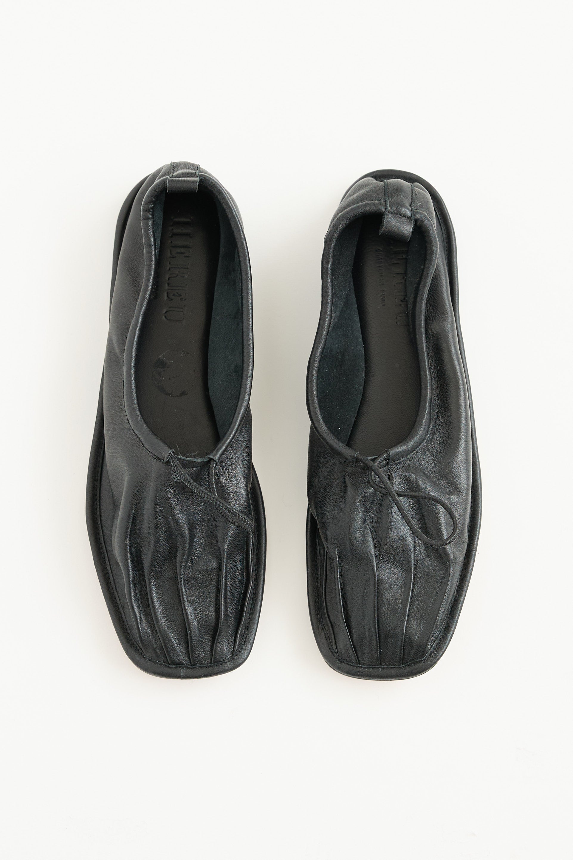 Pre-owned Hereu black leather flat featuring square toe, pleated at toe, cinched topline, and pull tab at counter.