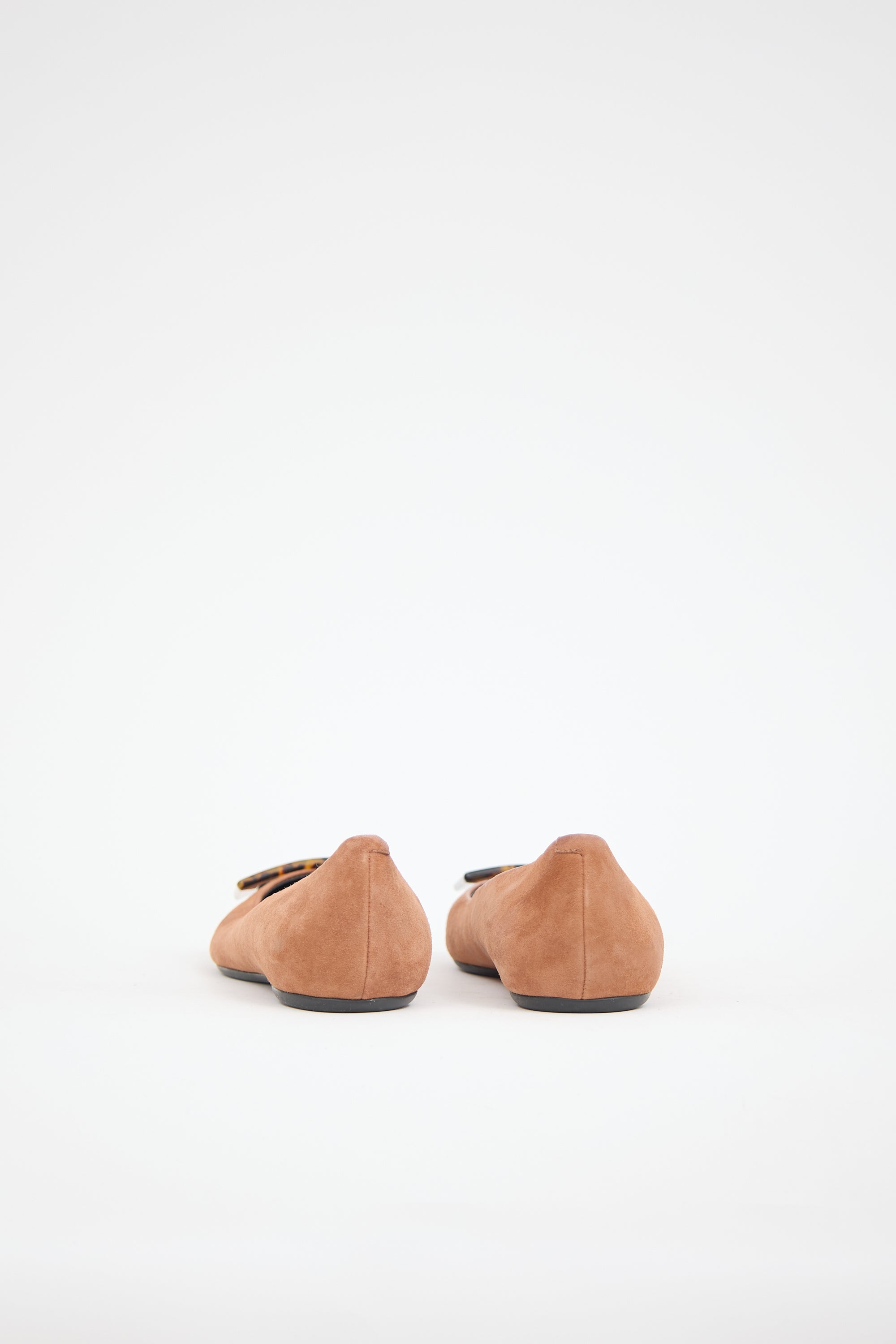 Pre-owned Roger Vivier brown suede flats featuring a rounded toe with tortoiseshell resin buckle, slip on entry, and rubber sole.