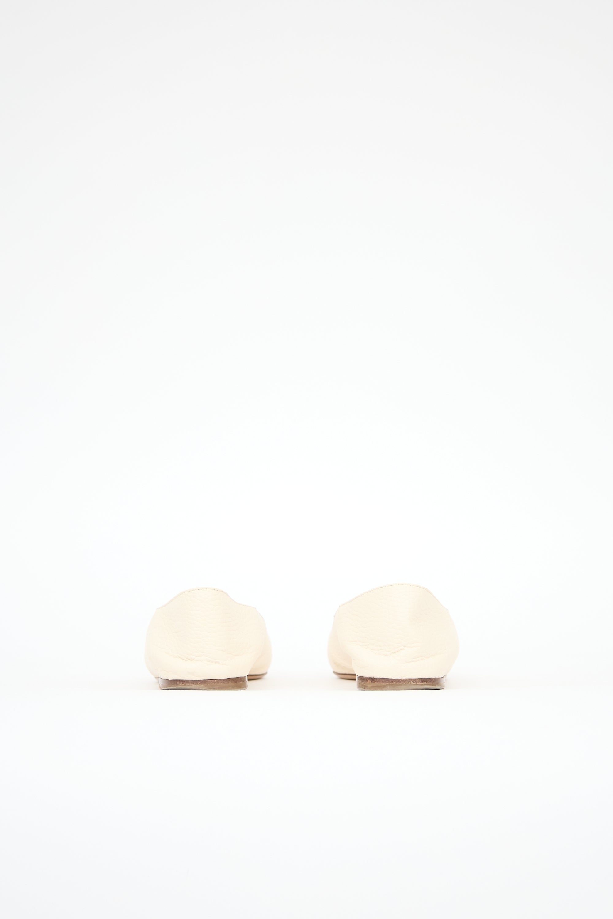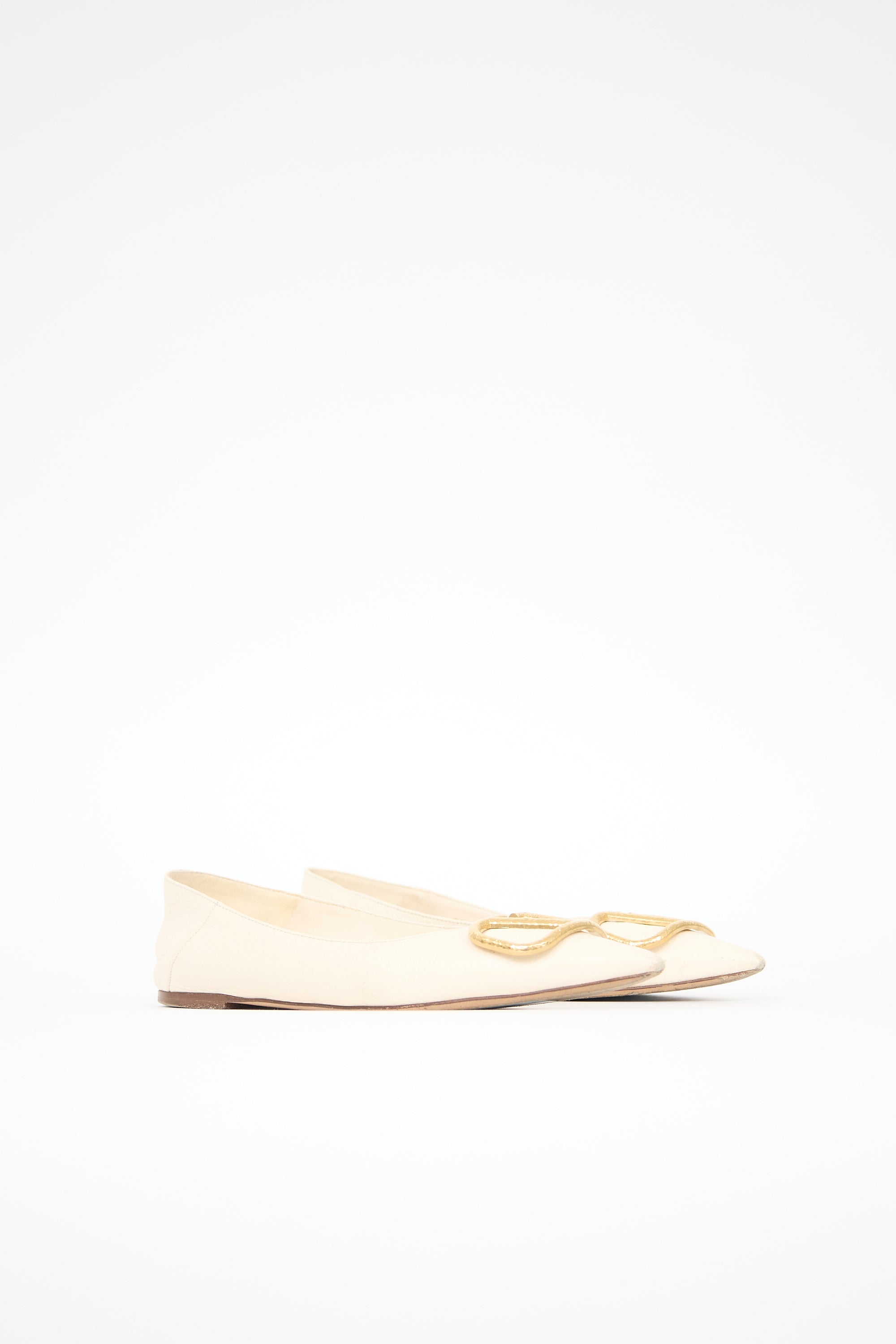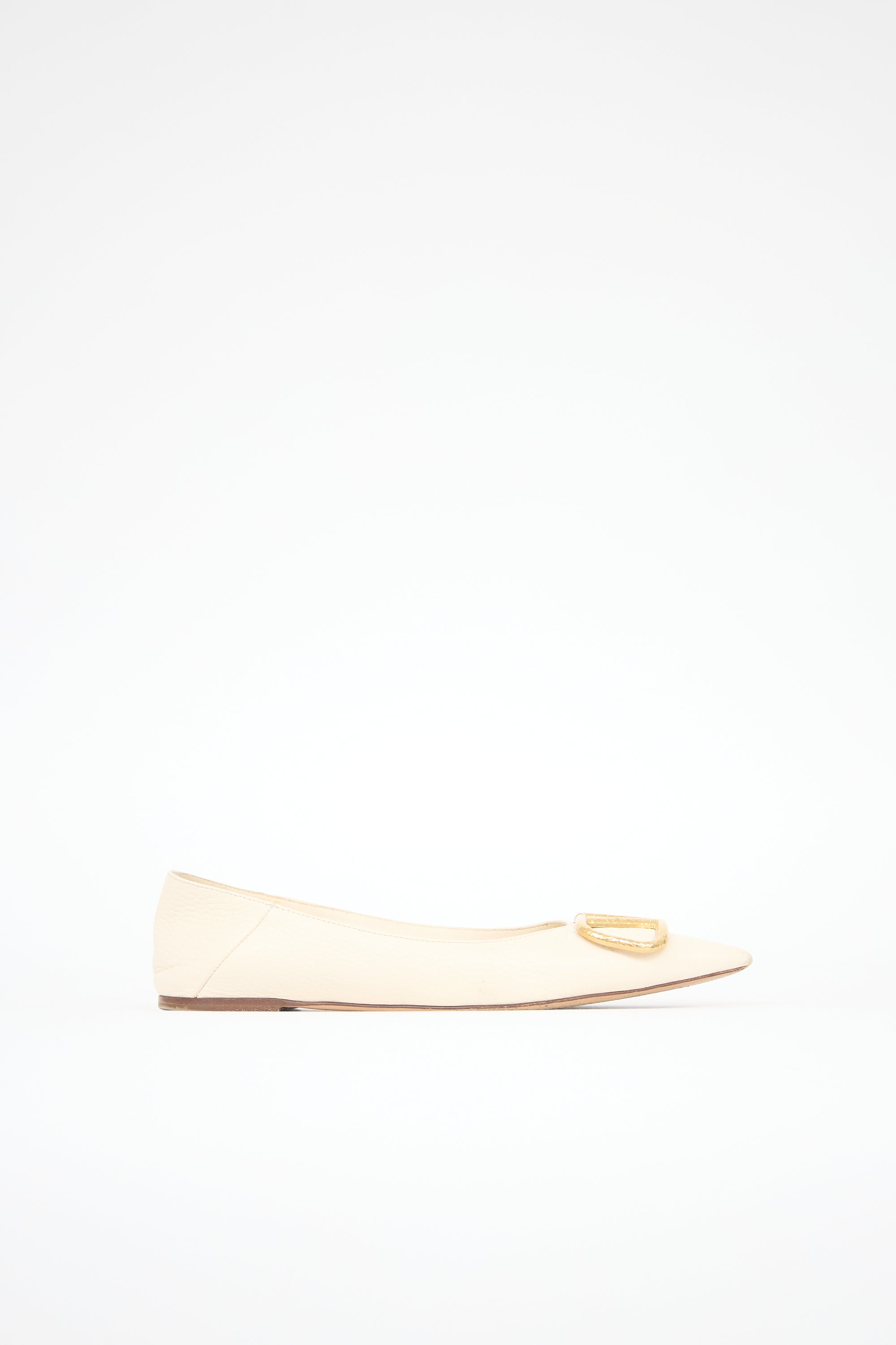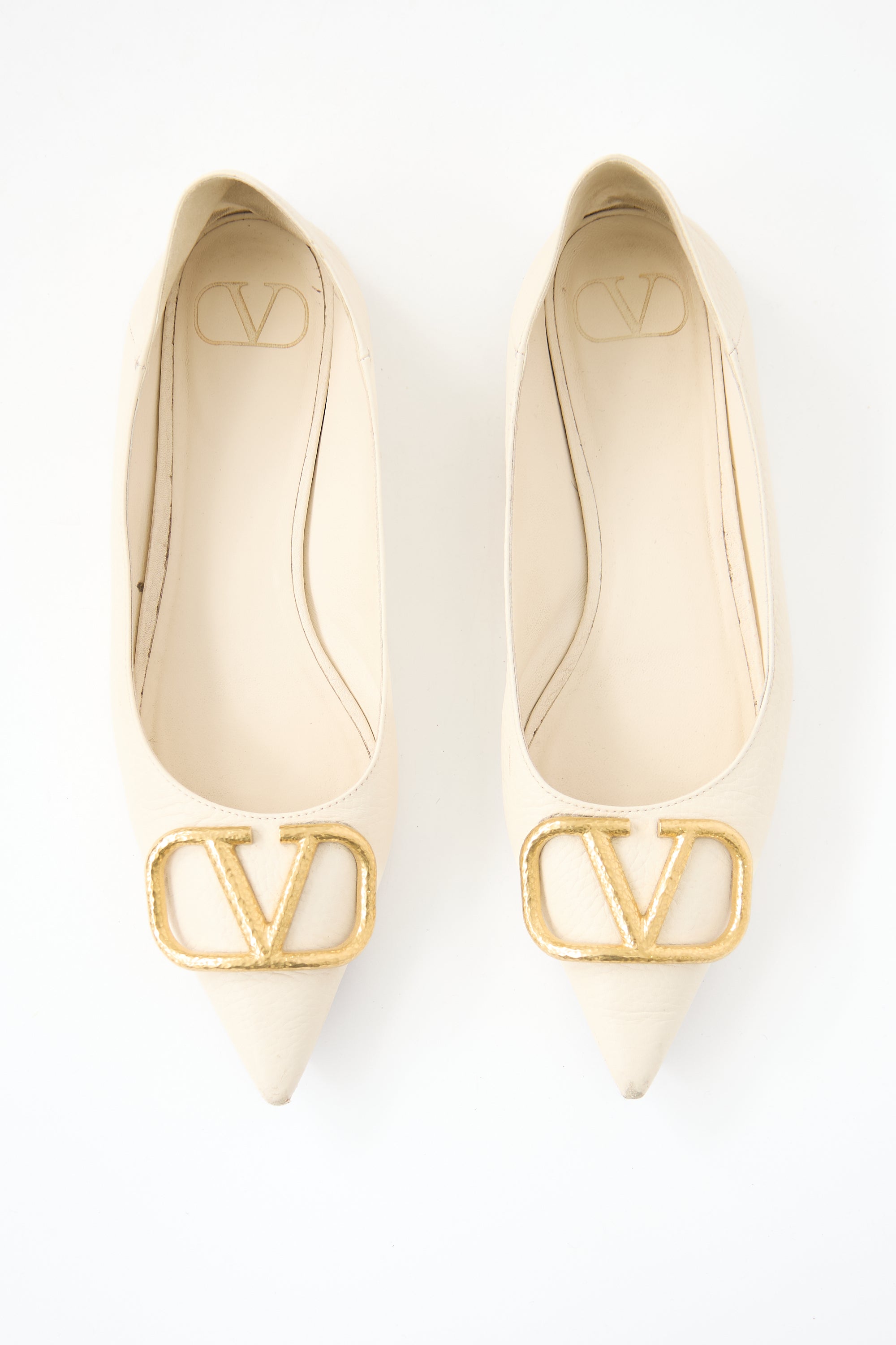 Pre-owned Valentino cream leather flats featuring pointed toe, gold tone Vlogo embellishment at vamp, and leather insole and outsole. Comes with original dust bag.