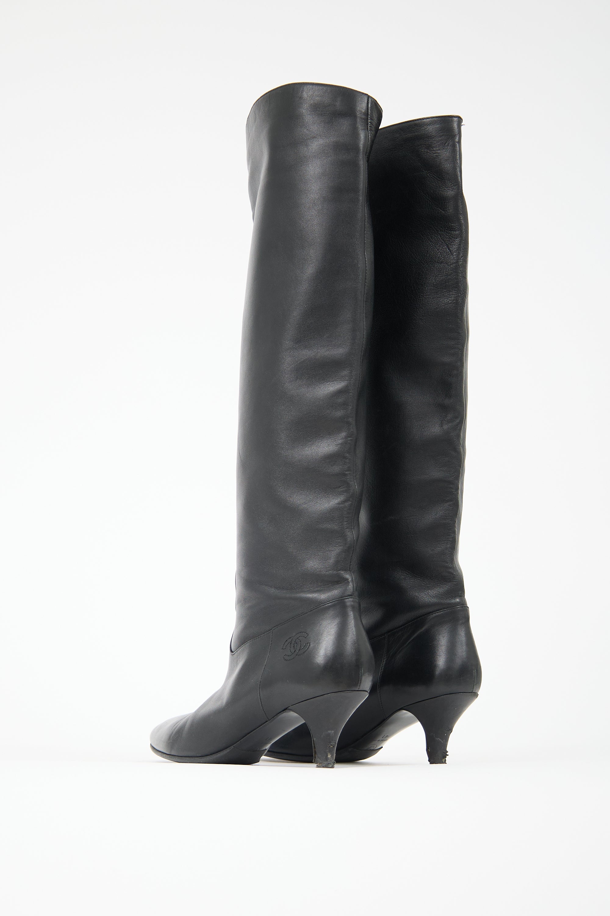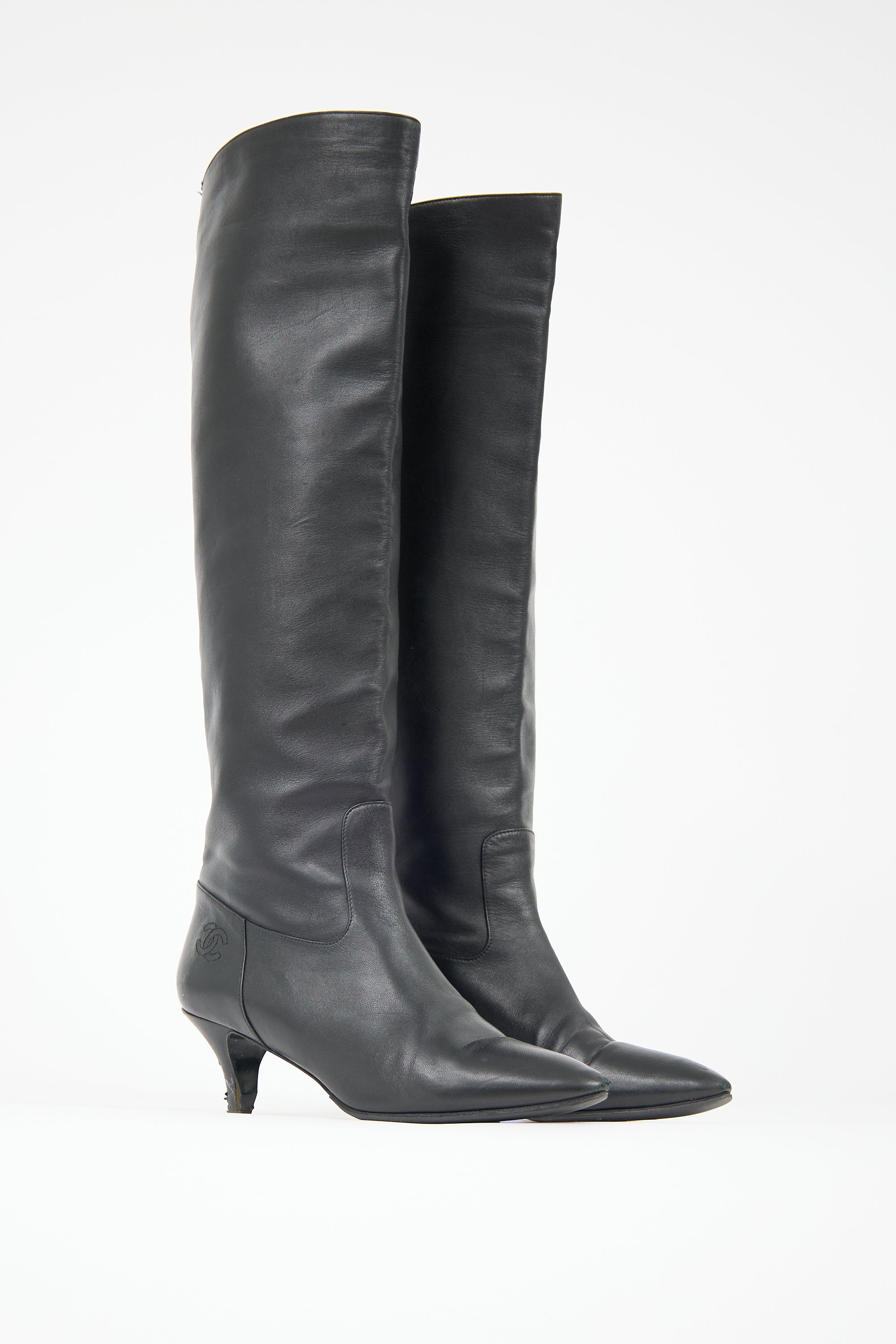 Pre-owned Chanel black leather boots featuring pointed toe, stitched CC logo at outer side, kitten heel, and pull on entry.