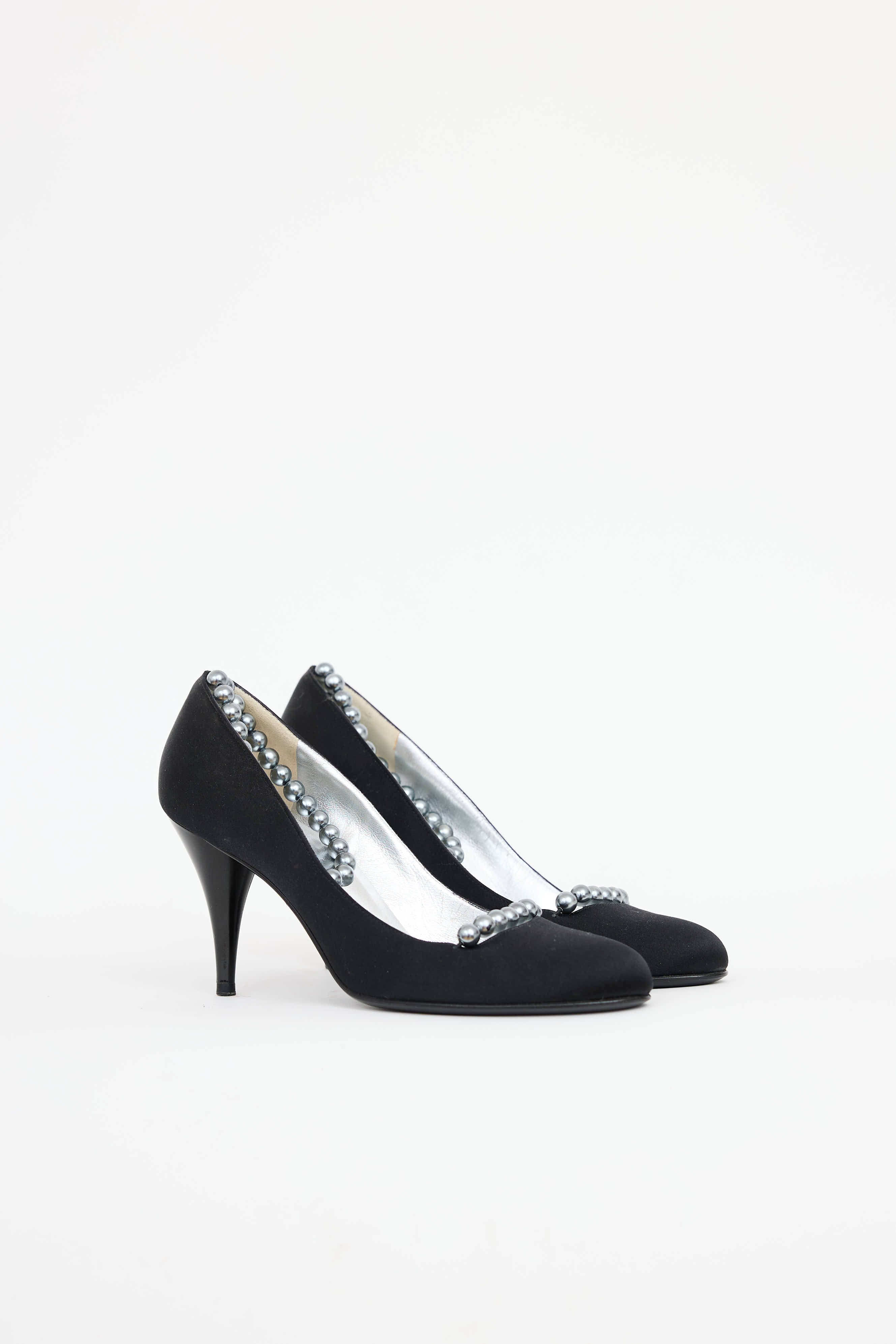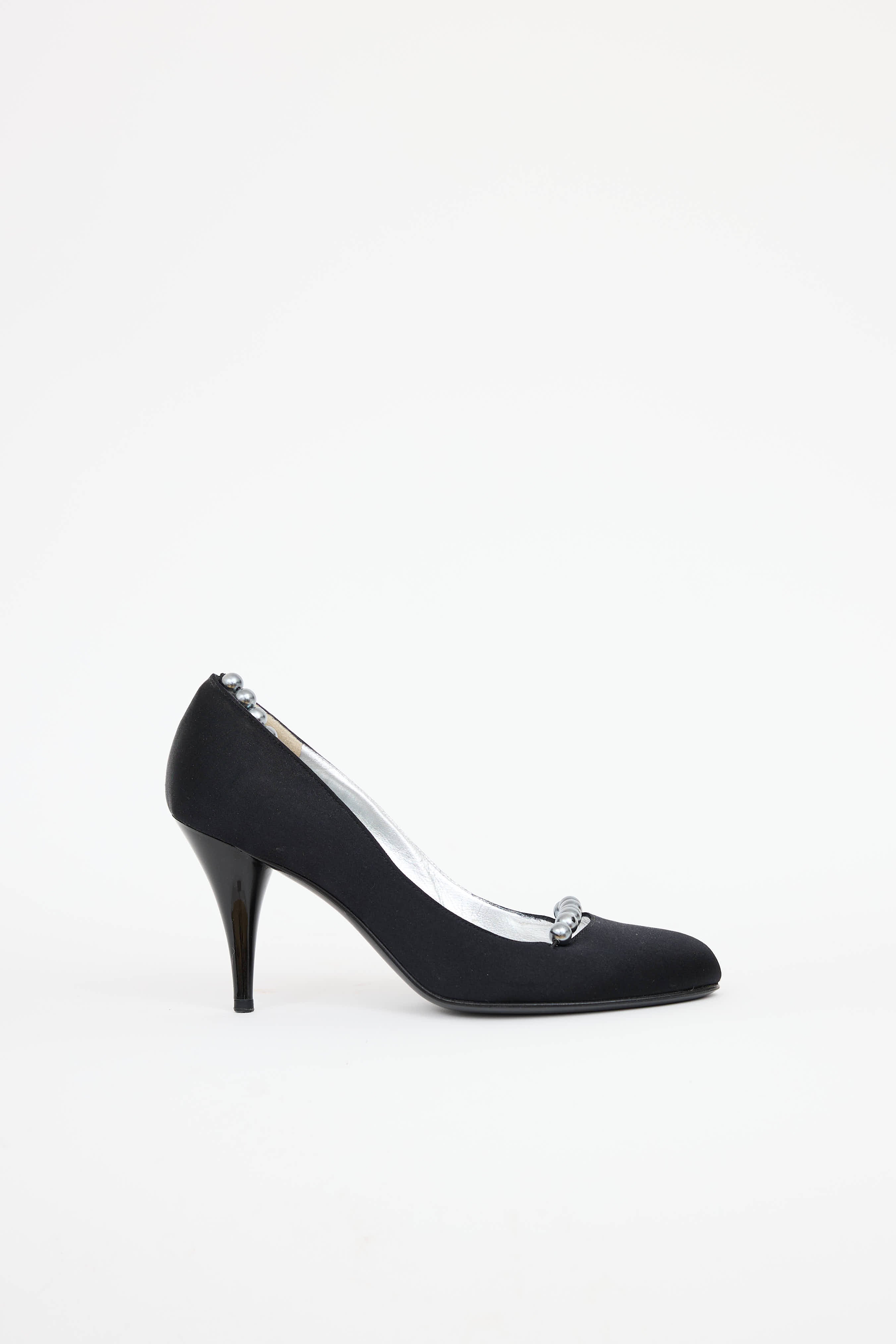 Pre-owned Chanel black satin pearl pumps featuring round toe, pearl strap at vamp, slip on pearl strap, and enamel heel.