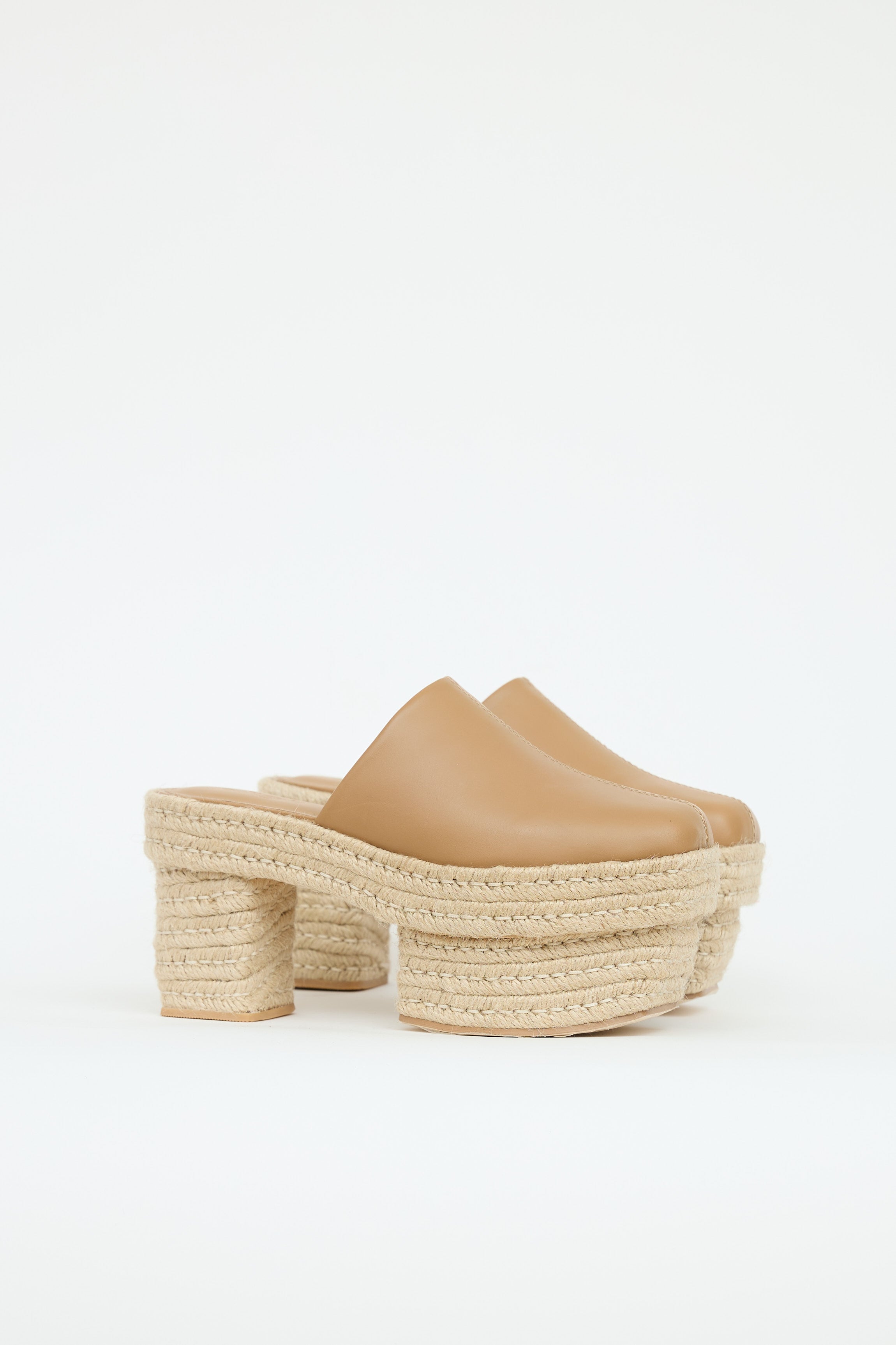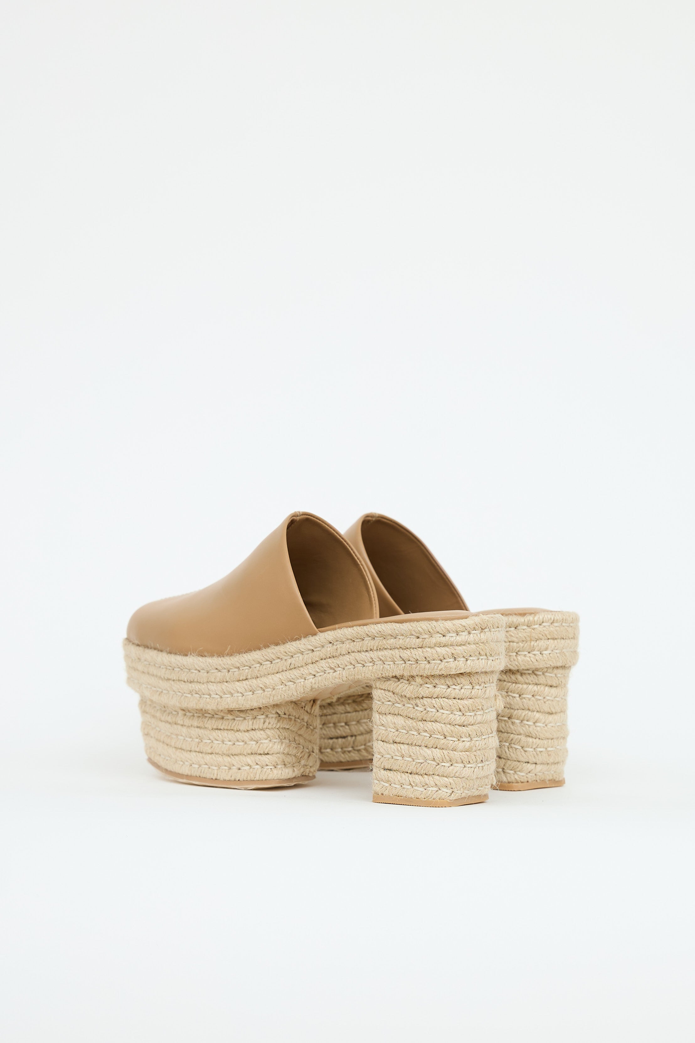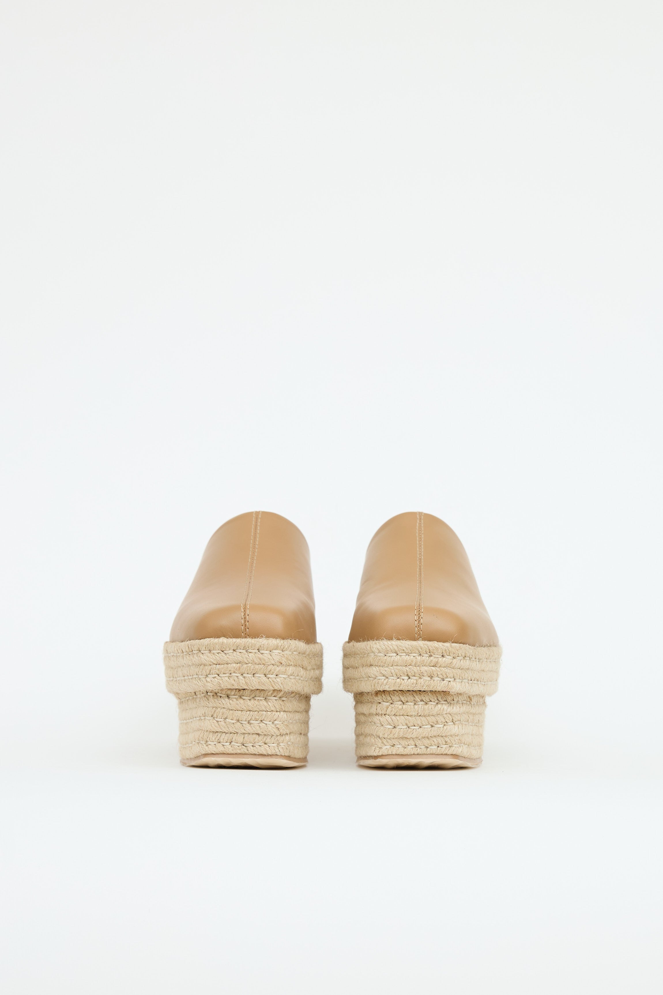 Pre-owned Cult Gaia beige leather Leah espadrille clogs featuring a round toe, leather upper with tonal stitching, espadrille platform and block heel, and leather outsole.