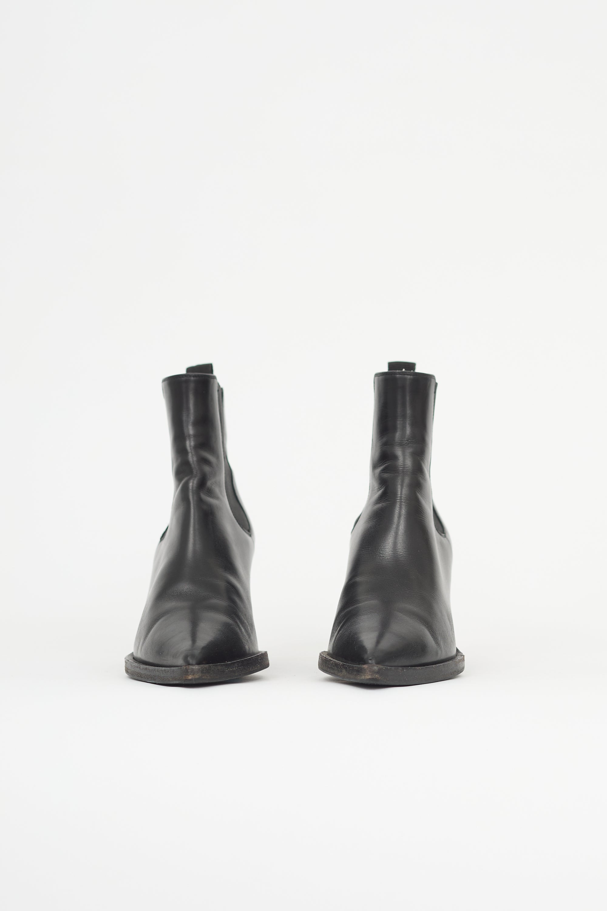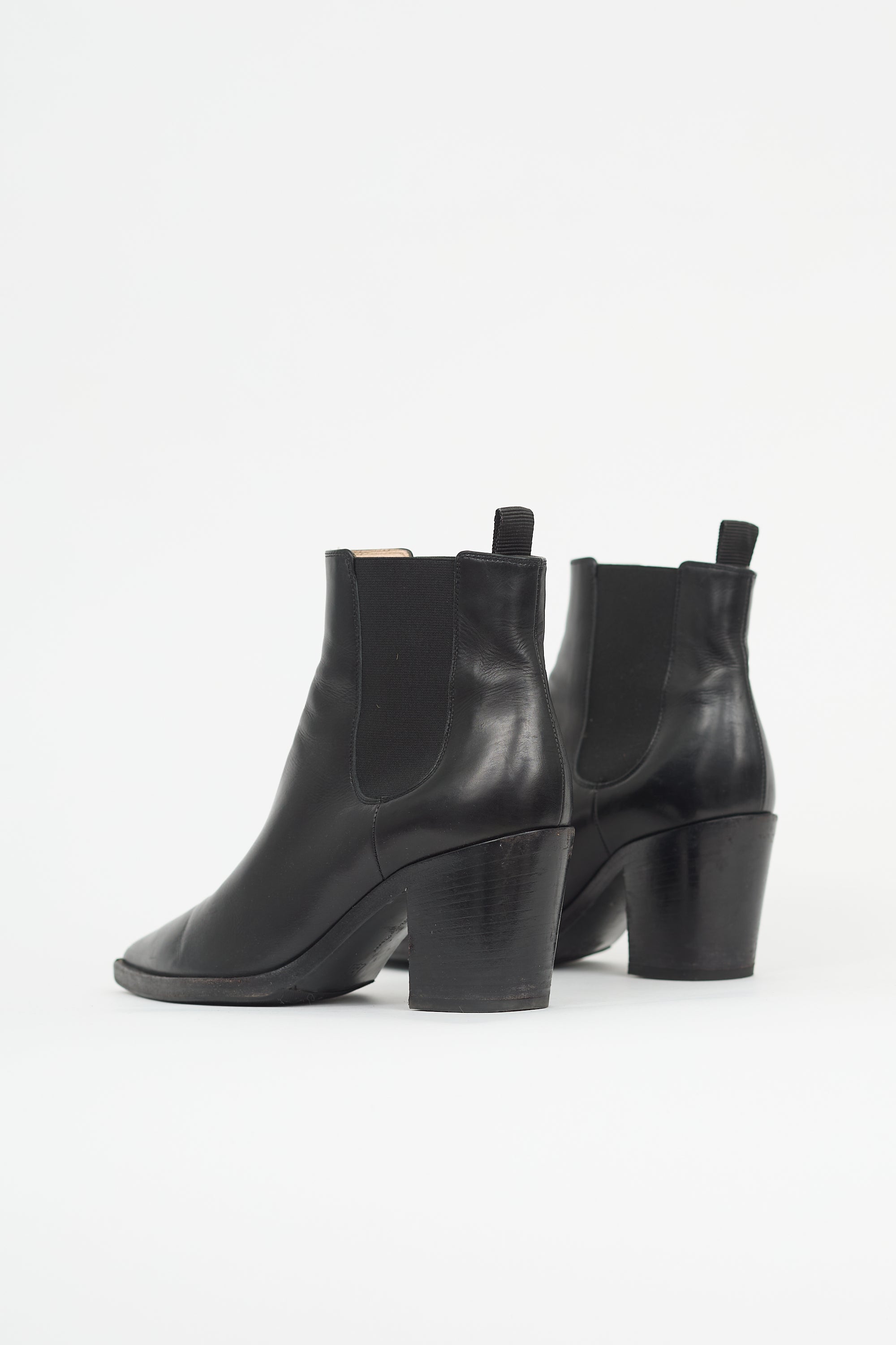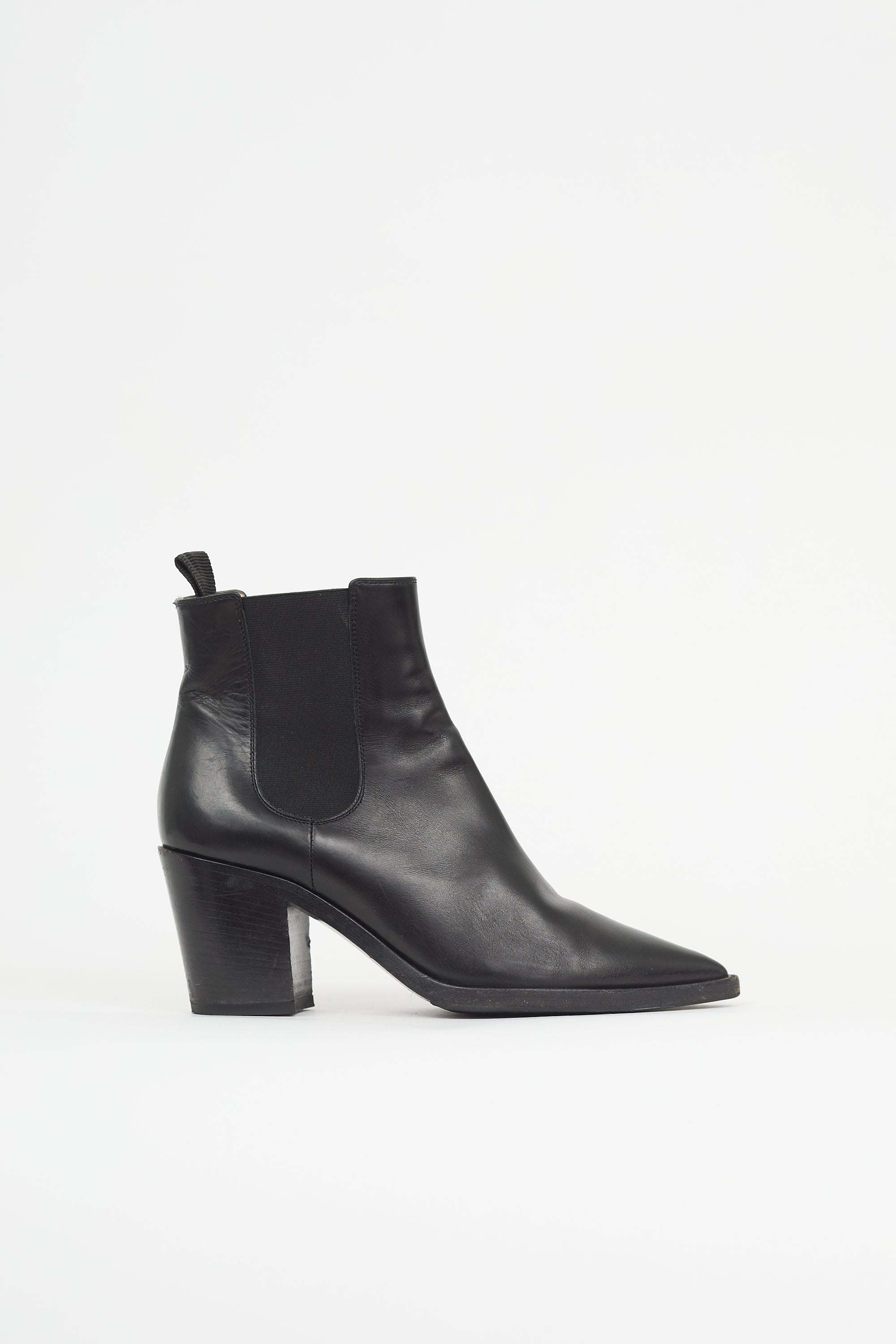 Pre-owned Gianvito Rossi black leather Romney boots featuring pointed toe, elasticized gore, pull tab at back, and stacked block heel.