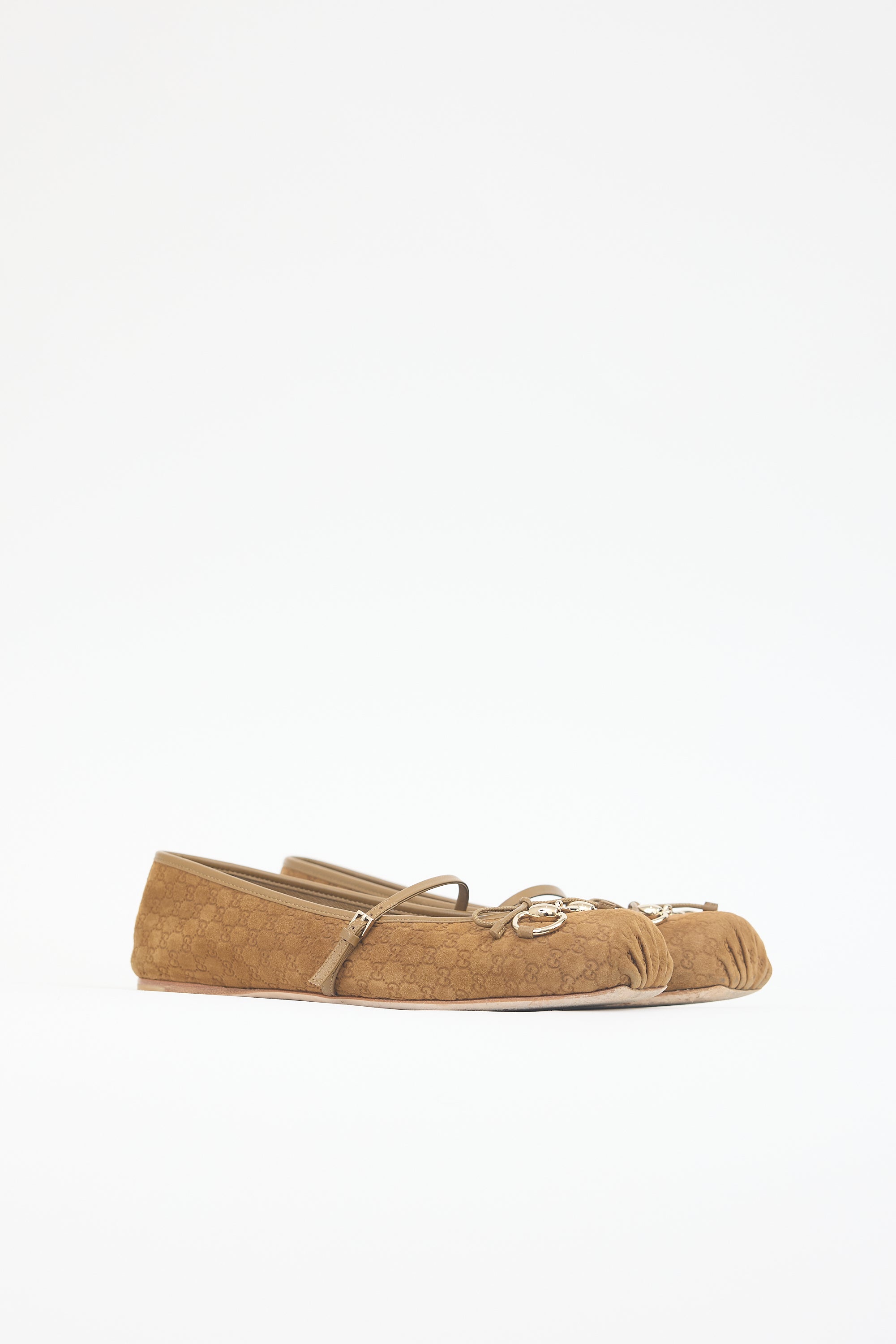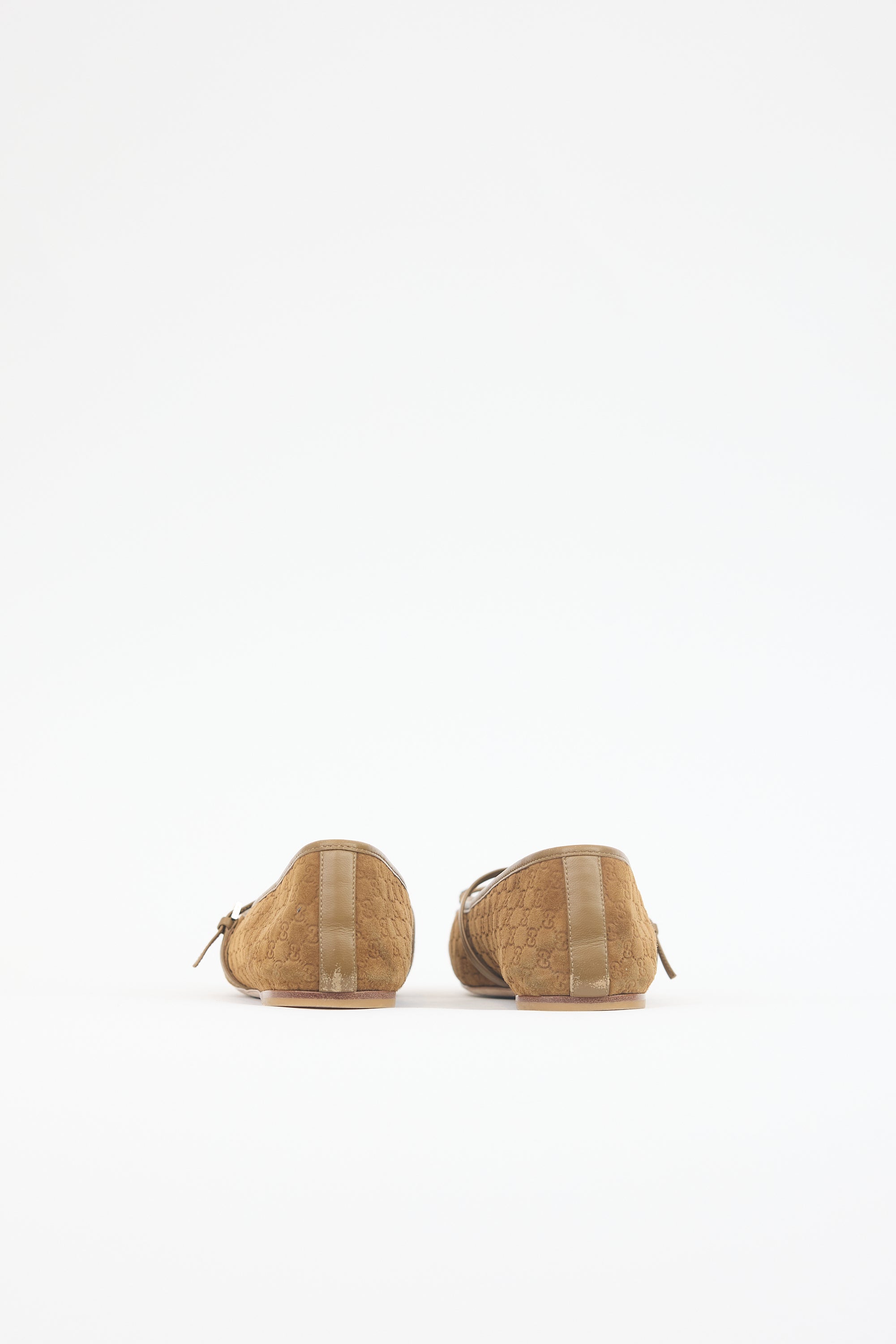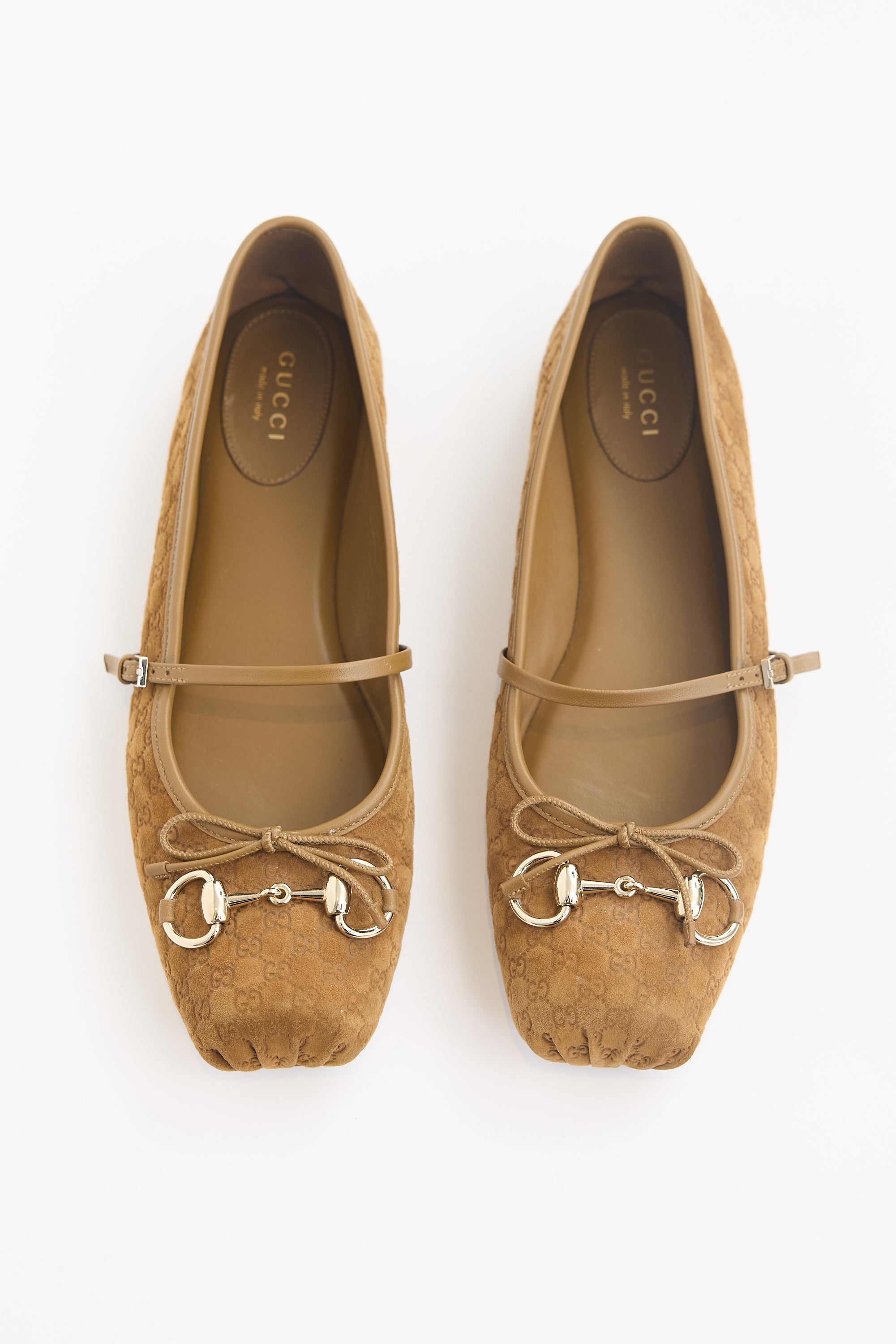 Pre-owned Gucci brown suede ballet flats featuring a square tucked toe, gold tone Horsebit at vamp, leather bow detail and trimmed collar, adjustable leather strap across instep, and a stacked sole.