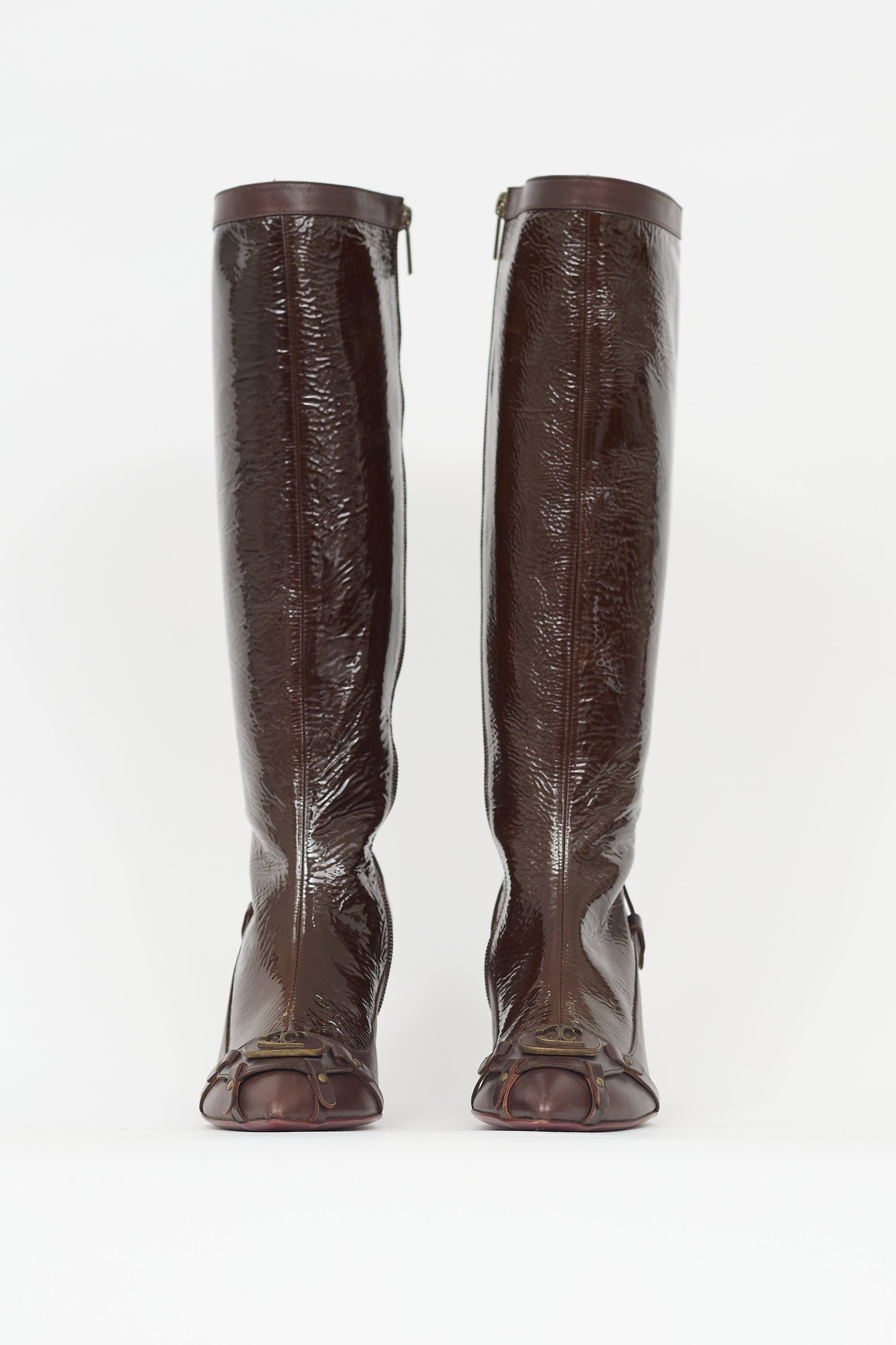 Pre-owned Just Cavalli brown boots featuring pointed toe, patent leather upper, smooth leather panel, bronze tone logo at toe, zip closure at side, and stiletto heel.