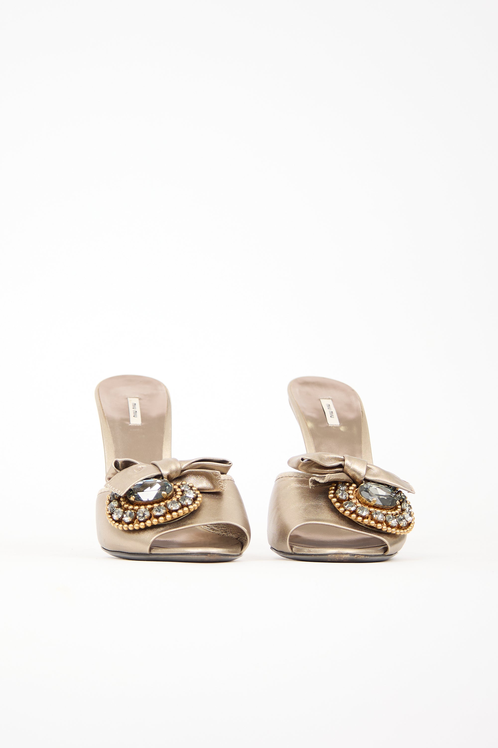 Pre-owned Miu Miu champange gold tone metallic leather sandals featuring almond peep toe, bow and inset crystal embellishment at vamp, and covered stiletto heel. Comes with original dust bags.