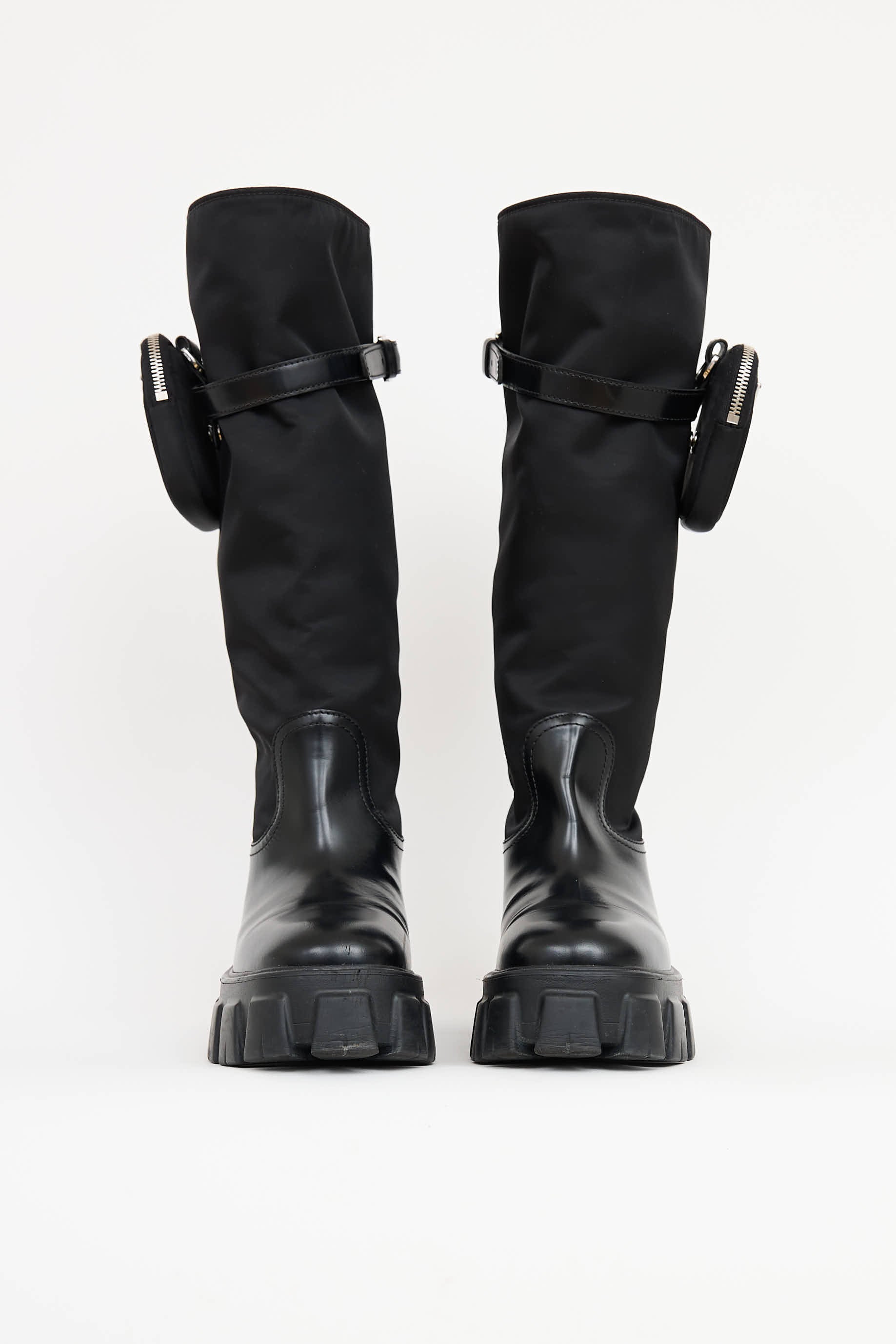 Pre-owned Prada black Monolith Re-Nylon tall boots featuring round toe, leather trim upper, chunky lug sole, silver tone hardware, removable zip logo pouch at collar, debossed logo at tongue.