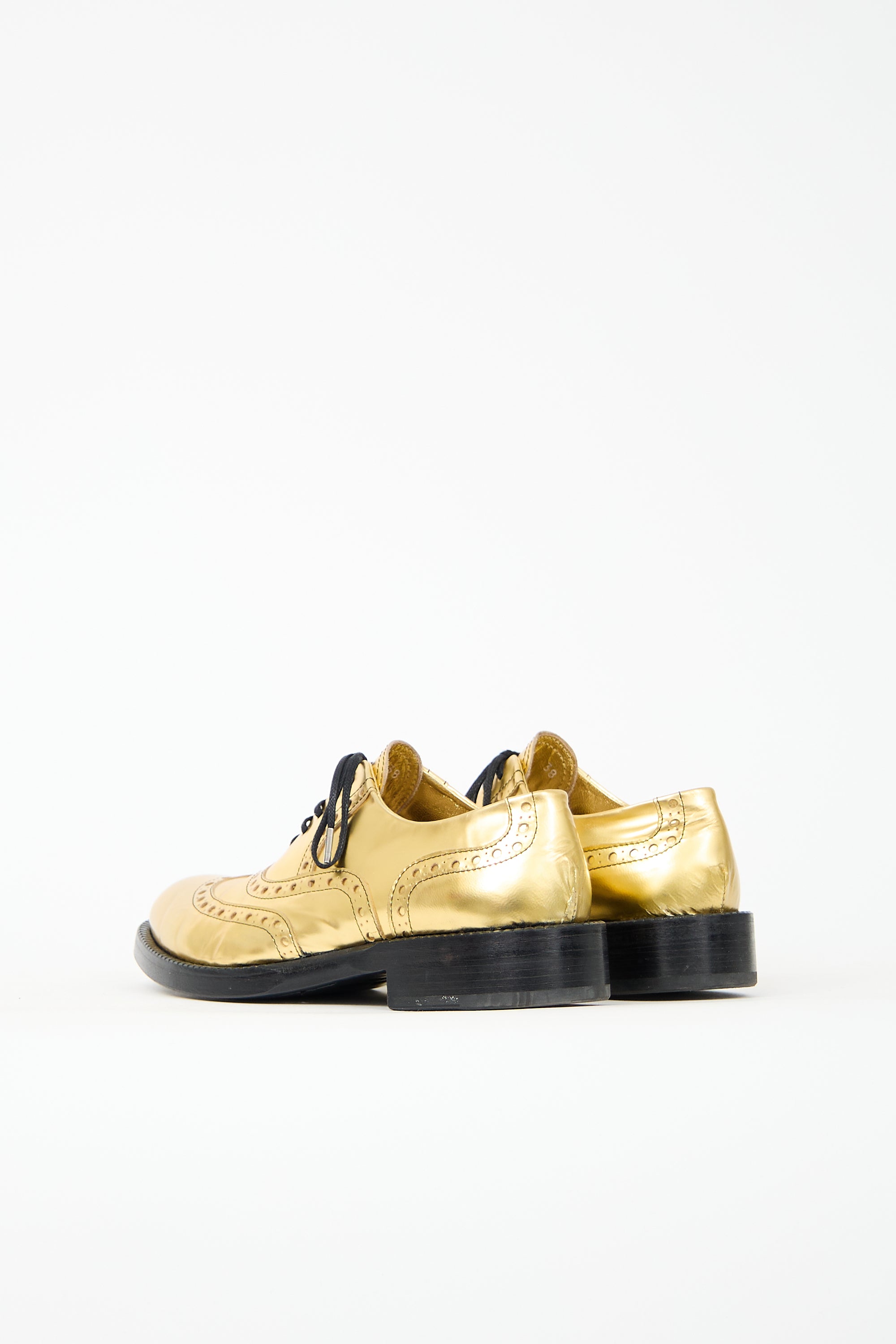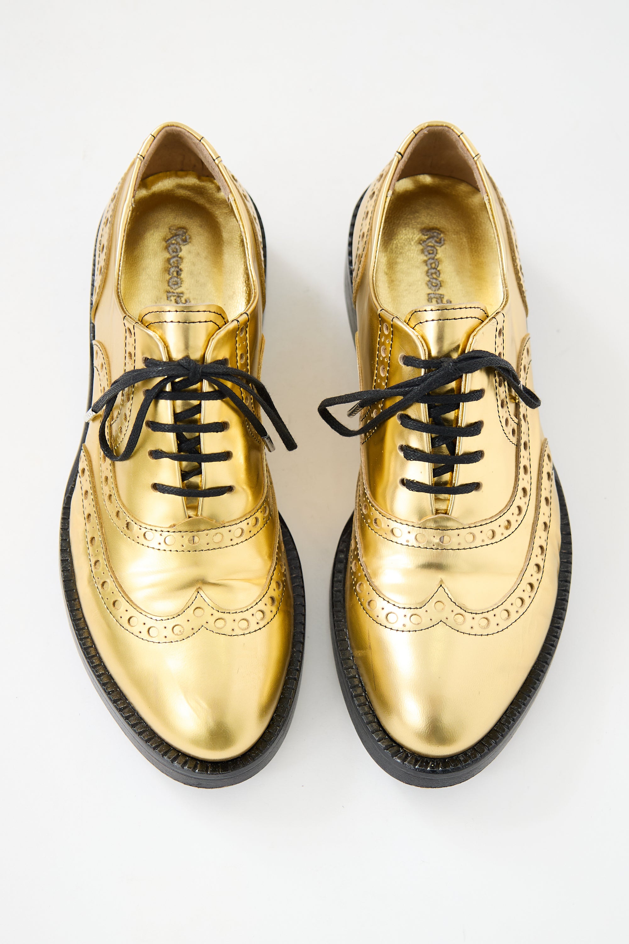 Pre-owned Rocco P. gold leather brogue oxfords featuring an almond toe, perforated upper, lace up front, and stacked heel.