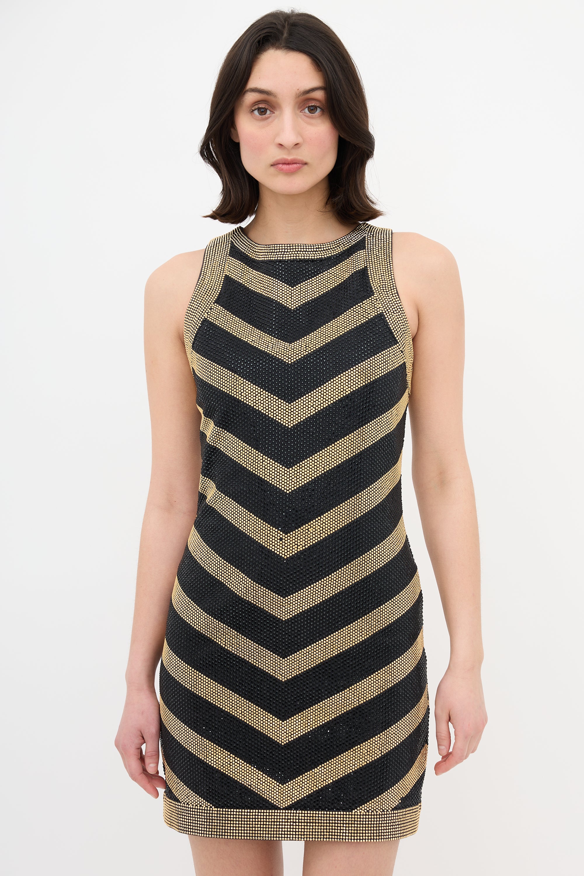 Pre-owned Balmain black and gold sleeveless dress featuring a round neckline, back zip closure, and chevron patterned rhinestone embellishments.