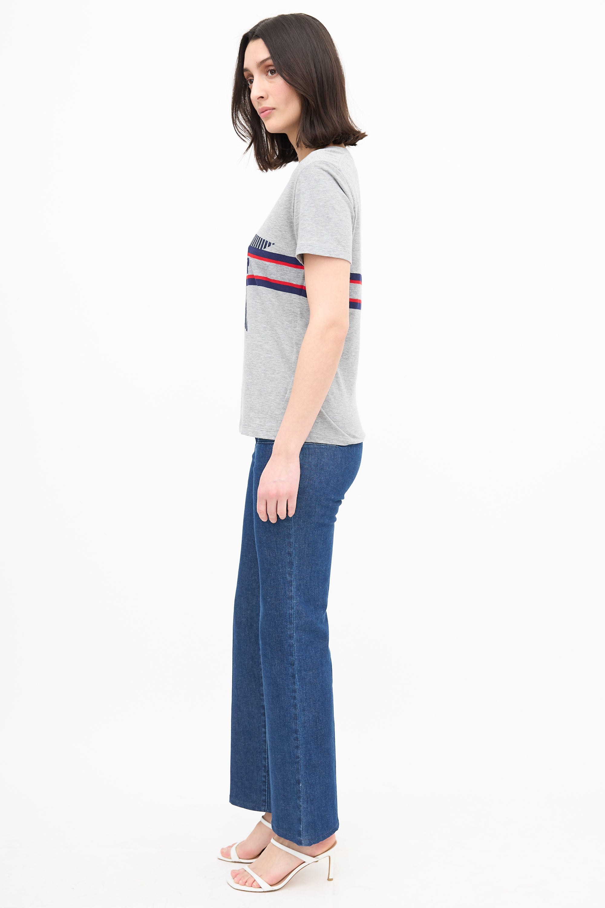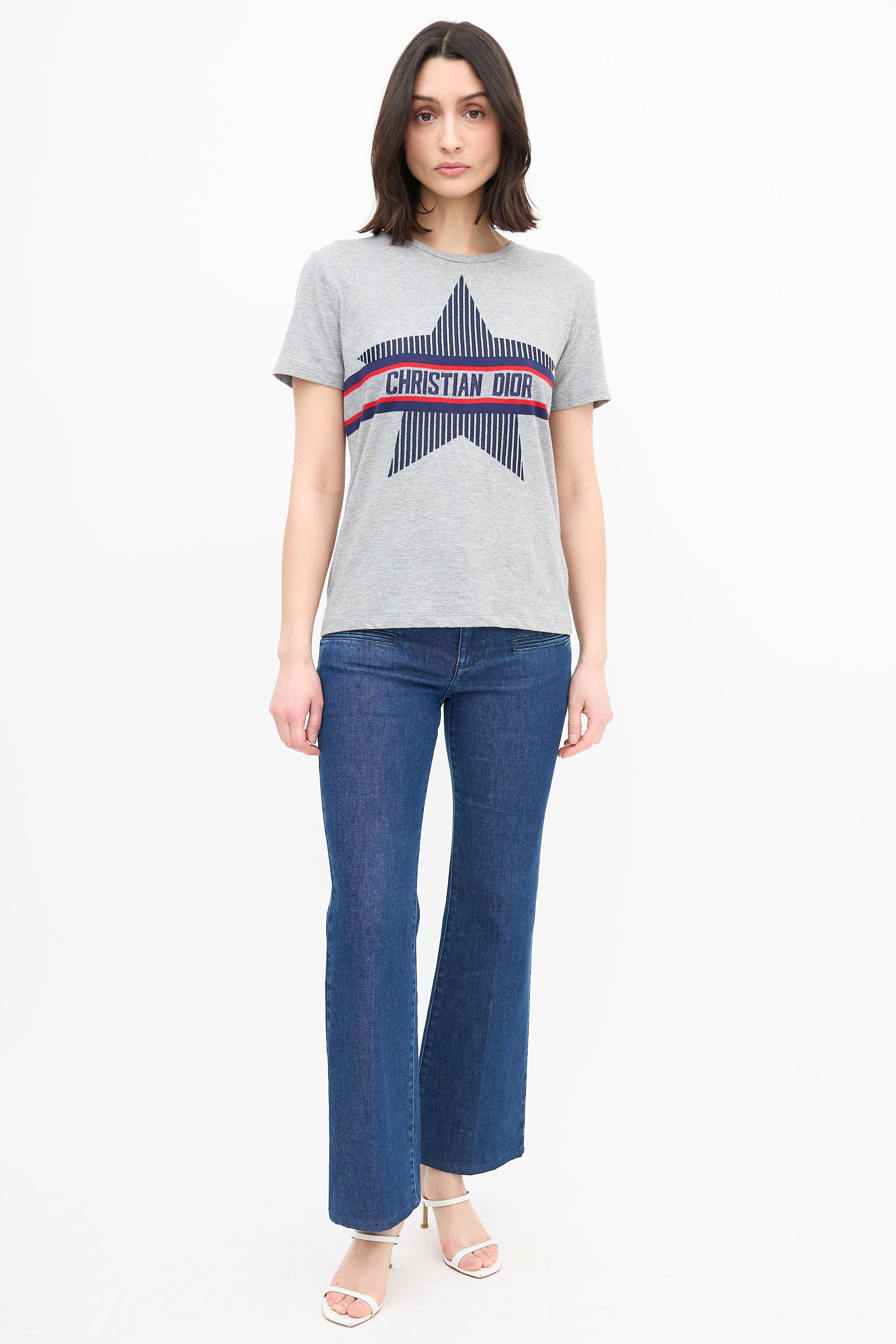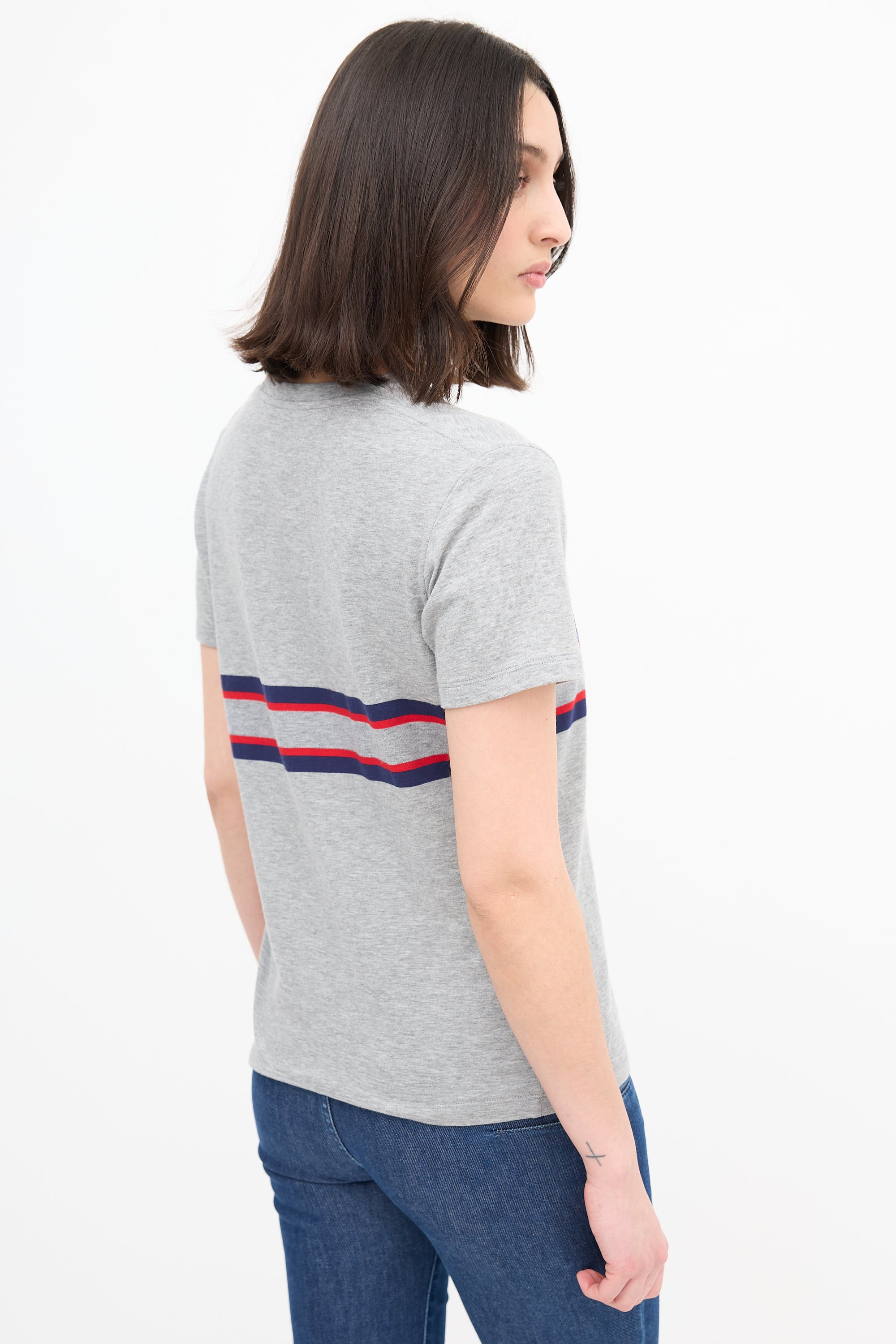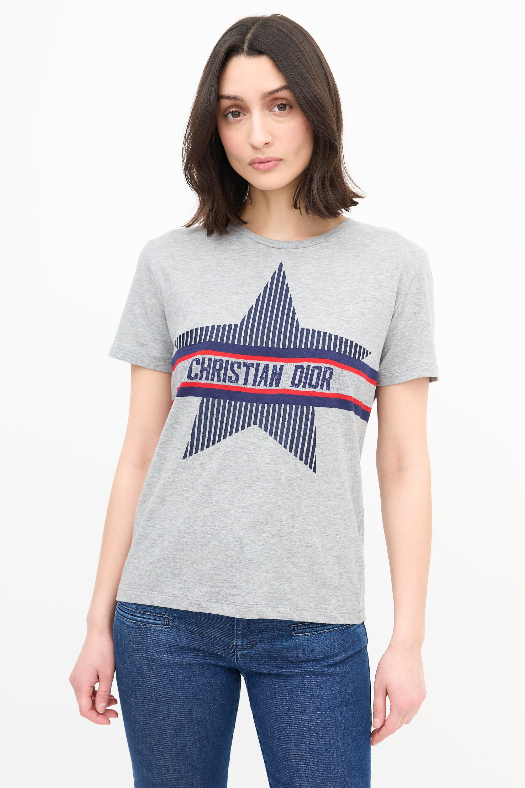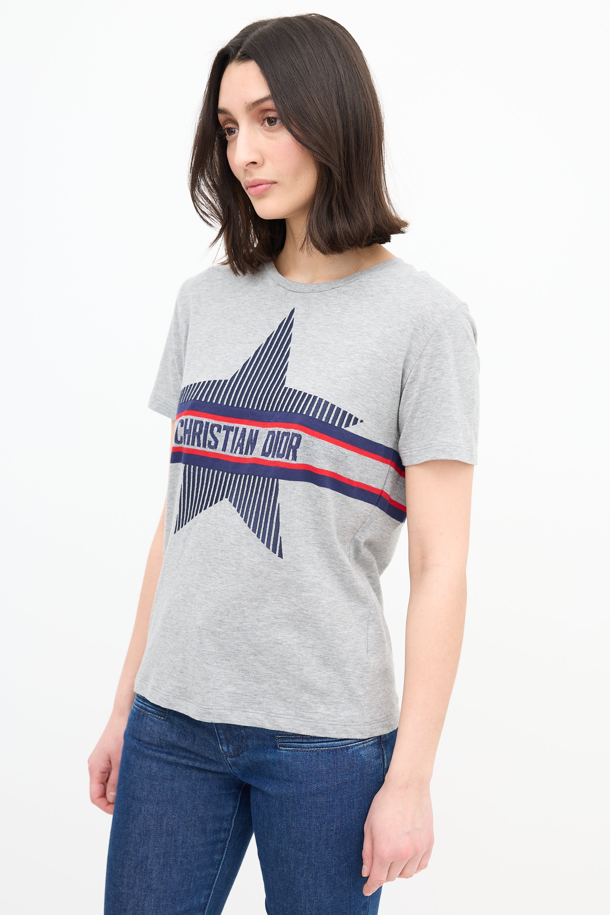 Pre-owned Dior heather grey DiorAlps T-shirt featuring round neckline, red and navy stripes at midsection, and front embroidered star motif logo.