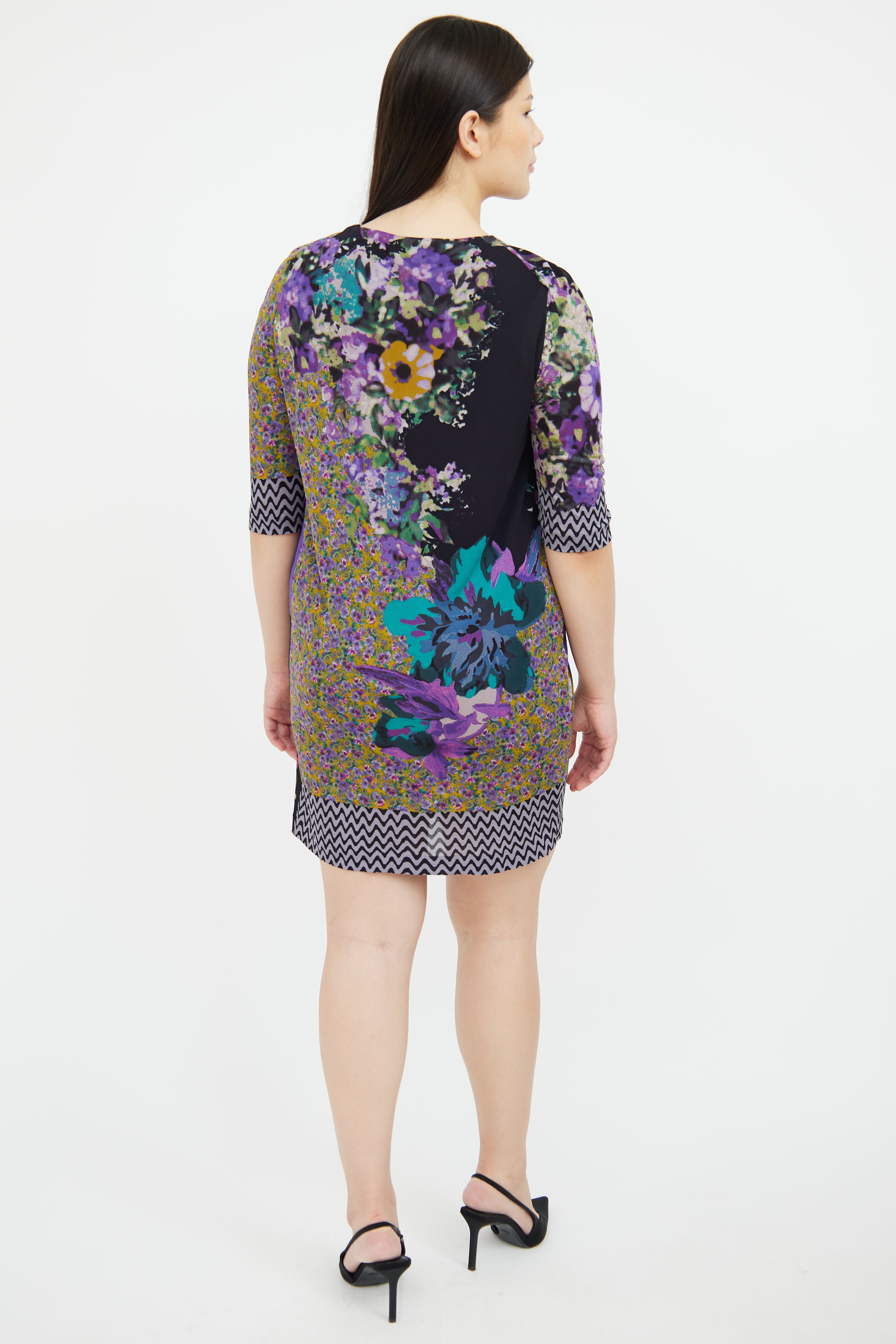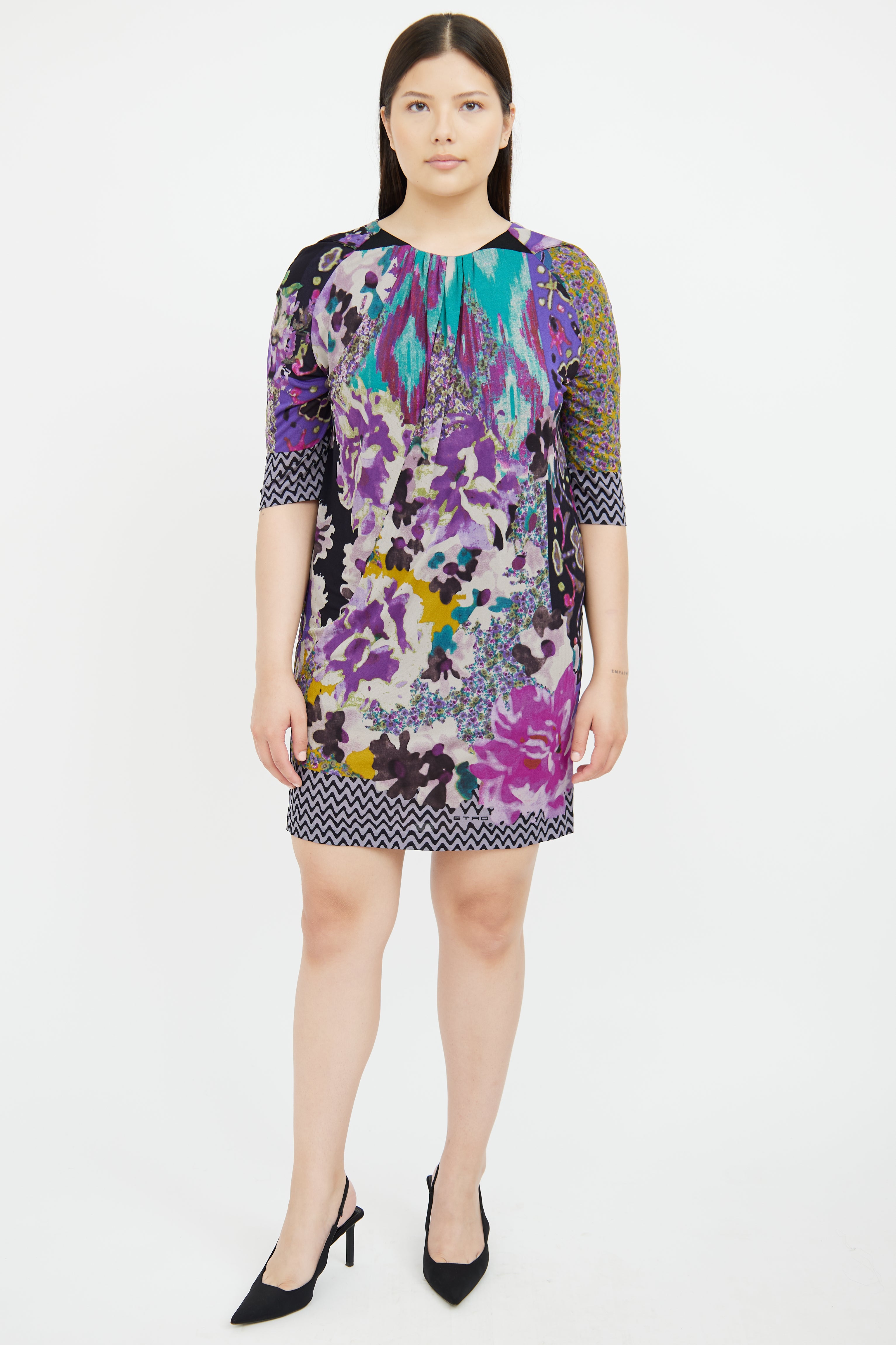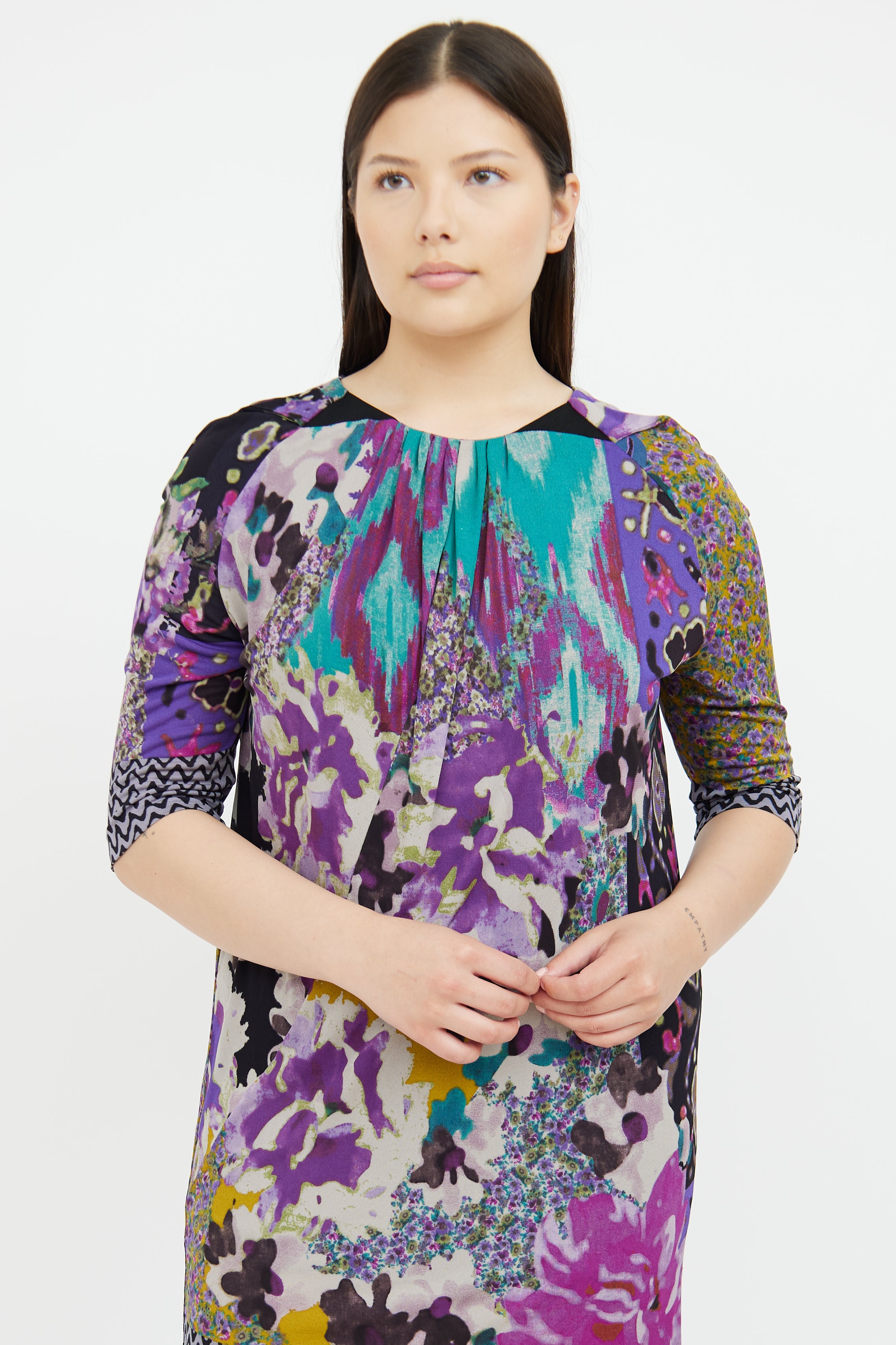 Pre-owned Etro purple and multi colour dress featuring round neckline, 3/4 length sleeves, gathering of fabric at chest and abstract print throughout. Fully lined.
