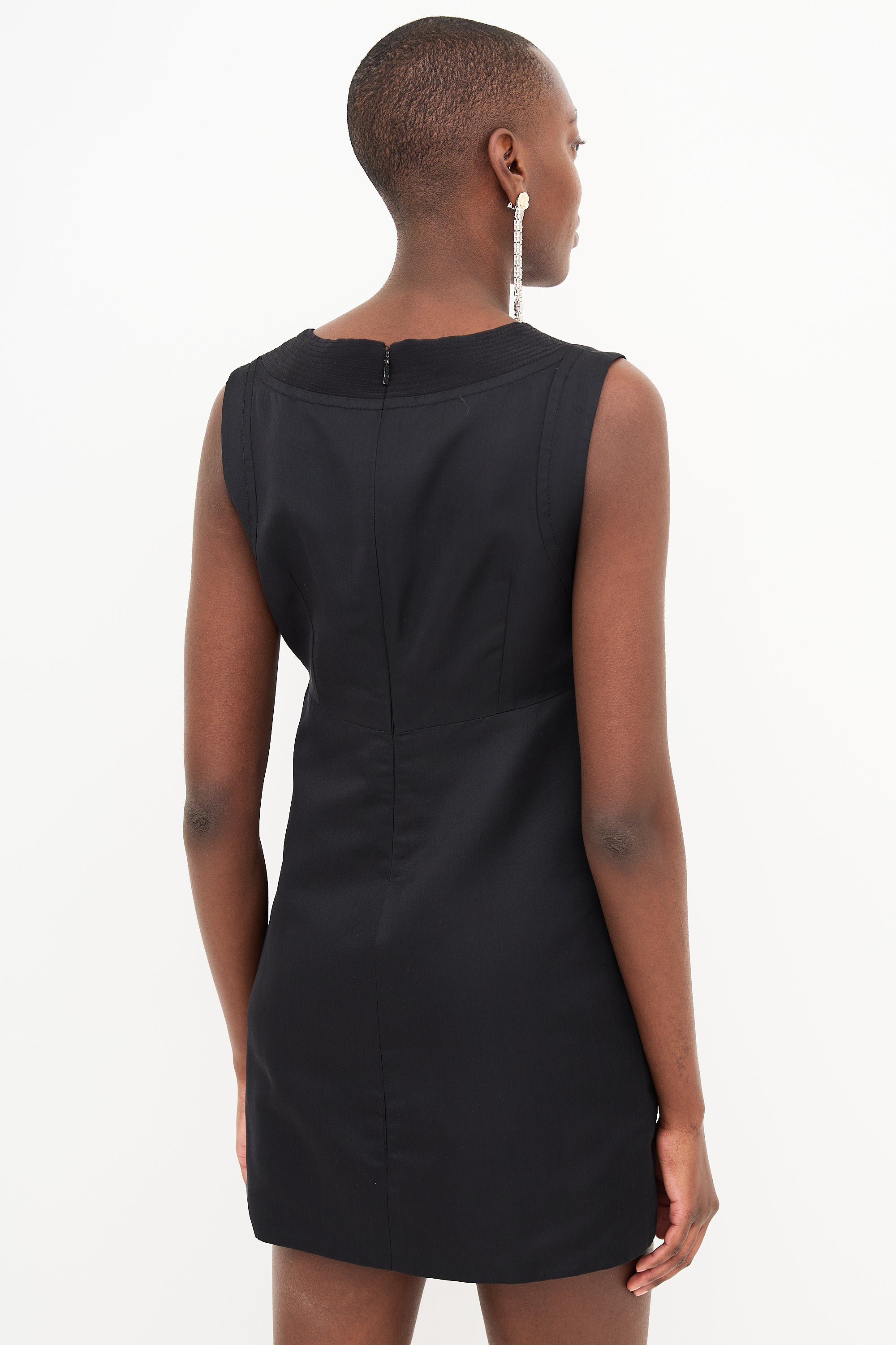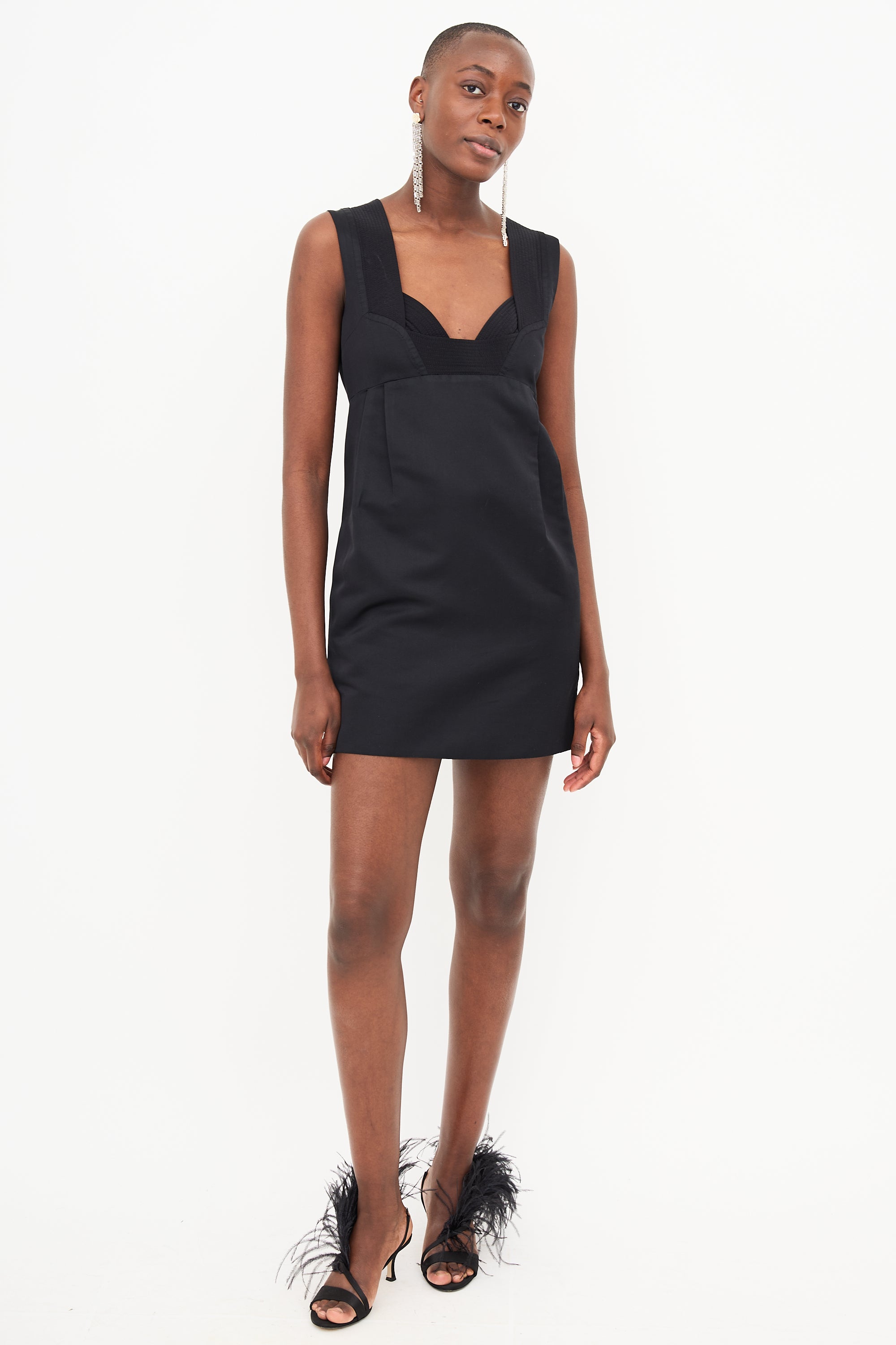 Pre-owned Gucci black silk satin dress featuring sweetheart neckline, top stitched collar panels, pleated waist, two slash pockets, and concealed back zip. Lined.