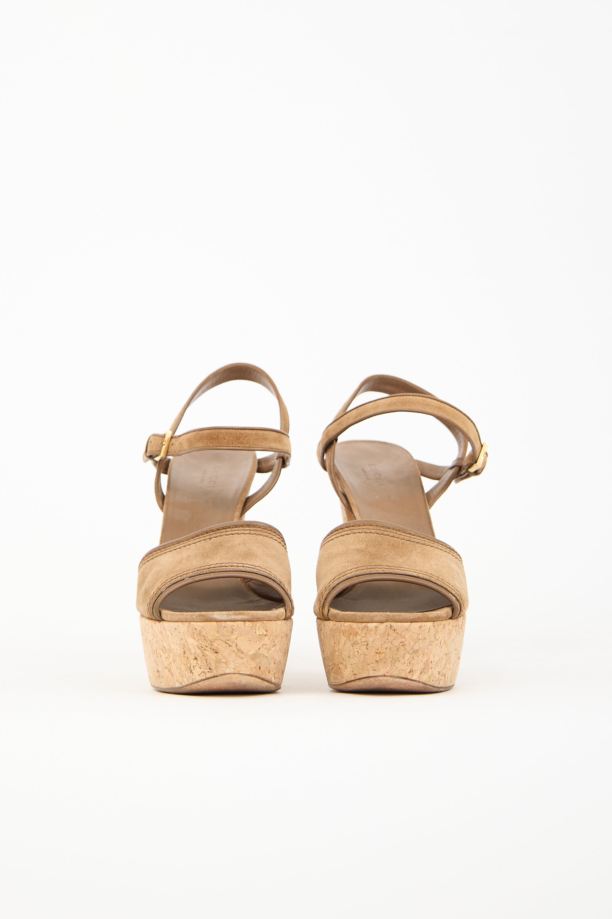 Pre-owned Gucci brown suede heels featuring open rounded toe, strap across vamp, ankle strap with buckle fastening, and cork platform and block heel.