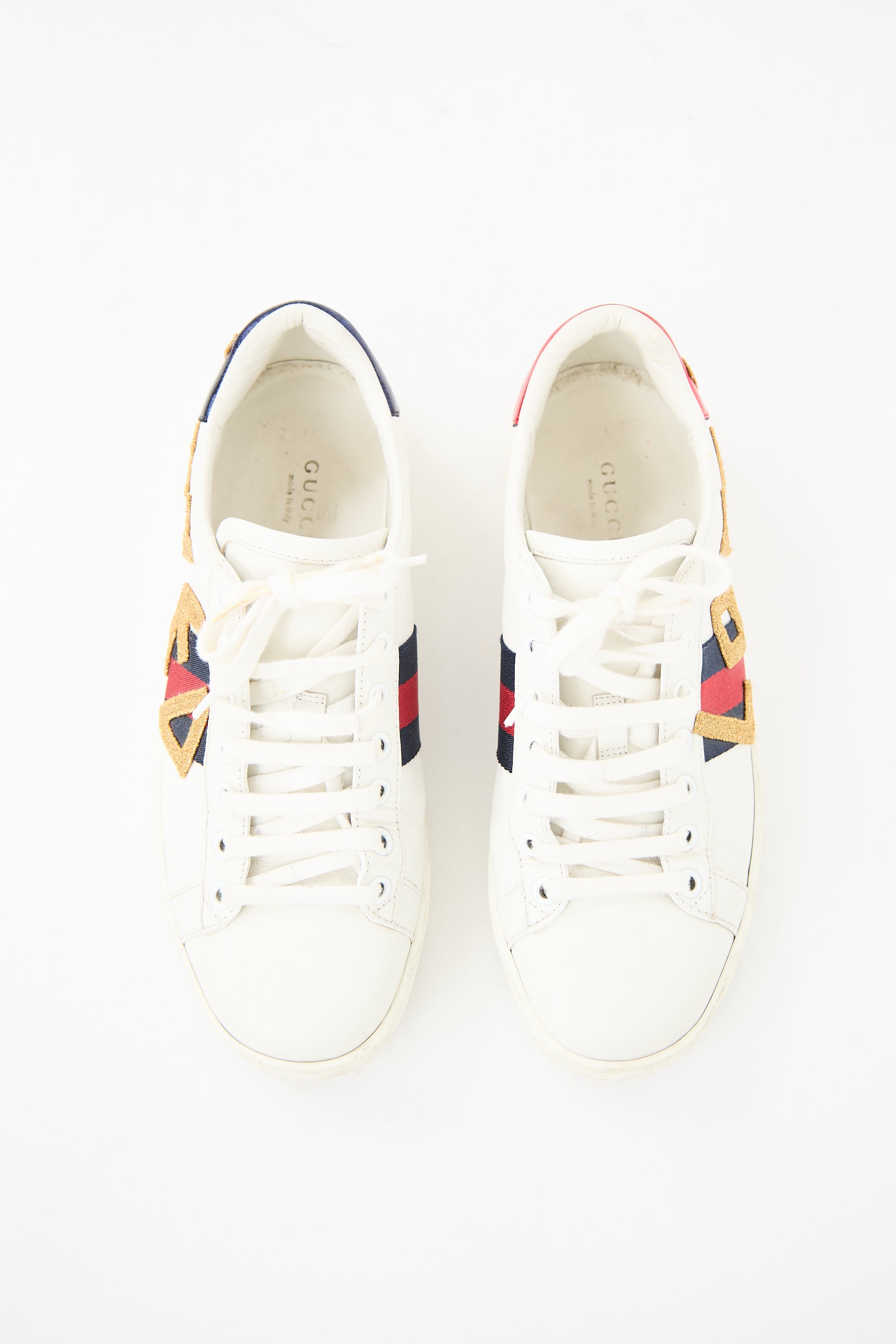 Pre-owned Gucci white leather Ace Loved sneakers featuring a rounded toe, embroidered 'Loved' applique at sides overlaying the navy and red web panels, metallic red and blue heel counters, and Hysteria crest debossed at rubber outsole.