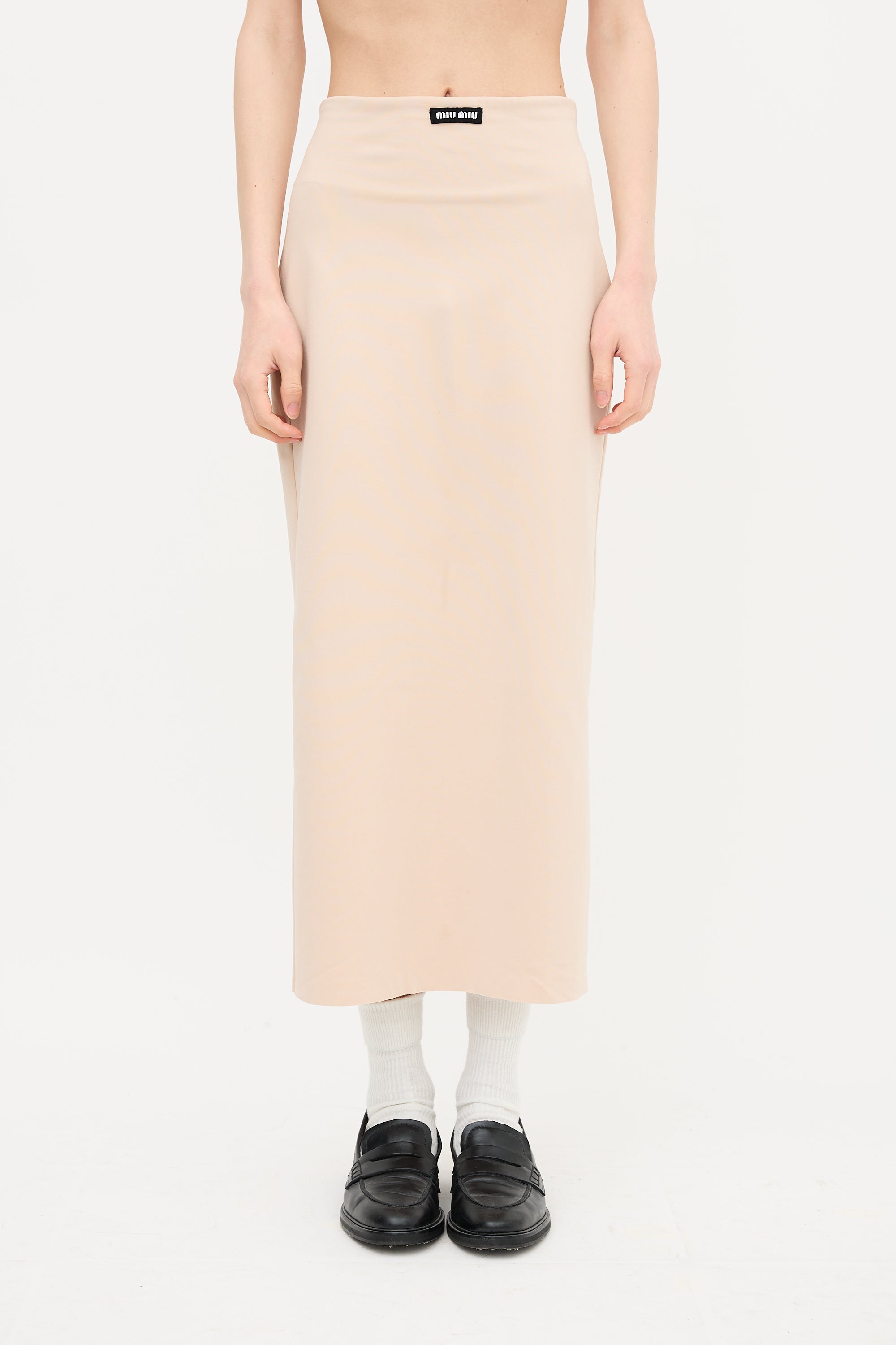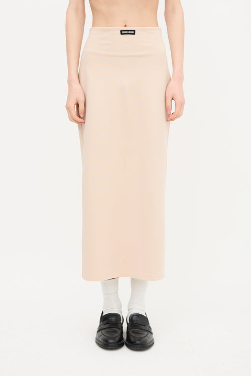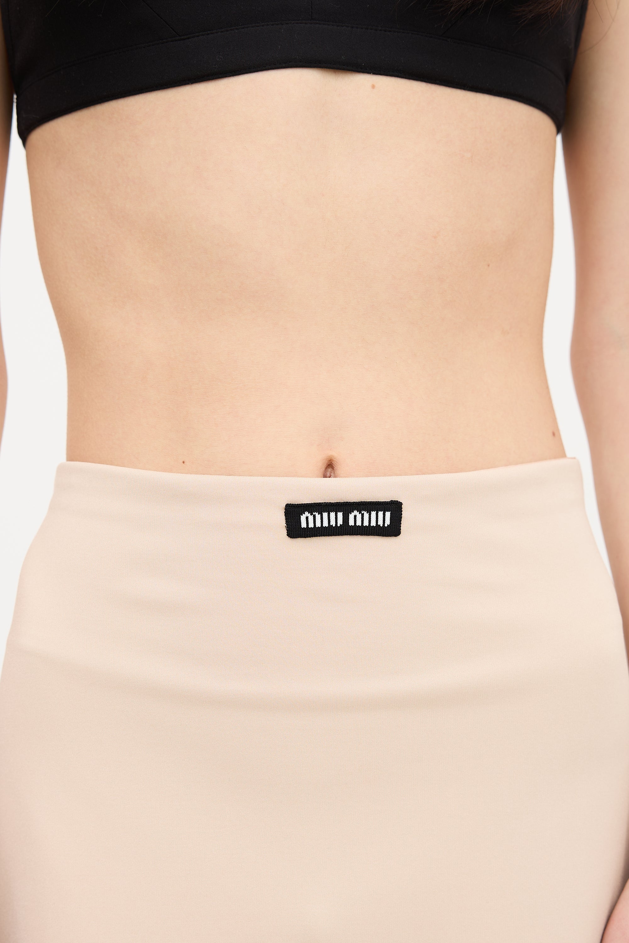 Pre-owned Miu Miu 2022 pink nylon blend midi skirt featuring high waist, front intarsia logo tab, and concealed side zip.