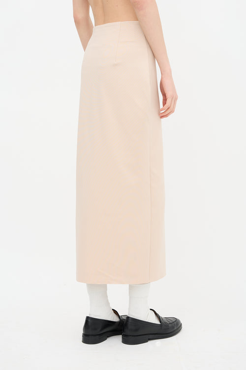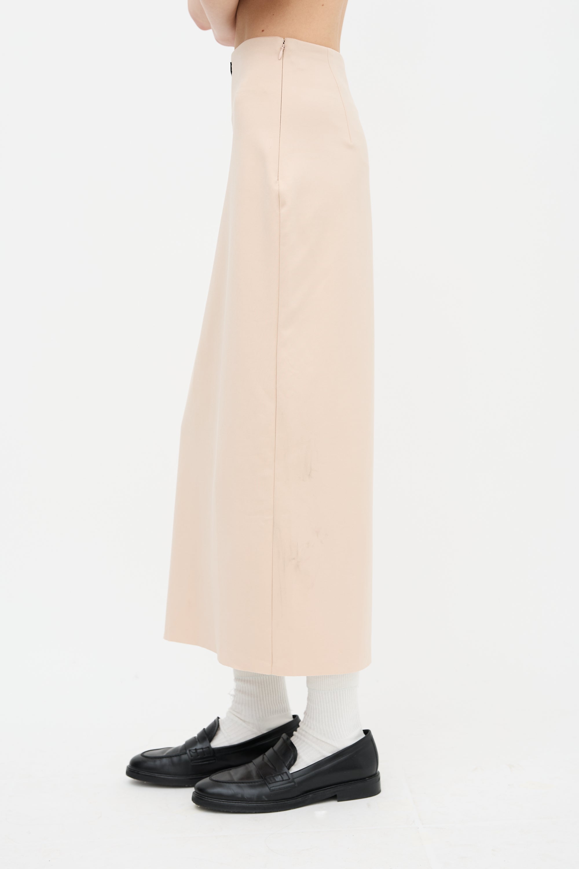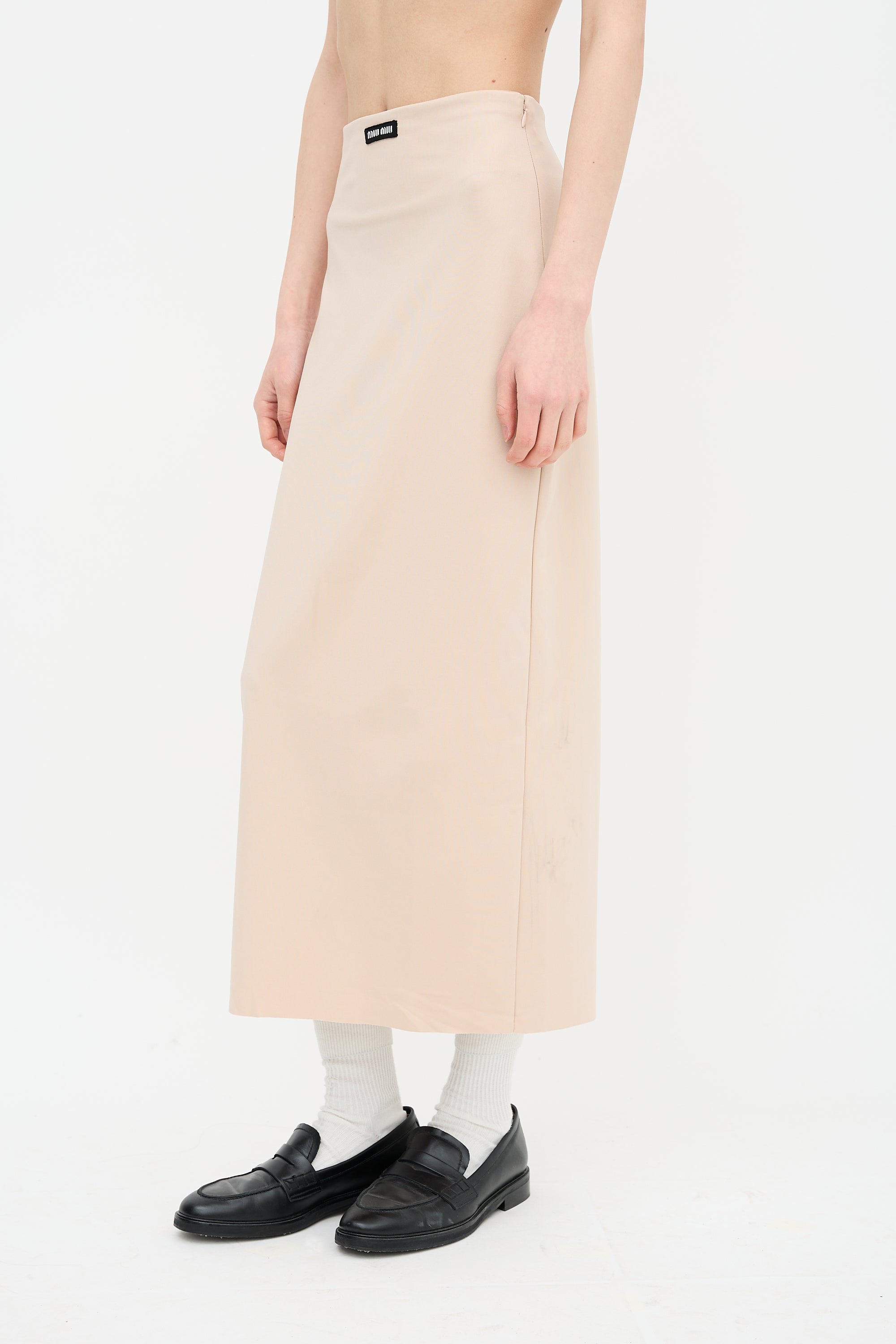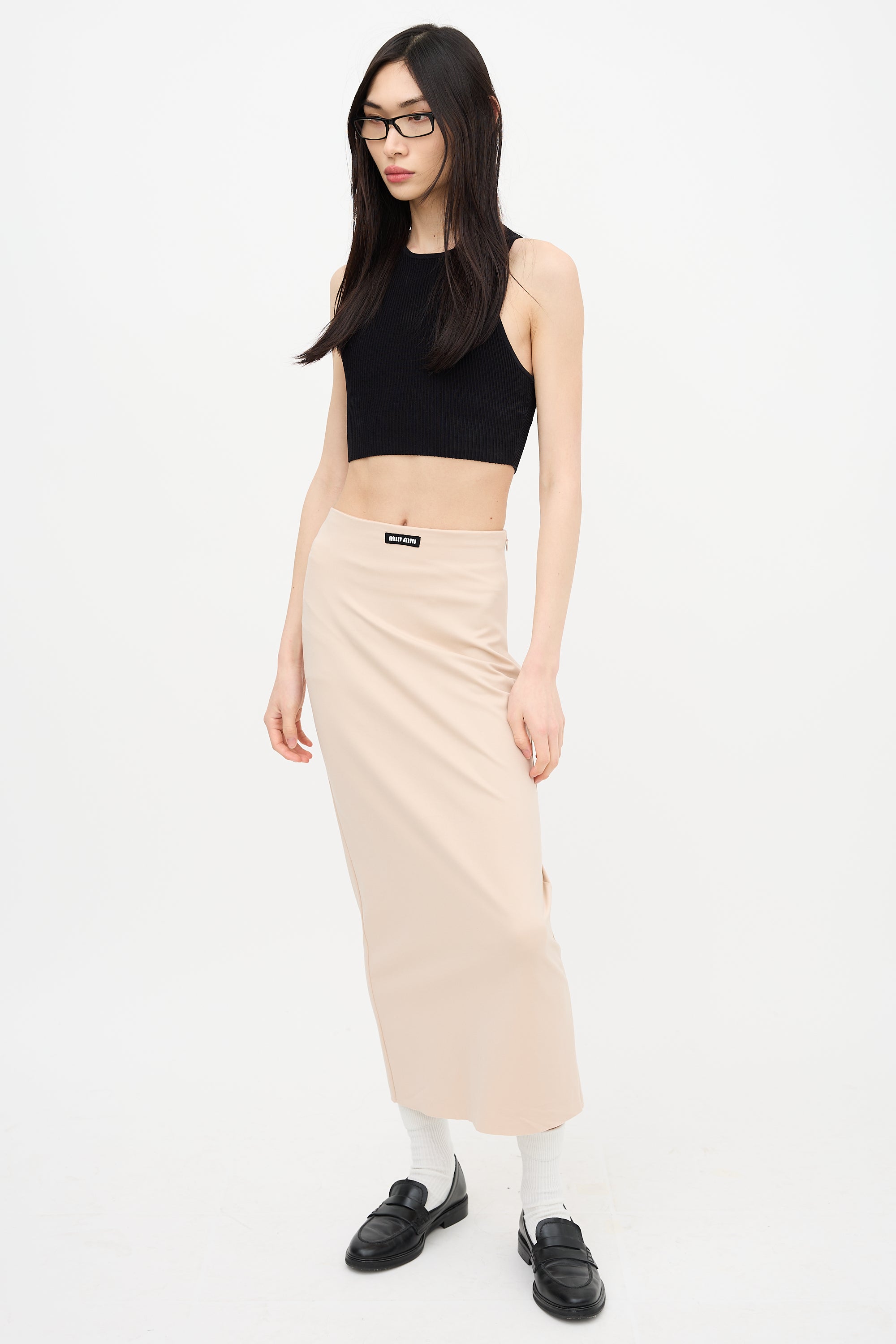 Pre-owned Miu Miu 2022 pink nylon blend midi skirt featuring high waist, front intarsia logo tab, and concealed side zip.