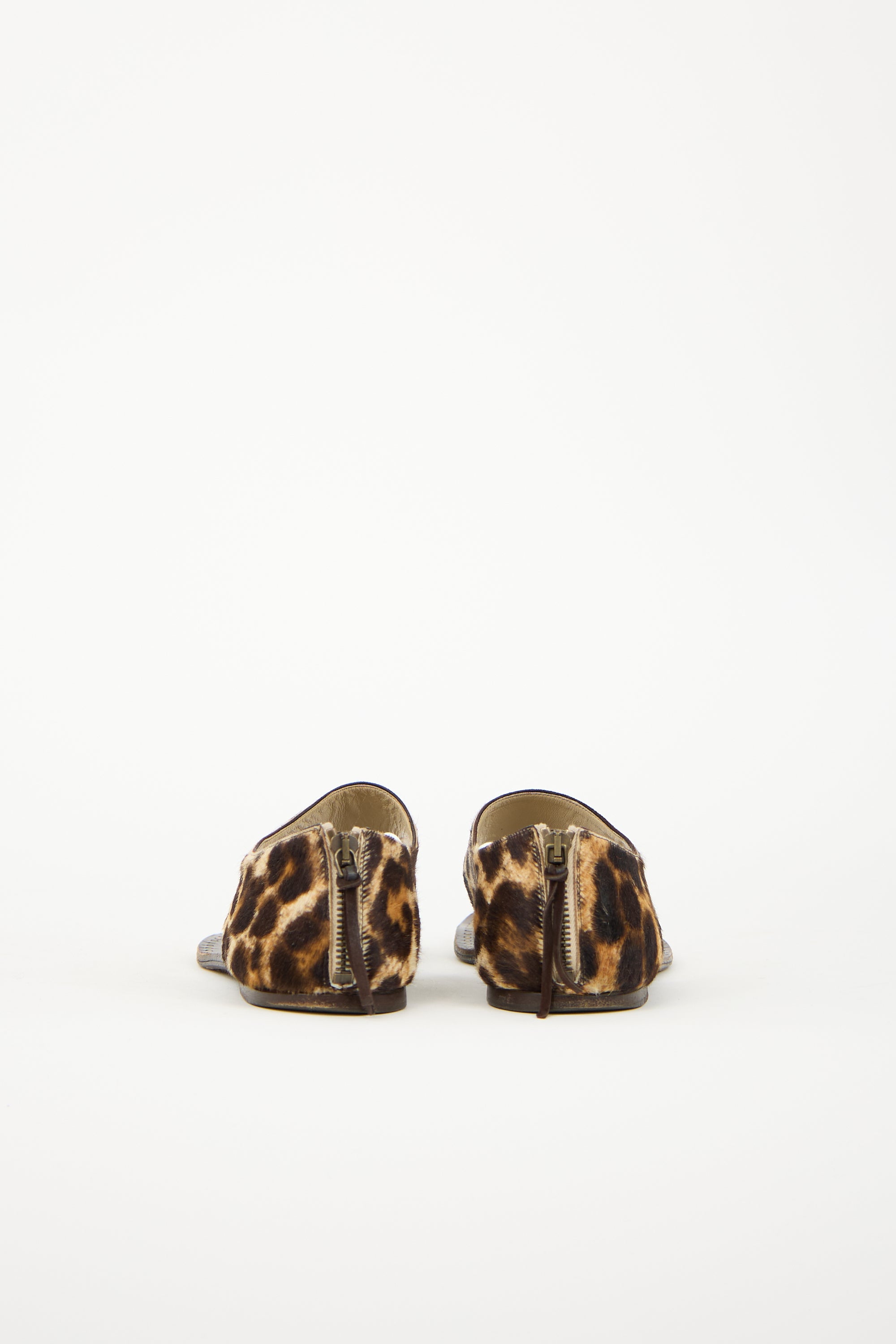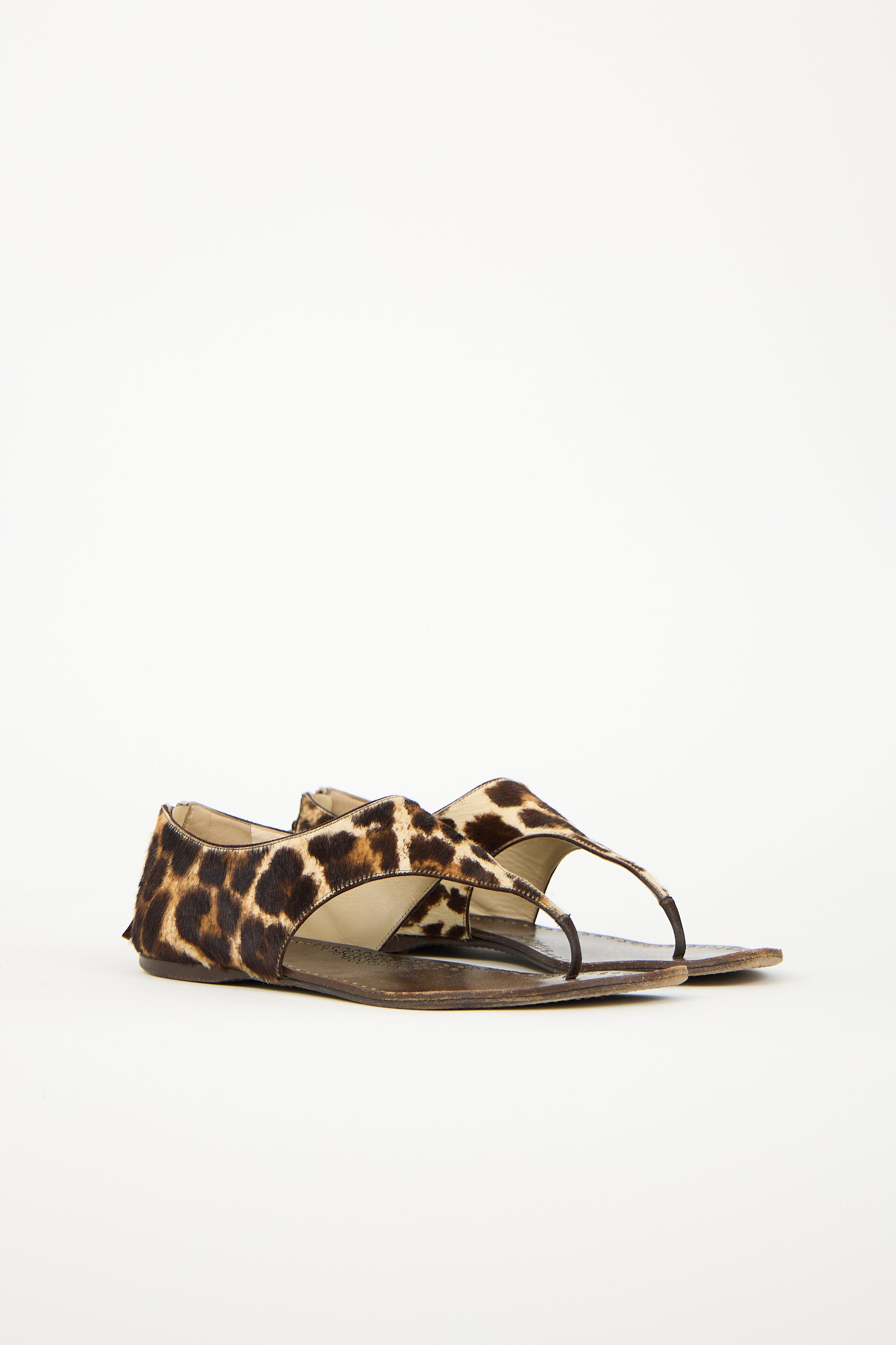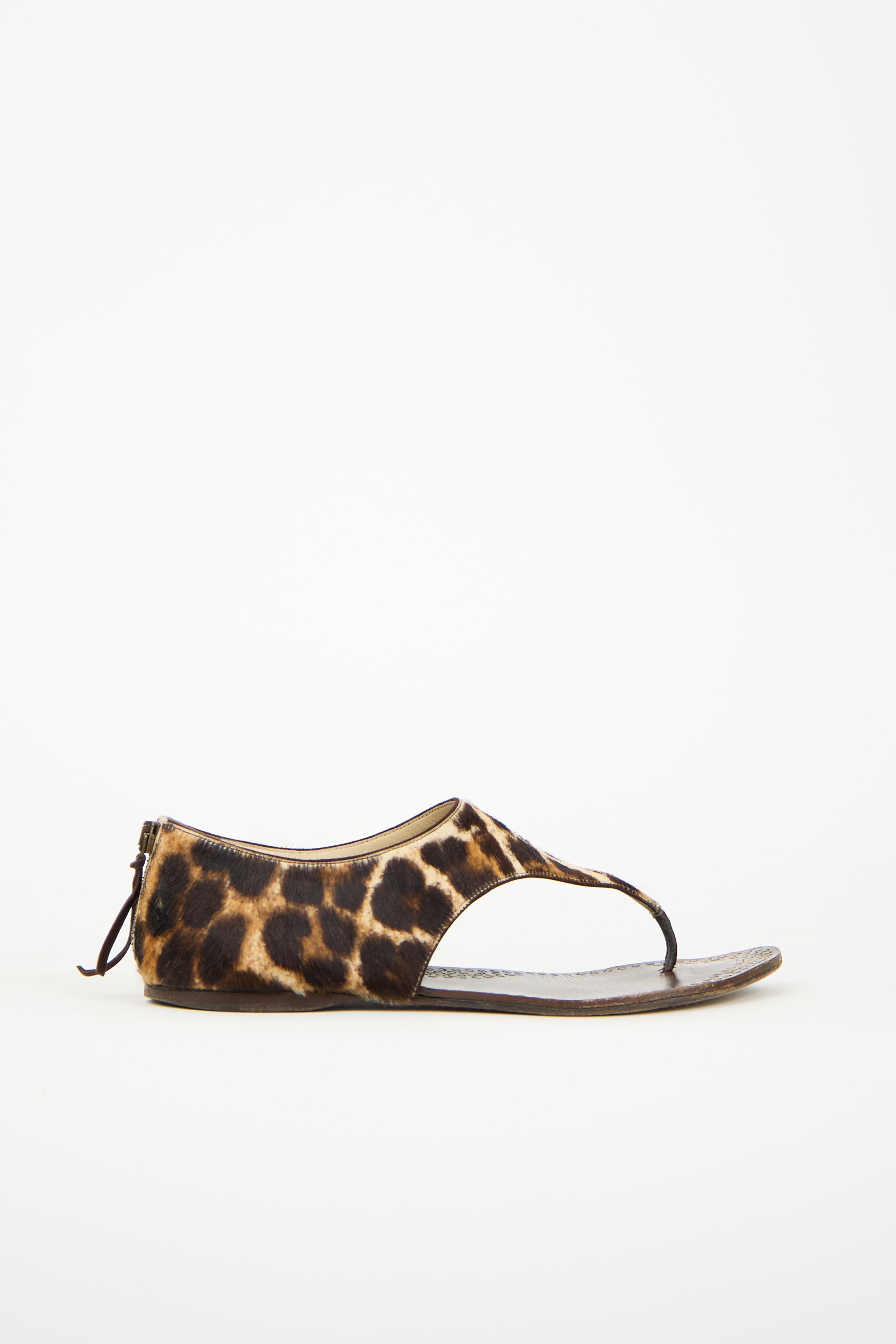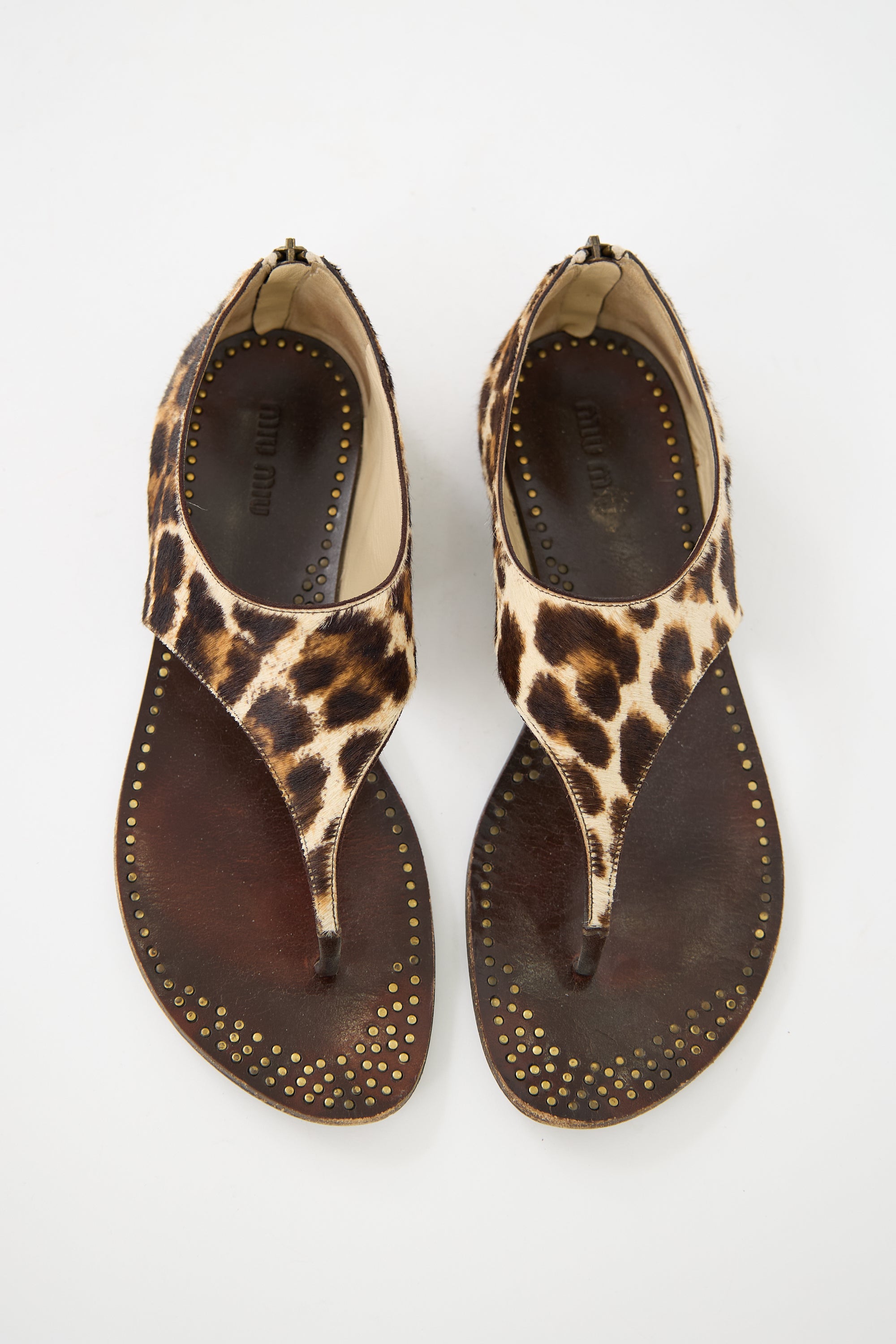 Pre-owned Miu Miu brown leather sandals featuring a rounded toe with gold tone studs at insole, leopard printed pony hair uppers and T-strap, and a back zip closure.