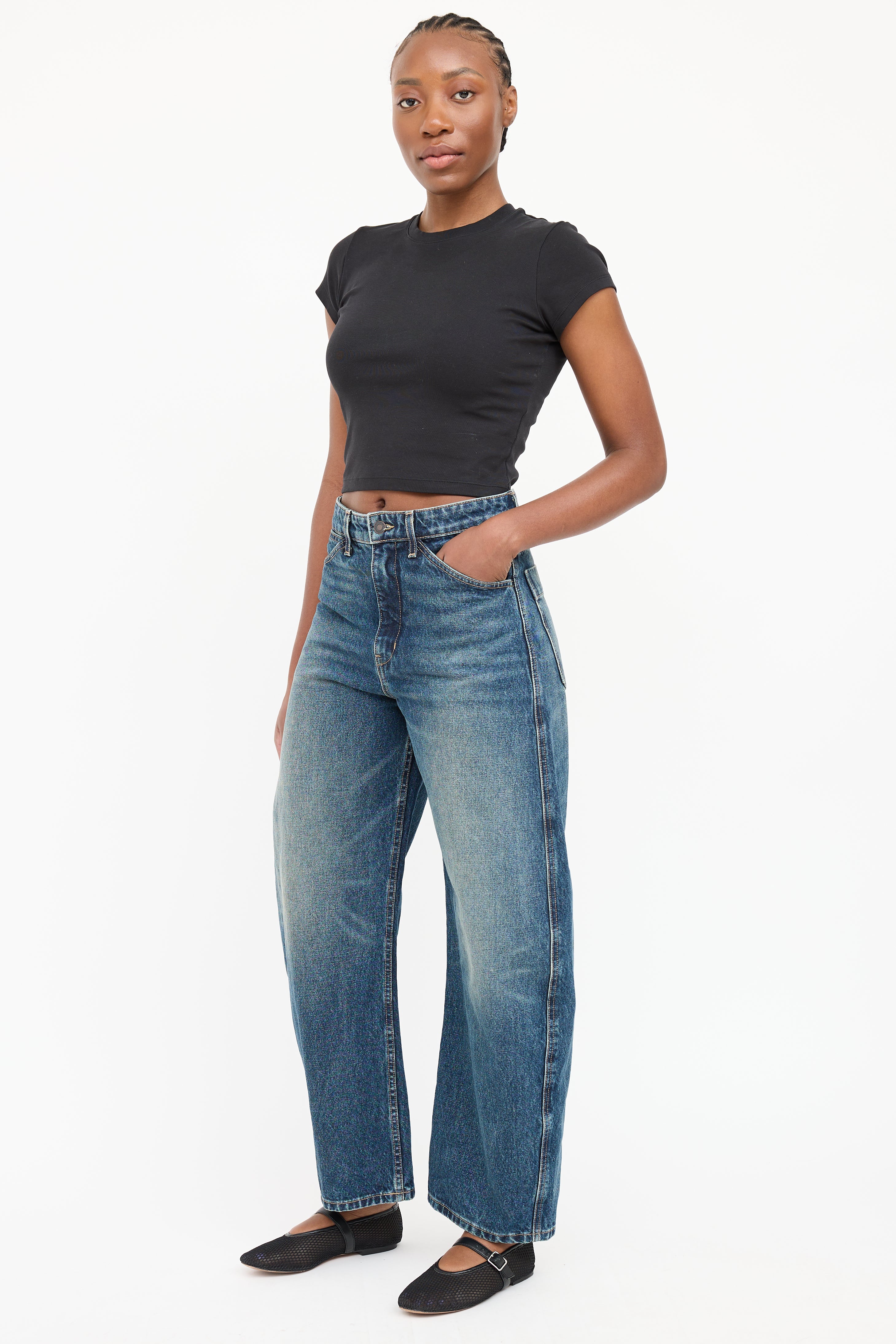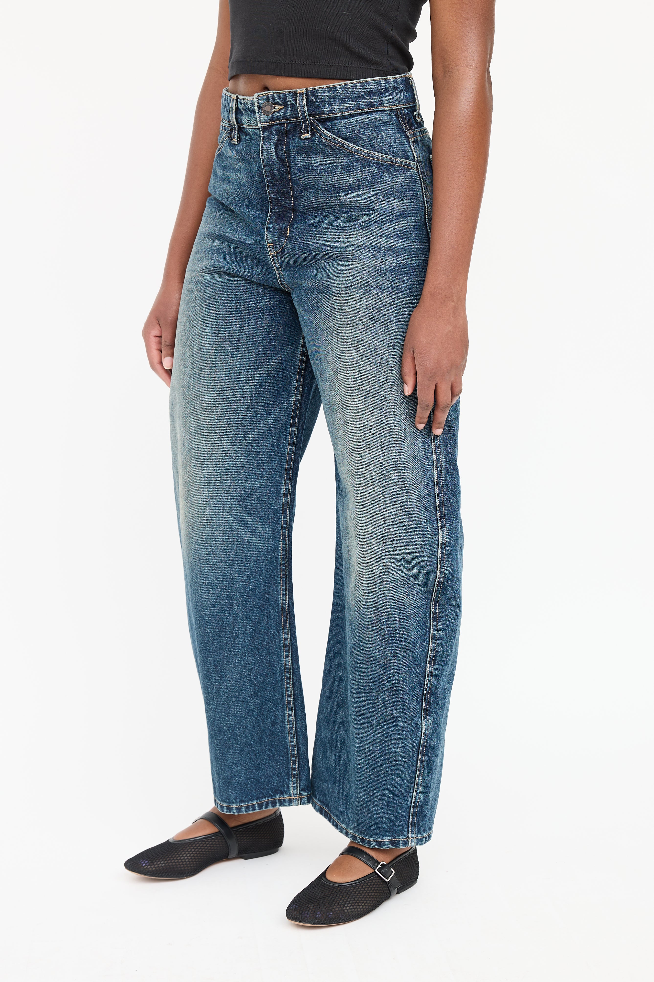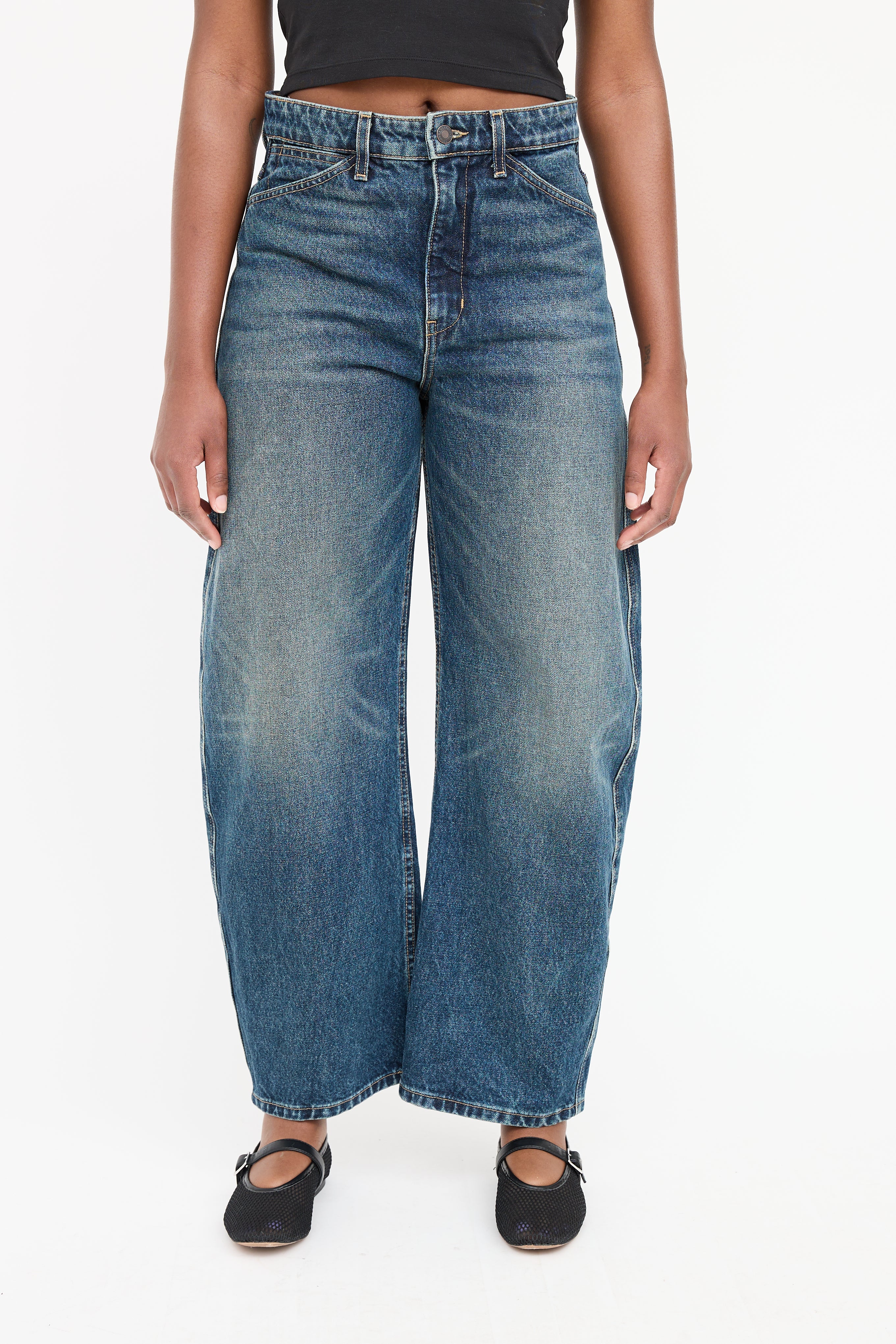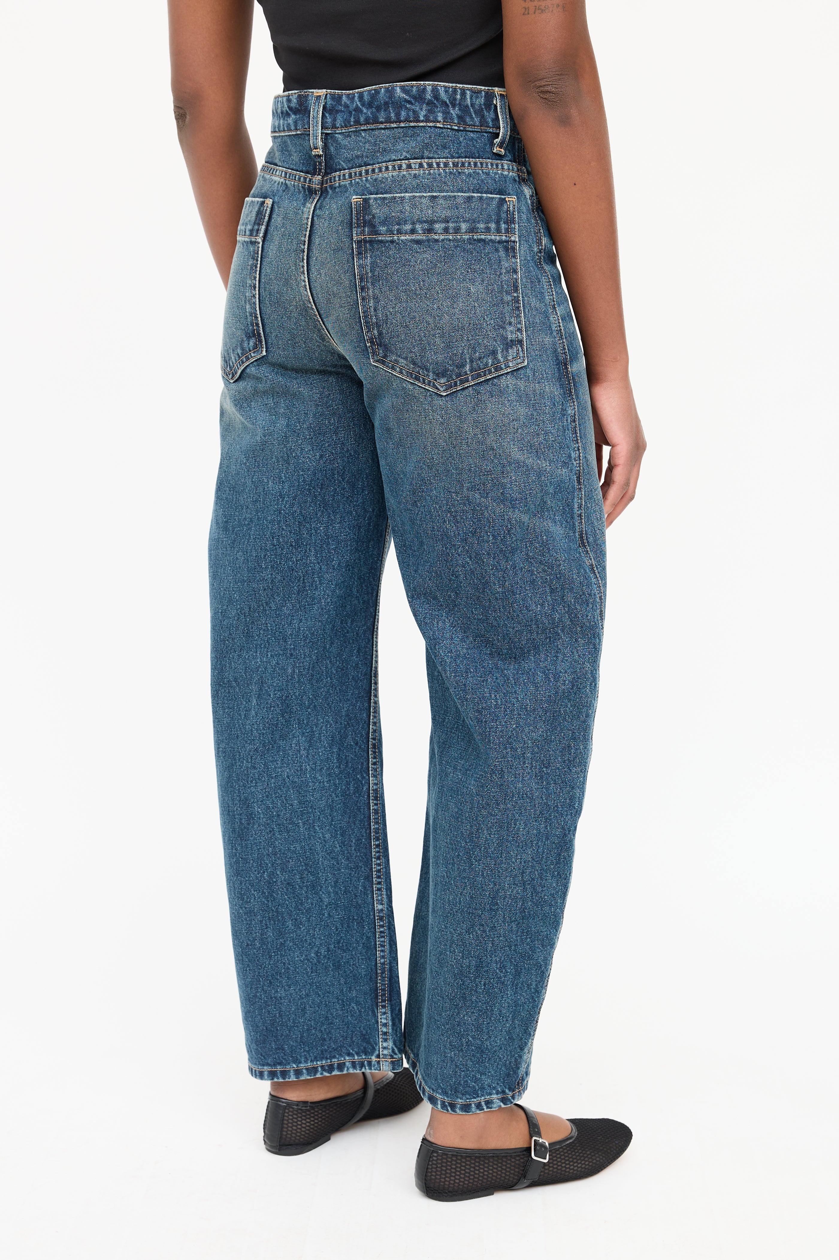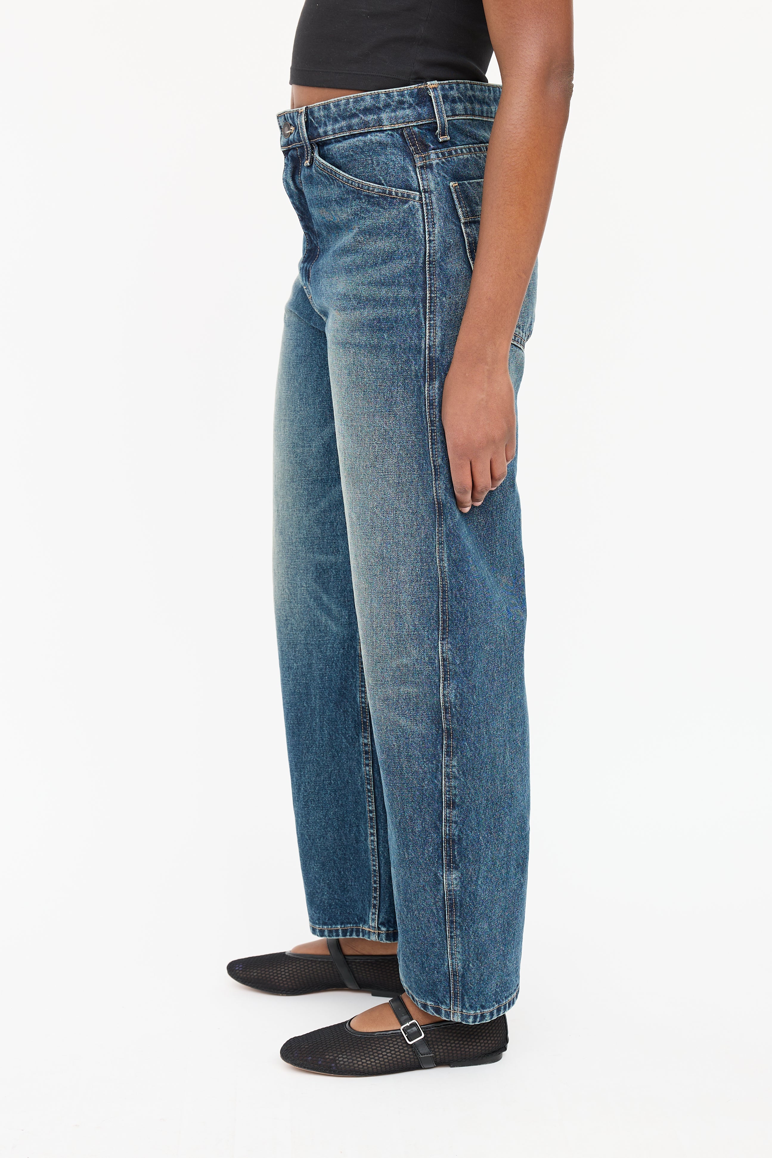 Pre-owned Nili Lotan dark wash Otis jeans featuring five pocket styling, barrel leg, and zip leg with button closure.