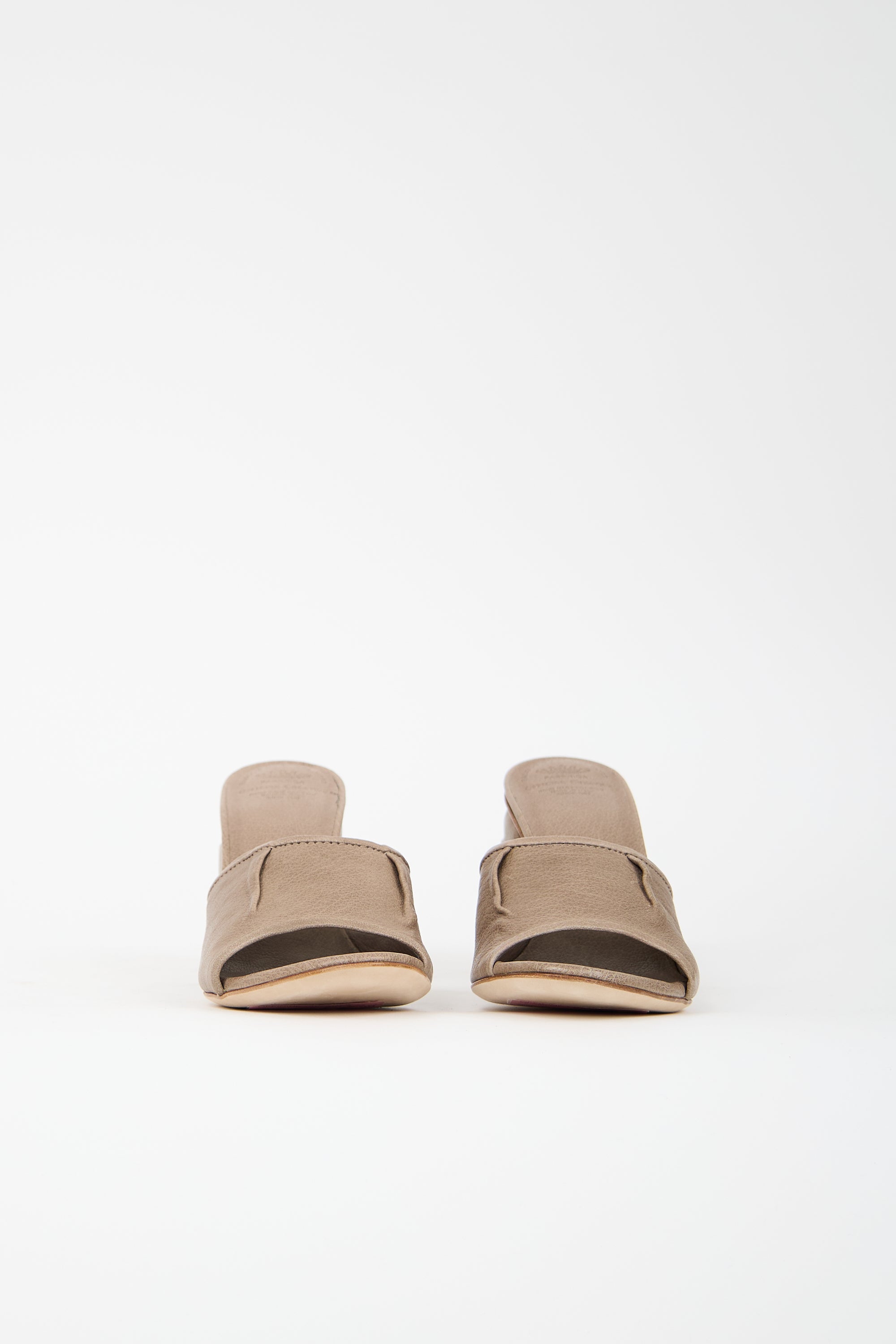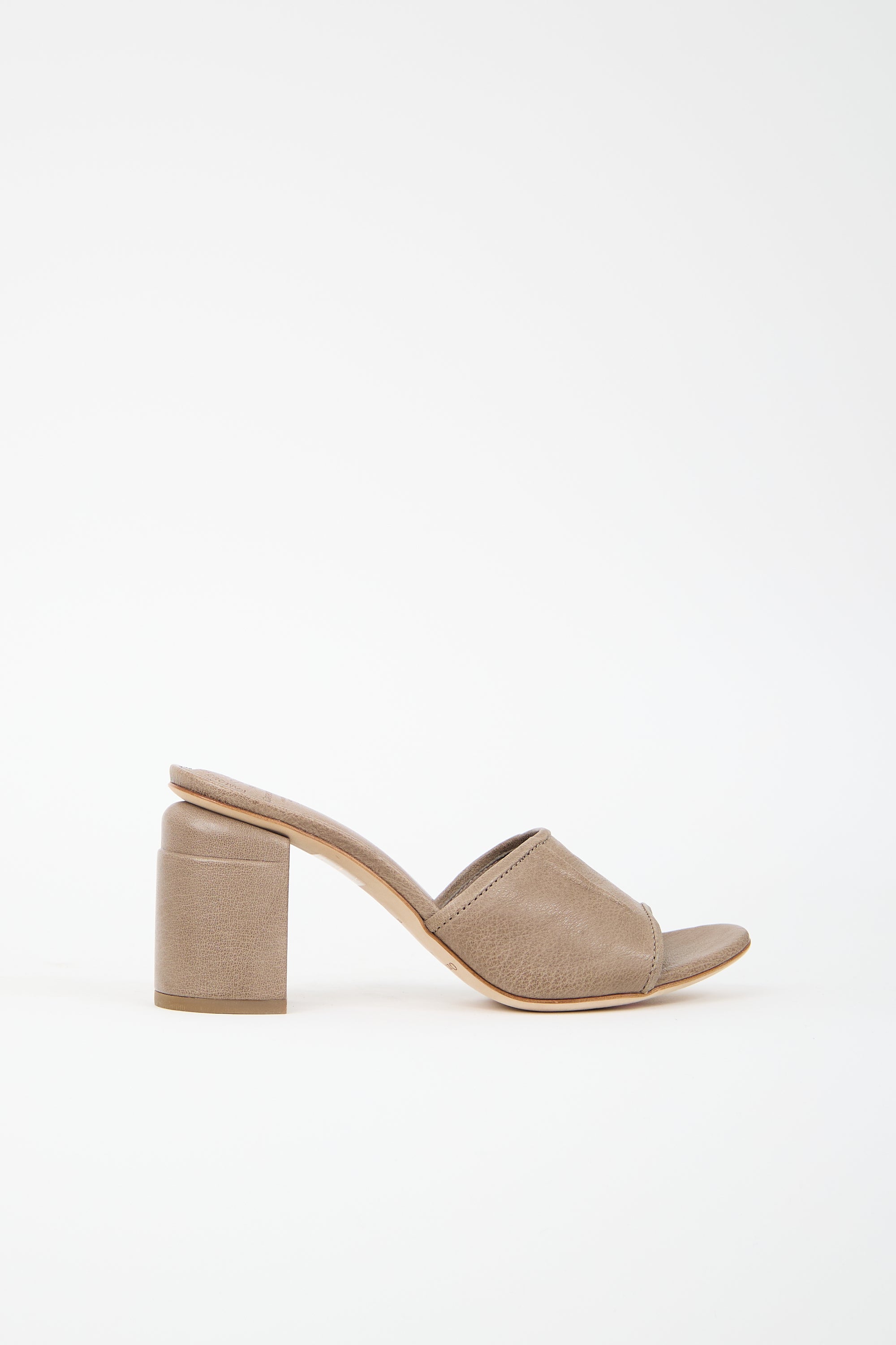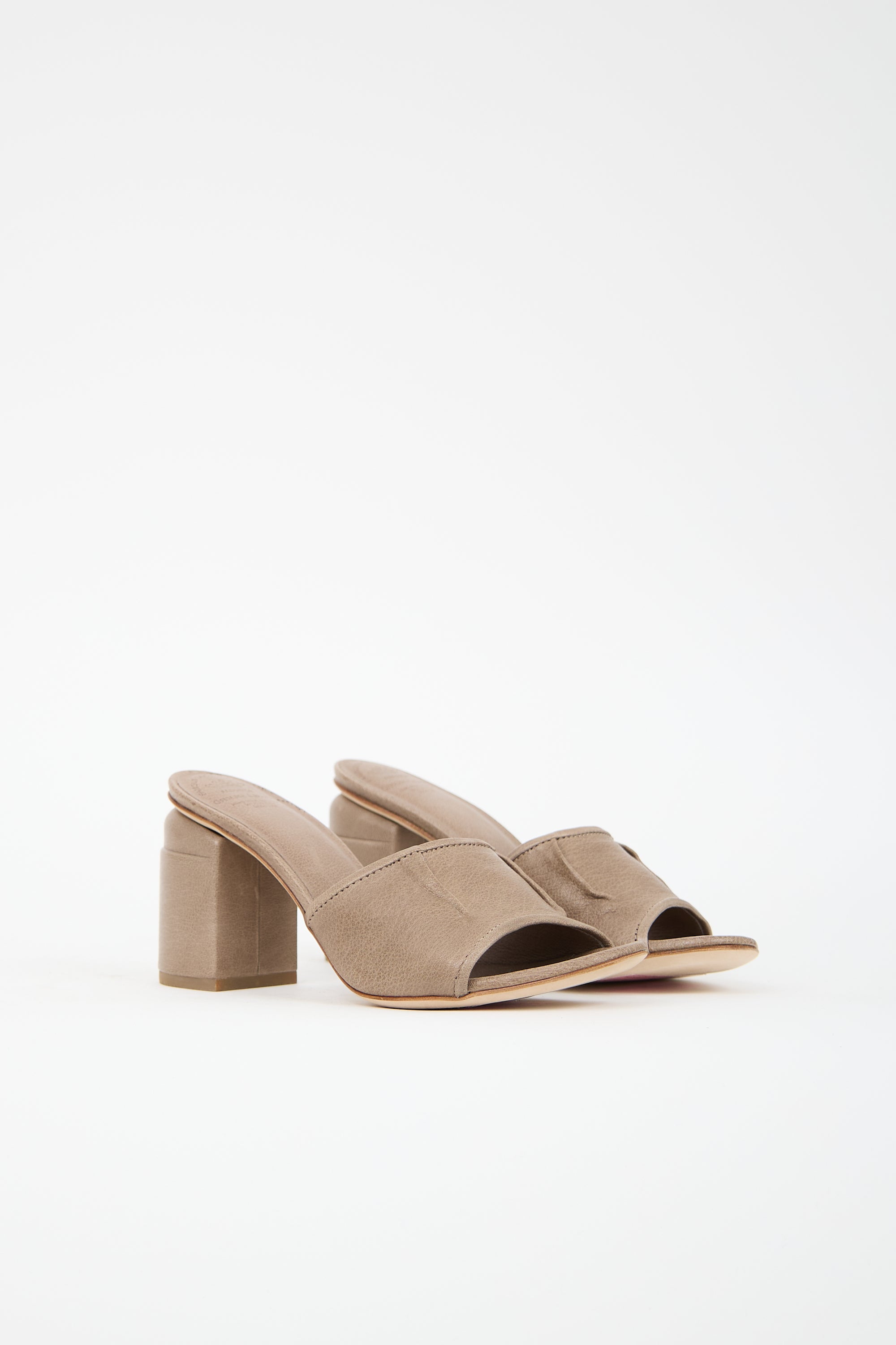 Pre-owned Officine Creative taupe leather mules featuring open rounded toe, ruched vamp strap, and covered block heel. Comes with original dust bag and box.