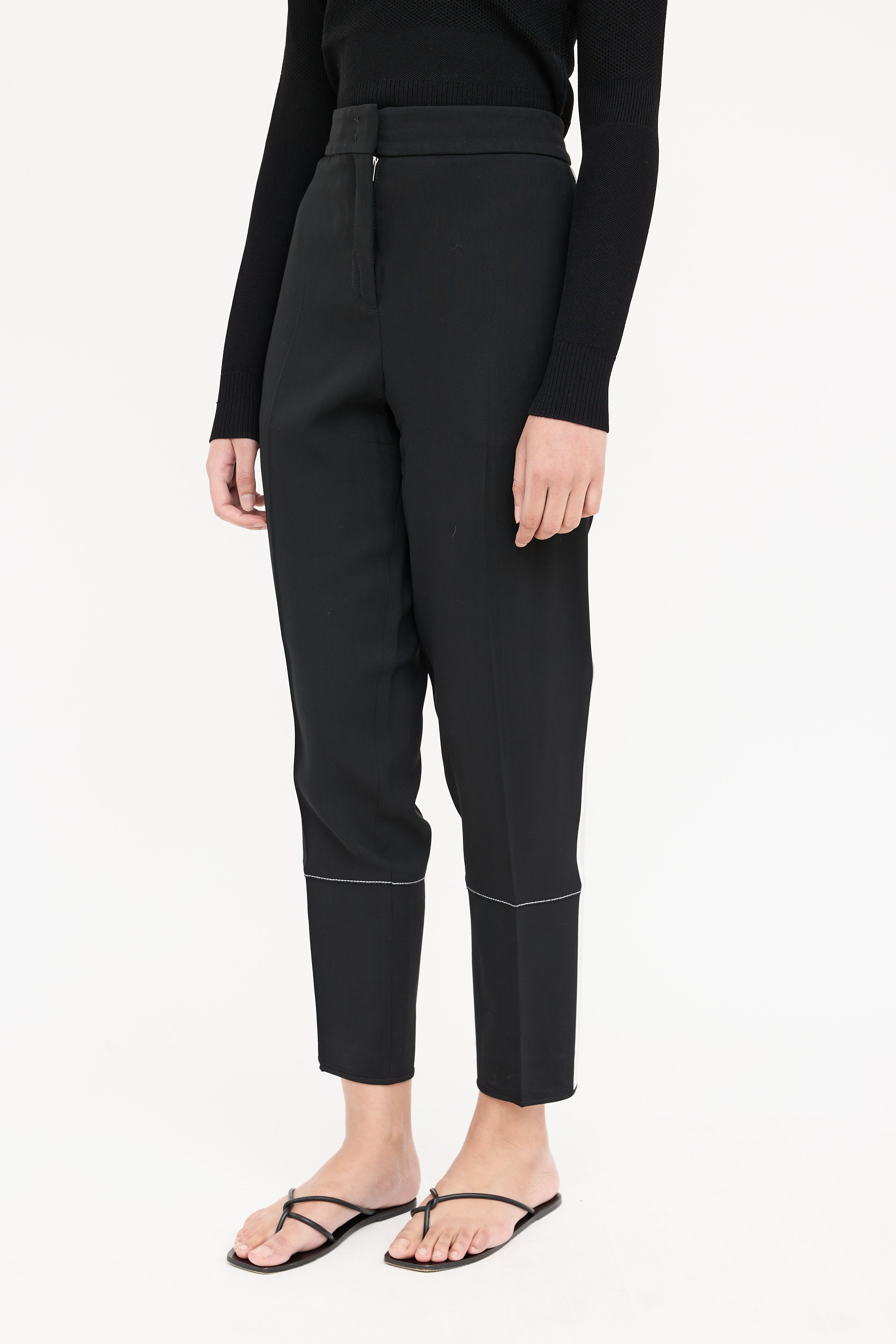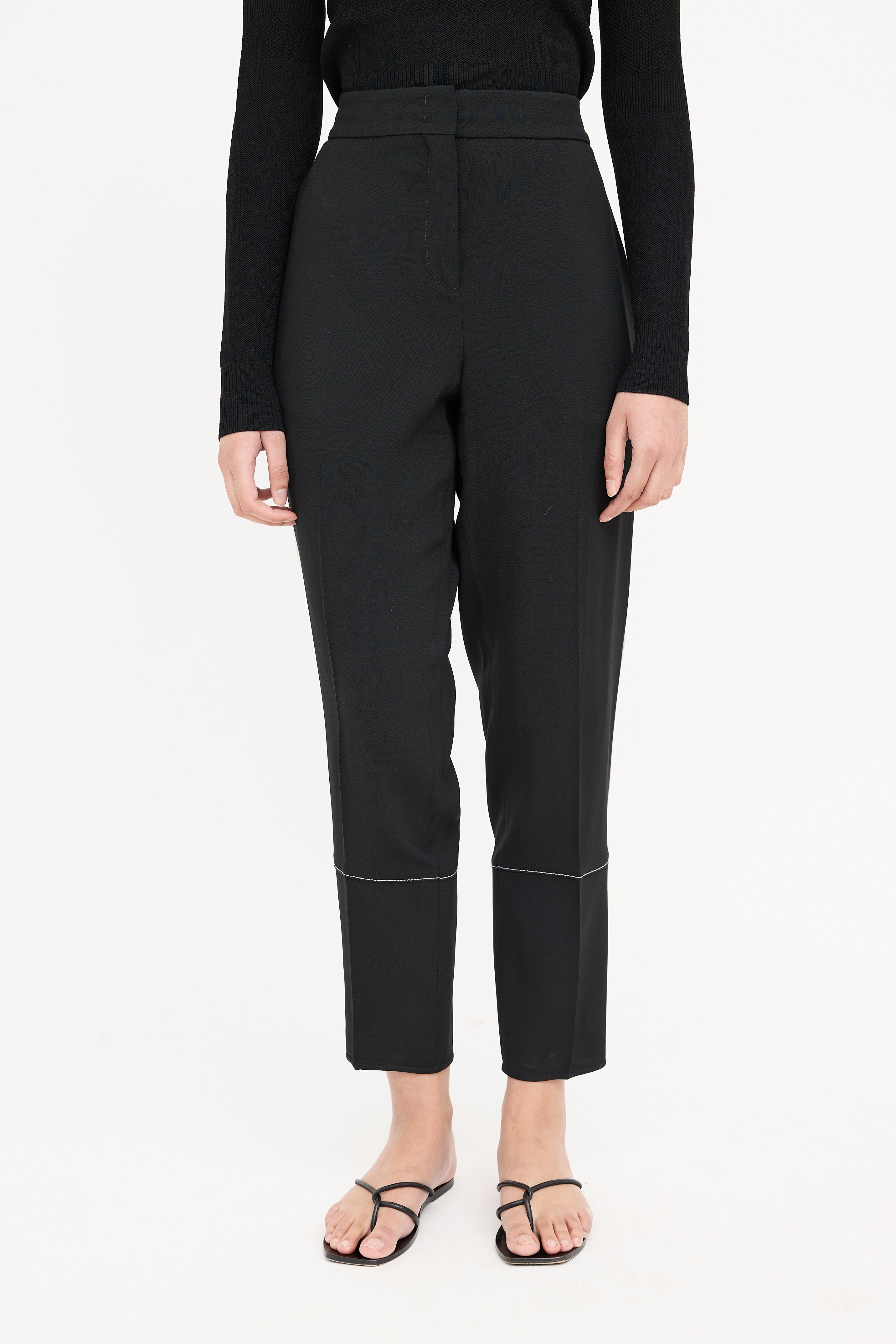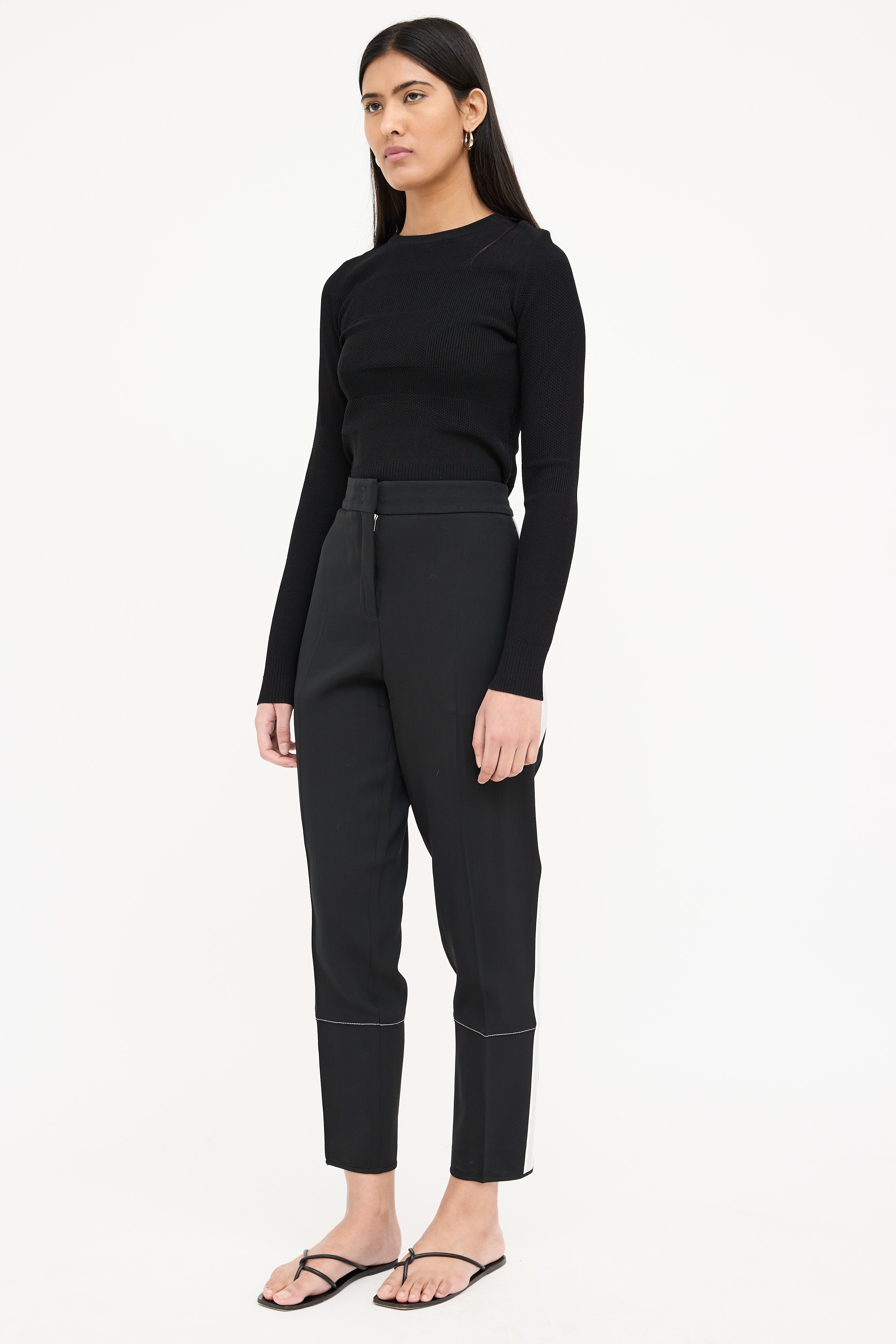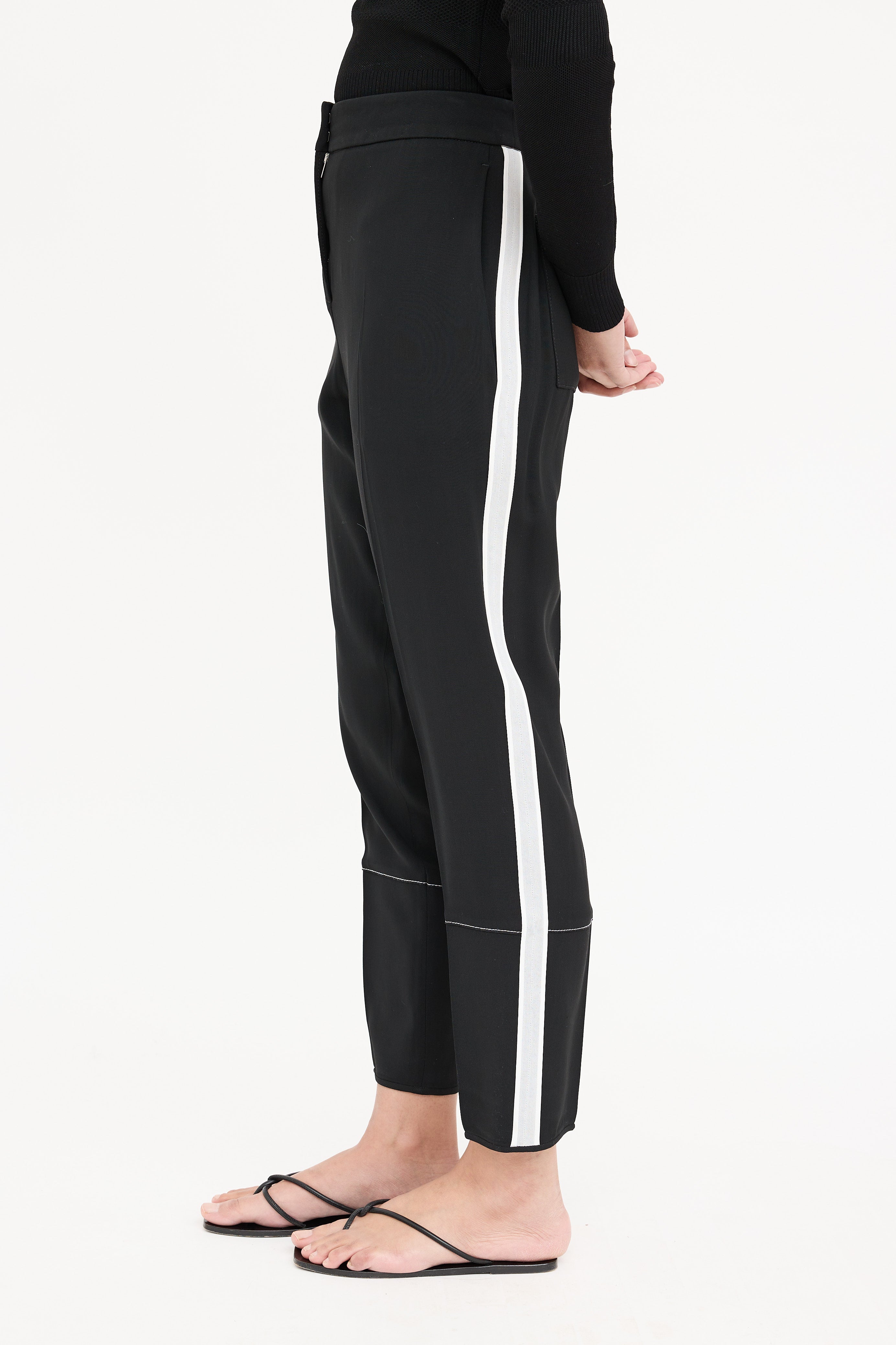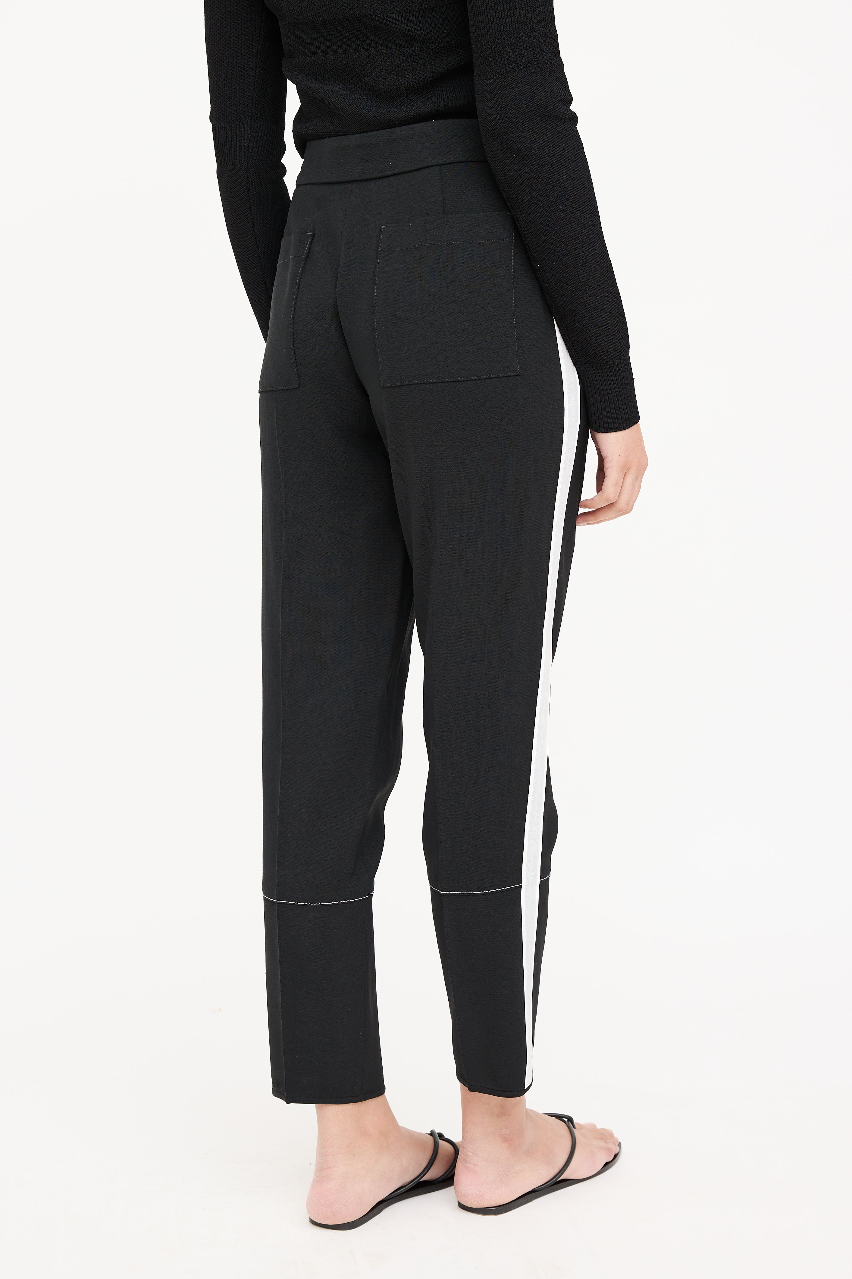Pre-owned Proenza Schouler black pants featuring clasp and zip closure, dual slip pockets on hip, white stripe on sides, contrast stitching, and dual slip pockets at back.