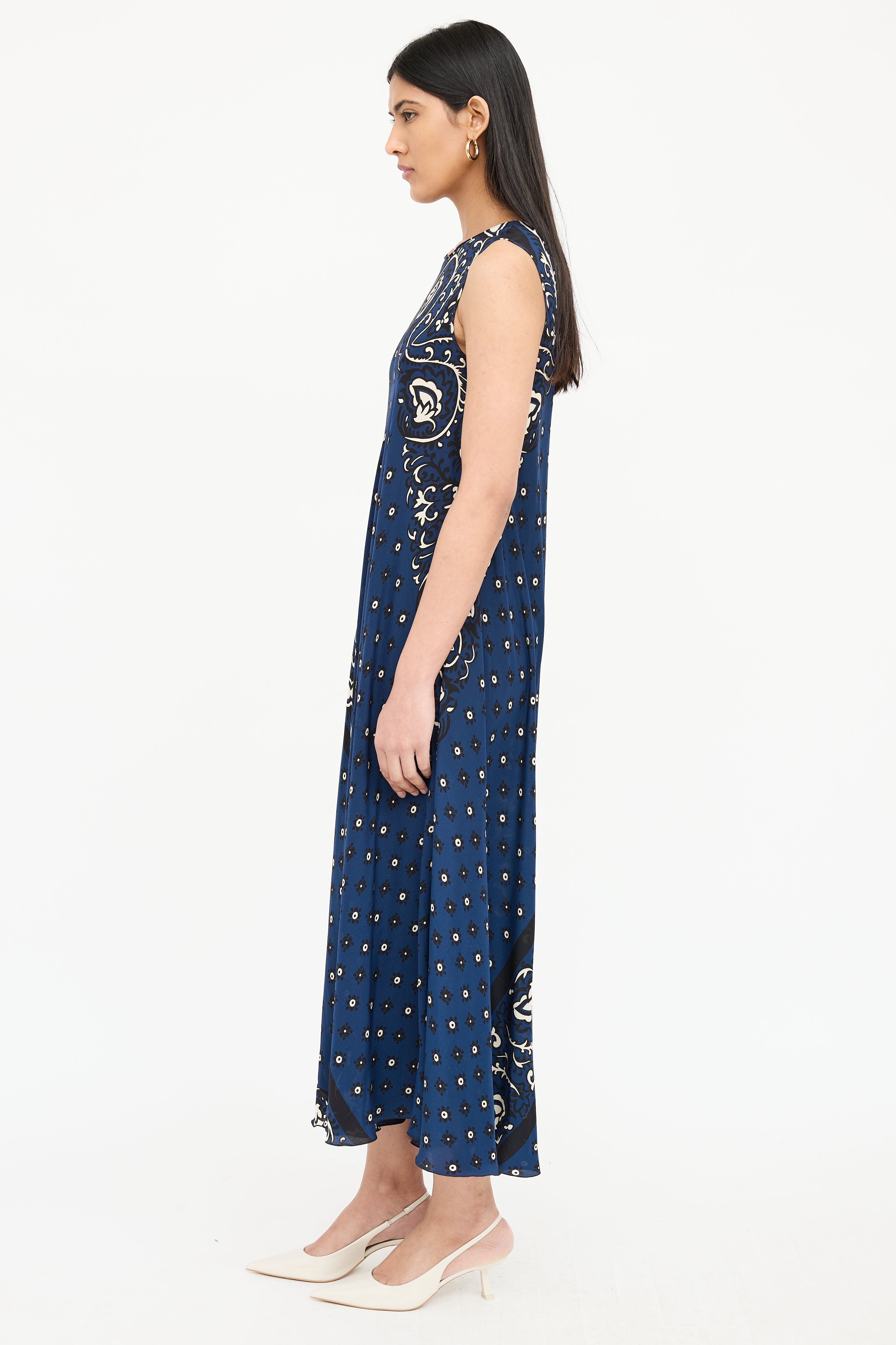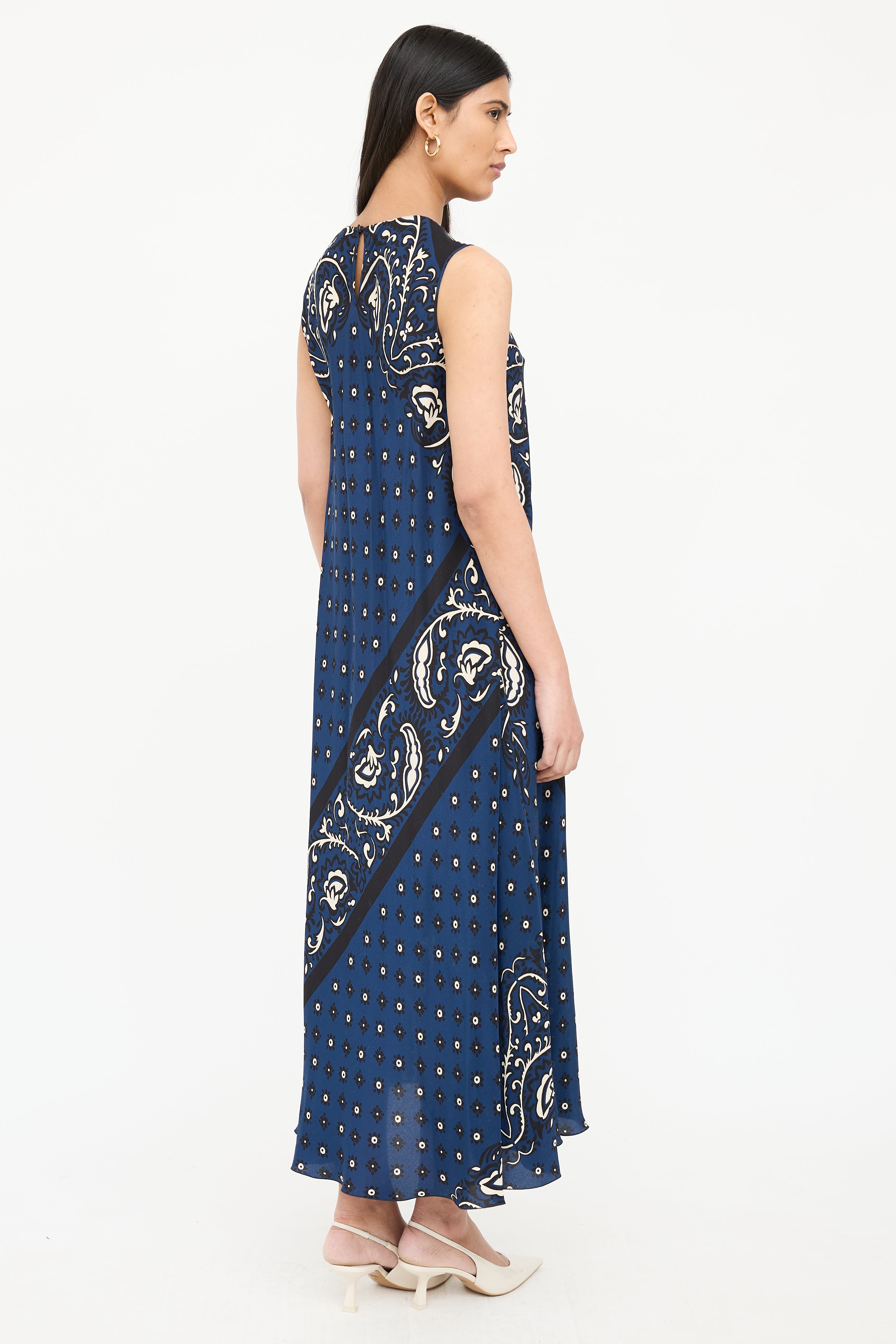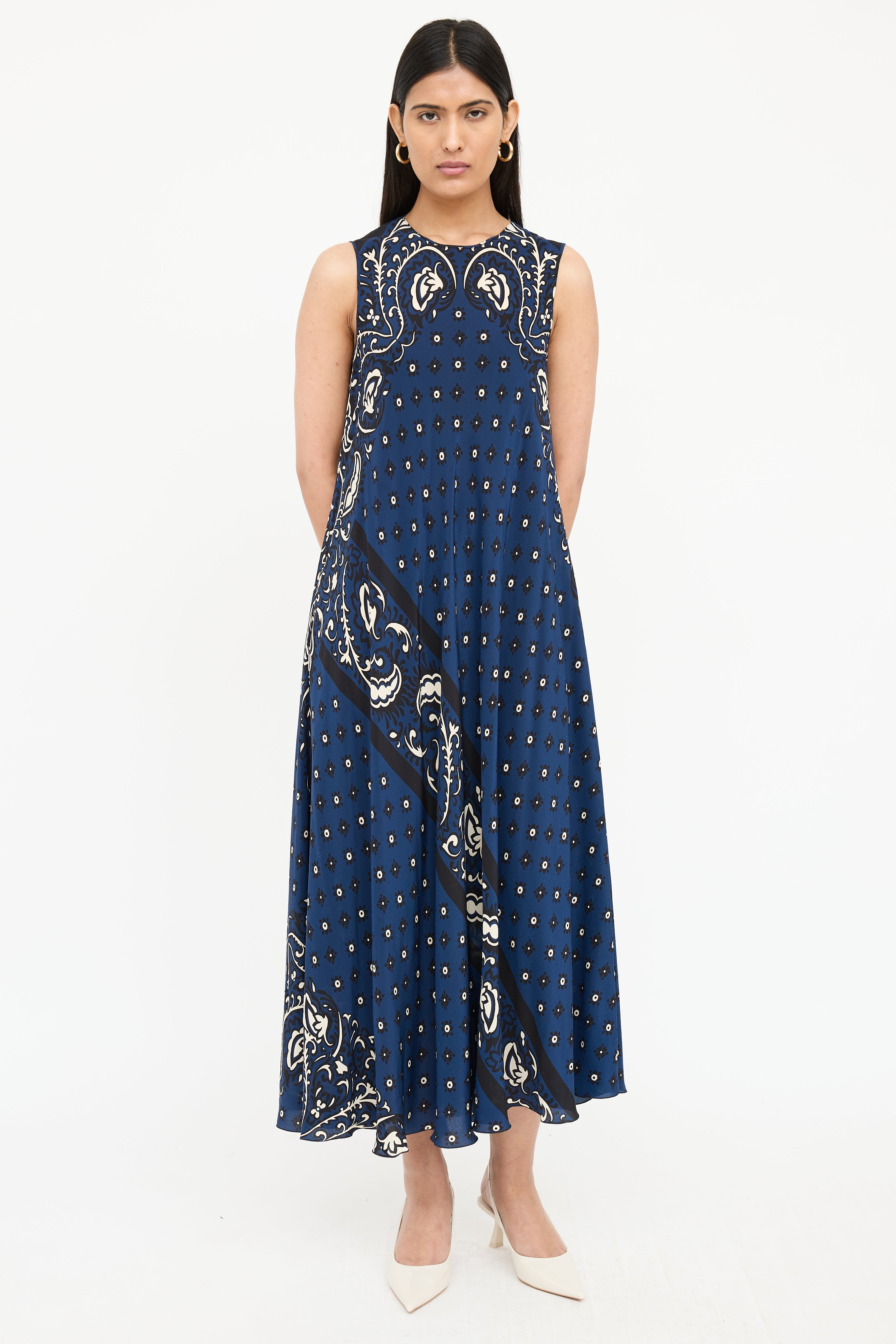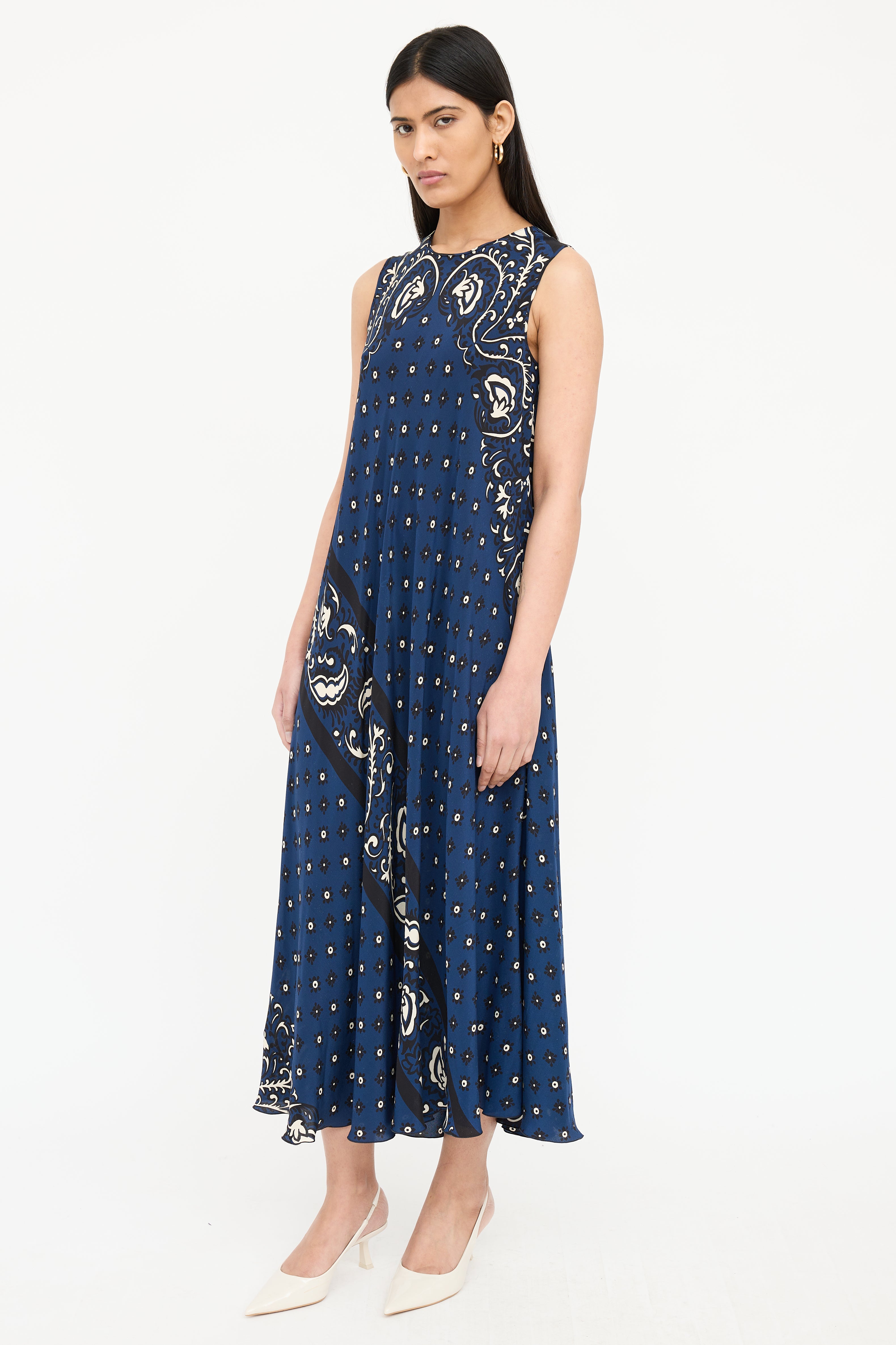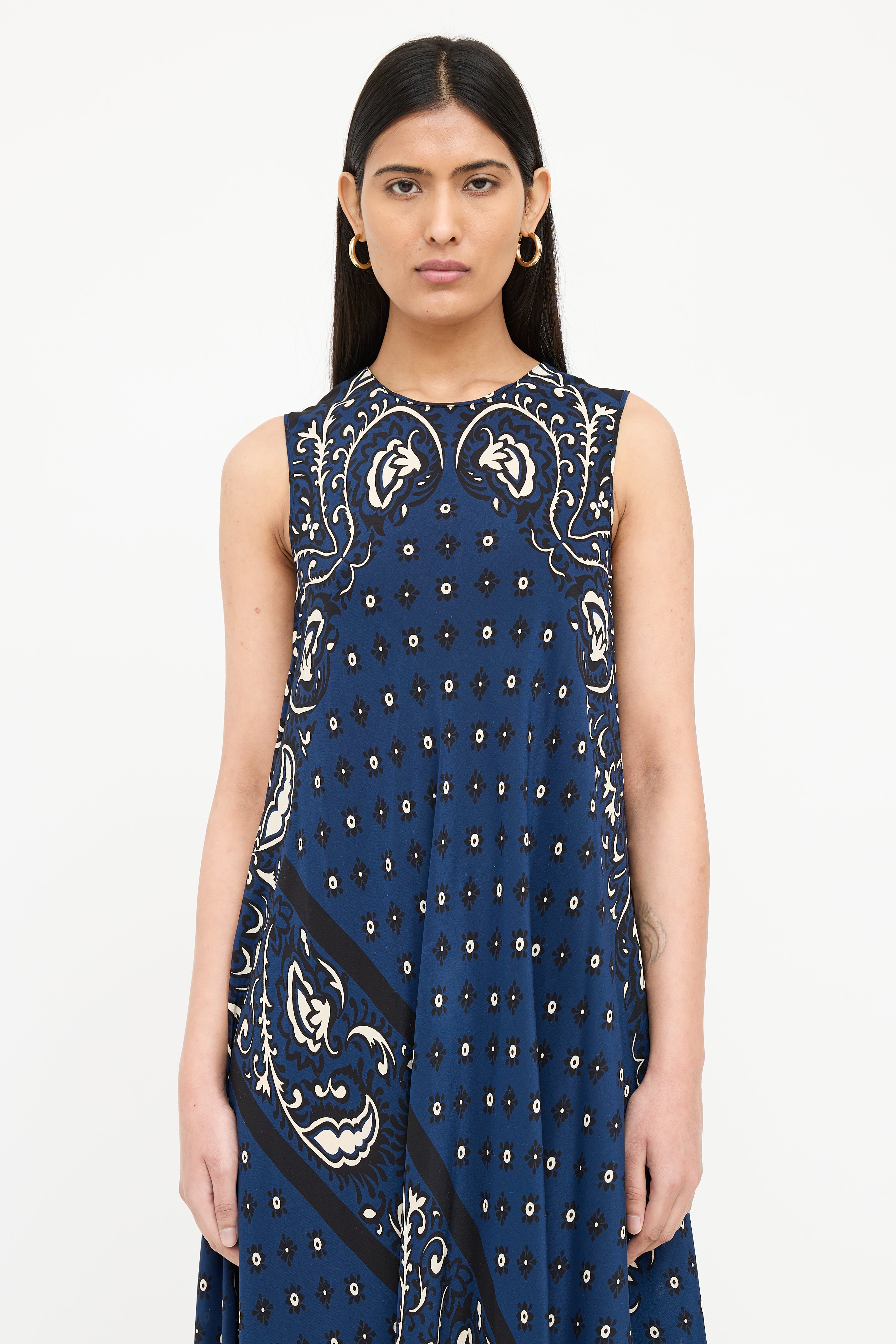 Pre-owned Red Valentino navy and white sleeveless maxi dress featuring round neck, concealed dual slip pockets on hip, paisley print, semi sheer and scalloped hem.