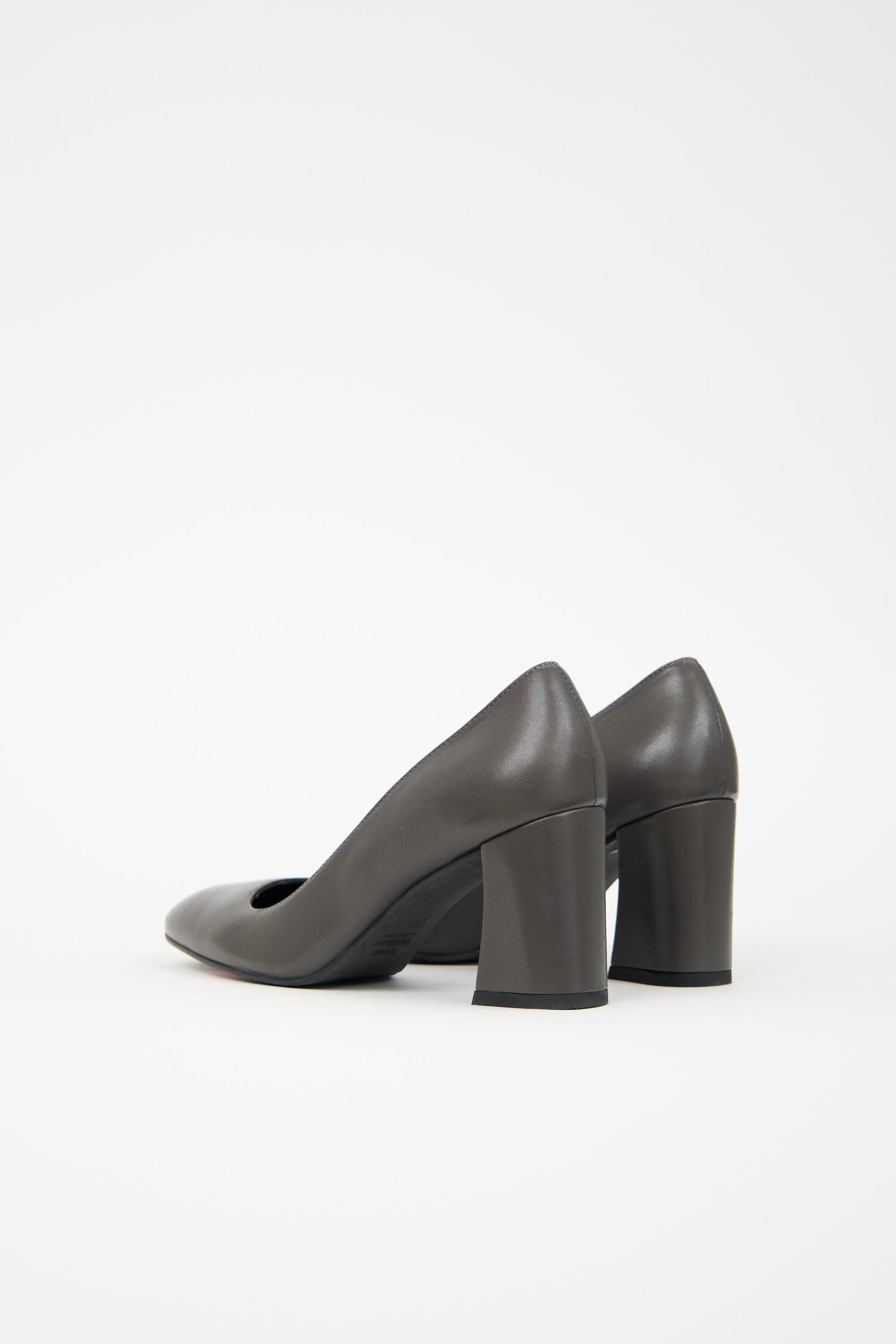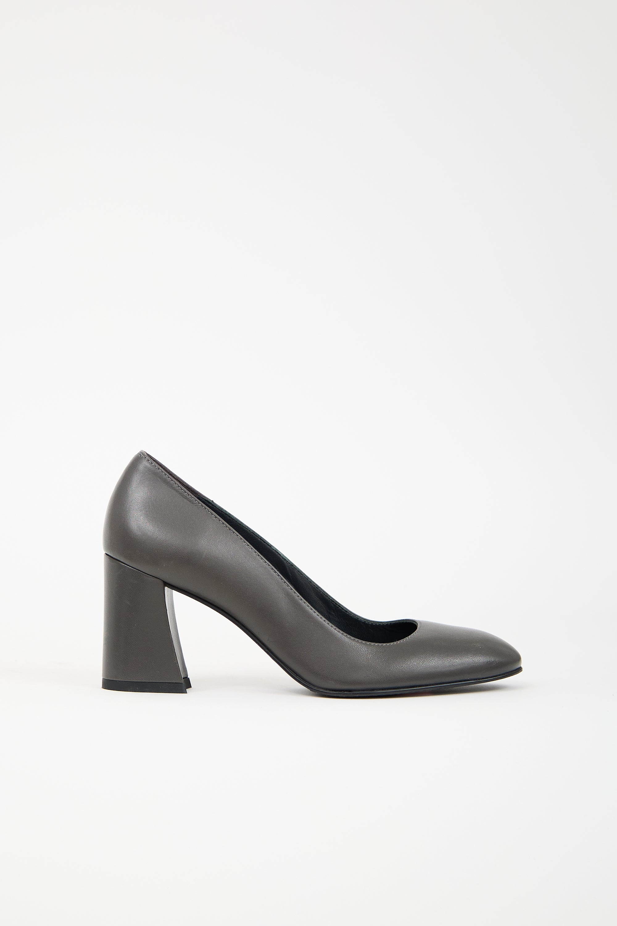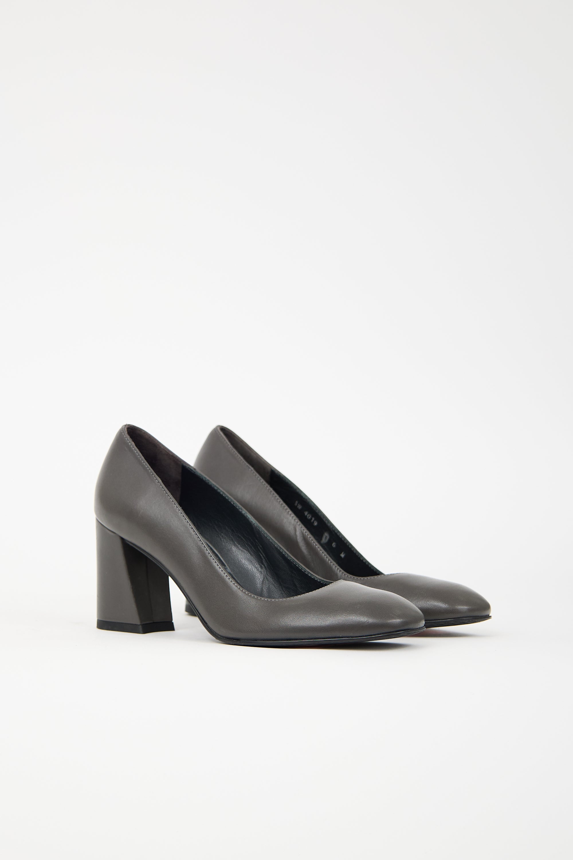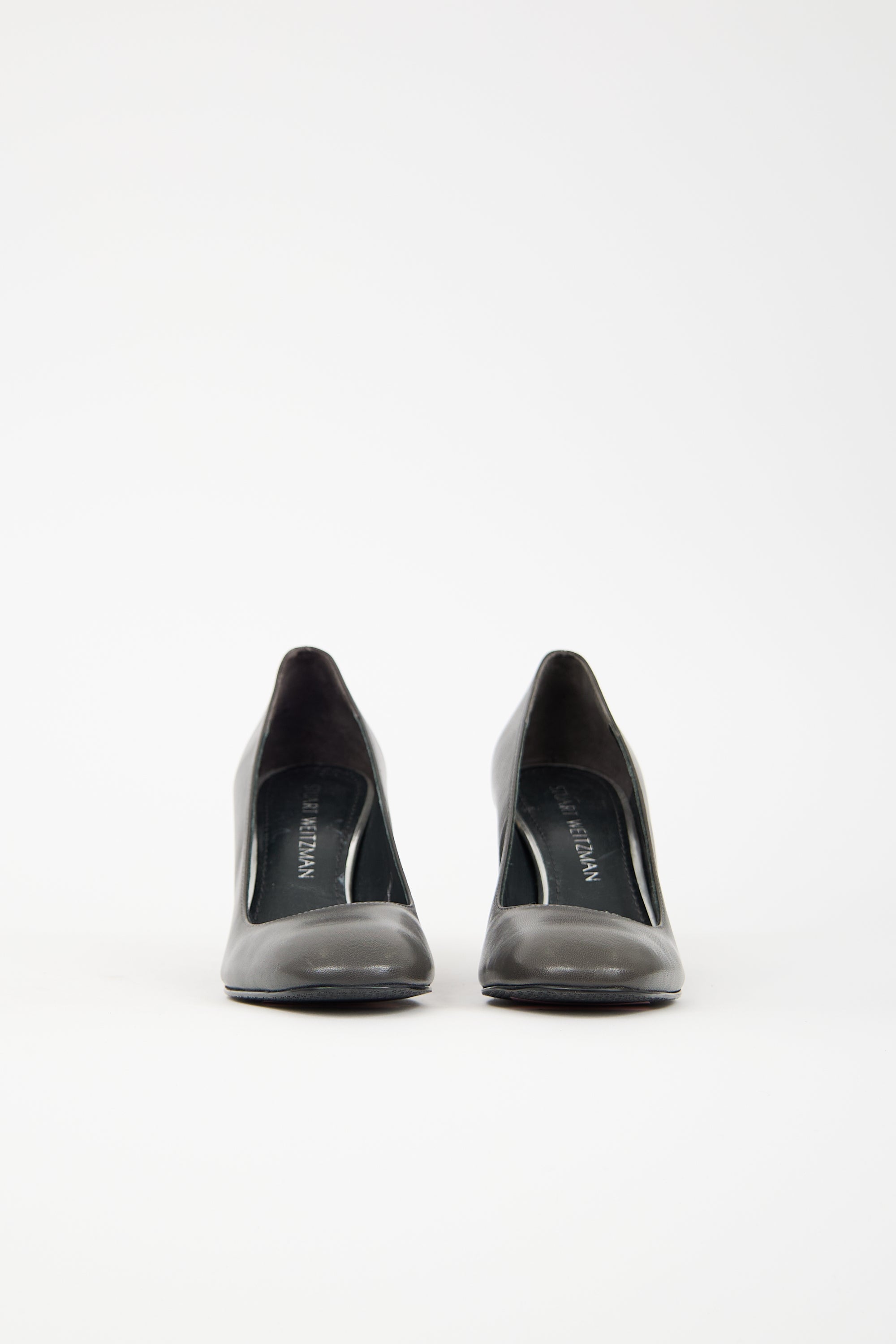 Pre-owned Stuart Weitzman dark grey leather pumps featuring square toe, slip on entry, and covered block heel.