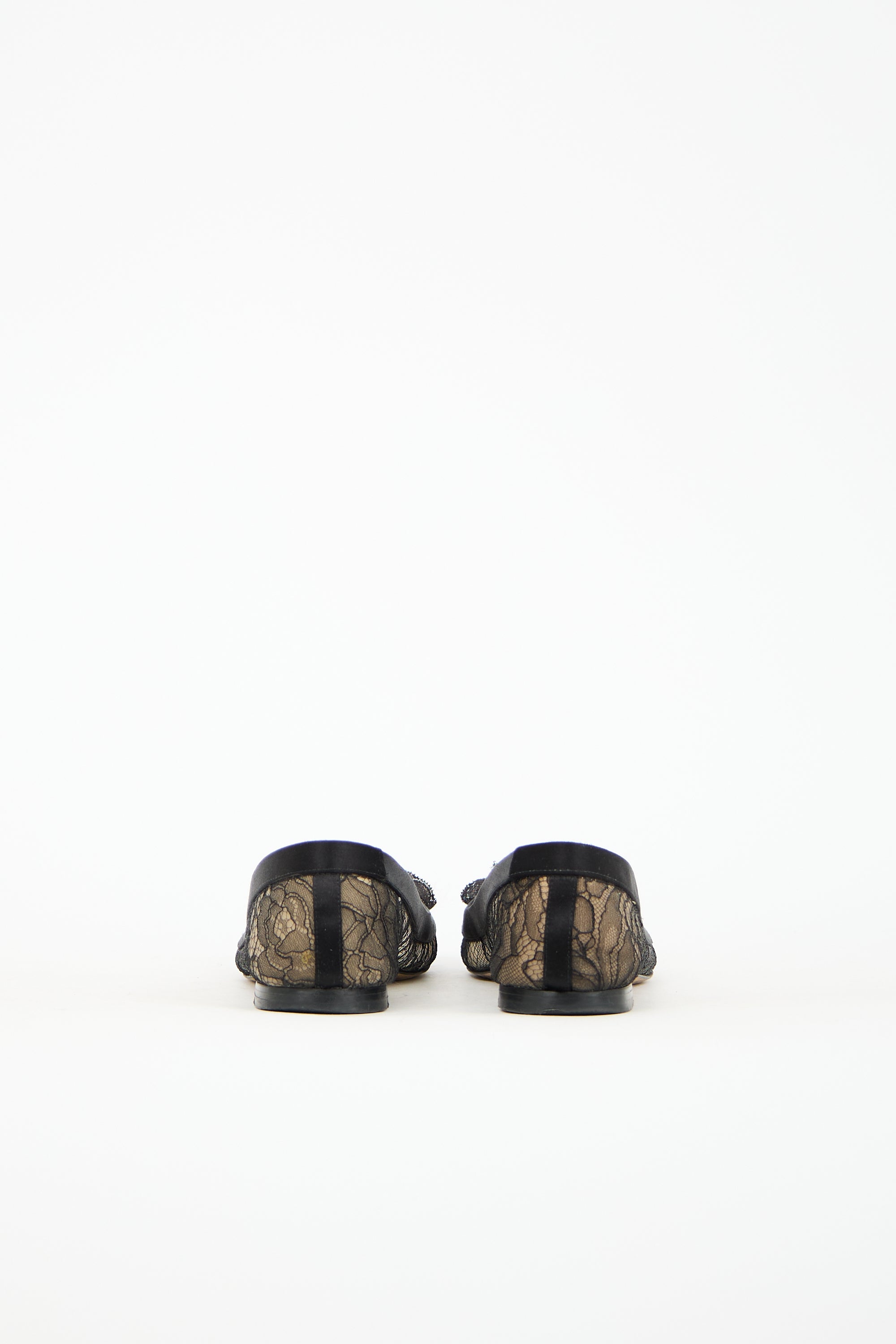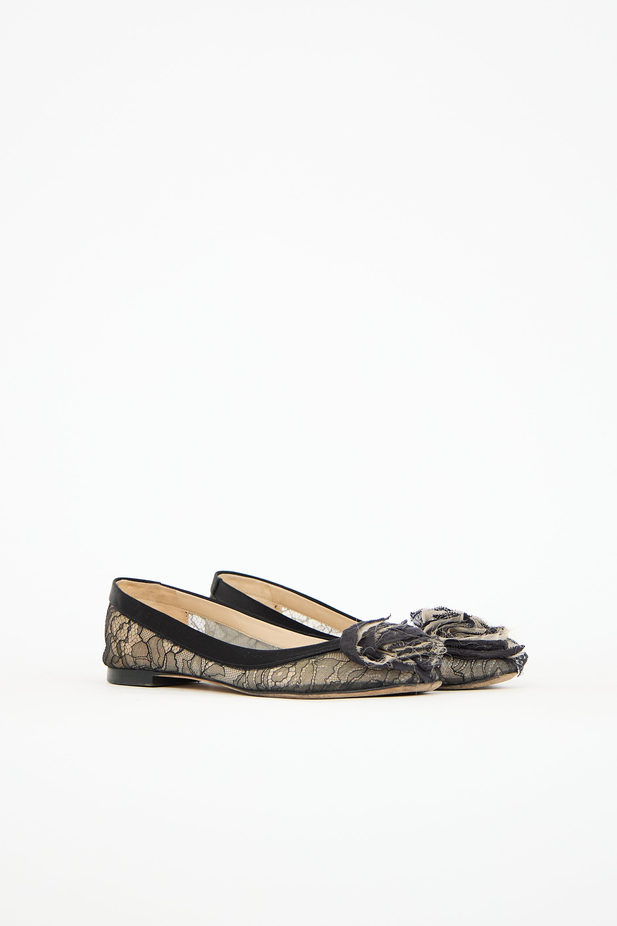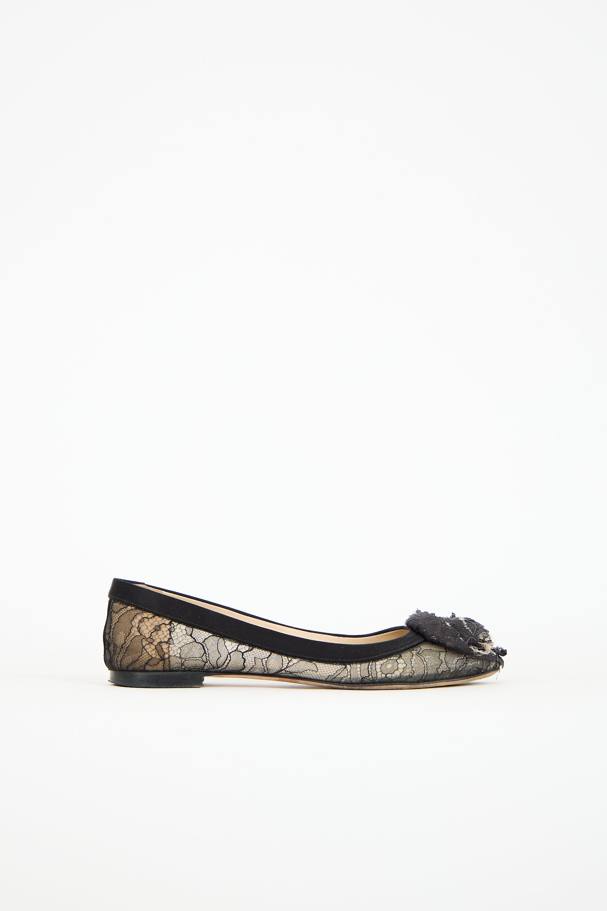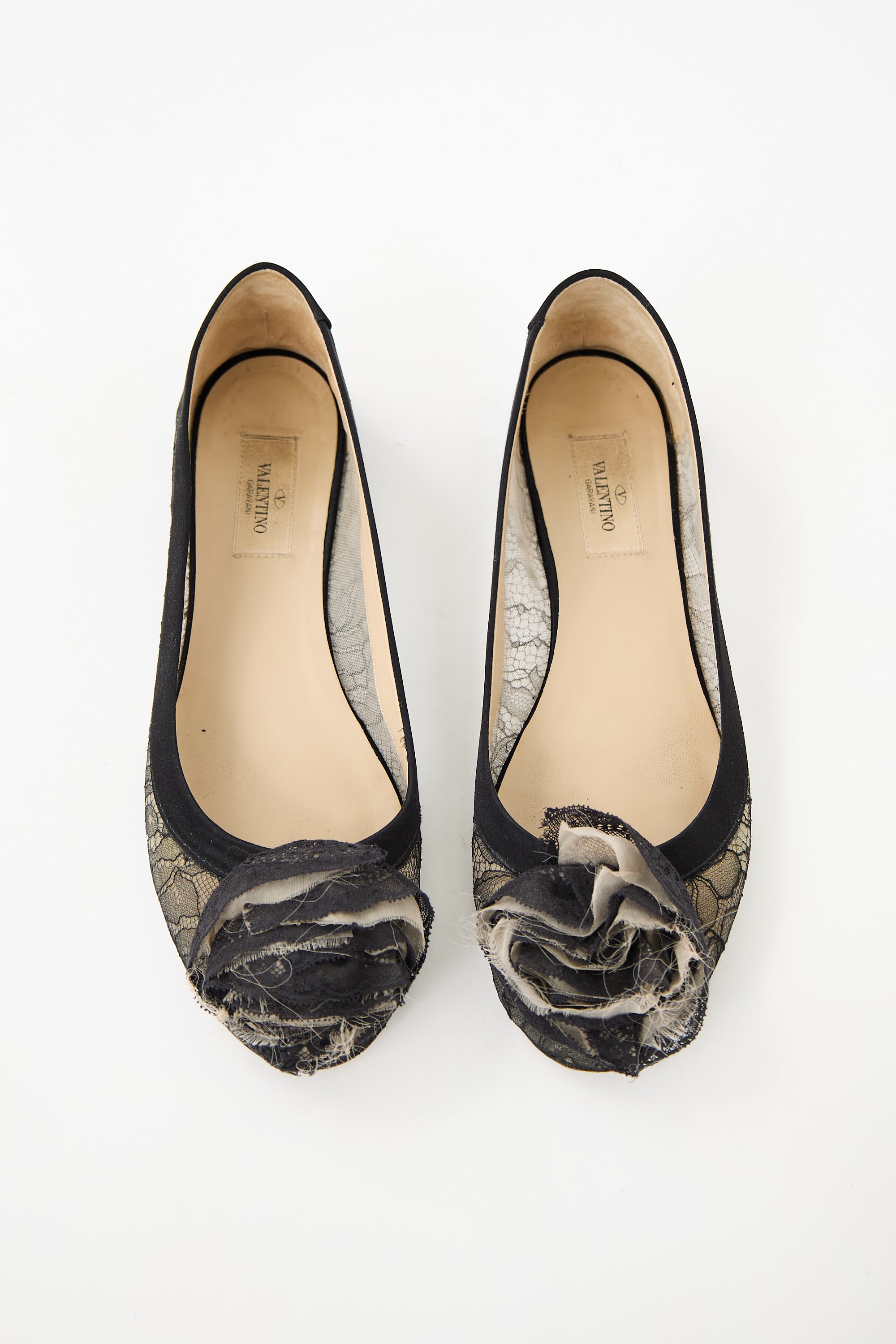 Pre-owned Valentino black and beige lace ballet flats featuring a rounded toe, rosette appliqué at vamp, and leather insole and outsole.