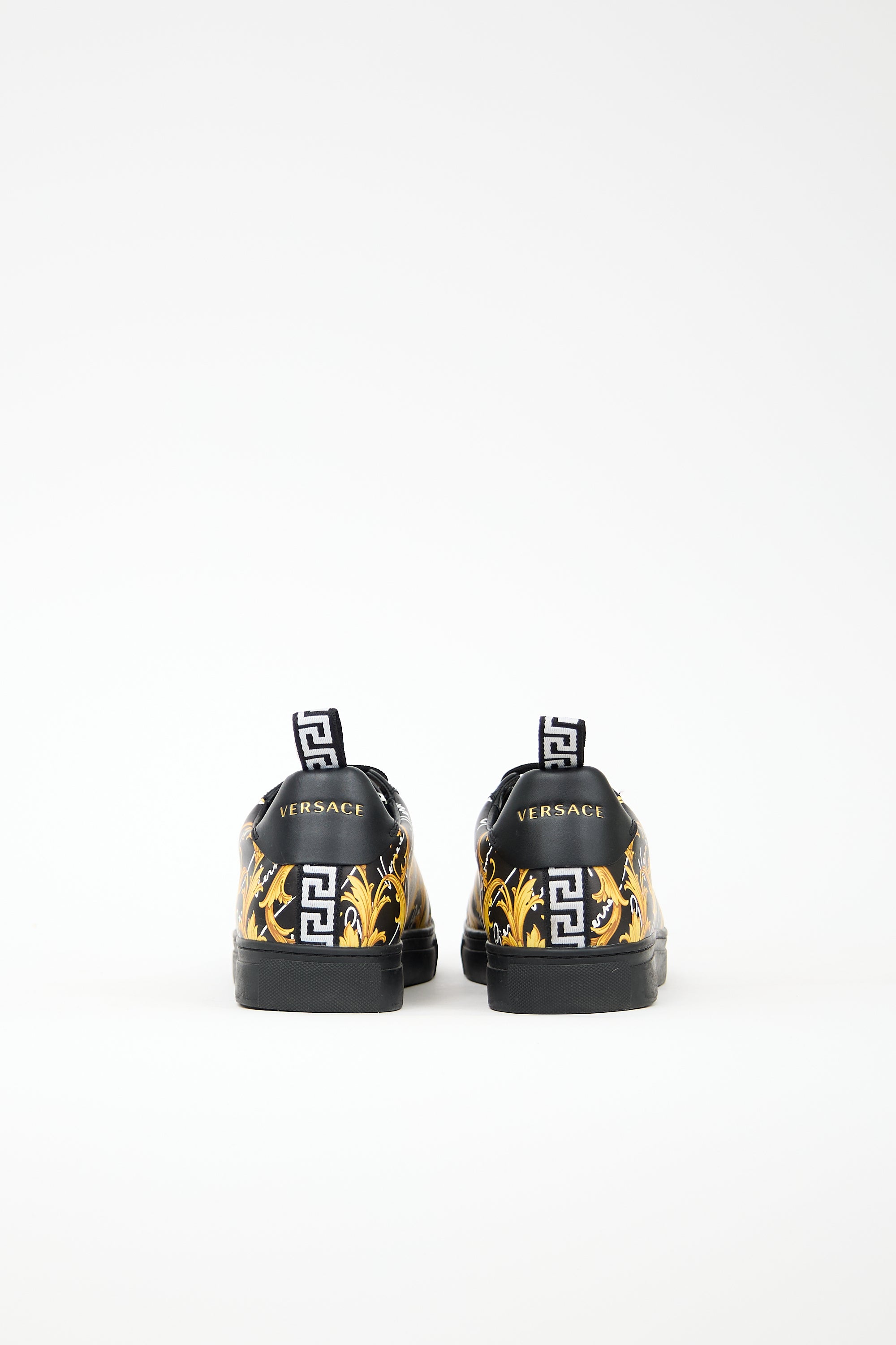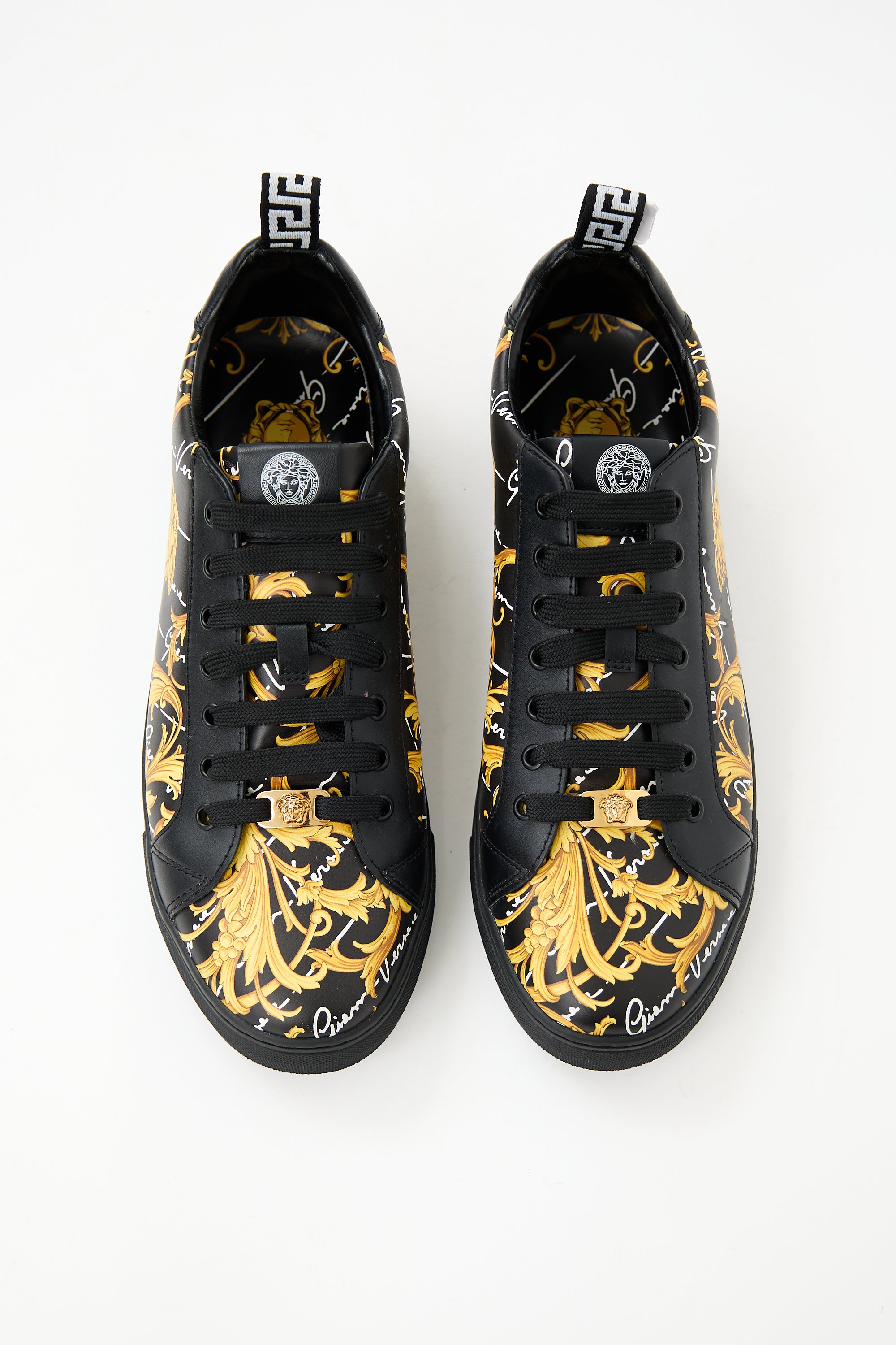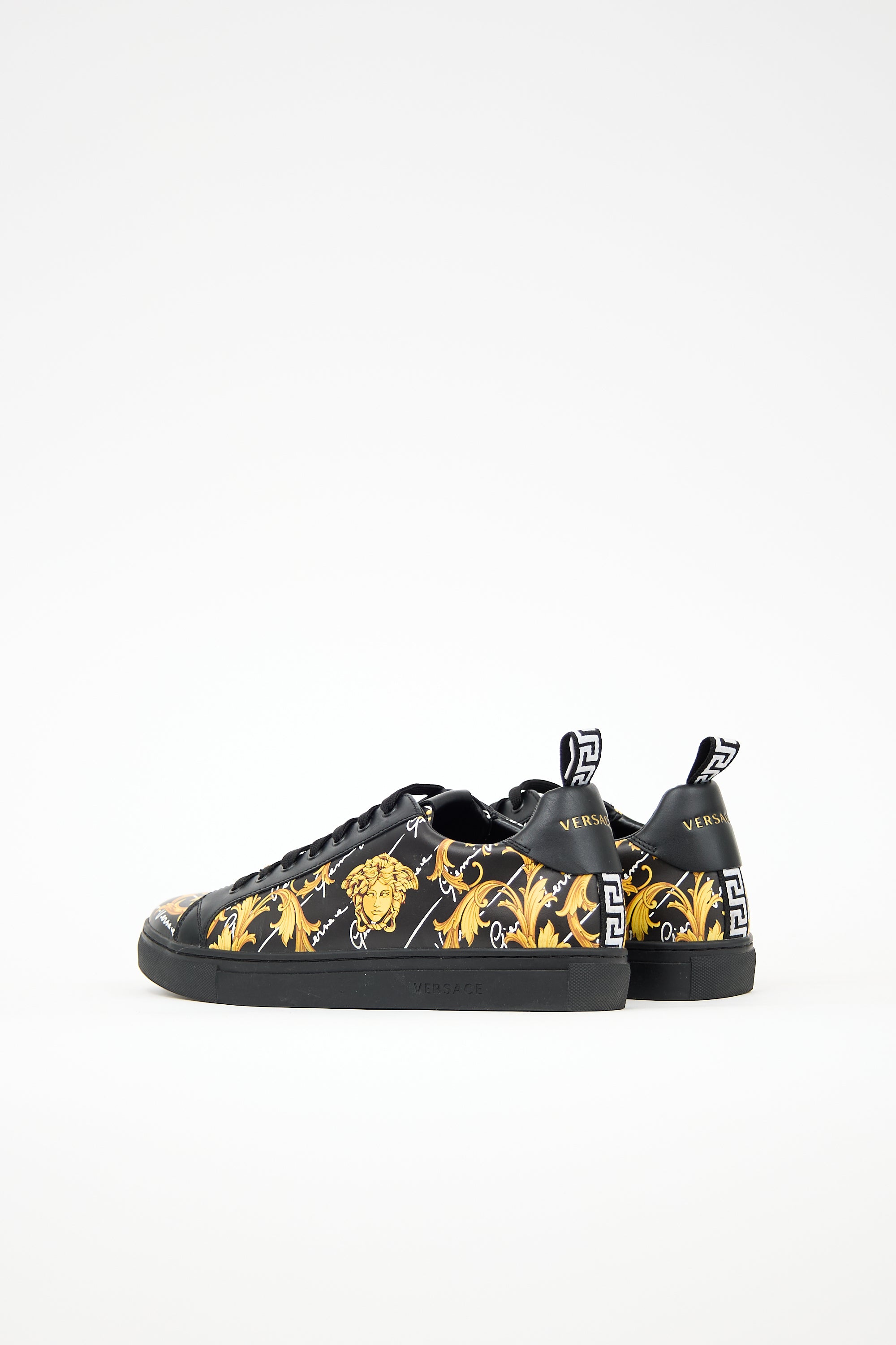 Pre-owned Versace black and gold tone leather low sneakers featuring Barocco print, rounded toe, lace up front with gold tone logo embellishment, logo tab at tongue, motif pull tab and stamped logo at counter, and rubber sole with debossed logo.
