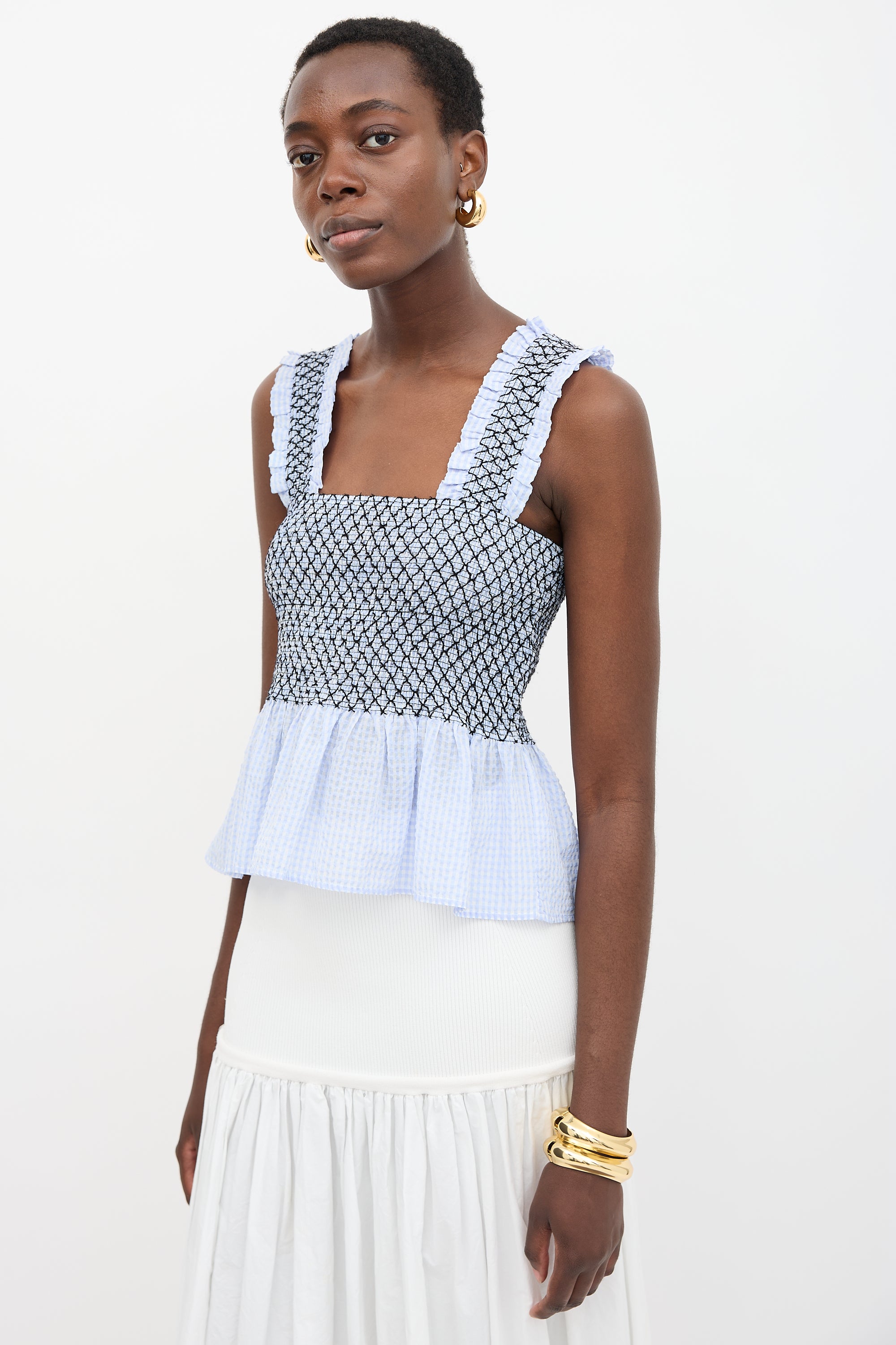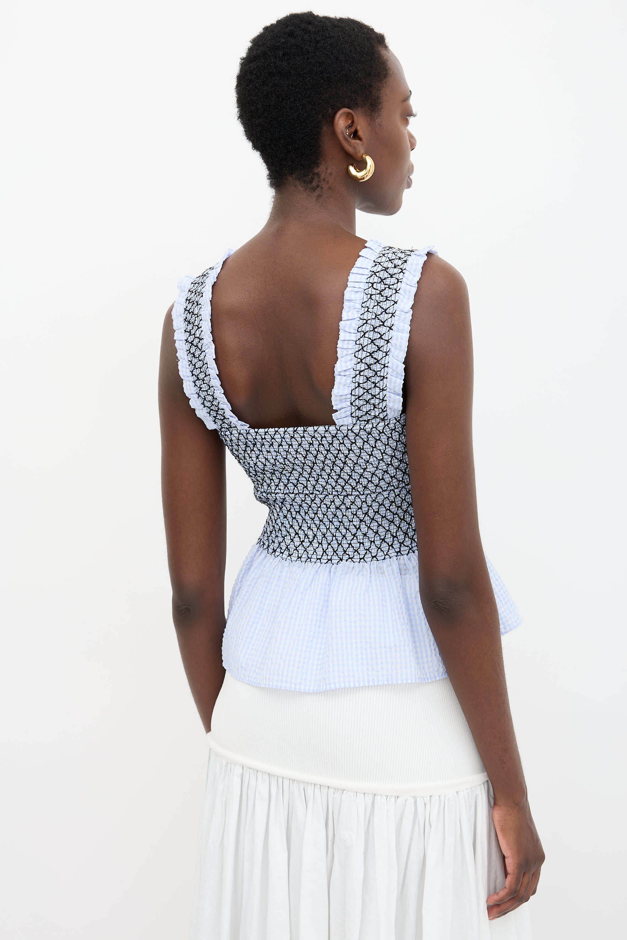 Pre-owned Ganni smocked Charron top featuring blue and white gingham pattern, black mesh embroidery throughout, square neckline, peplum waist, and ruffle trim.