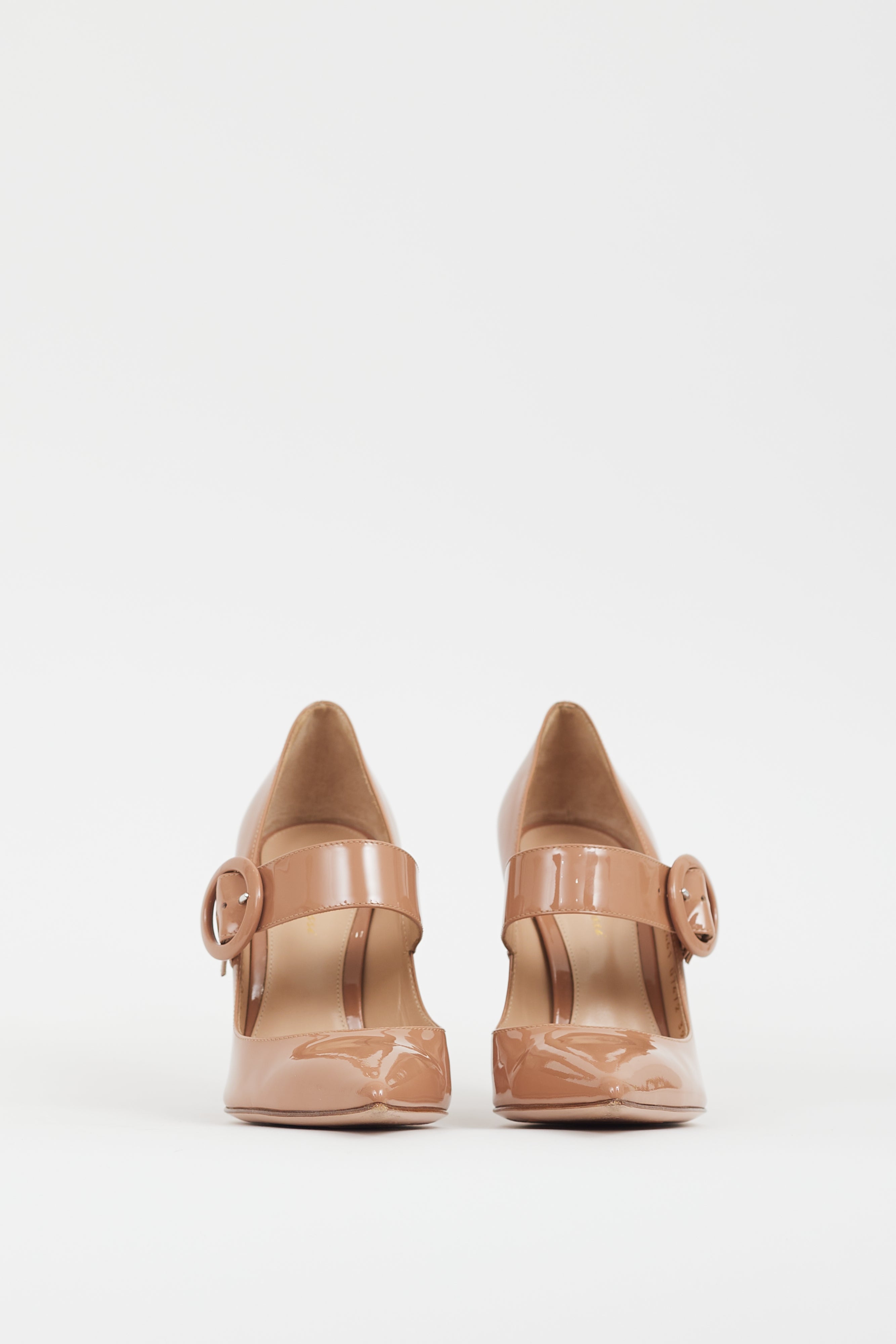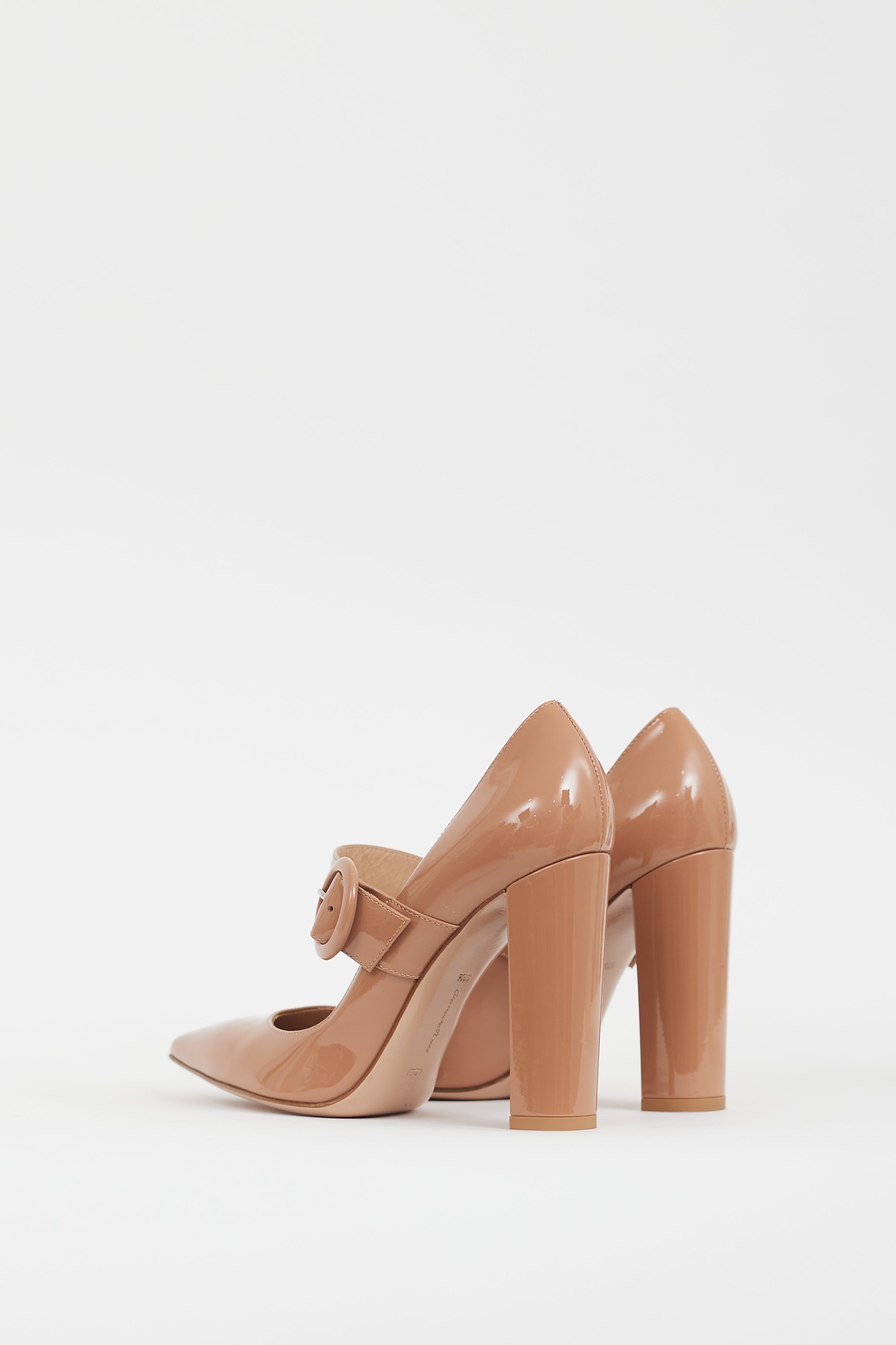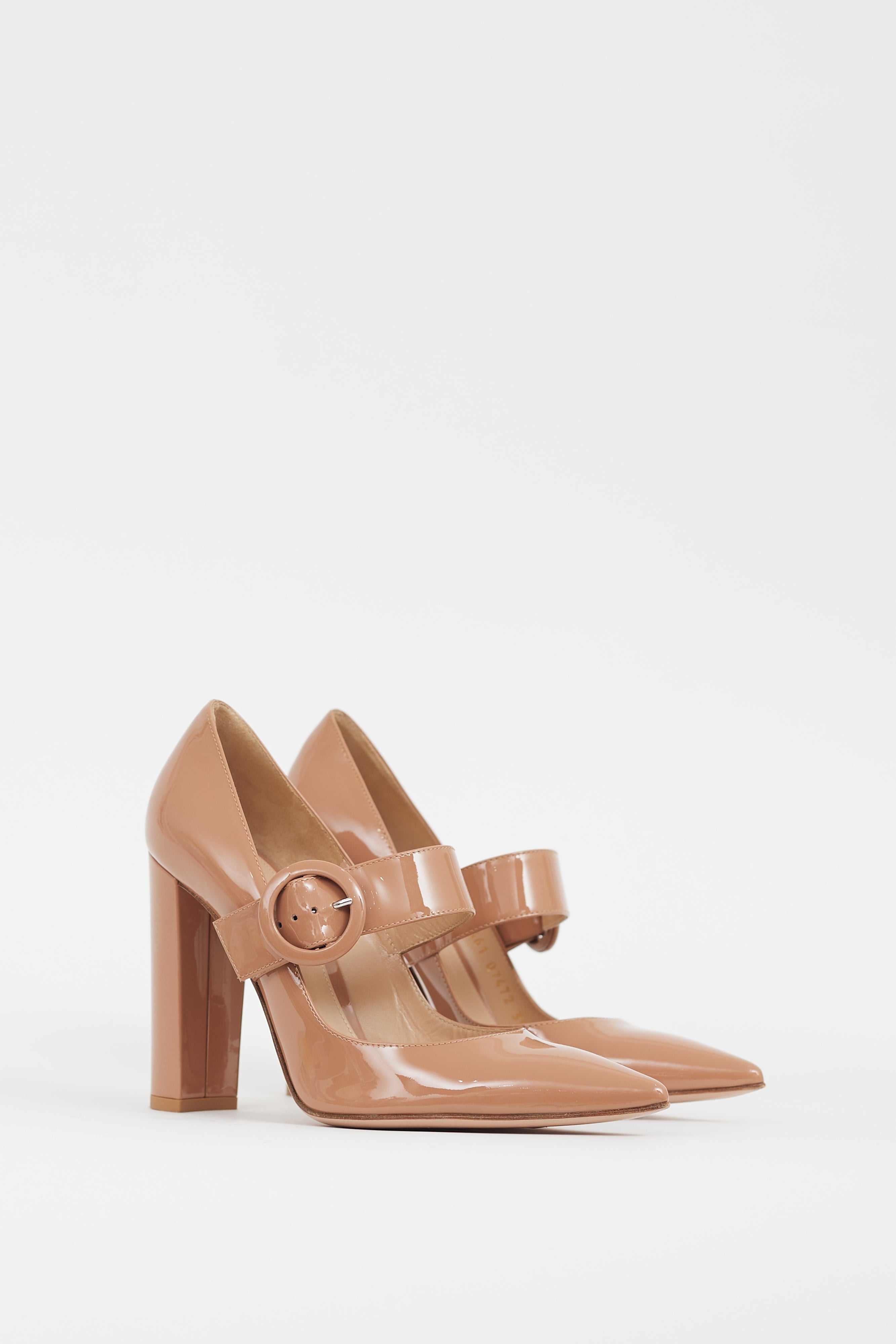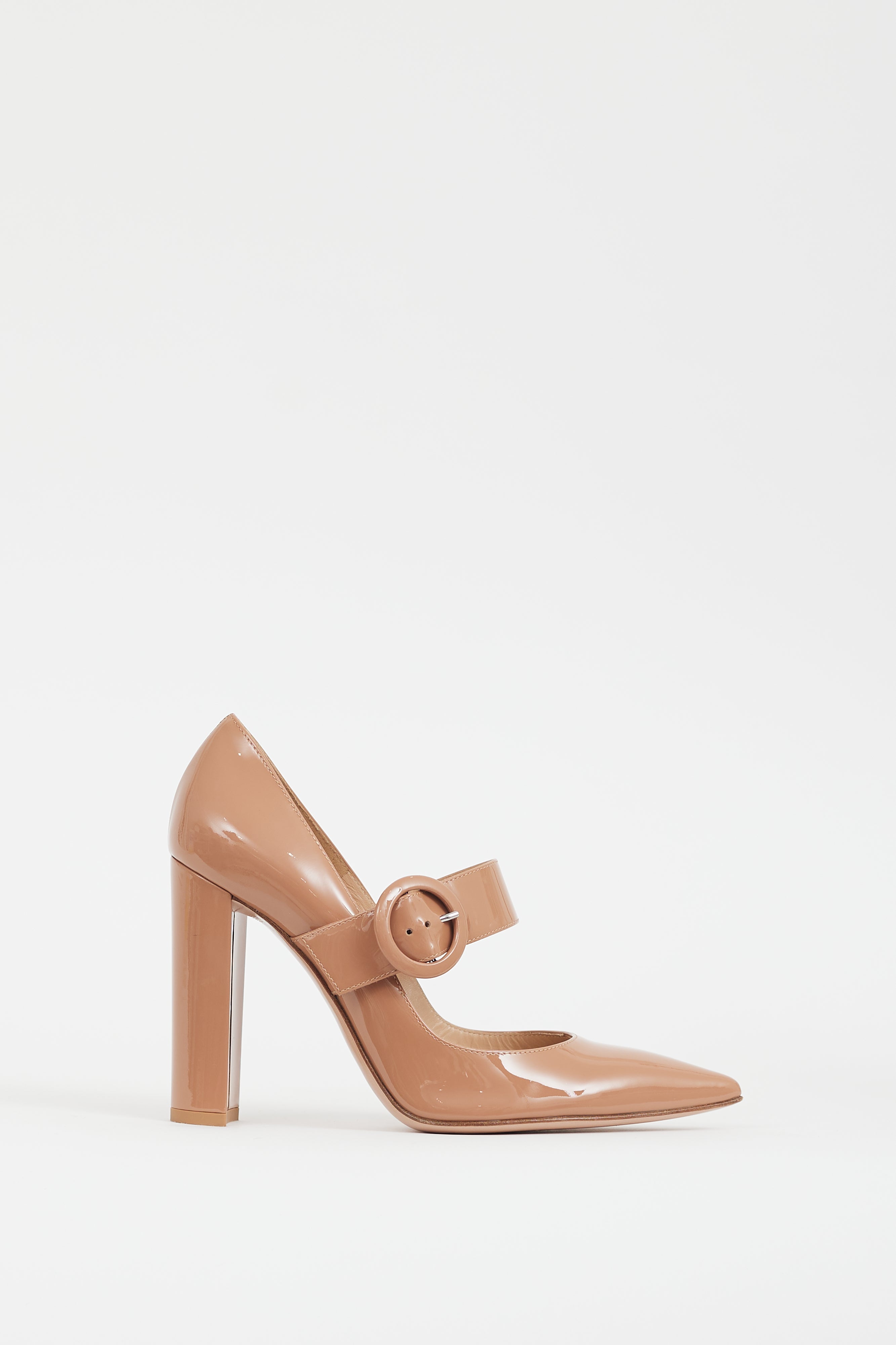 Pre-owned Gianvito Rossi beige patent leather Mary Jane heels featuring a pointed toe, covered patent leather block heel, and an adjustable pin-buckle strap at the vamp.