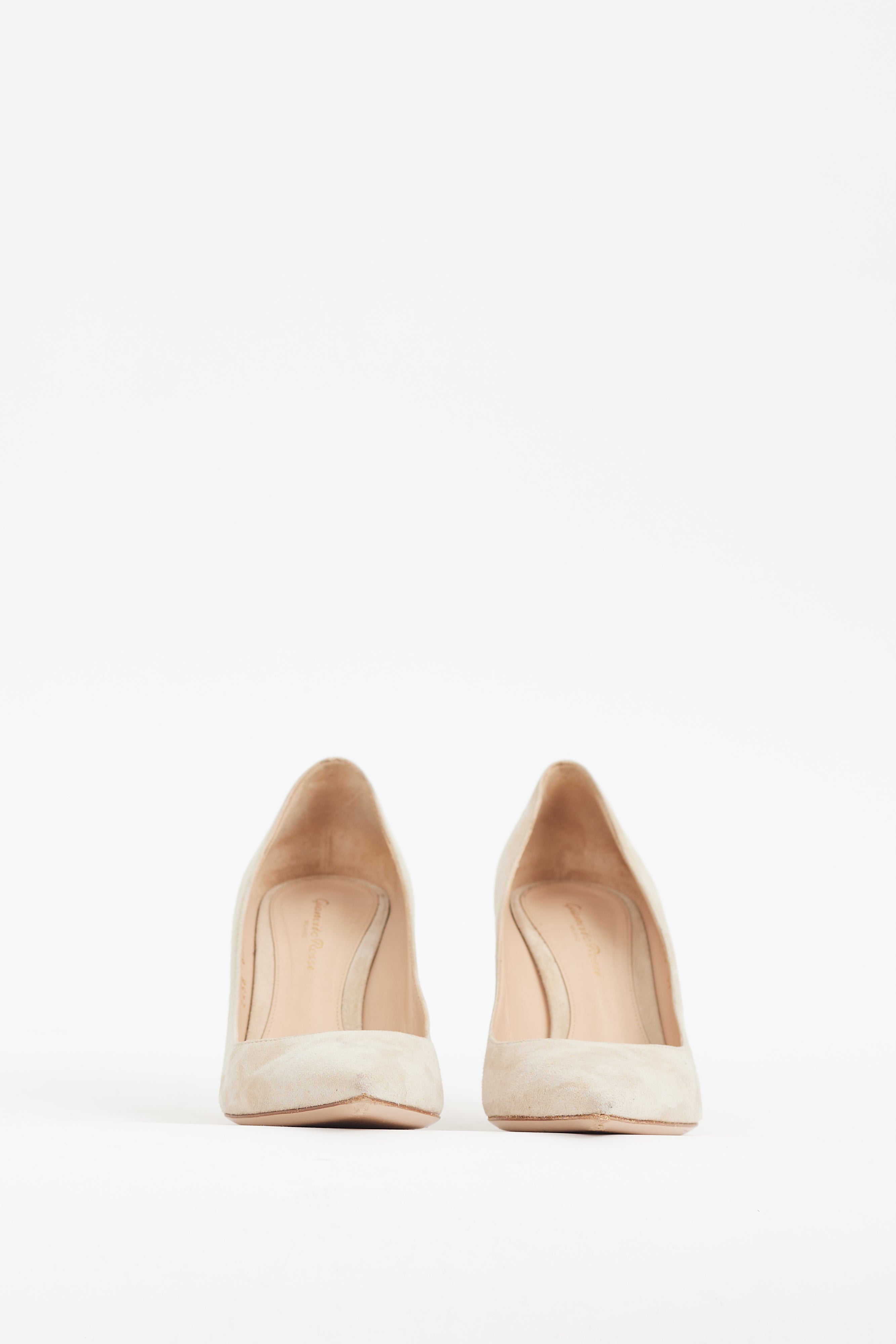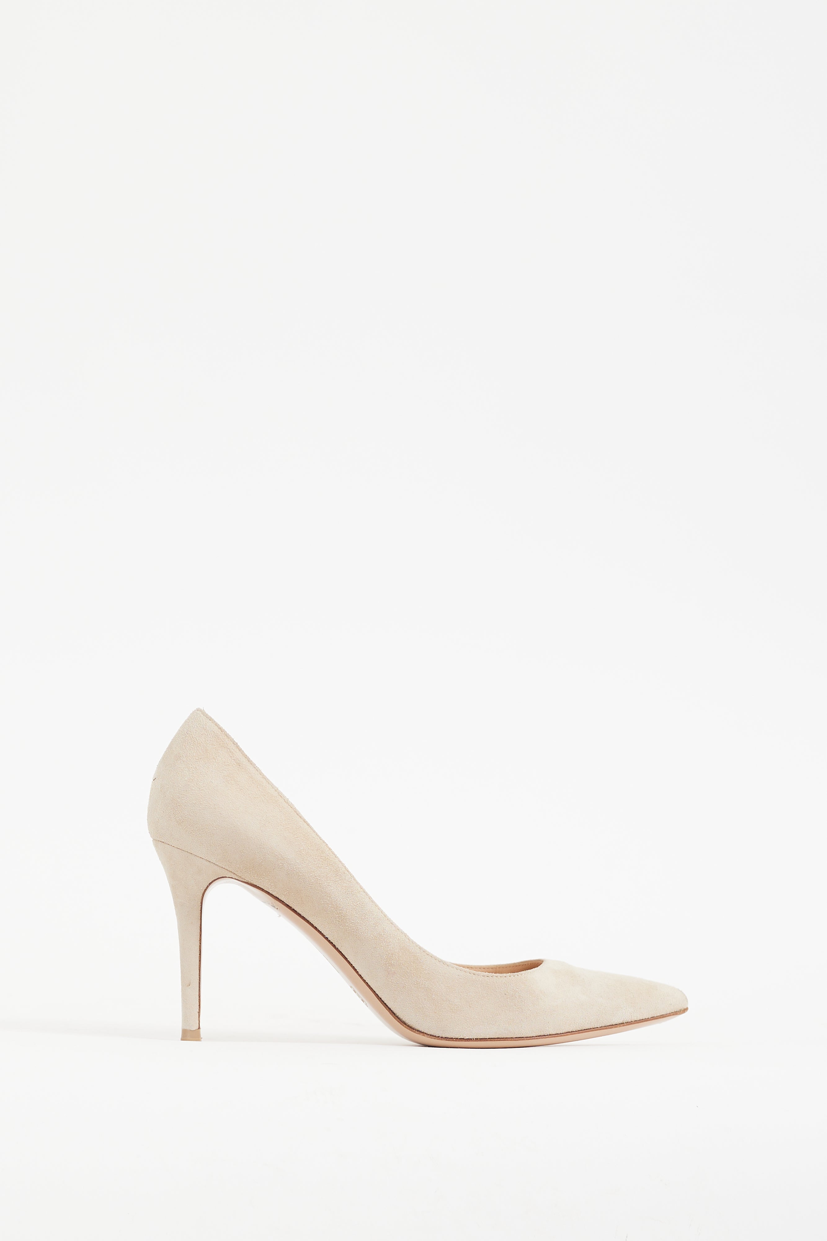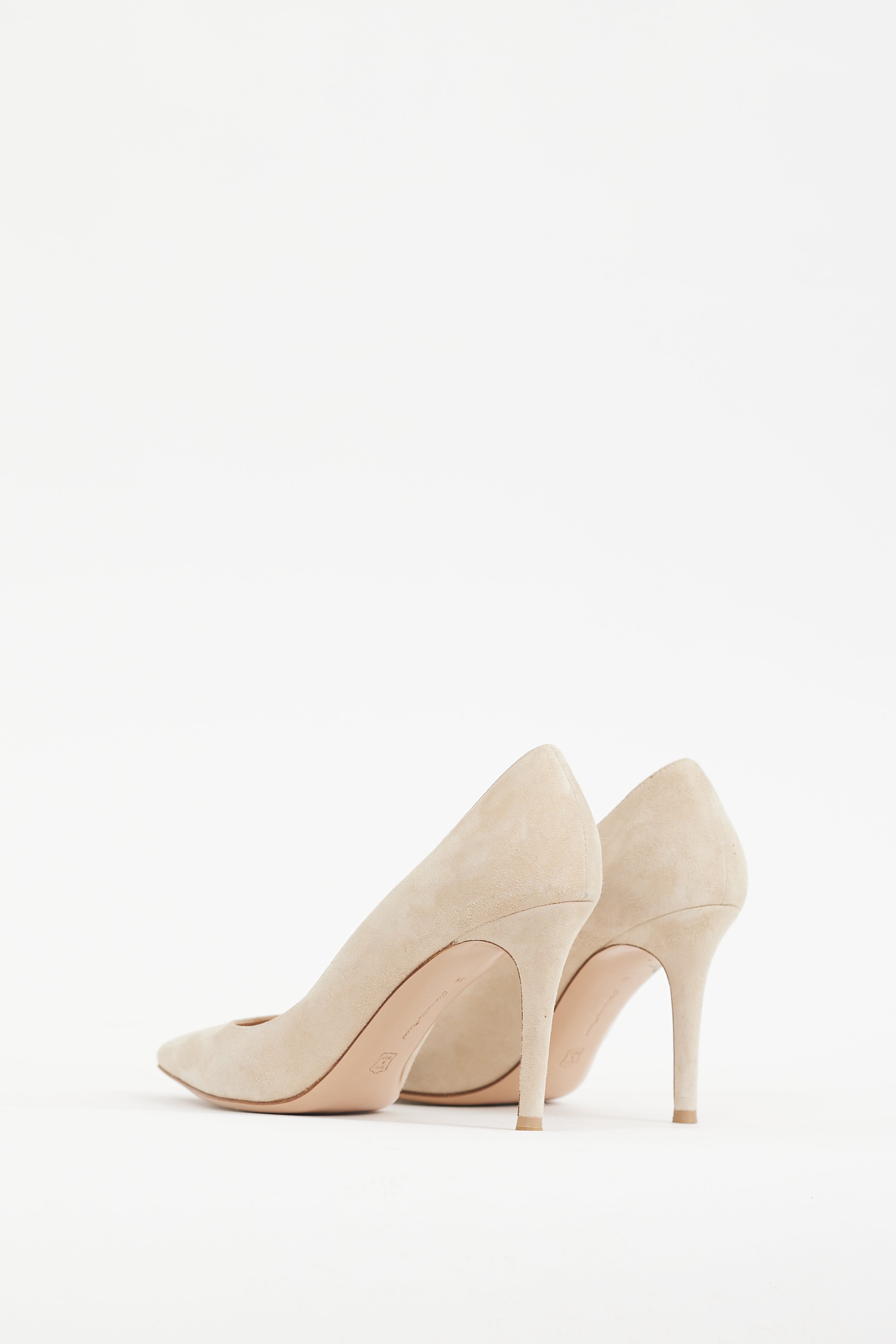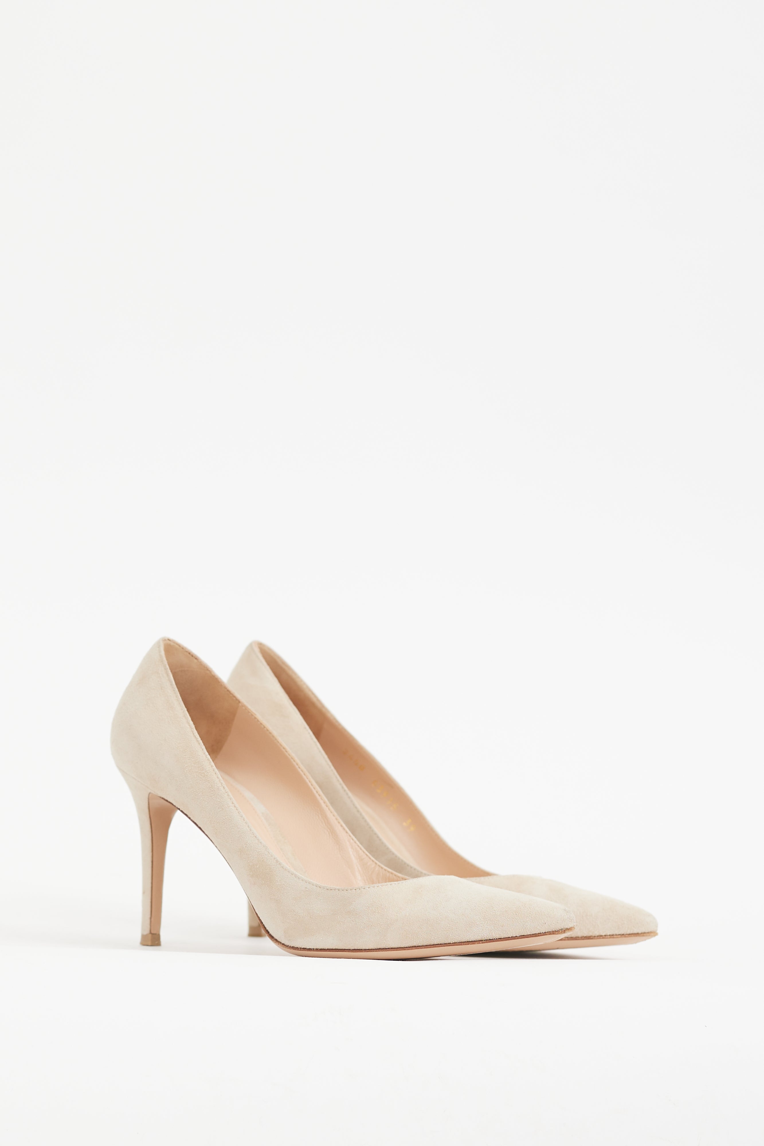 Pre-owned Gianvito Rossi Gianvito 85 pumps featuring a pointed toe, beige suede uppers, and a stiletto heel.