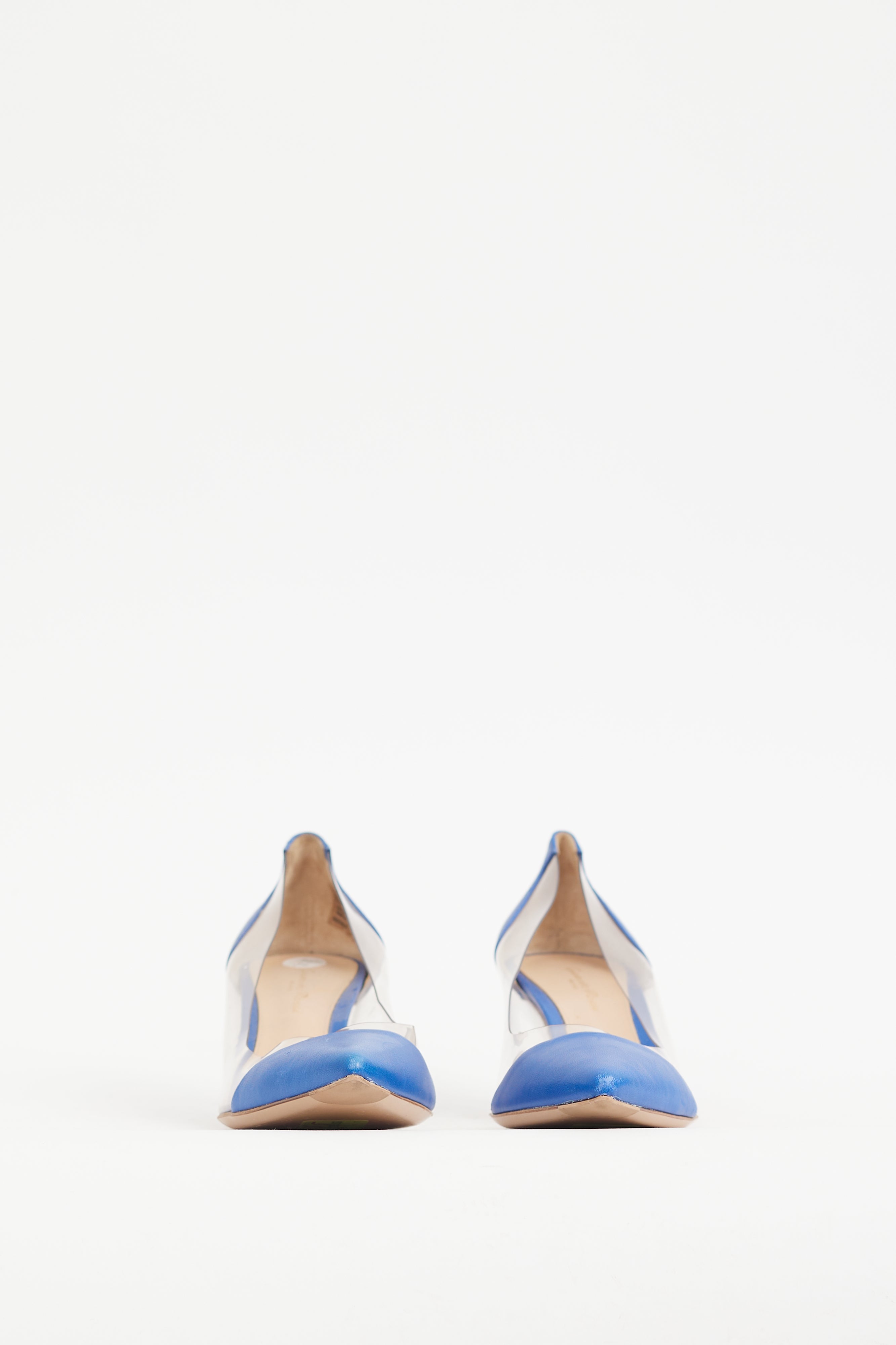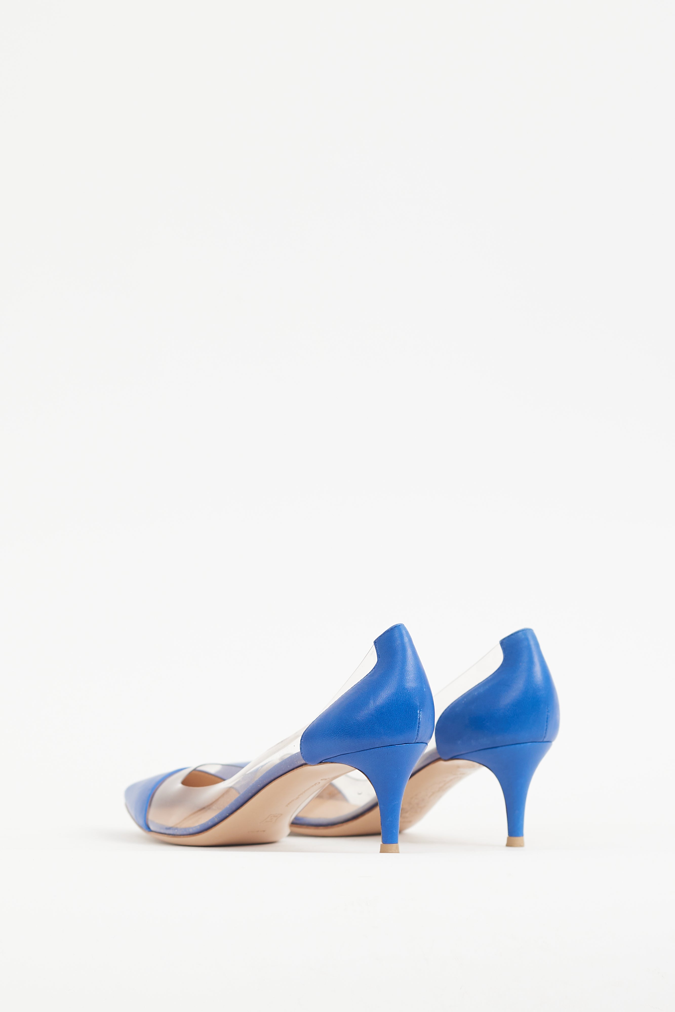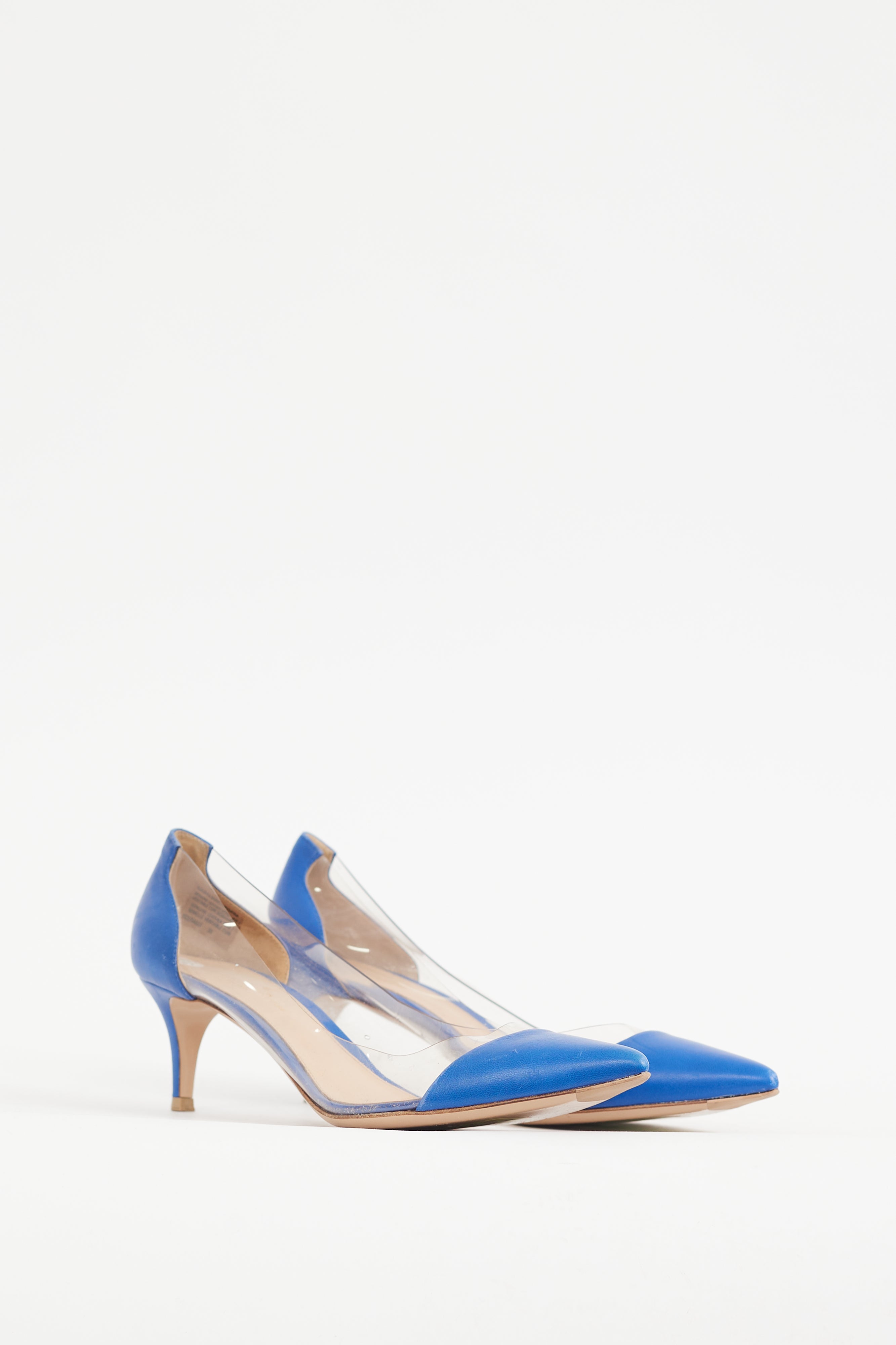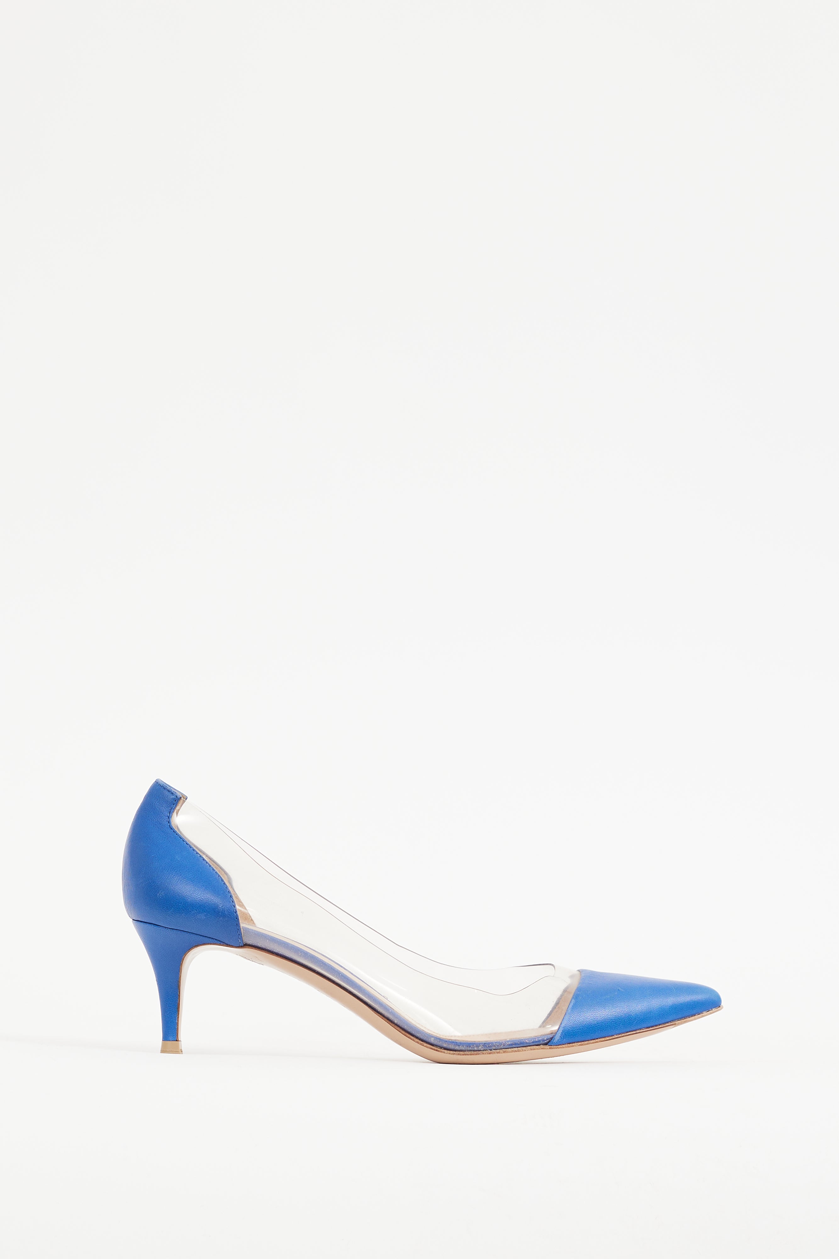 Pre-owned Gianvito Rossi Plexi 55 pumps featuring a pointed toe, blue leather and clear PVC uppers, and a kitten heel.
