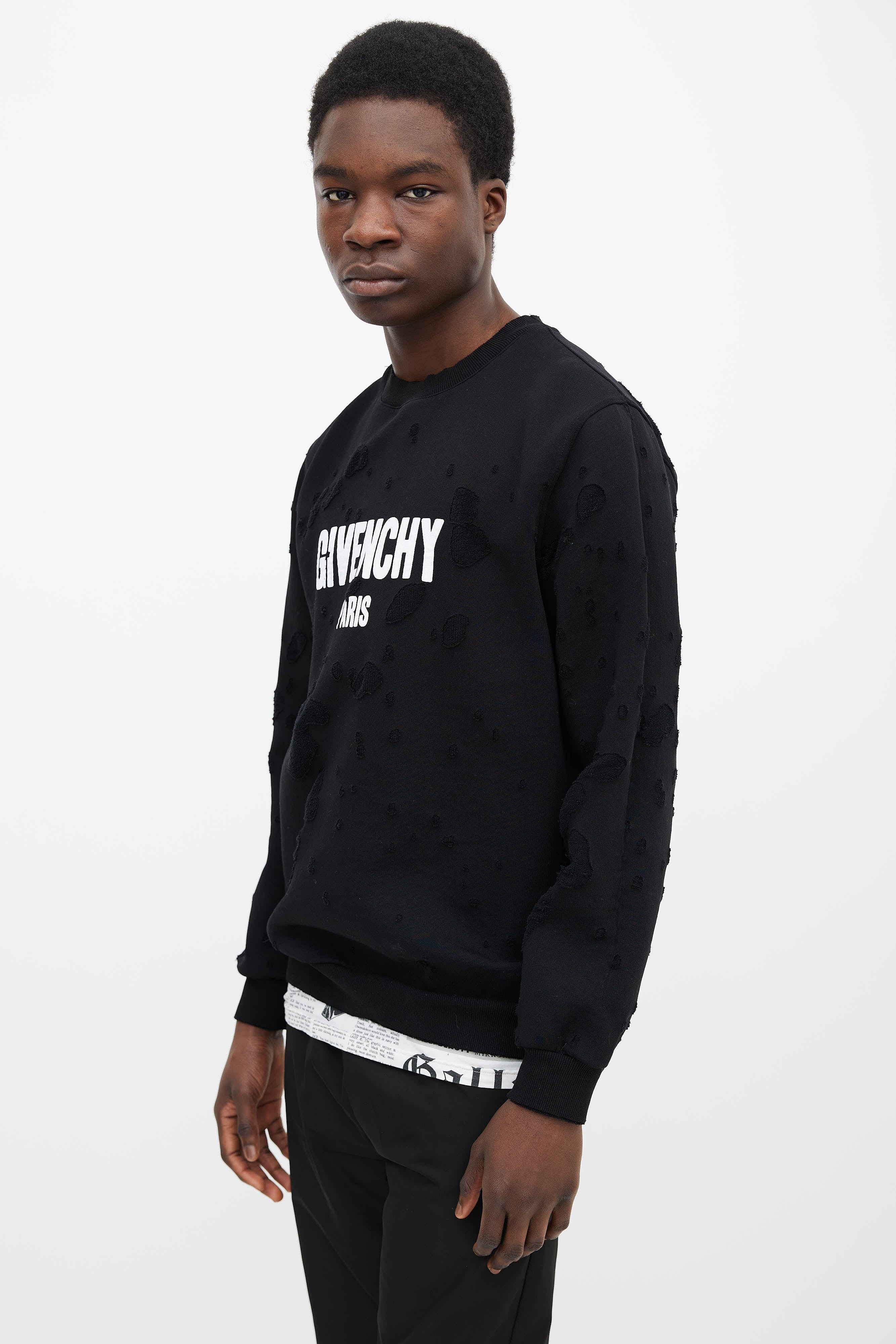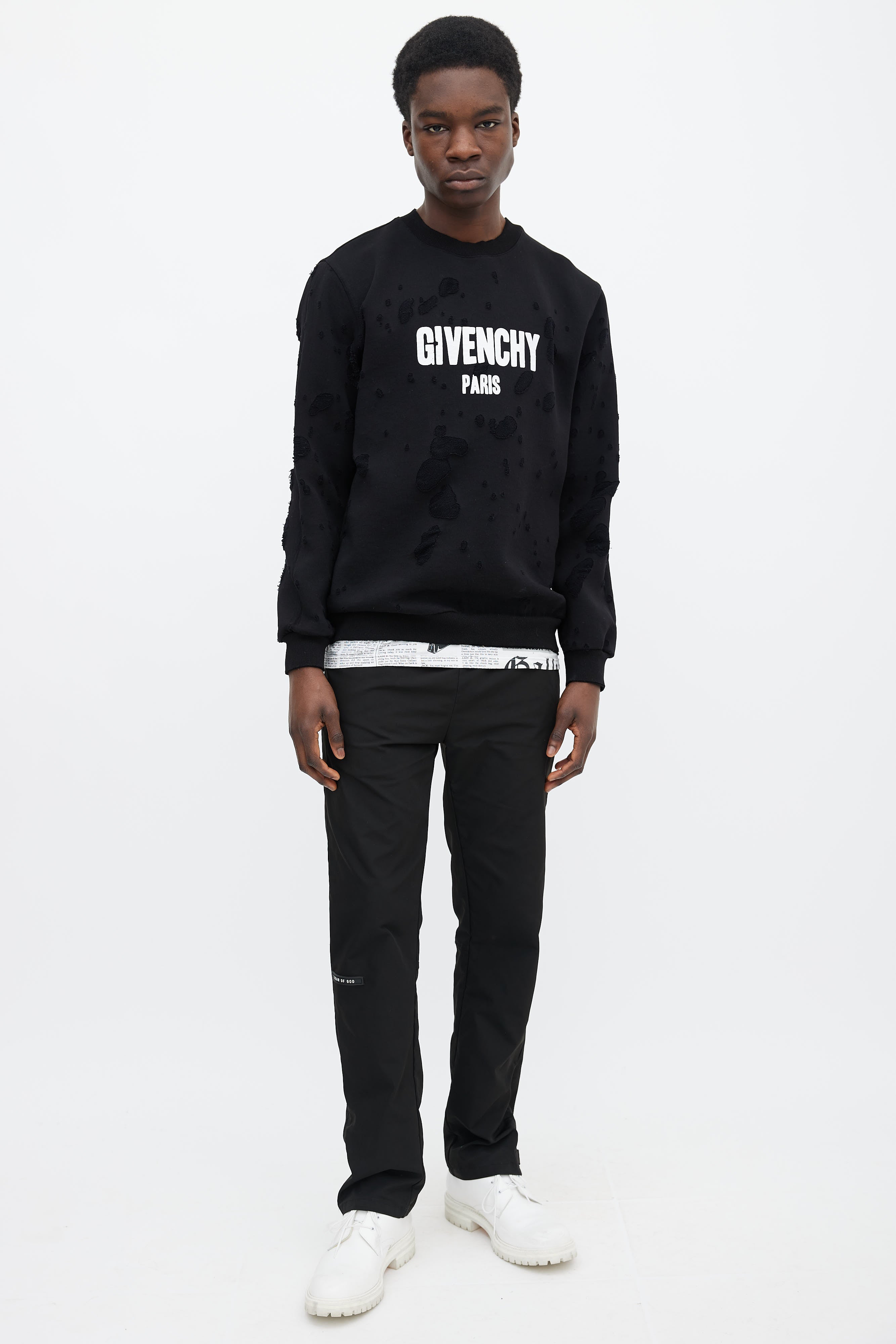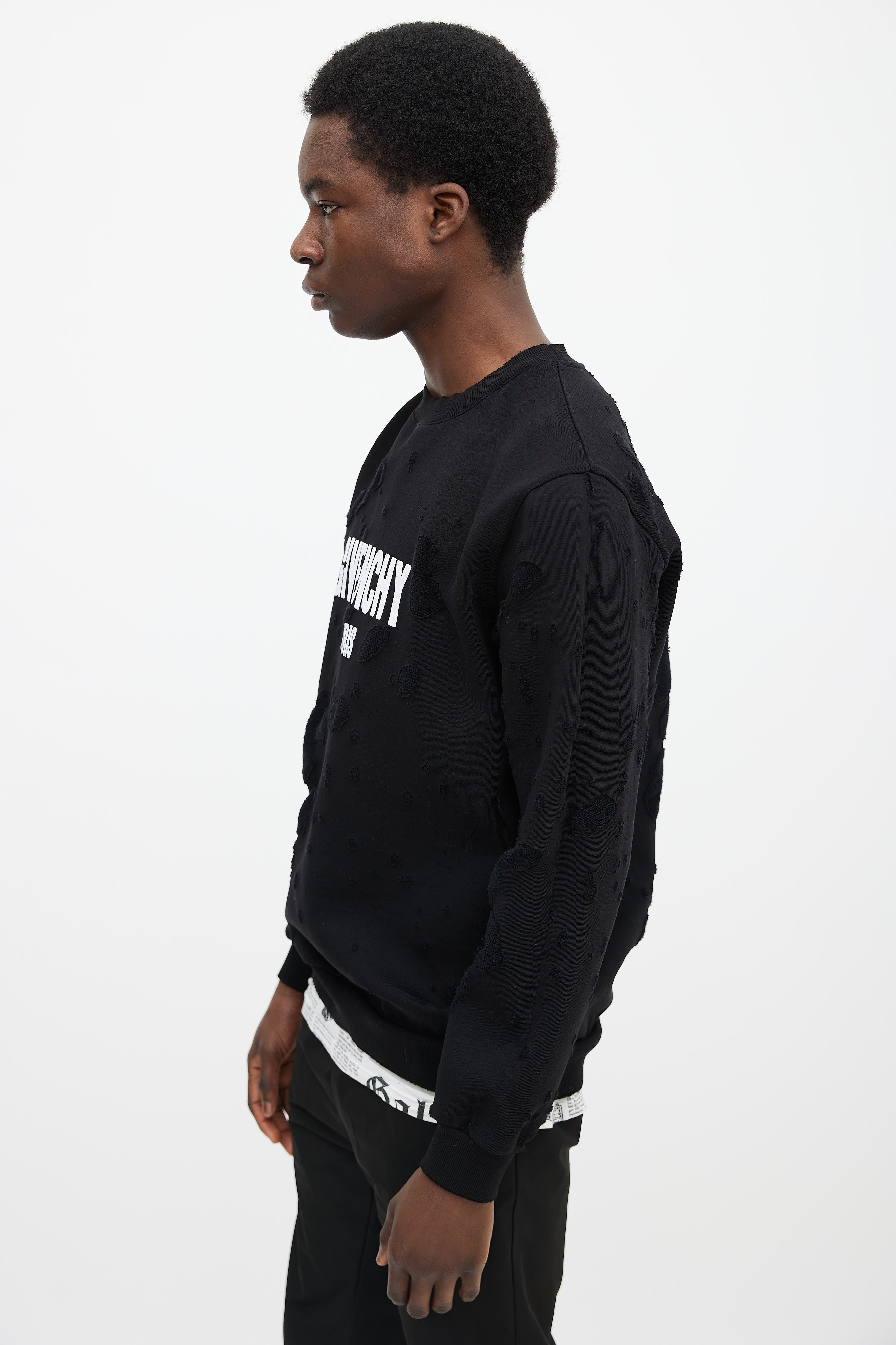 Pre-owned Givenchy black cotton sweater featuring white printed logo at front, rib knit crewneck, long sleeves with rib knit cuff, distressed details throughout and rib knit hem.