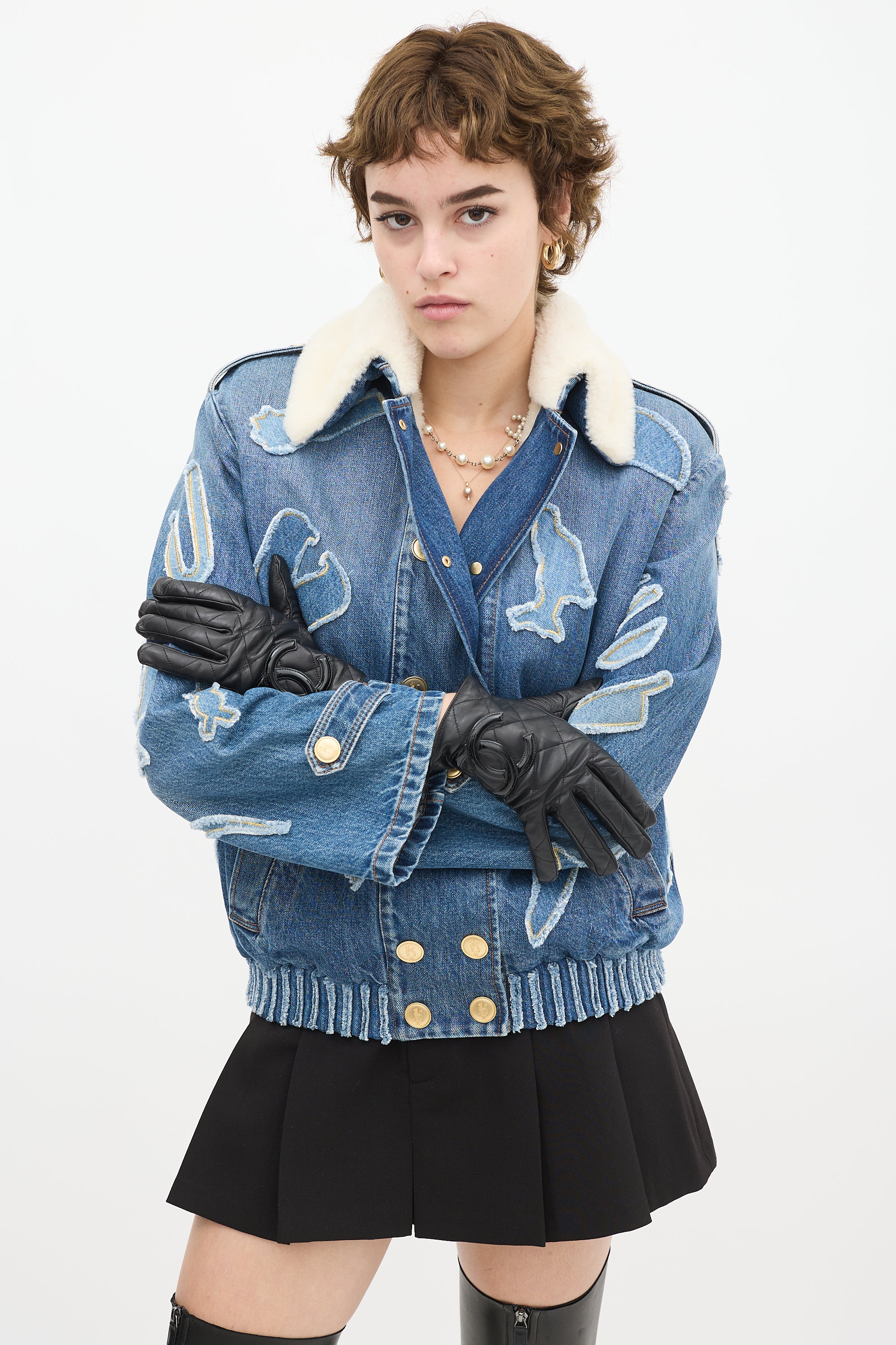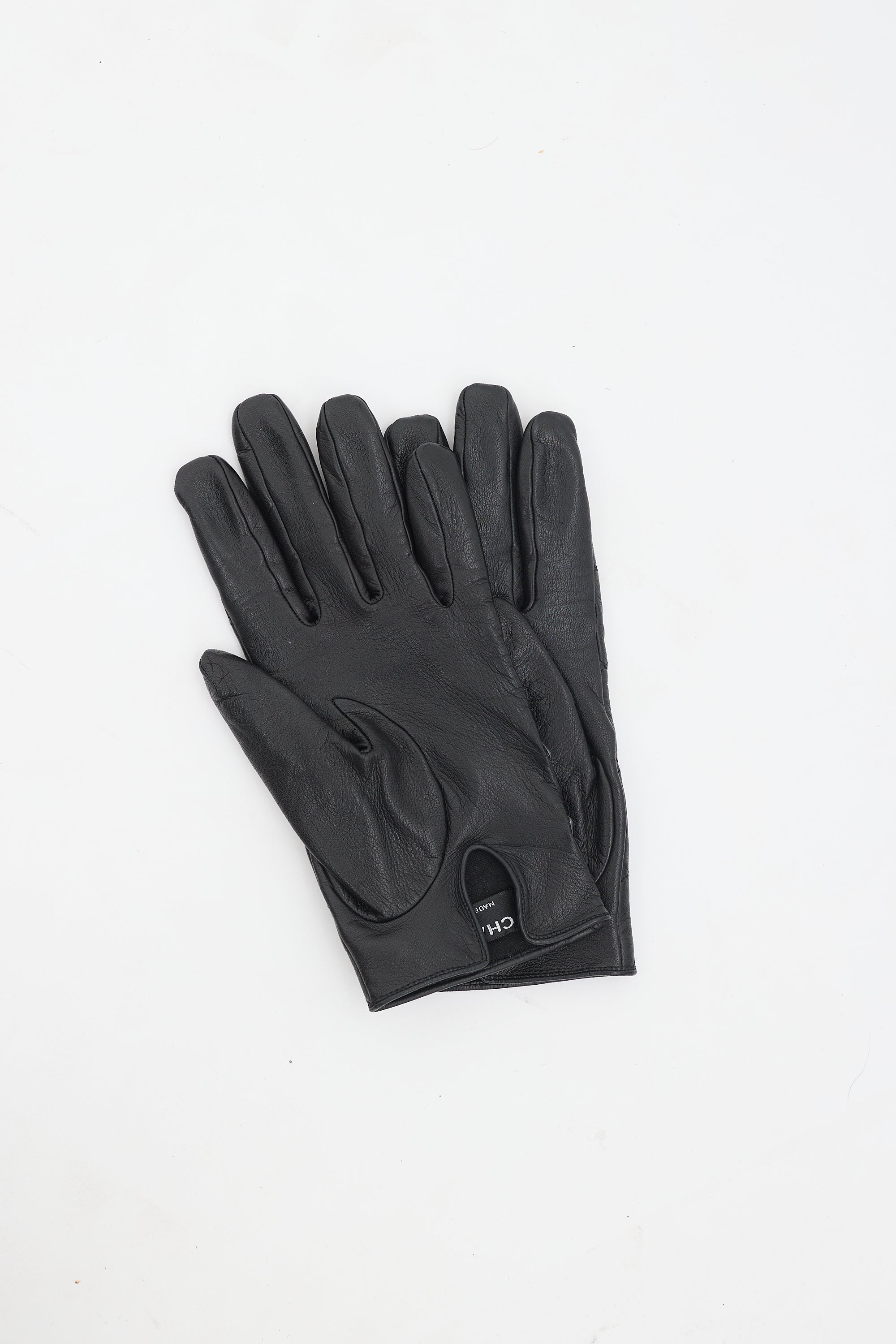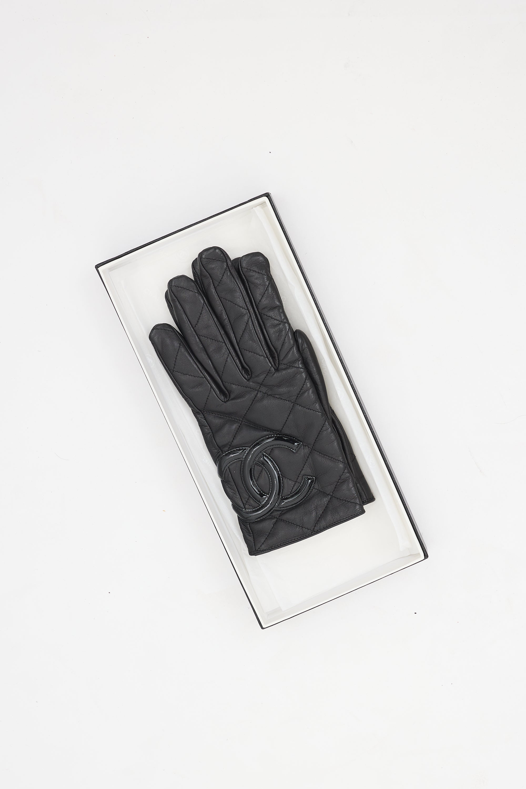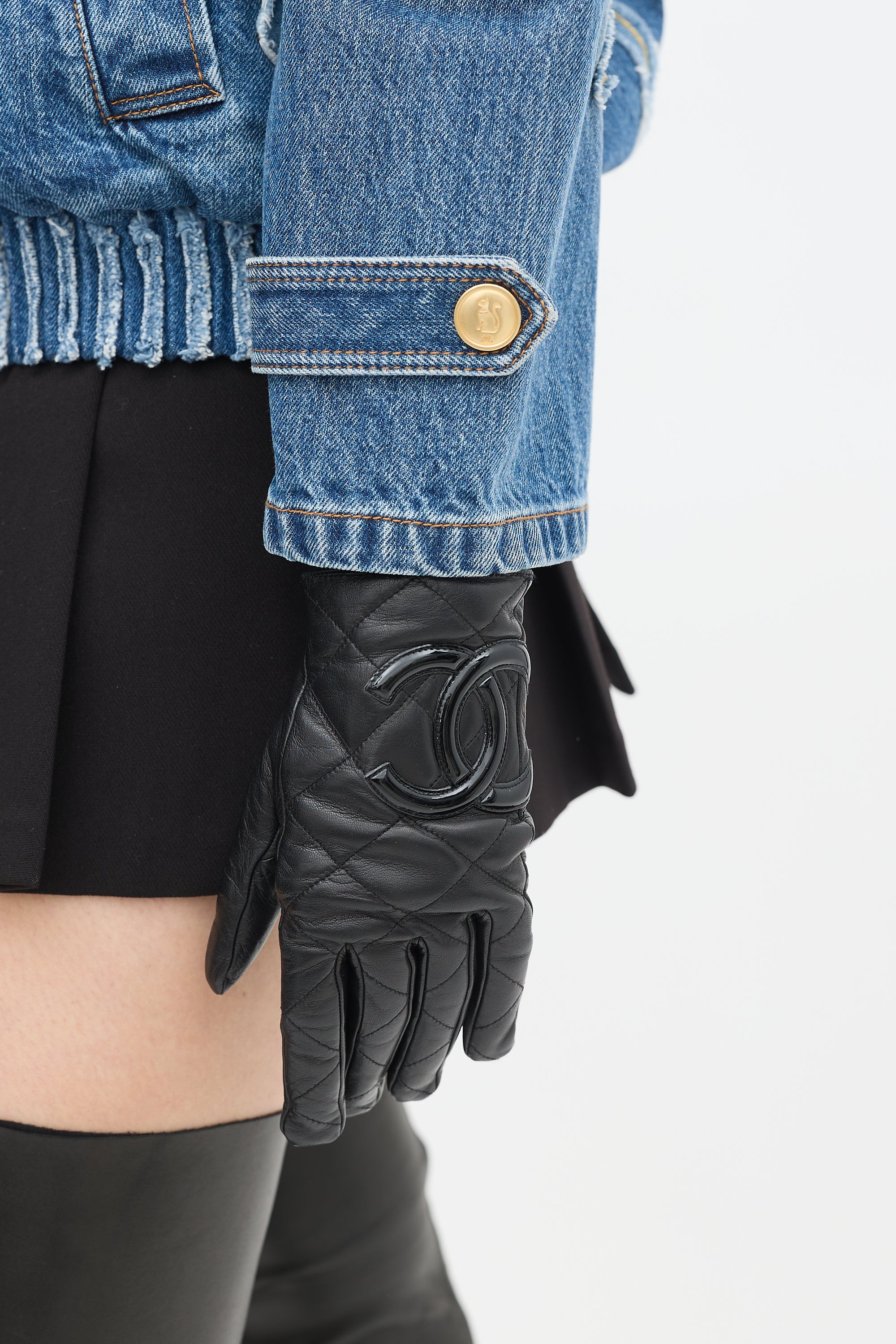 Pre-owned Chanel leather gloves featuring tonal quilt stitching throughout, patent leather CC motif design, and slit at cuff. Lined. Comes with original box.