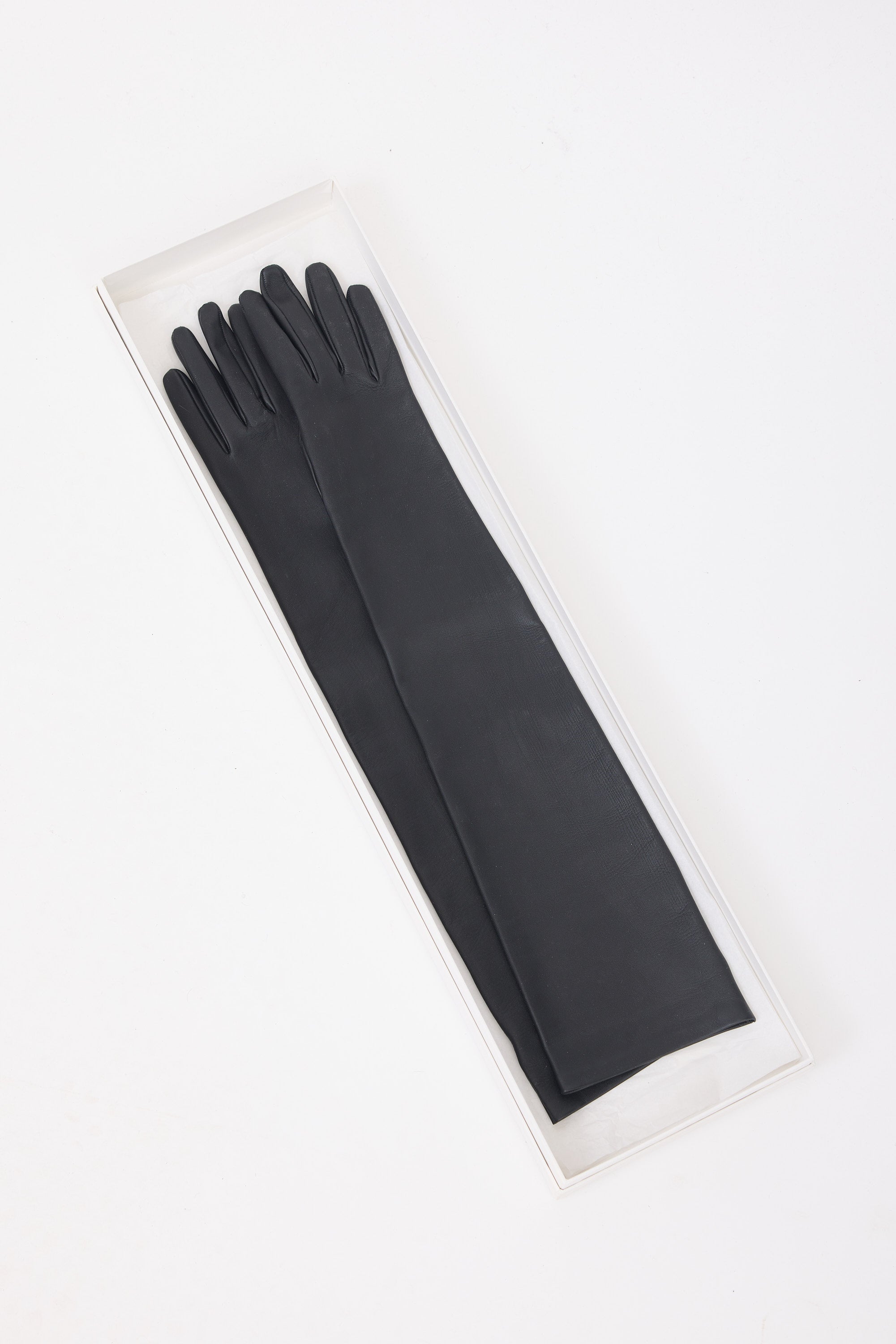 The Row black leather Simon gloves featuring a bicep length.